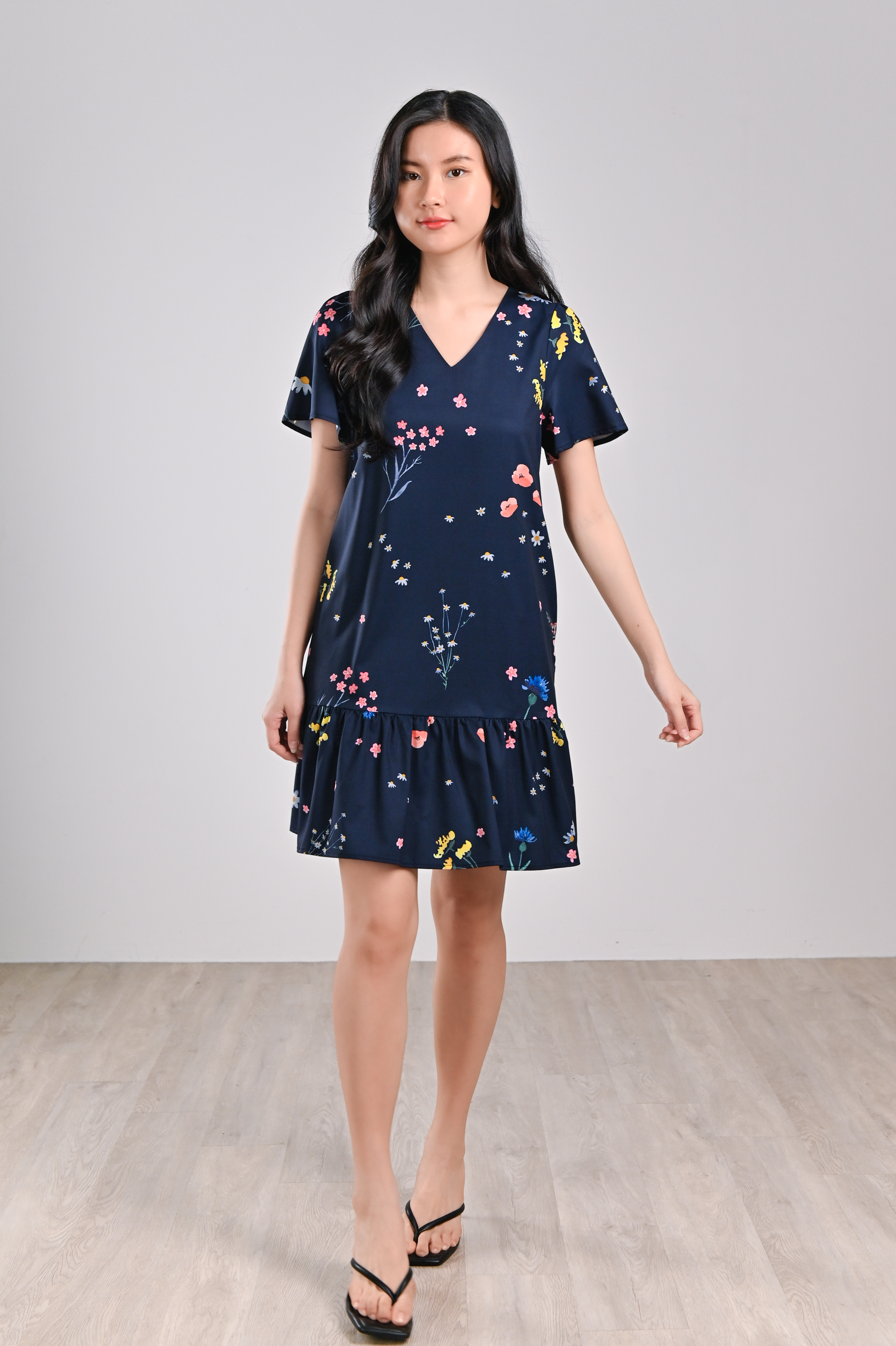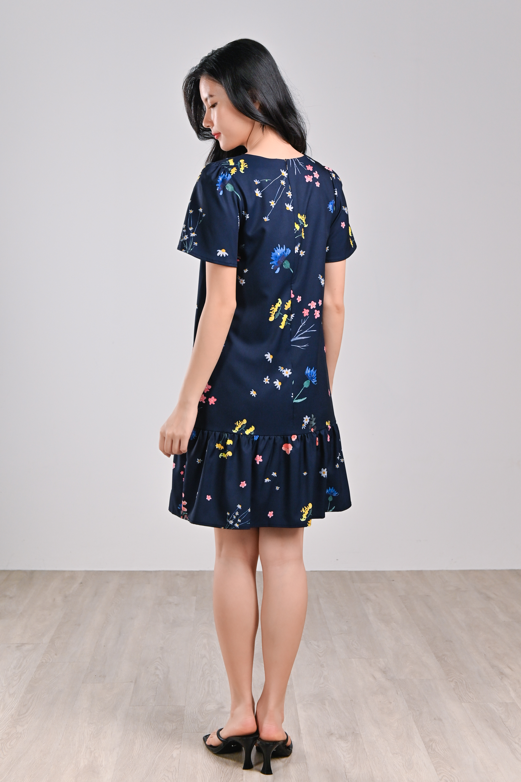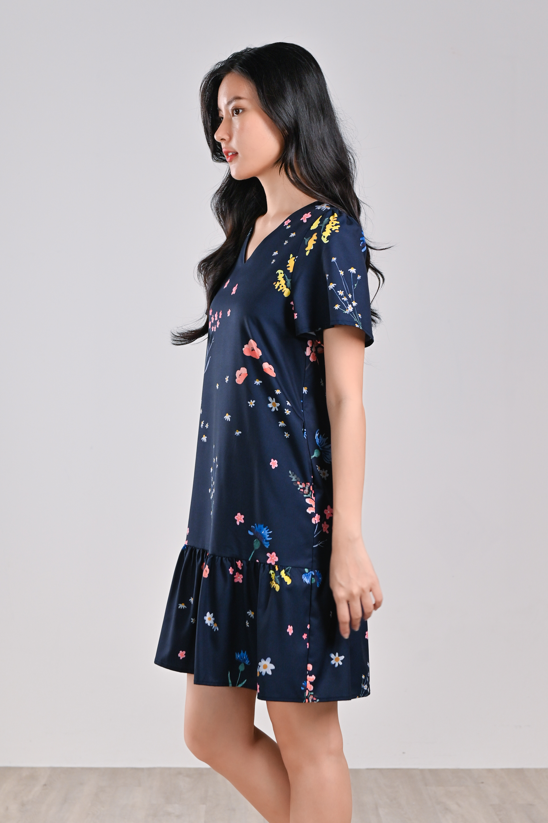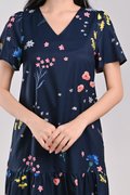 NAVY FRESH FLOWERS SLEEVED DROPWAIST DRESS
