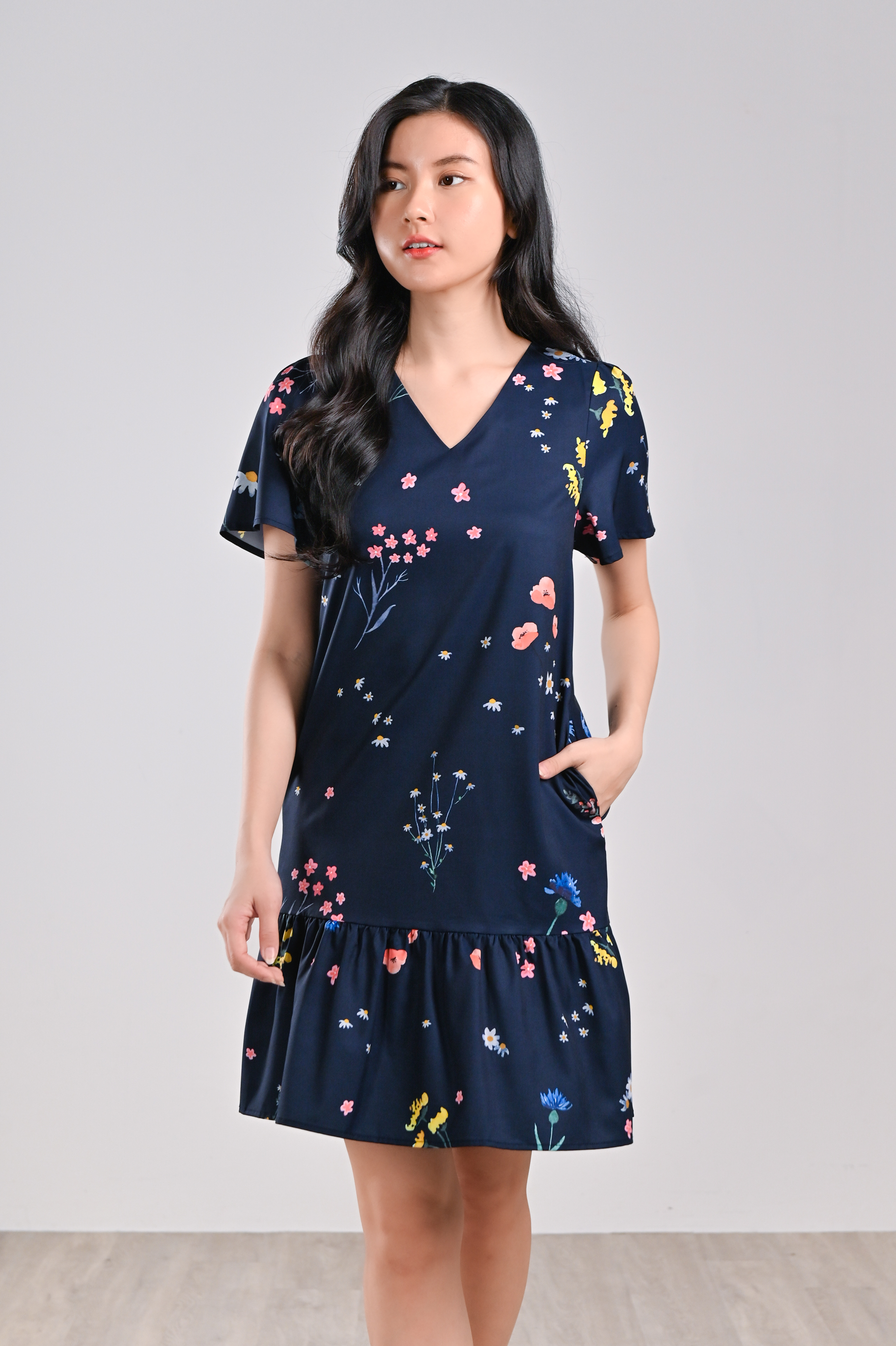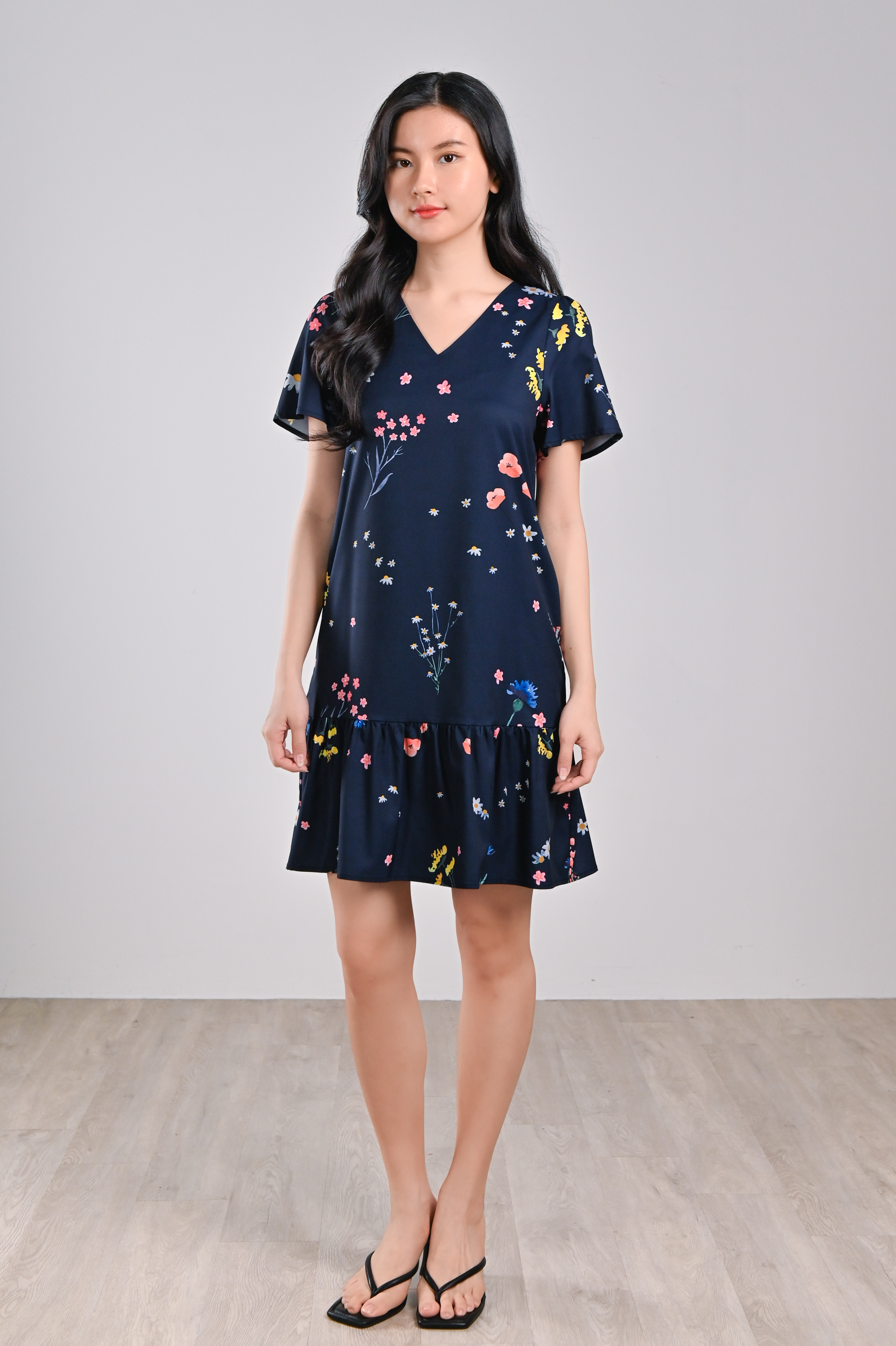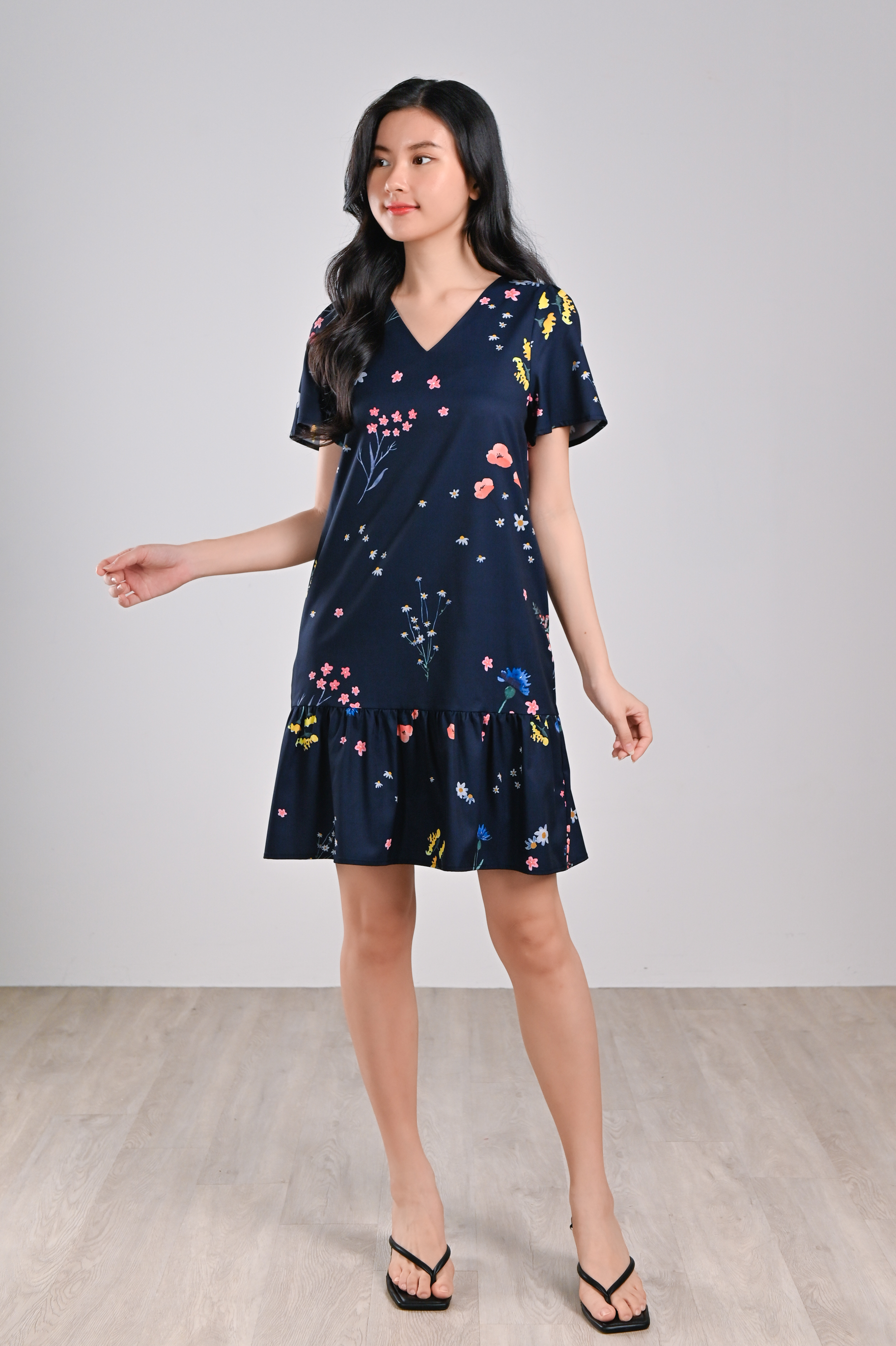 NAVY FRESH FLOWERS SLEEVED DROPWAIST DRESS