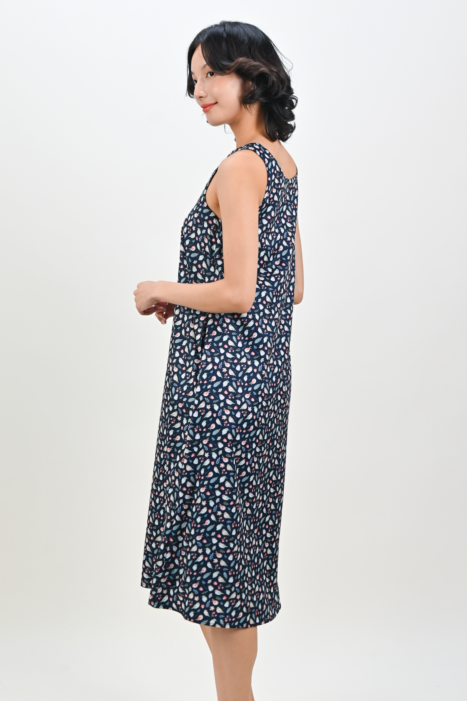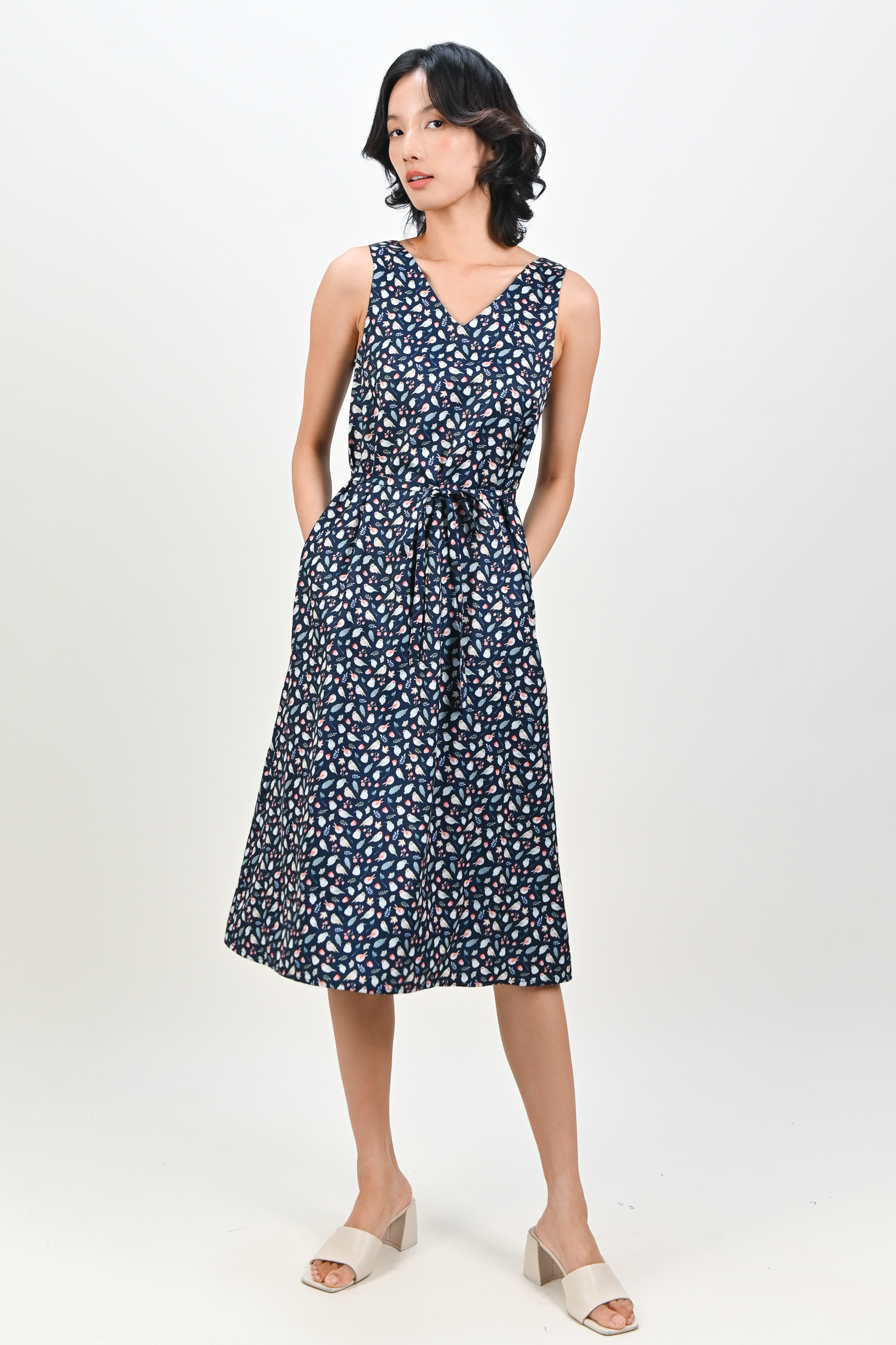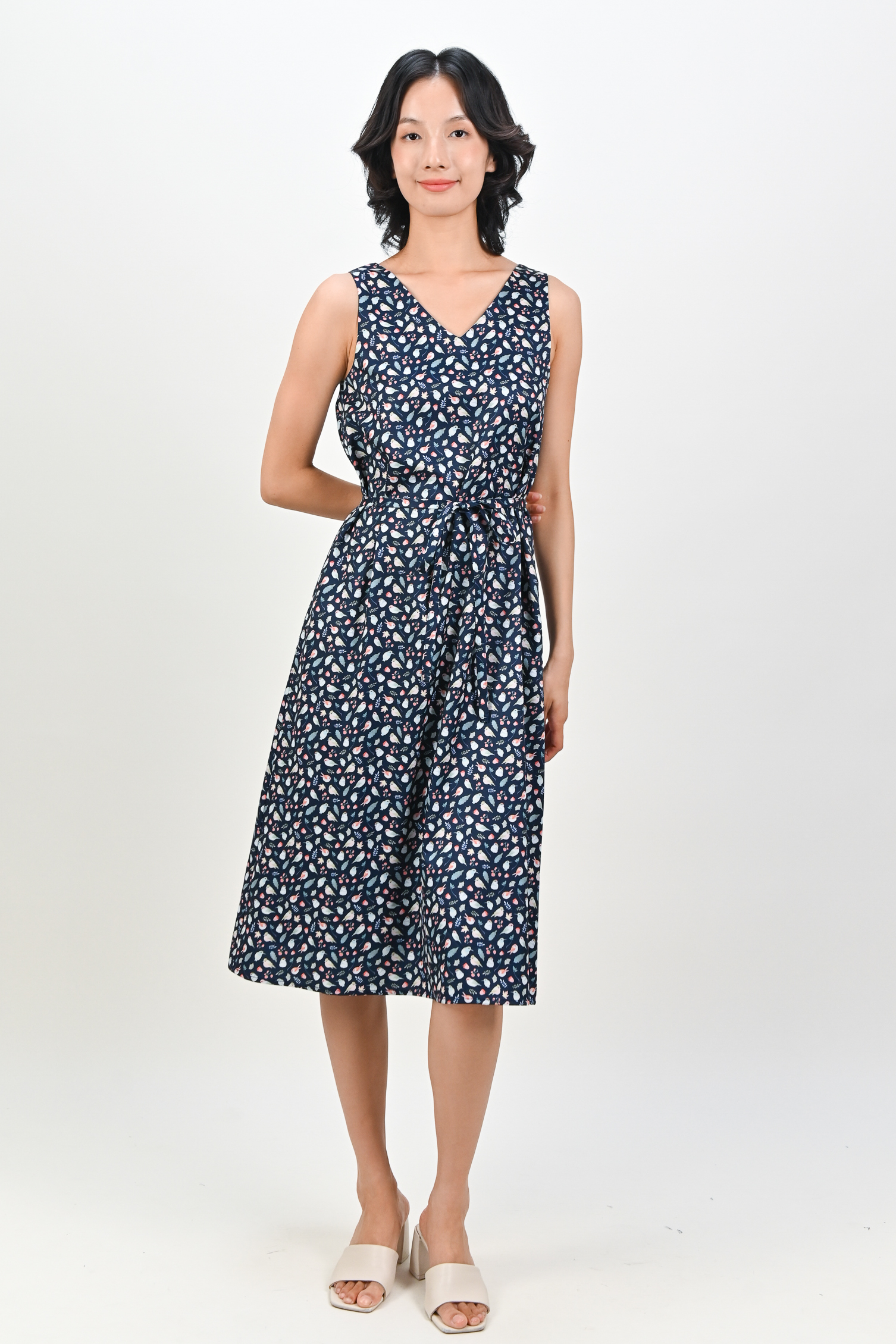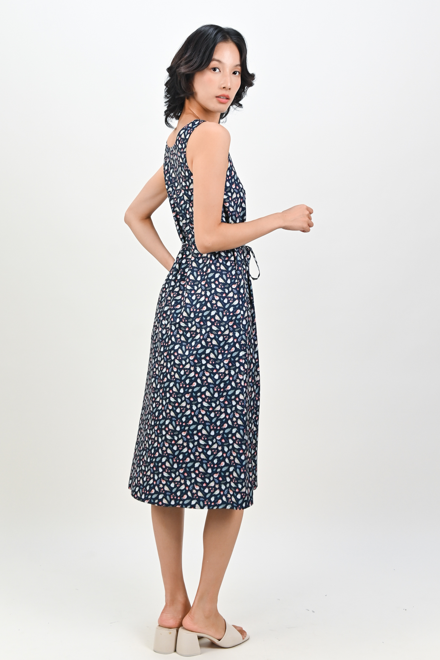NAVY FRIENDS OF THE FOREST TWO-WAY MIDI DRESS