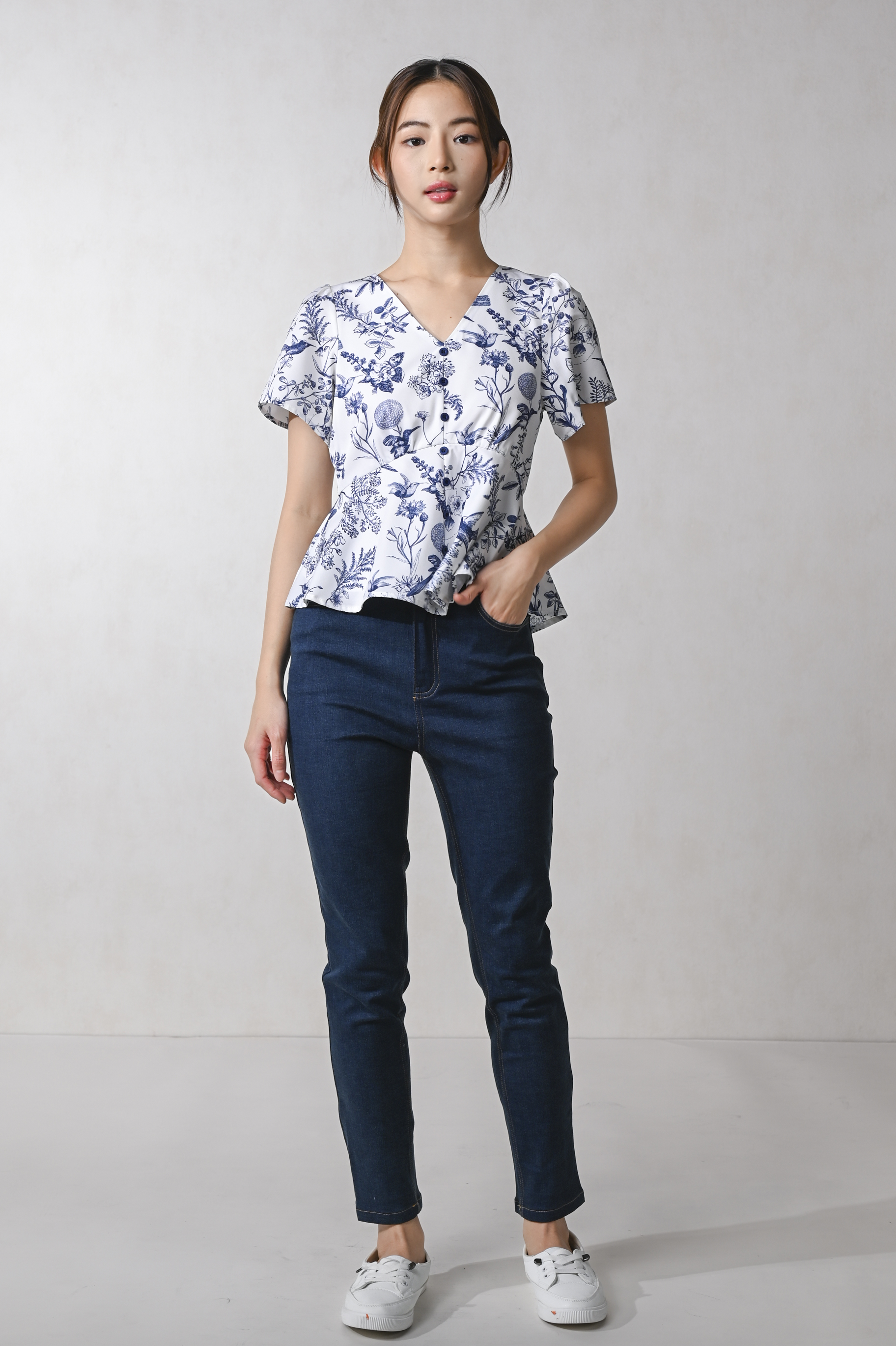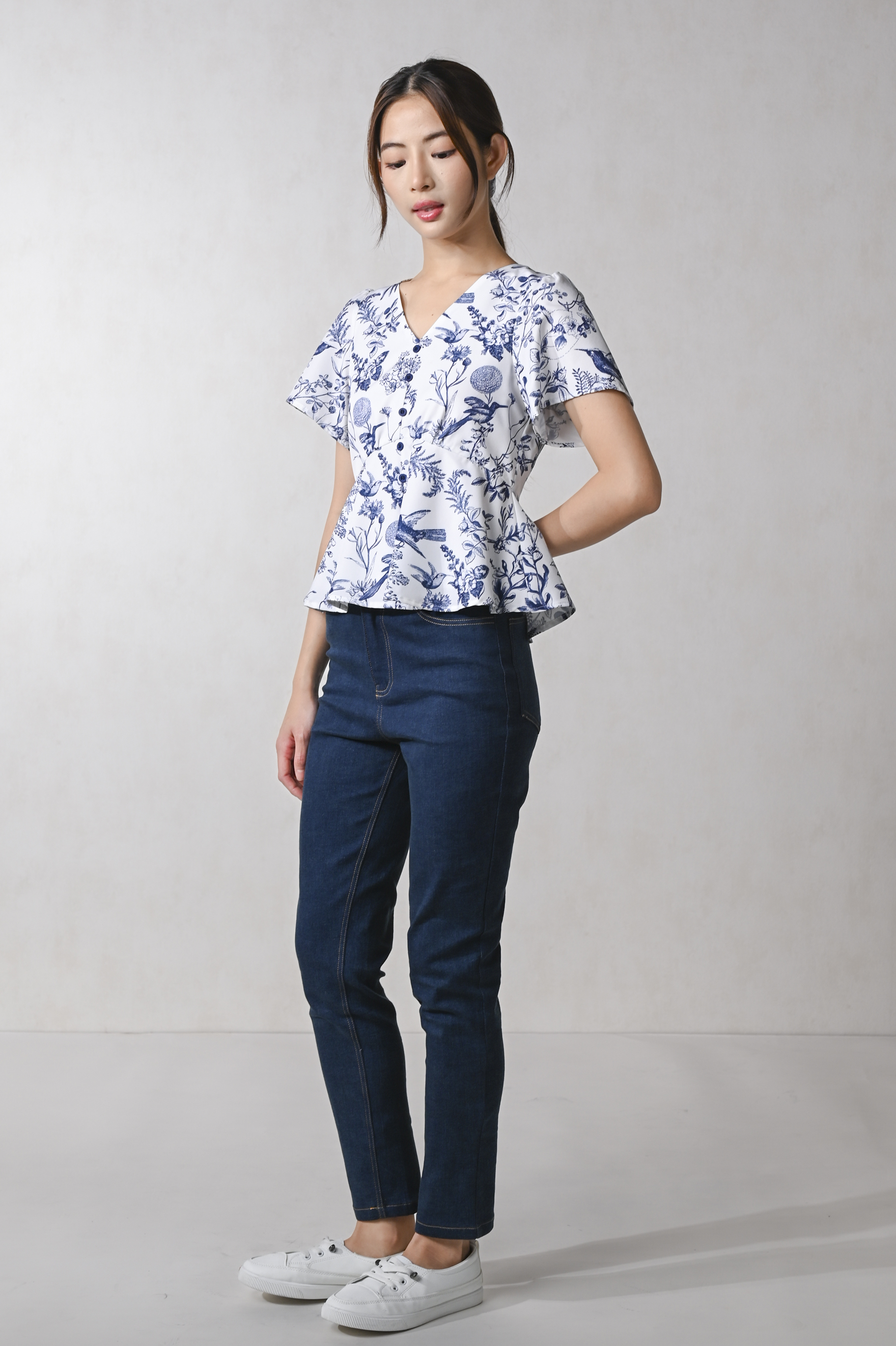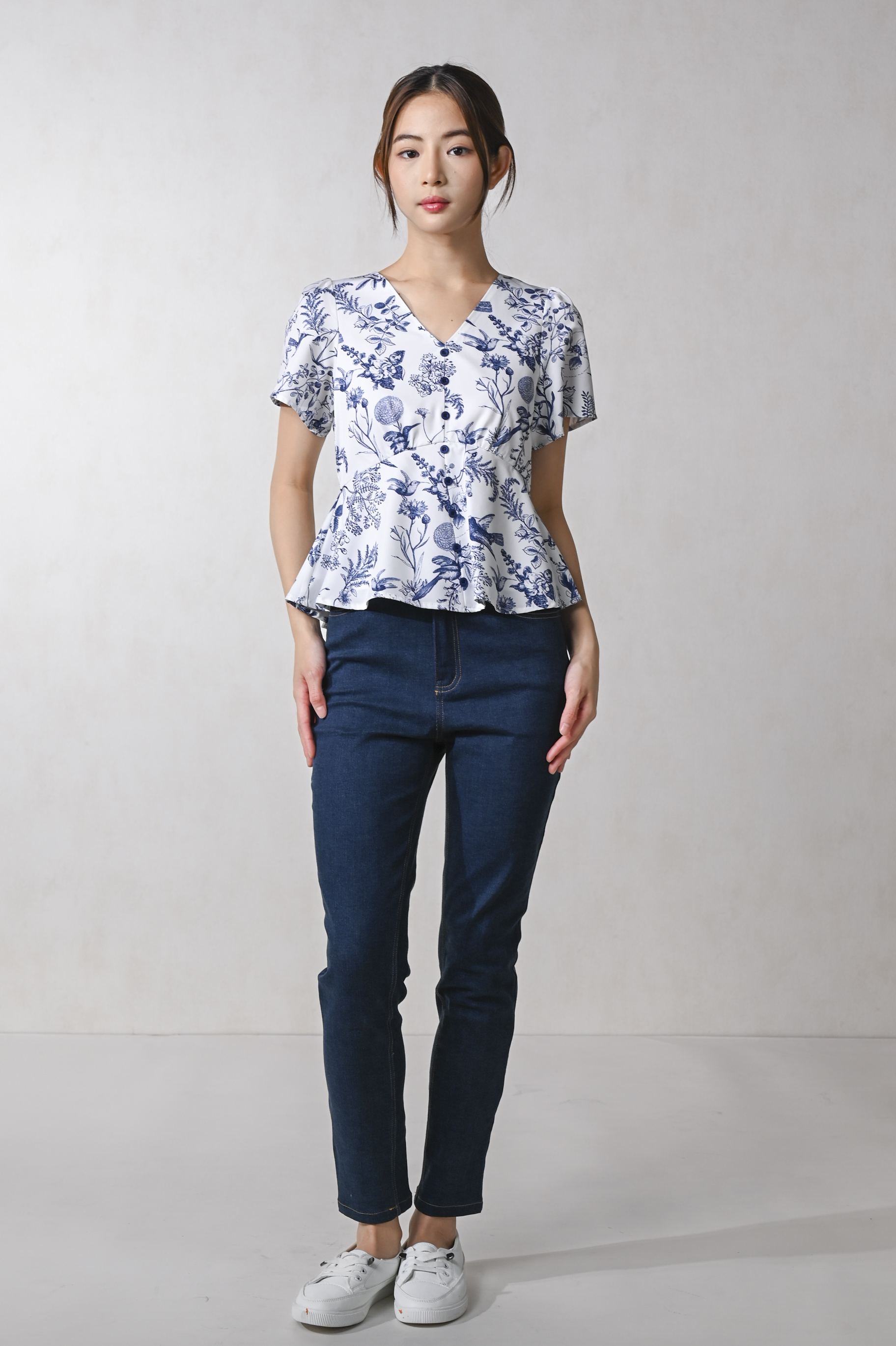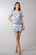 NAVY HUMMINGBIRD SLEEVED PEPLUM TOP