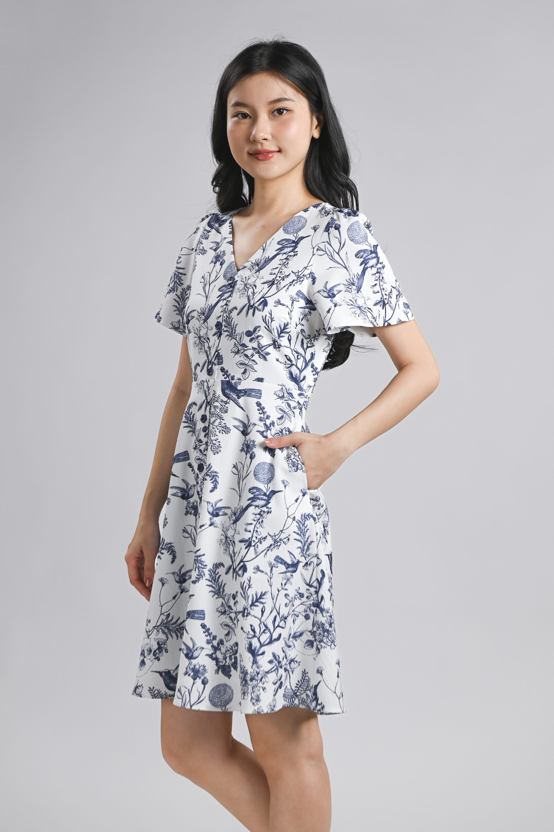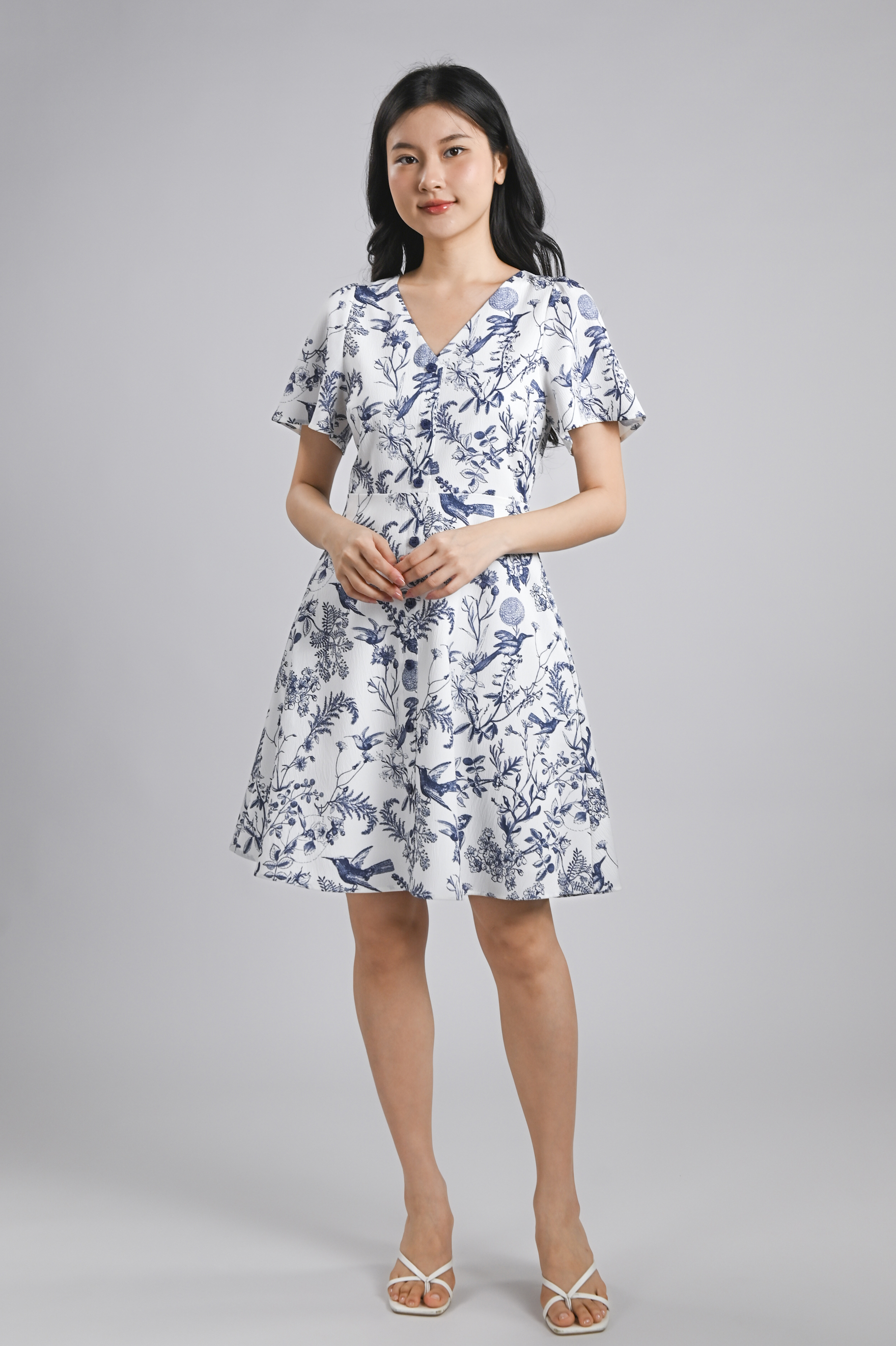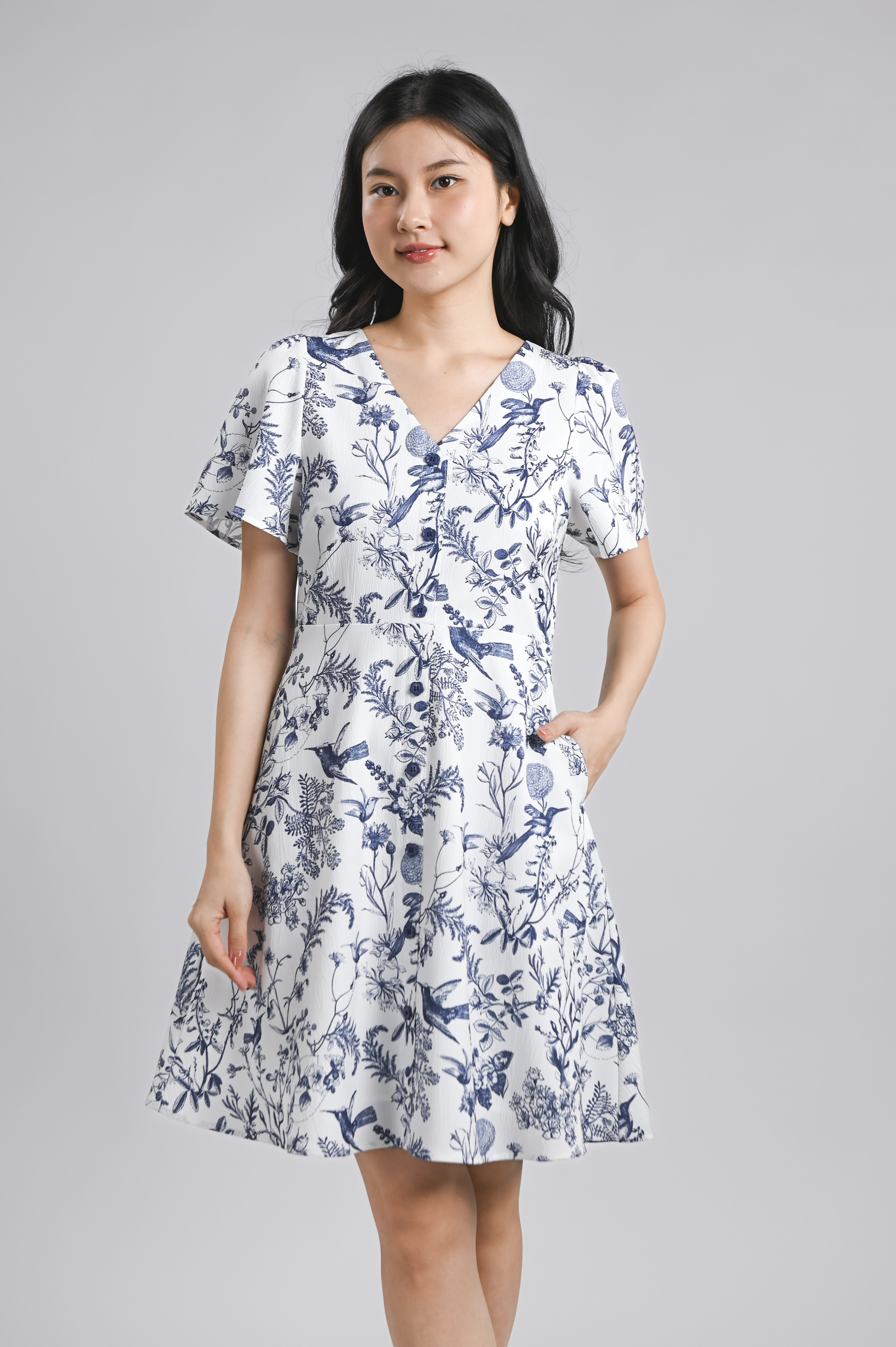 NAVY HUMMINGBIRD V-NECK SLEEVED FLOWER-BUTTON DRESS