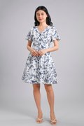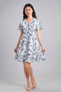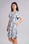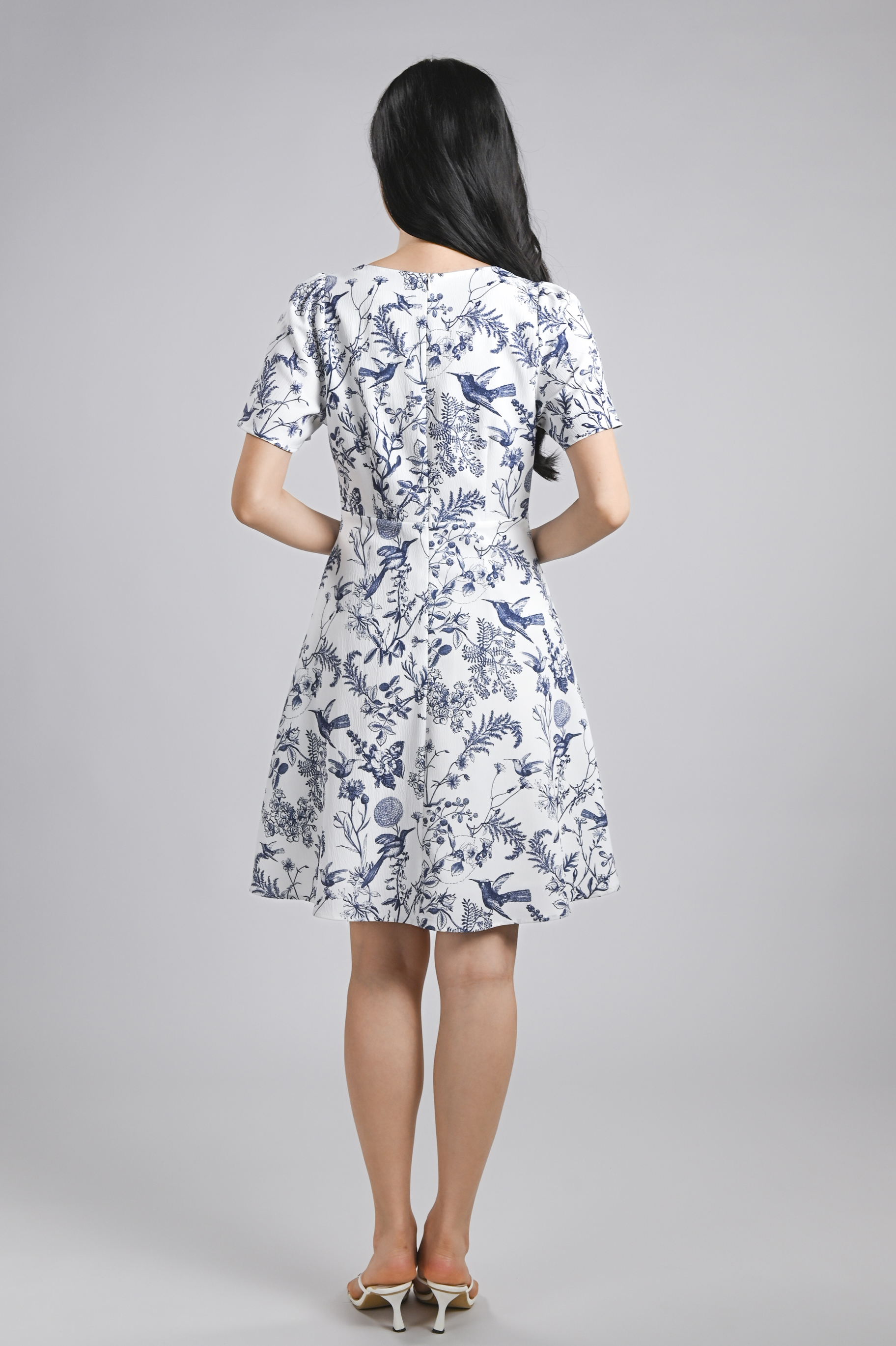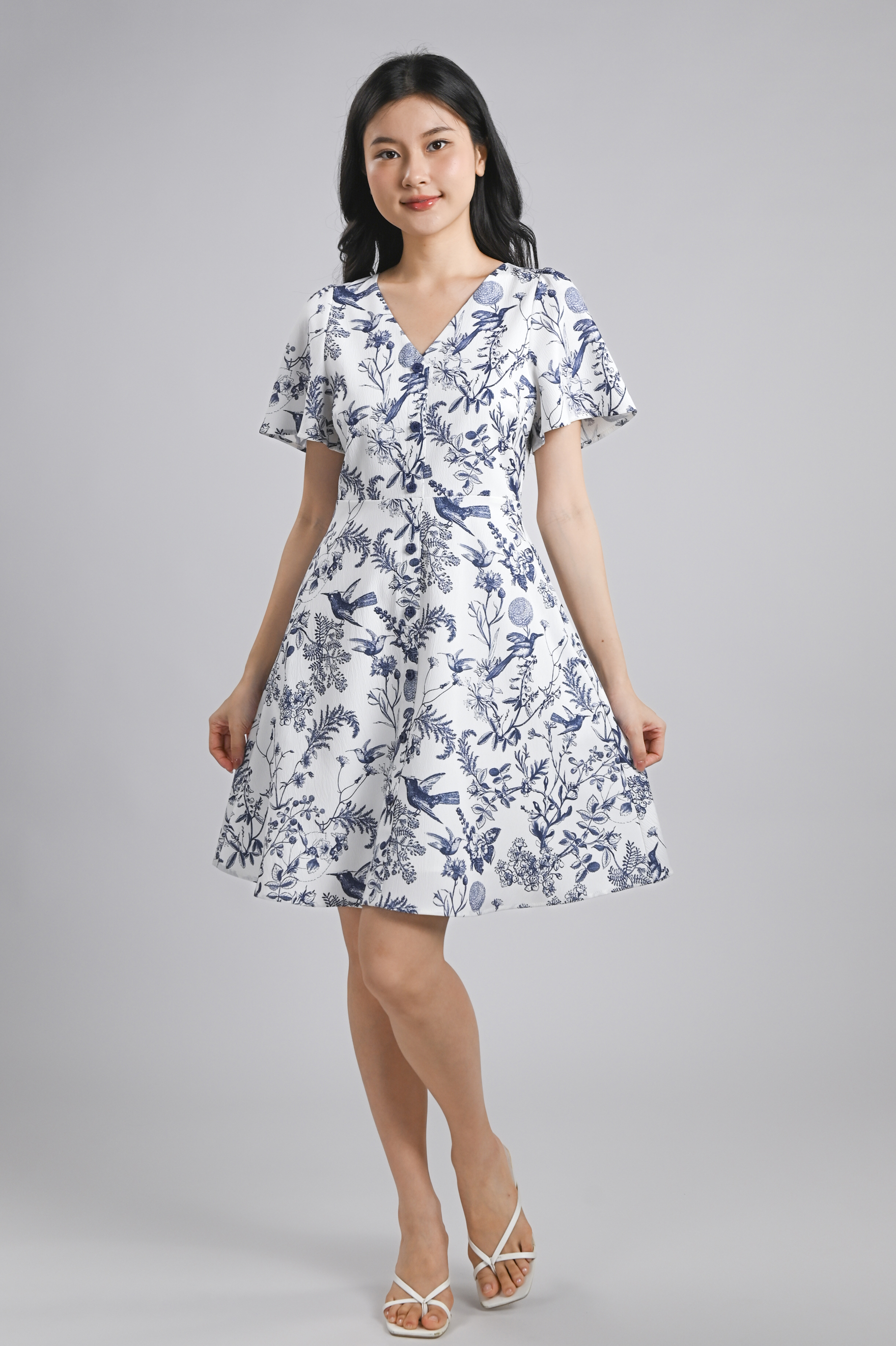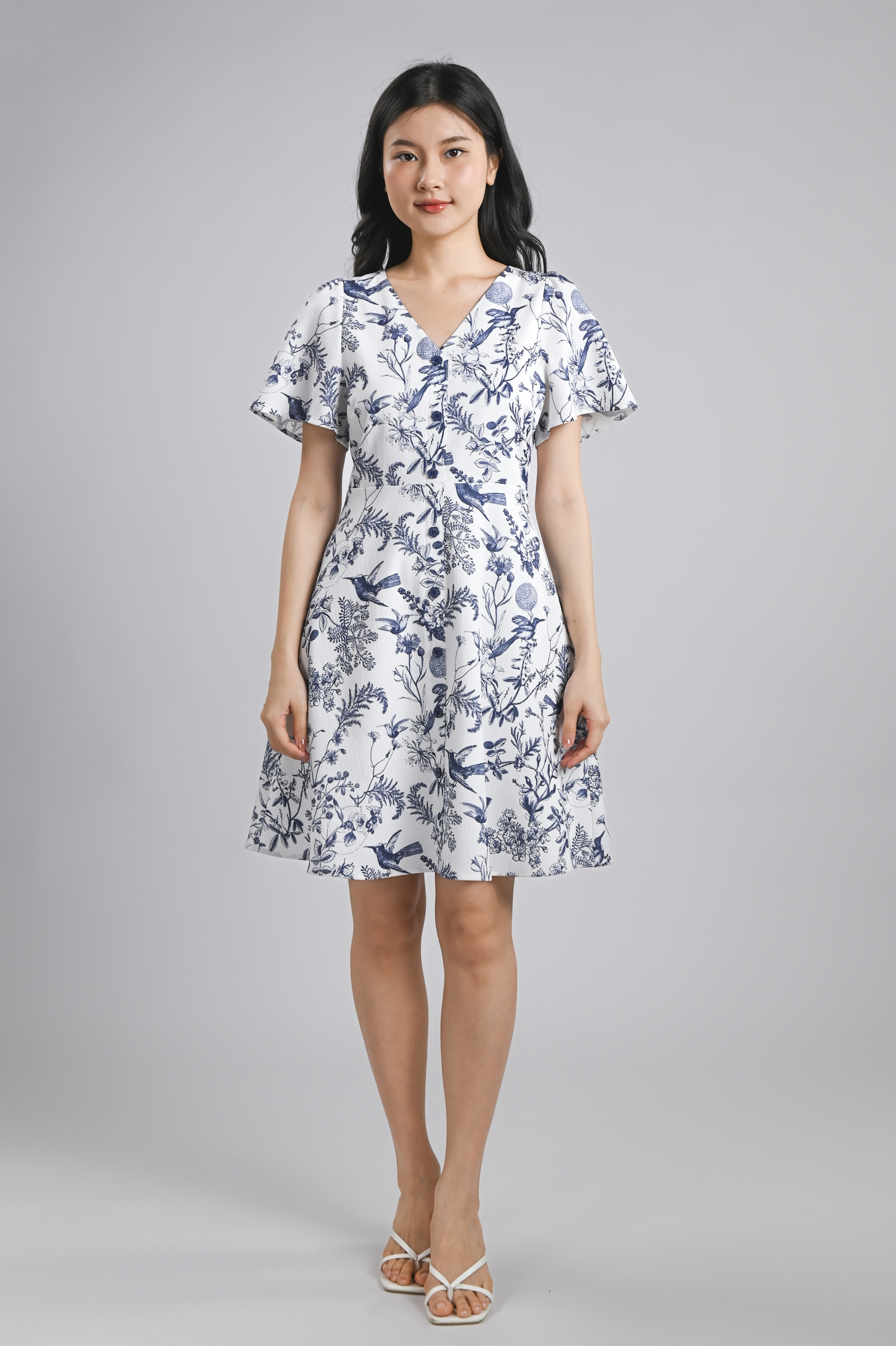 NAVY HUMMINGBIRD V-NECK SLEEVED FLOWER-BUTTON DRESS