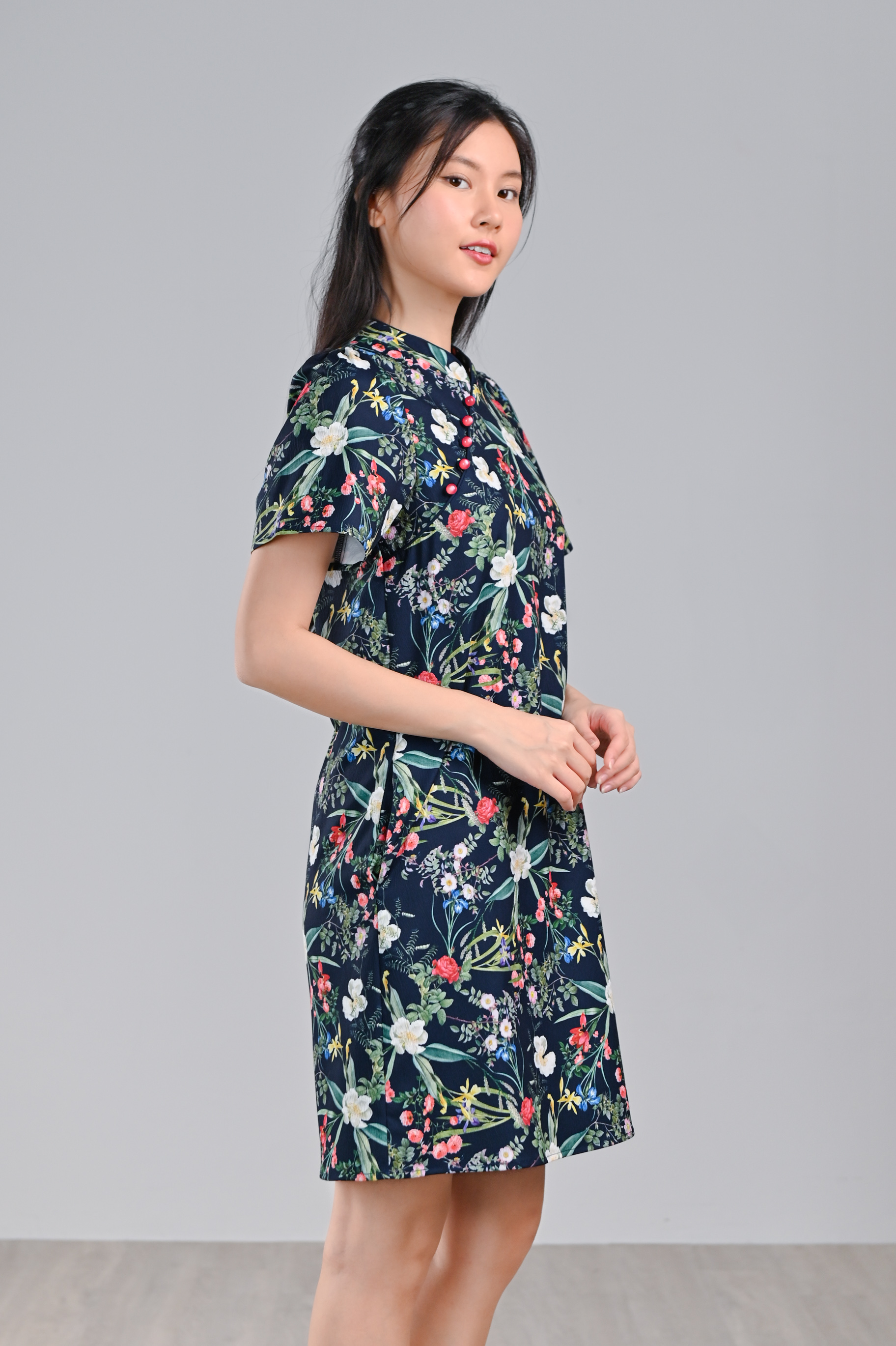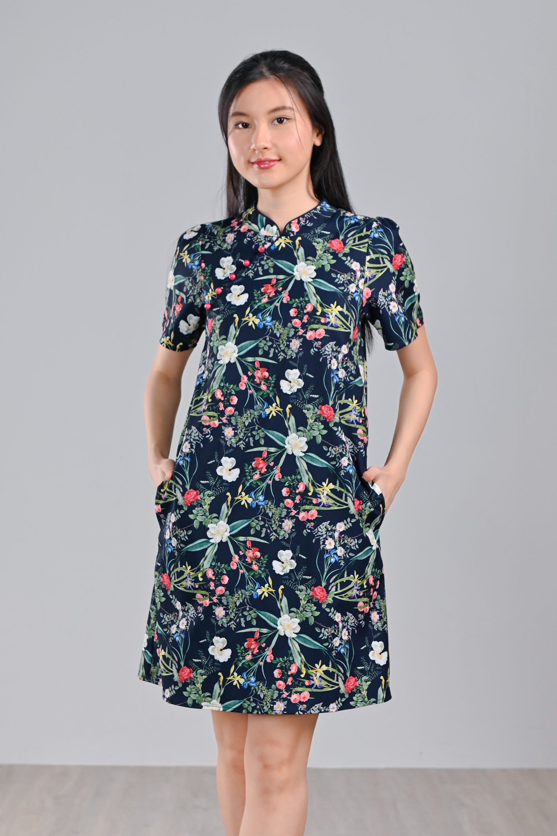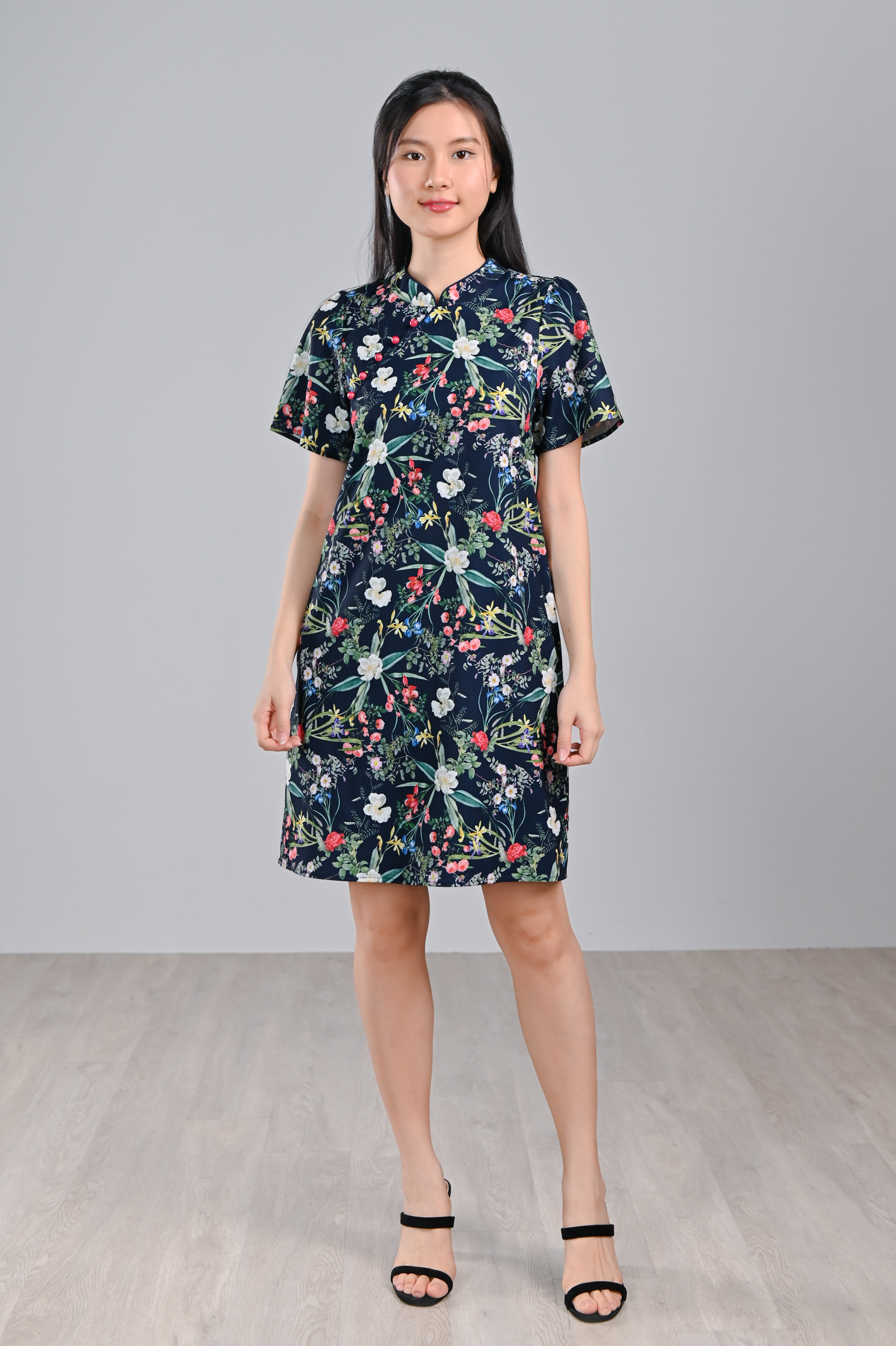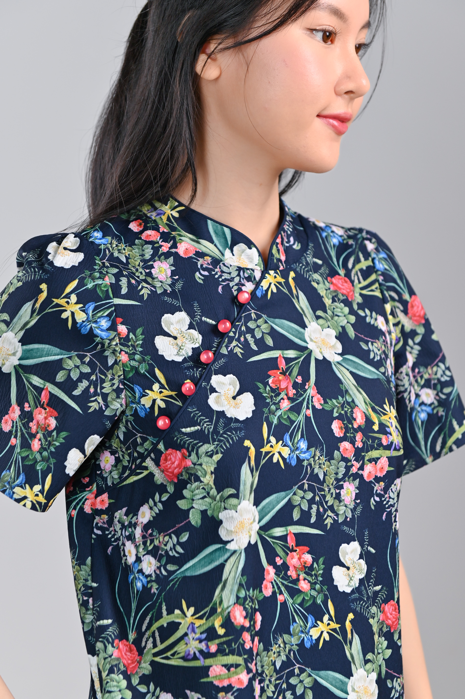 NAVY LUSH FLORALS SLEEVED SHIFT CHEONGSAM