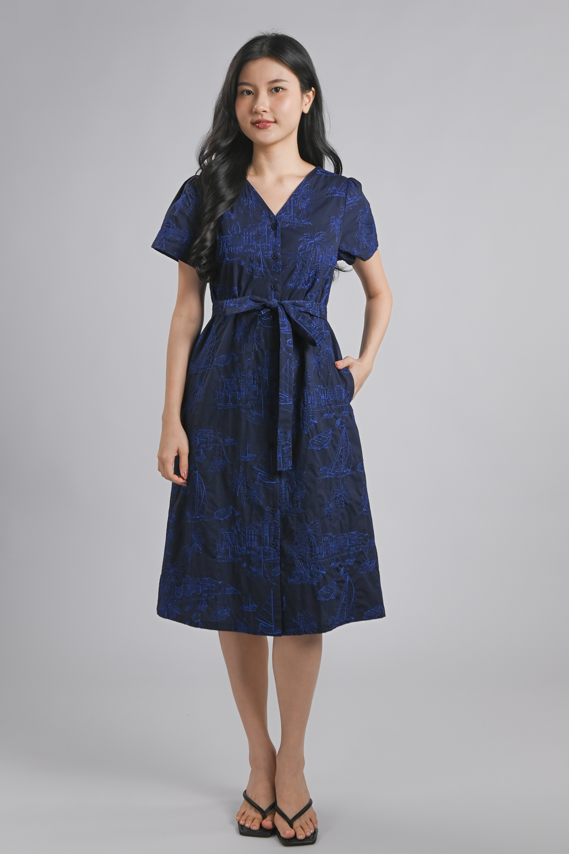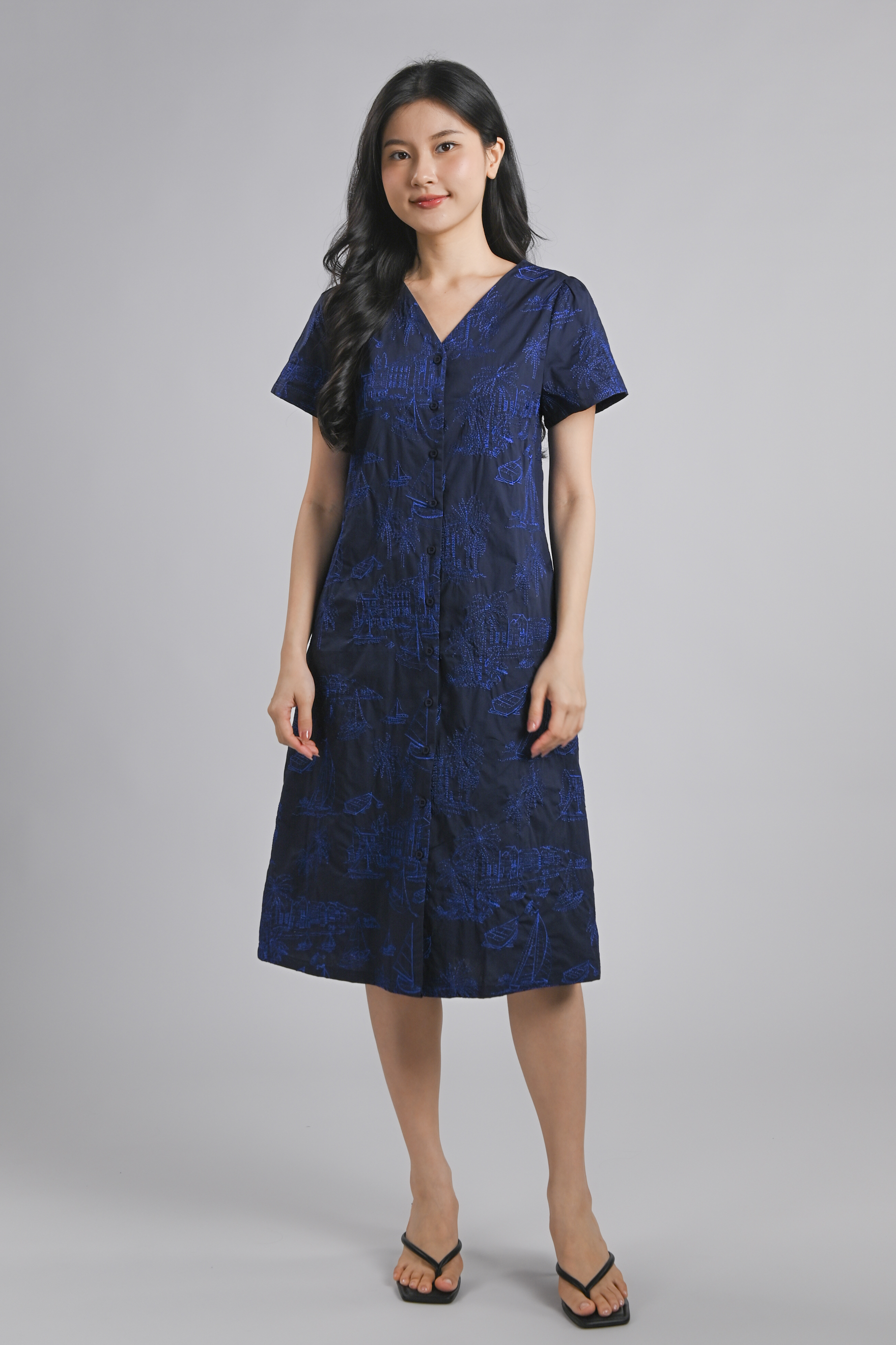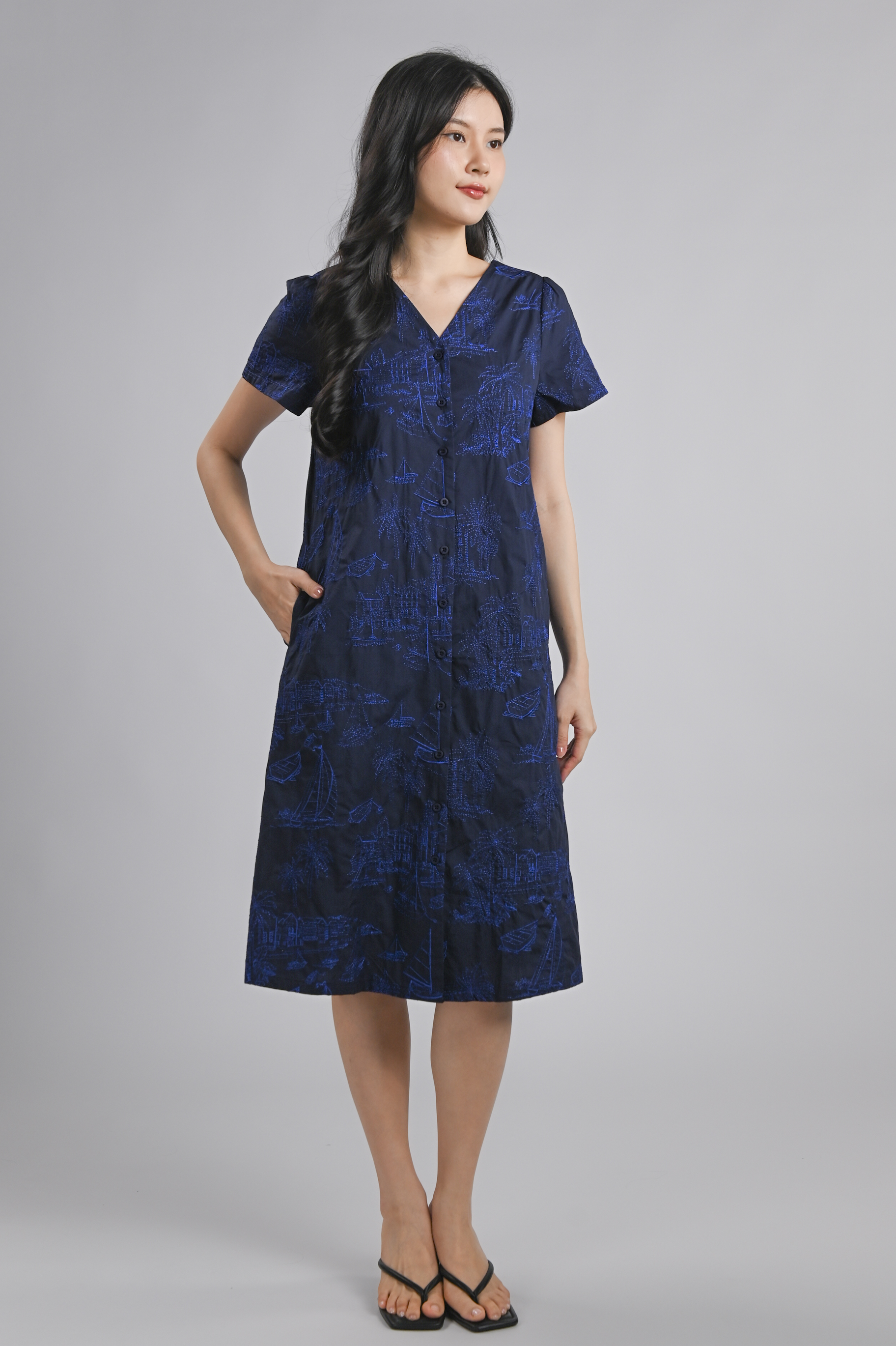 NAVY WATERFRONT VILLAGE SLEEVED BUTTON MIDI DRESS