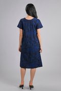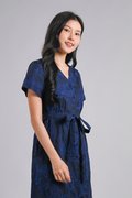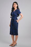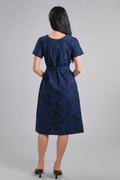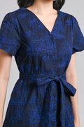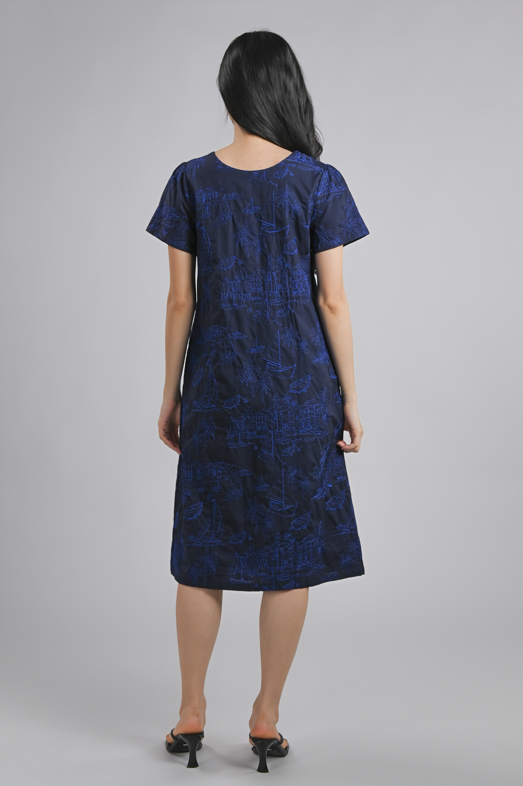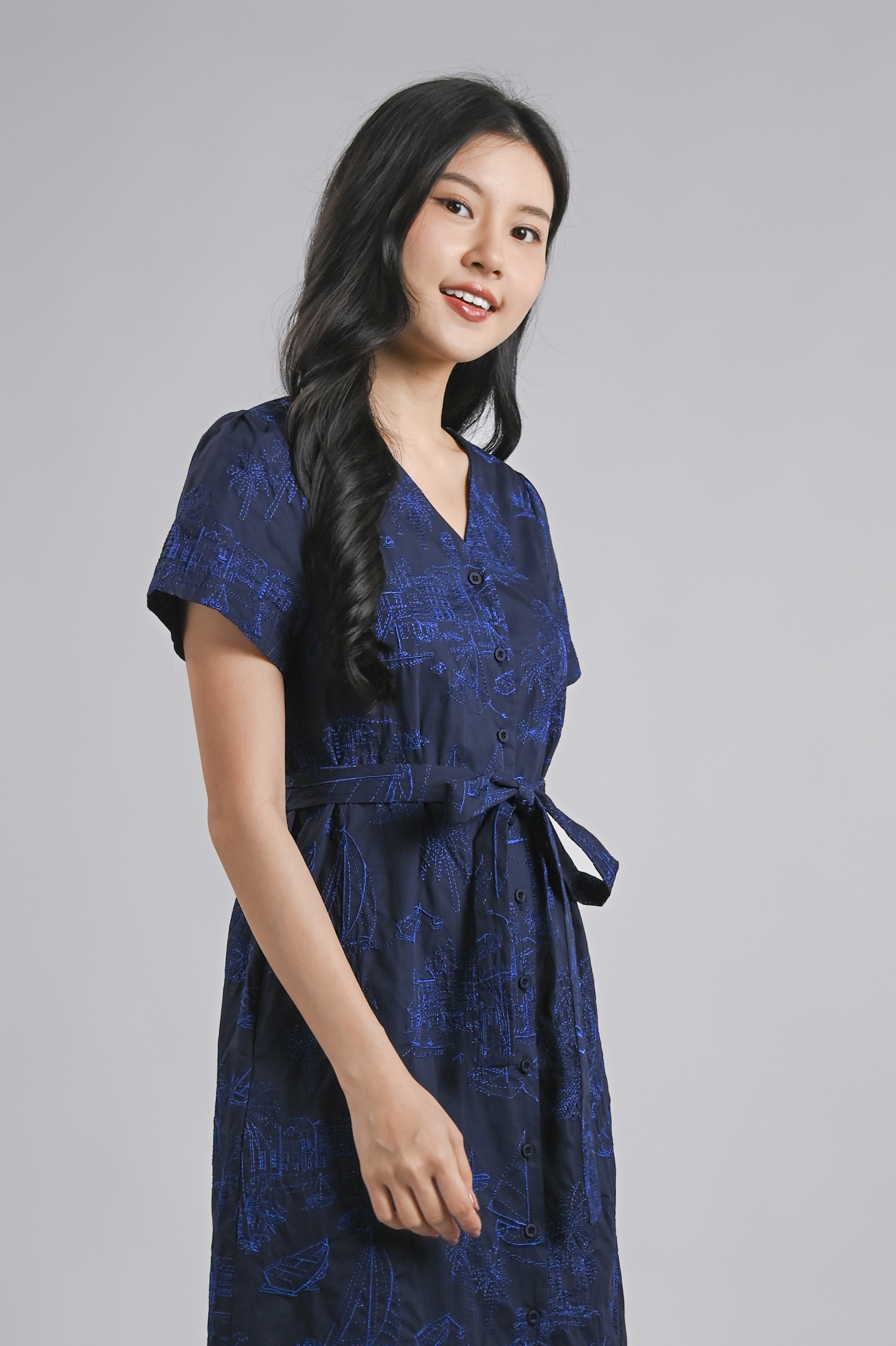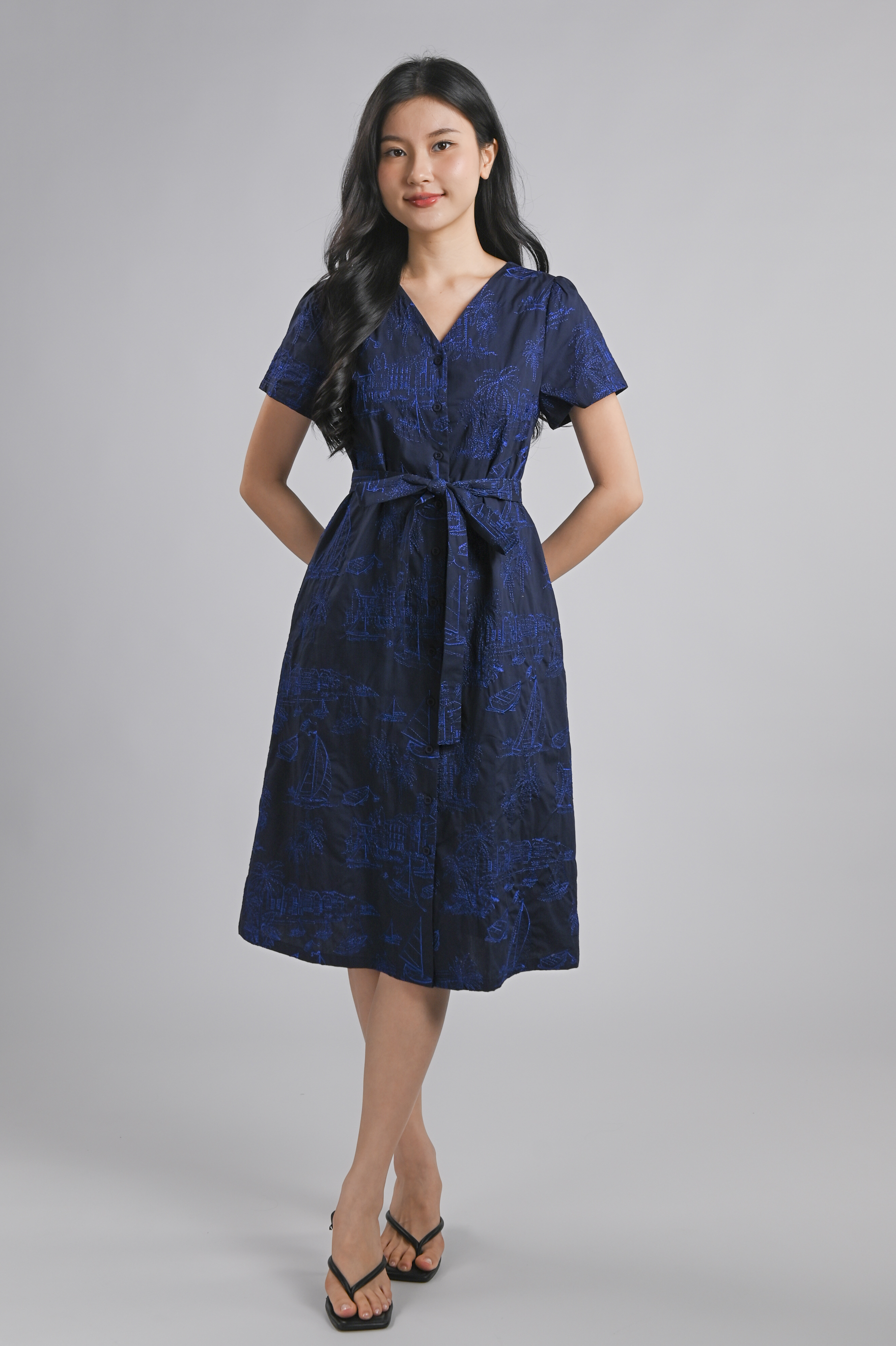 NAVY WATERFRONT VILLAGE SLEEVED BUTTON MIDI DRESS