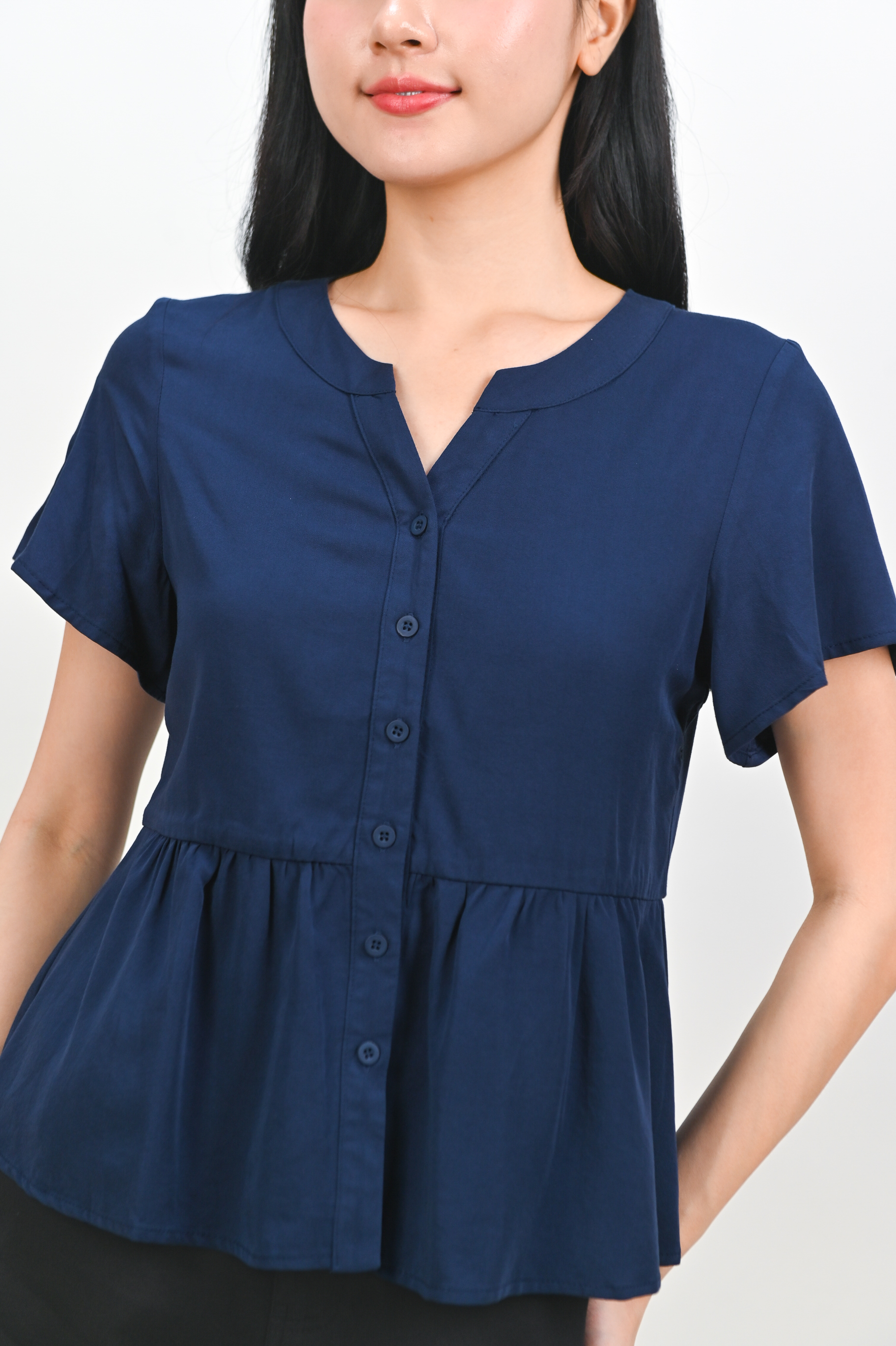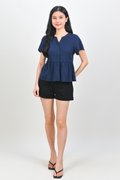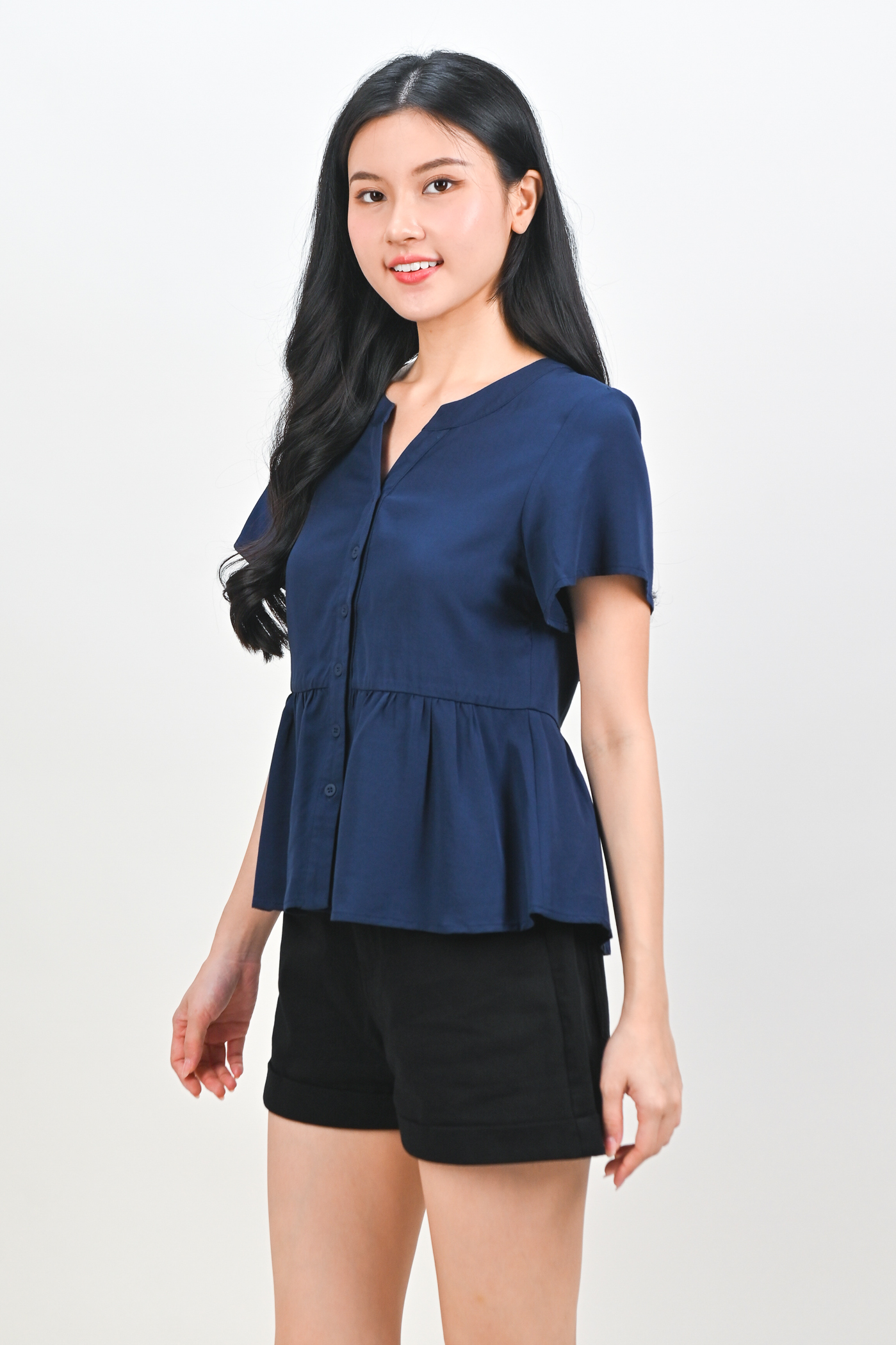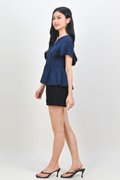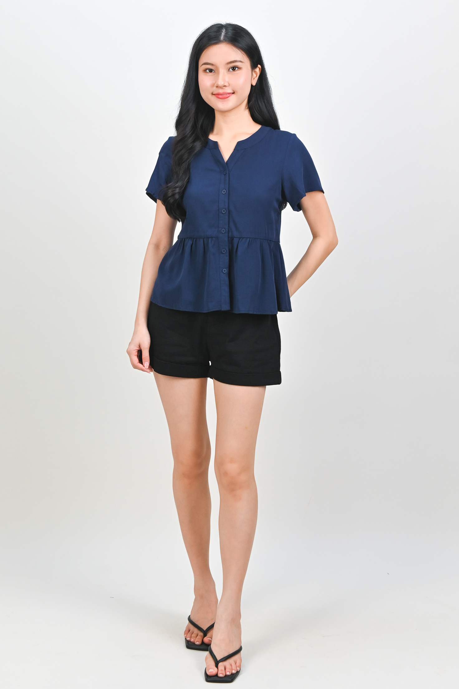 NEMIRA NOTCHED-NECK PEPLUM TOP IN NAVY