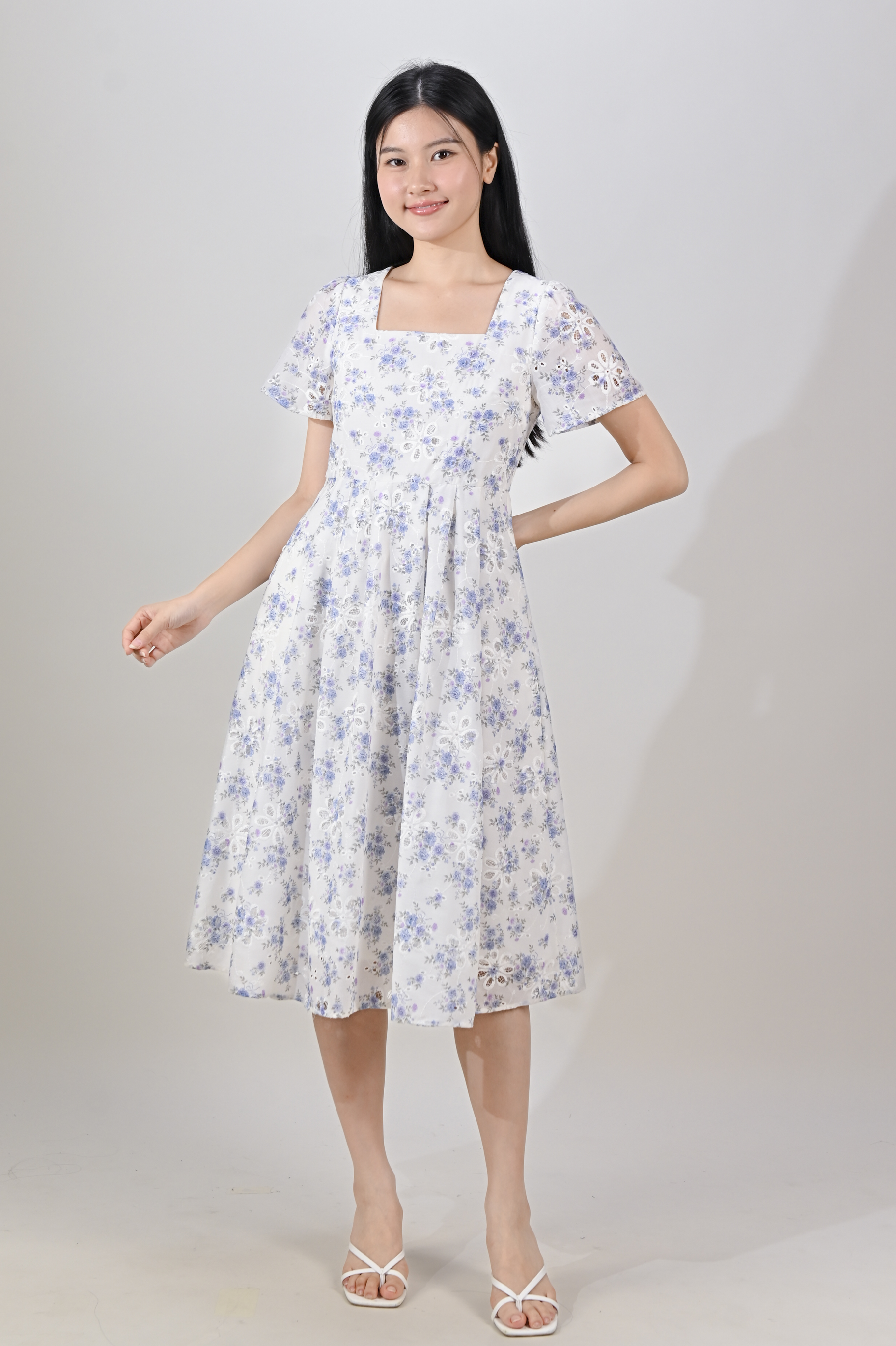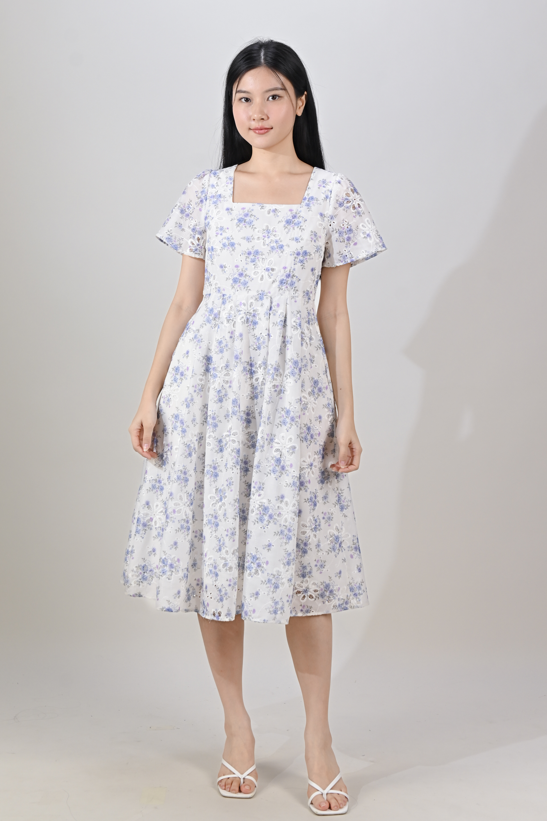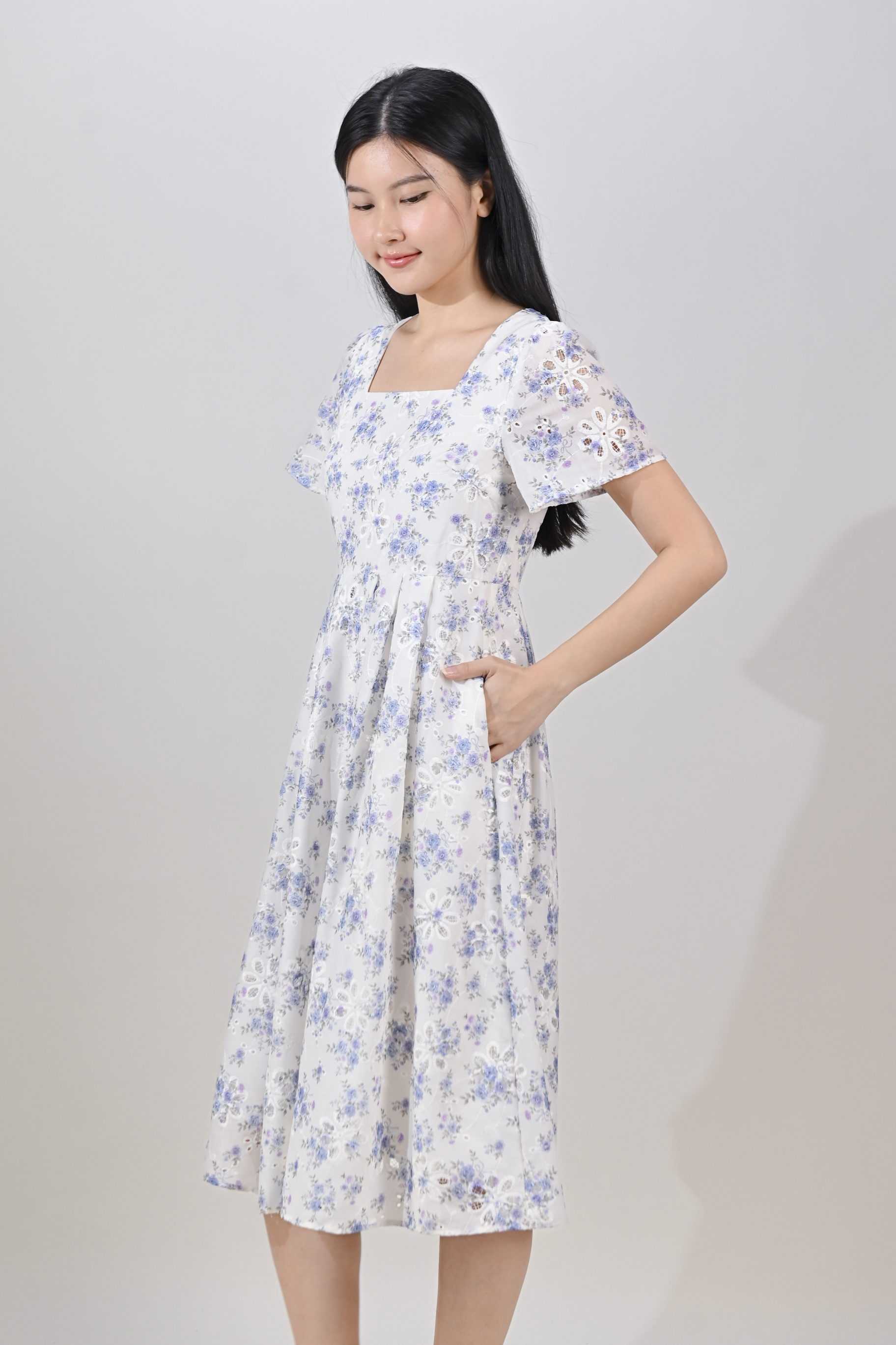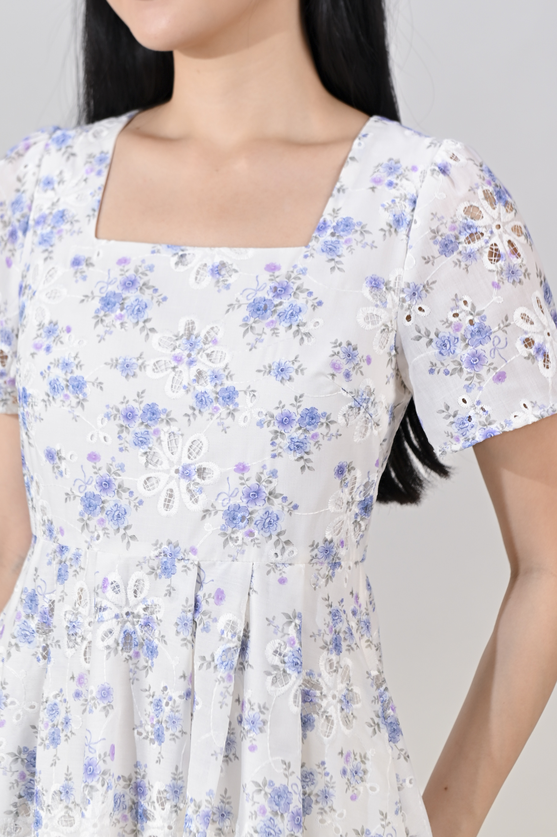 NERIDA EYELET SQUARE-NECK DRESS IN BLUE FLORAL