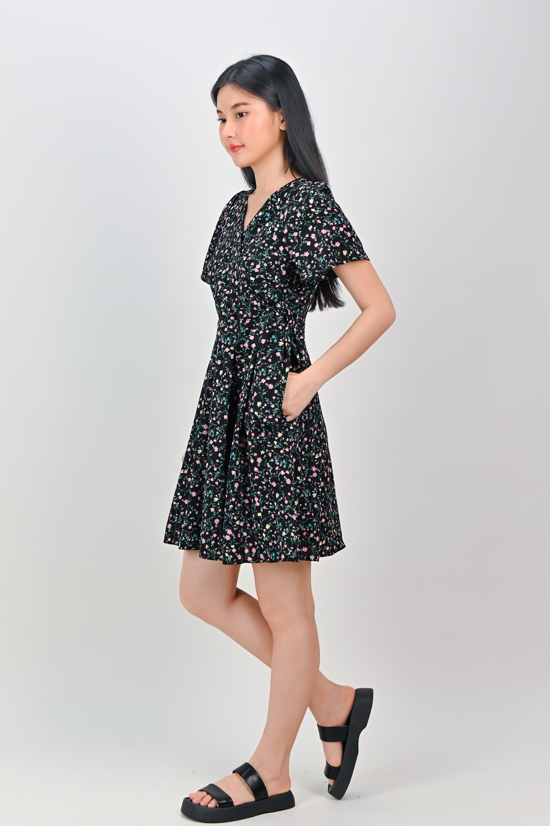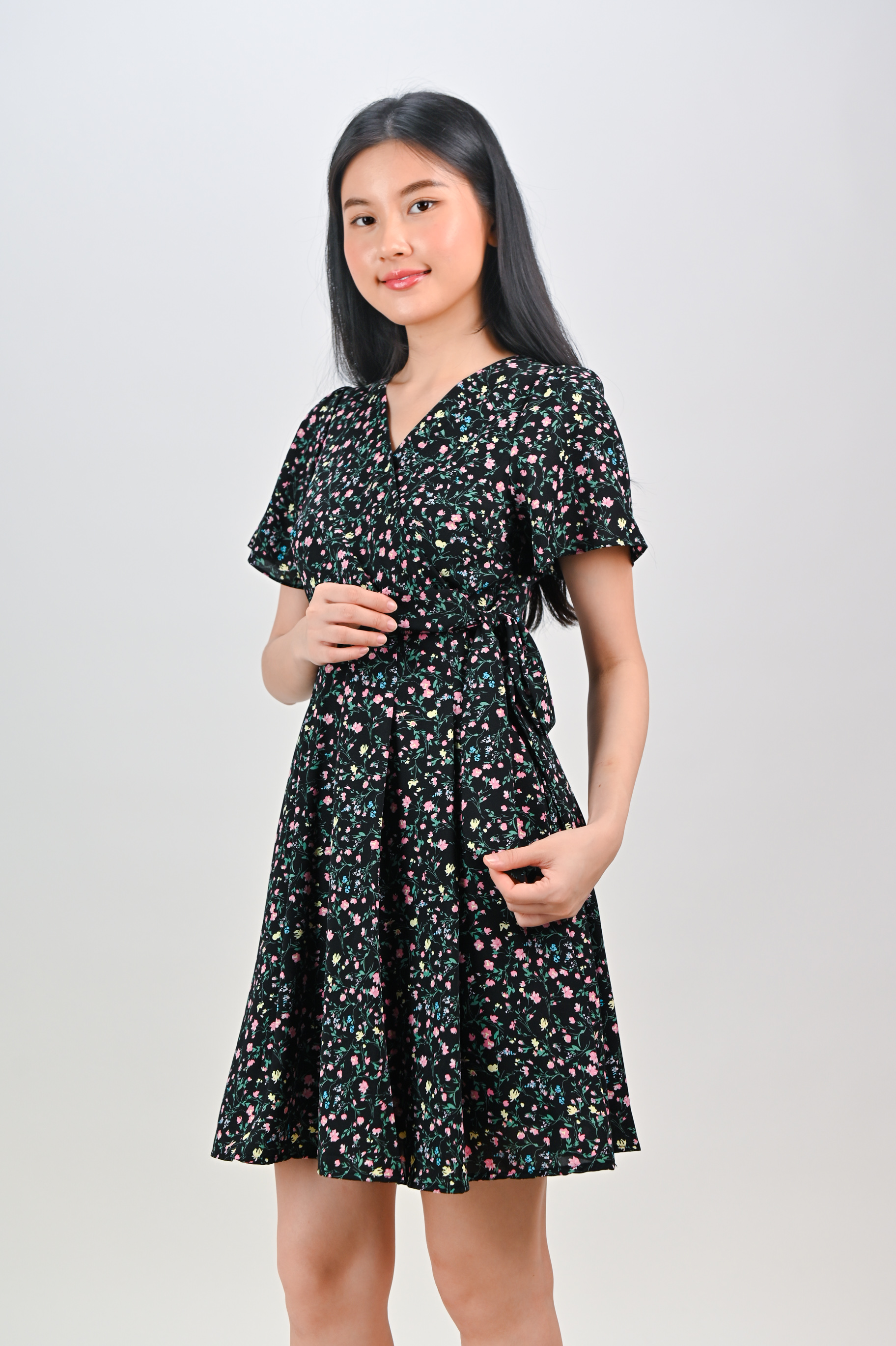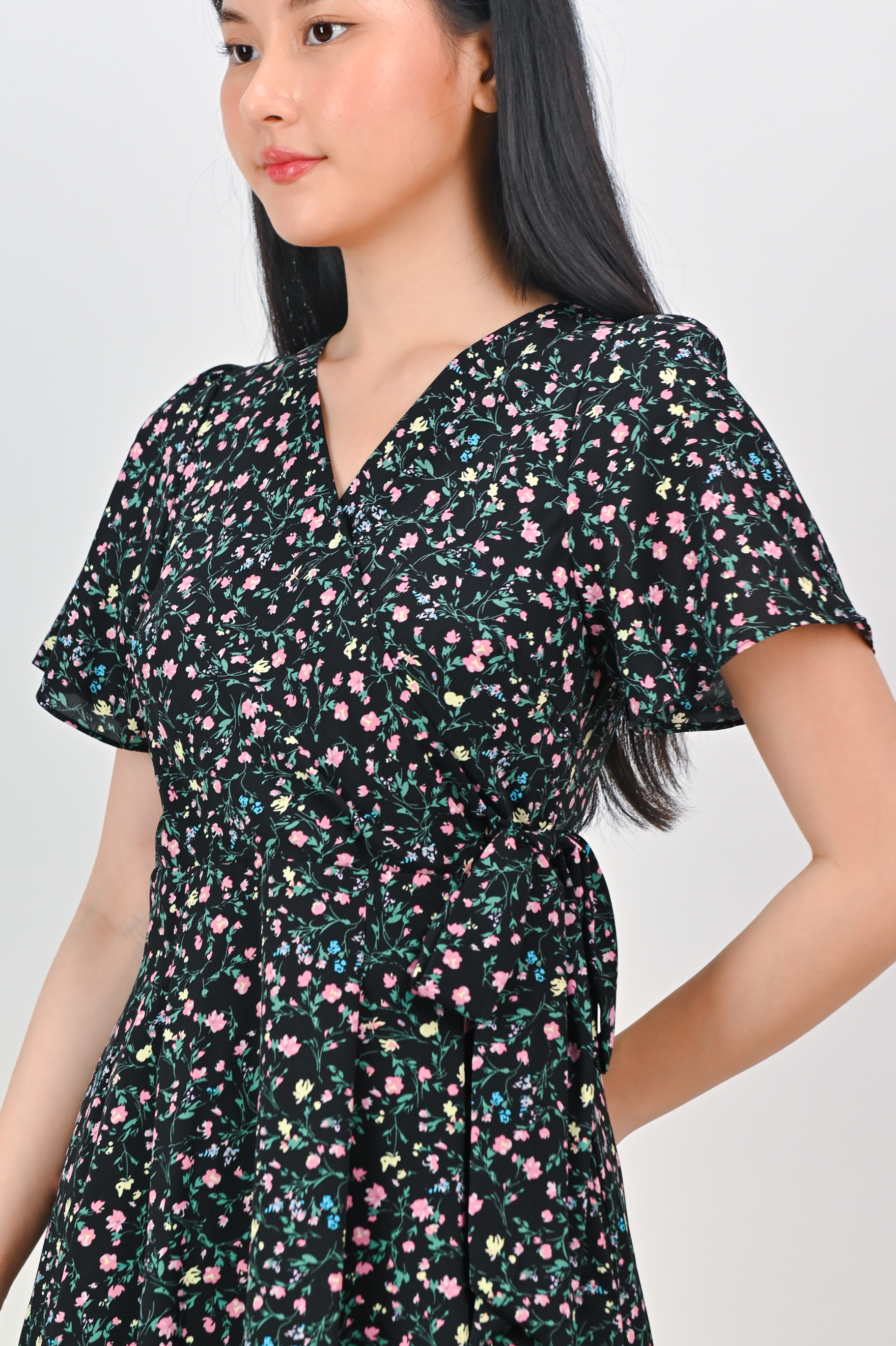 Actual stocks may varyBring it on! Our Nerine Black Floral Faux-Wrap Dress is ready for your work and play! 💋