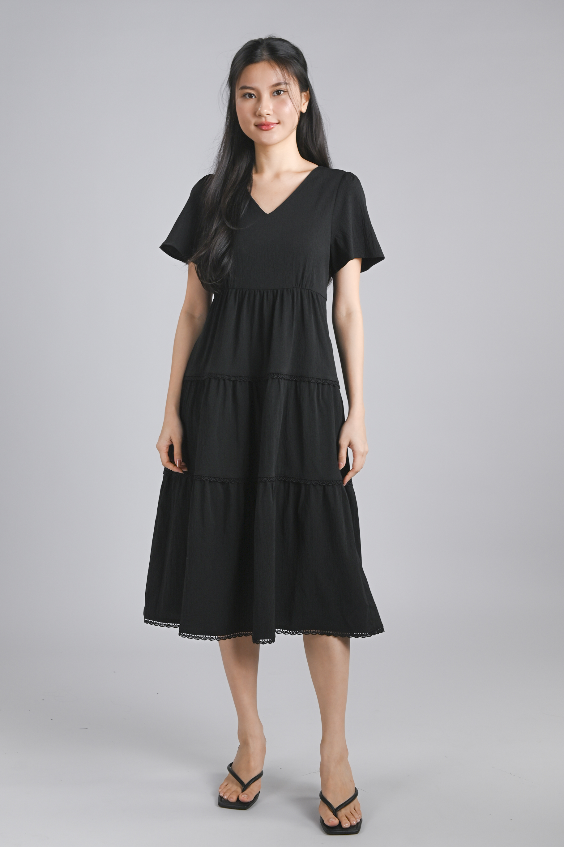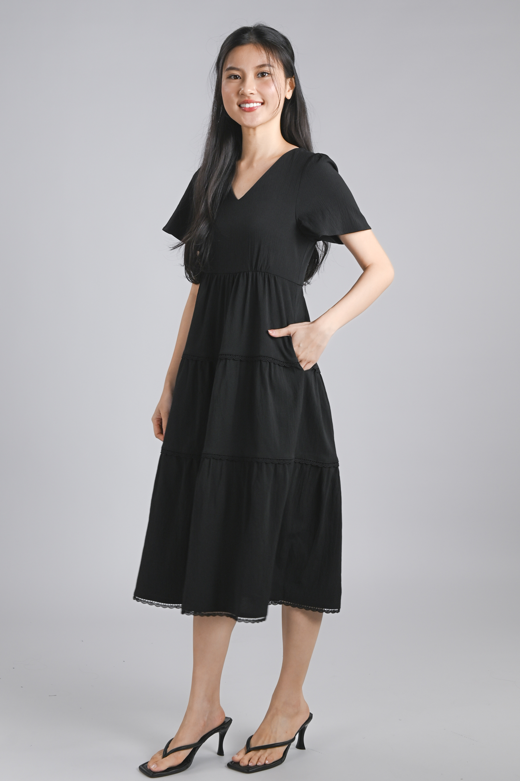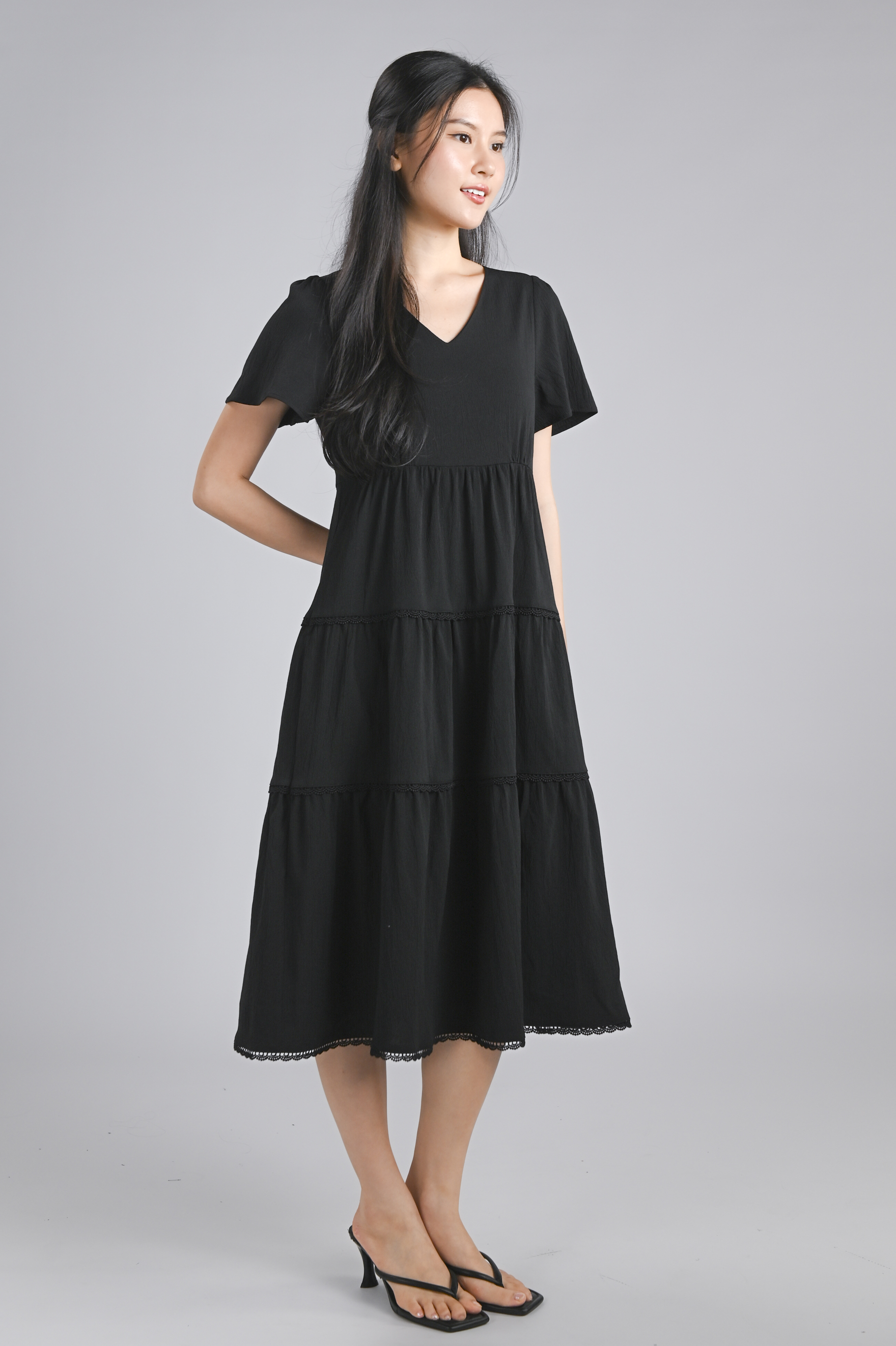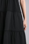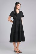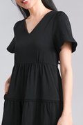 NOKO V-NECK SLEEVED TIERED DRESS IN BLACK