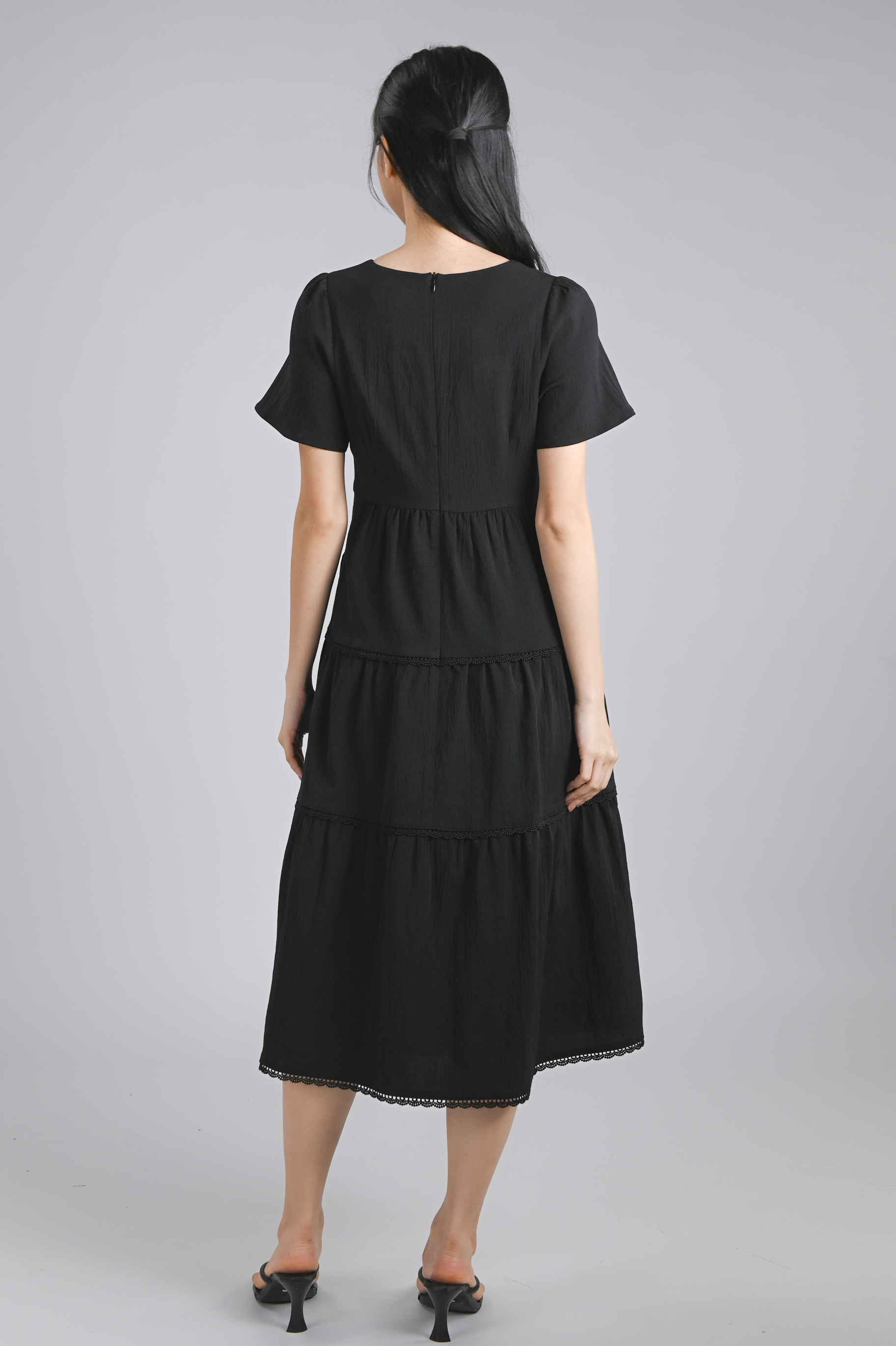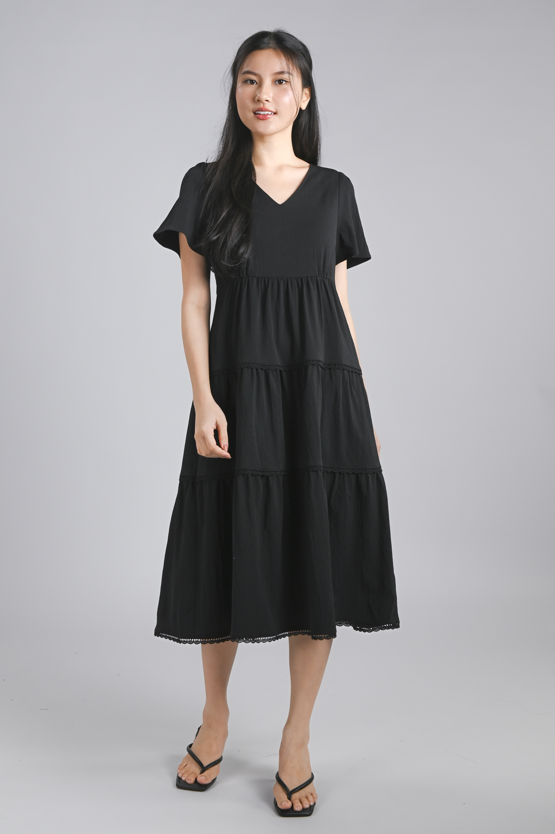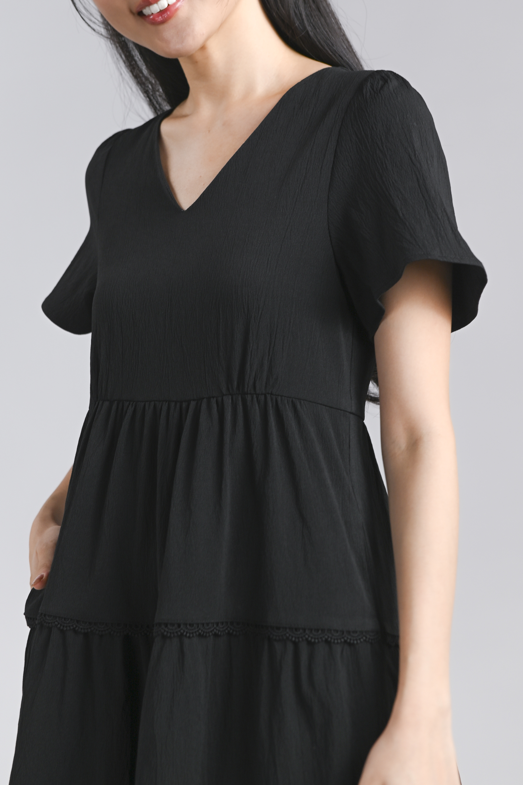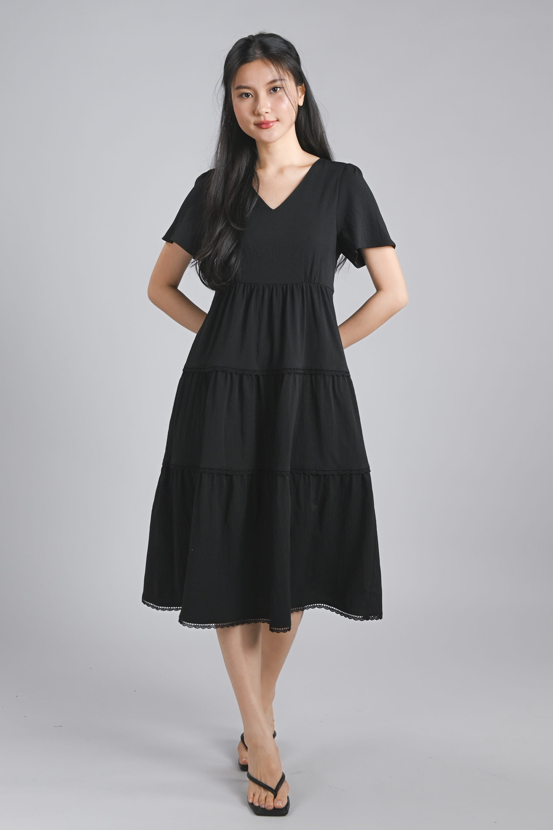 NOKO V-NECK SLEEVED TIERED DRESS IN BLACK