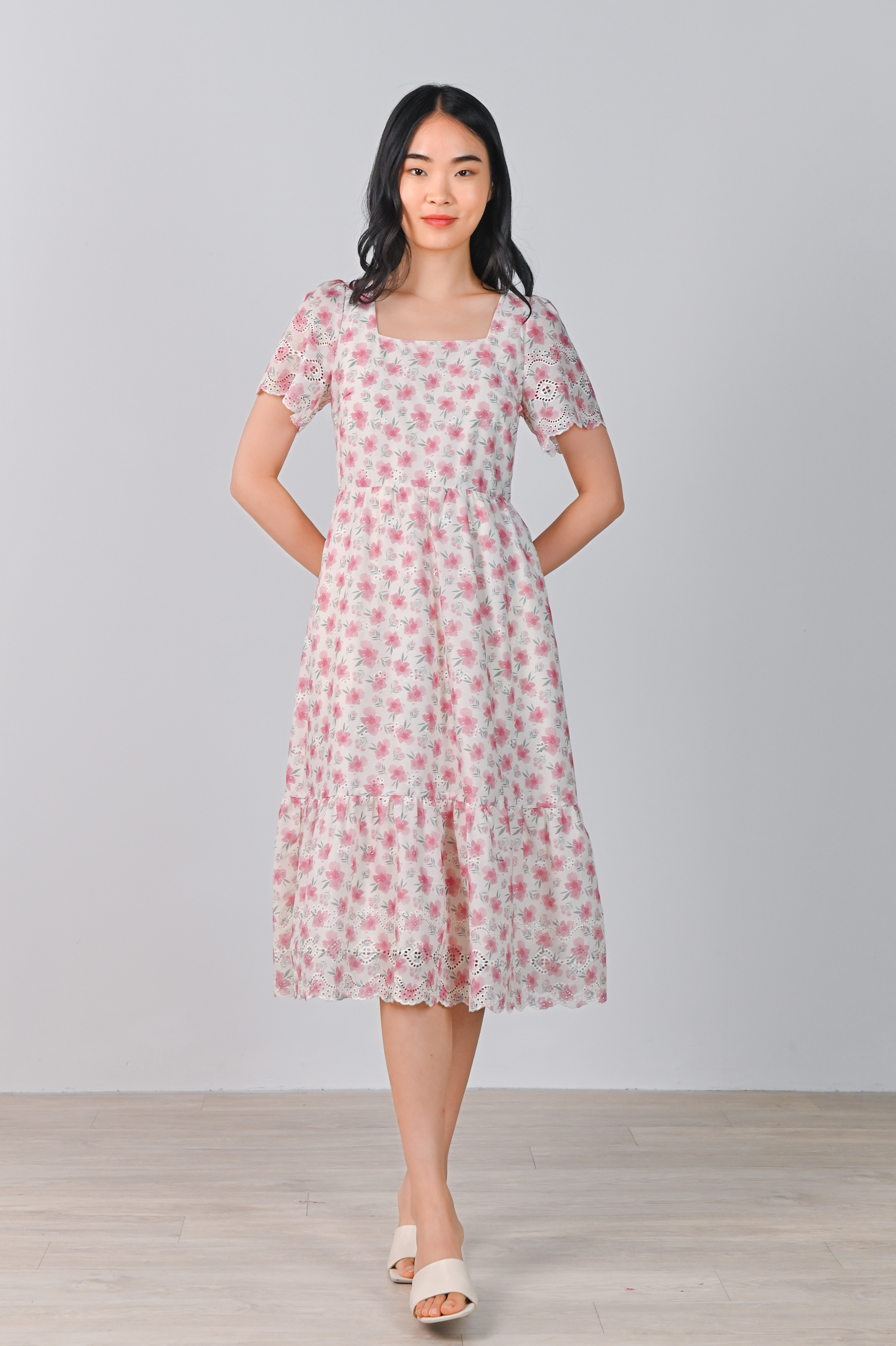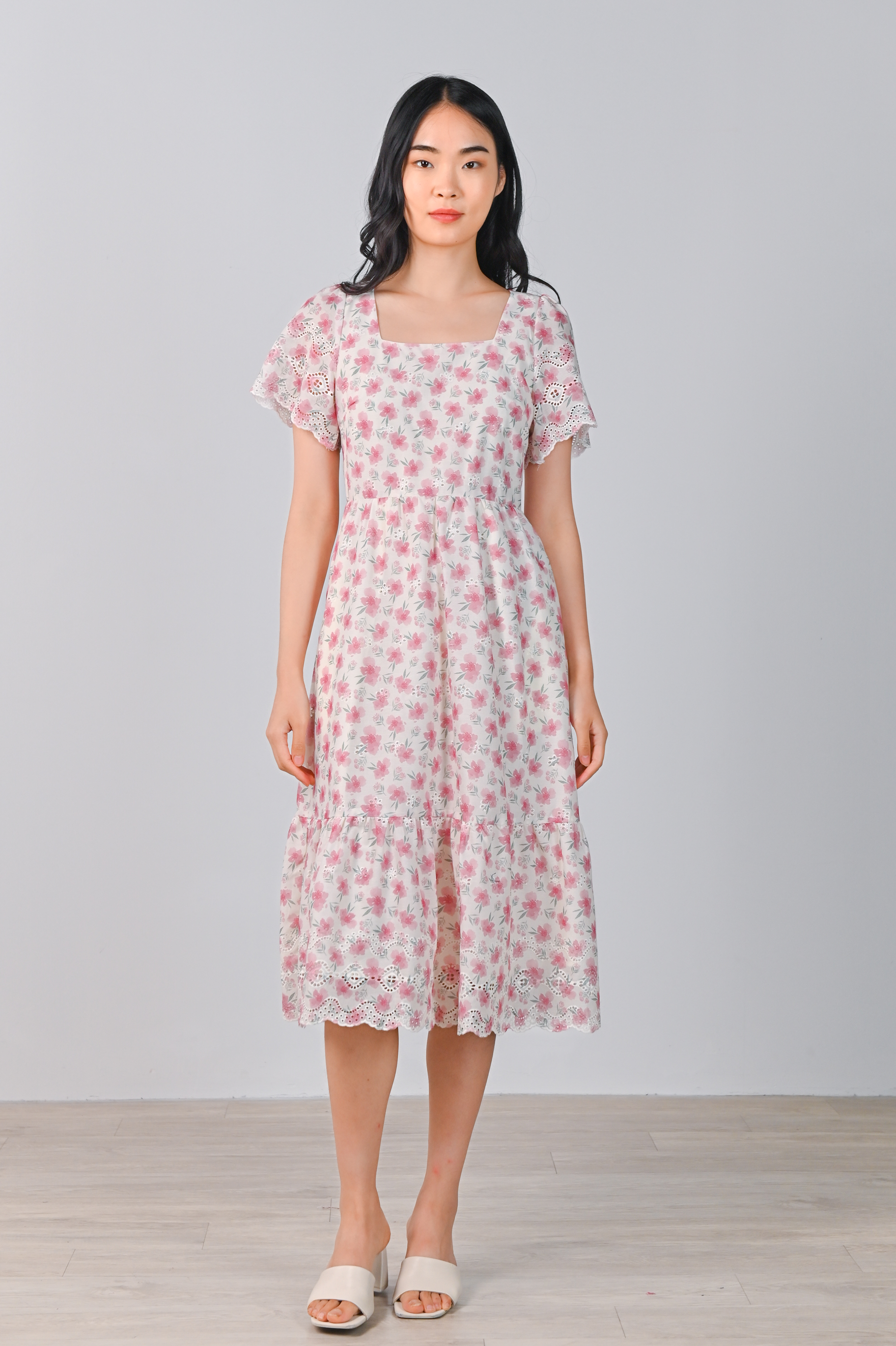 NYX PINK FLORAL EYELET SQUARE-NECK DRESS