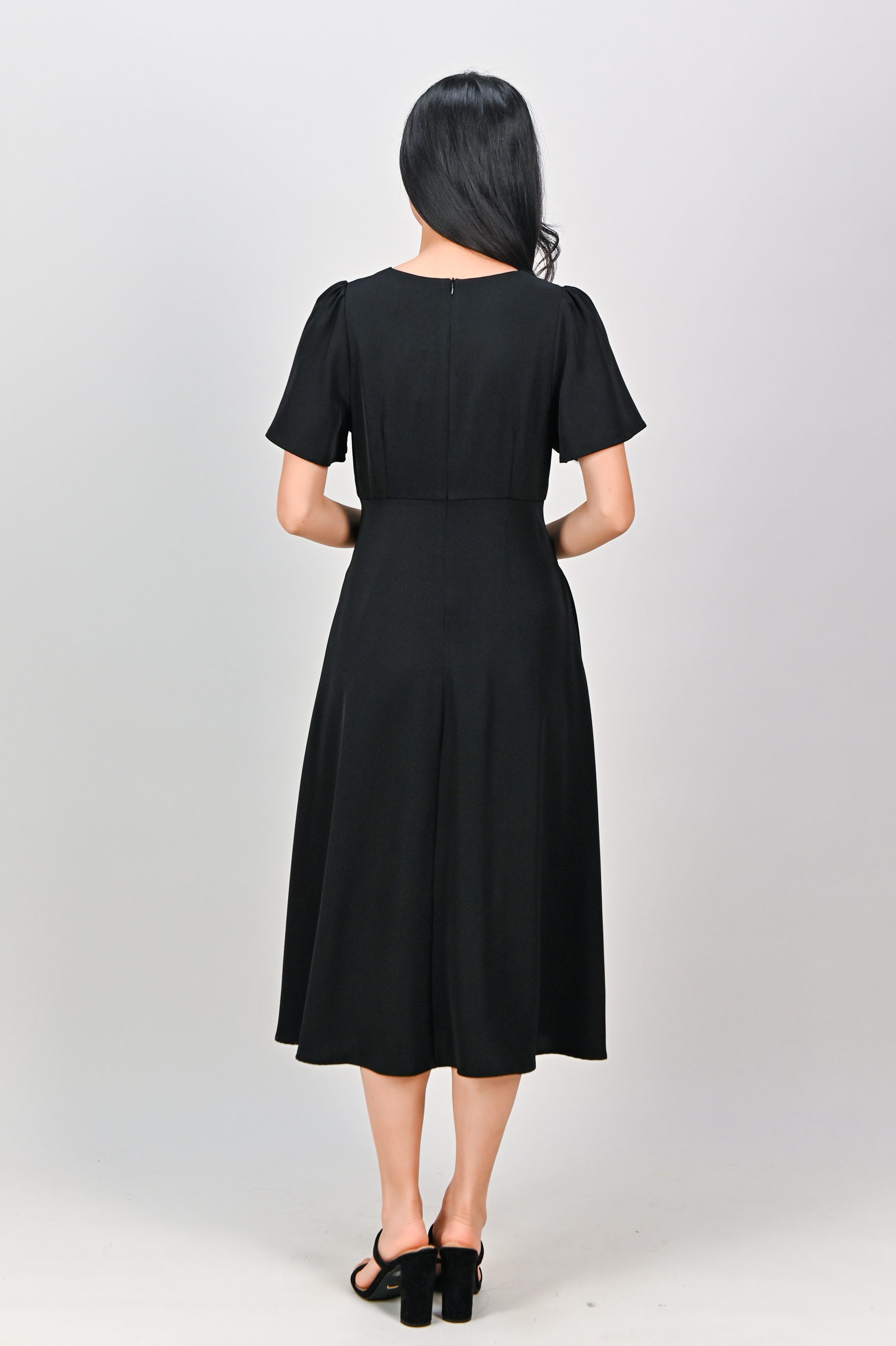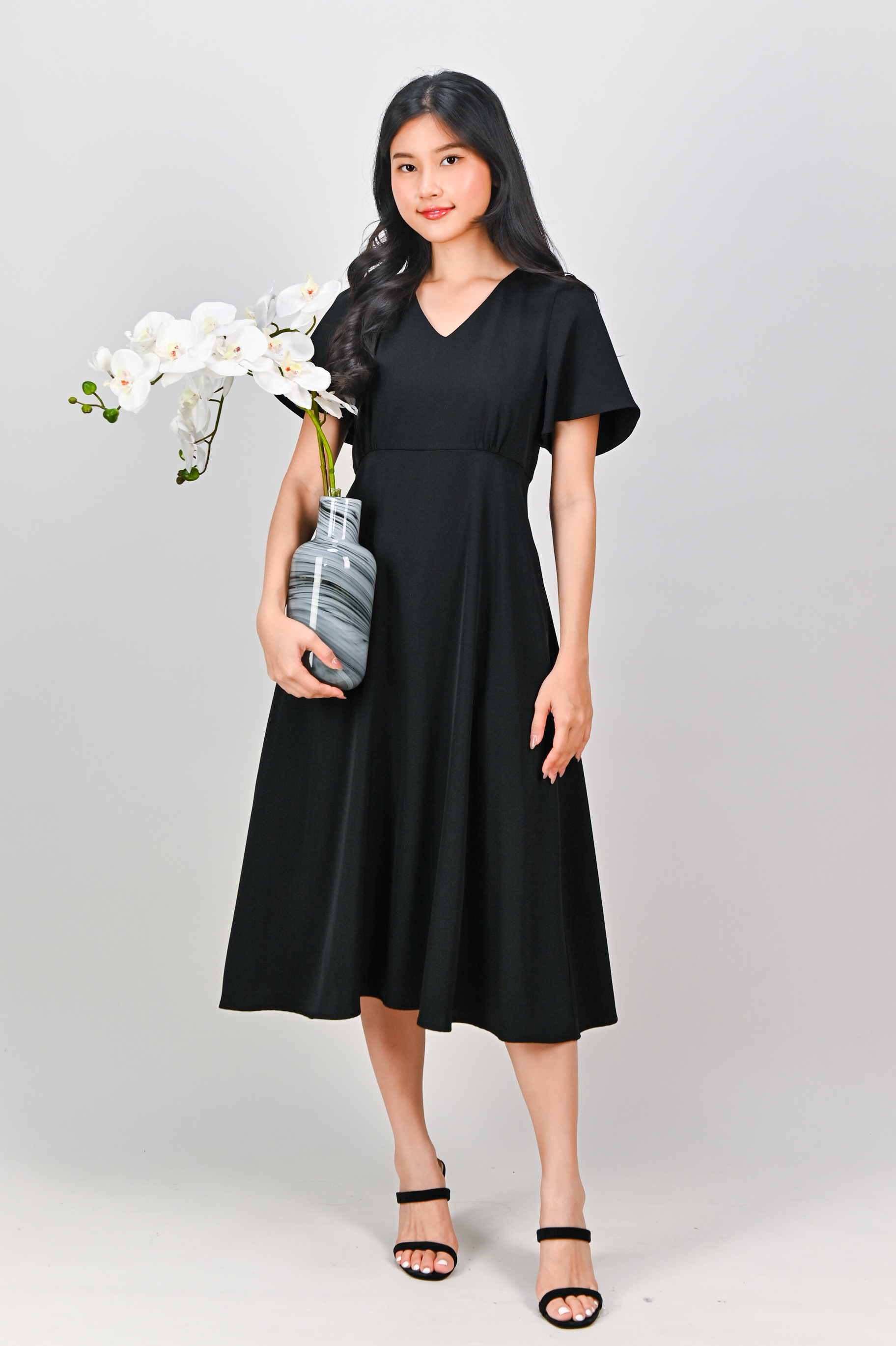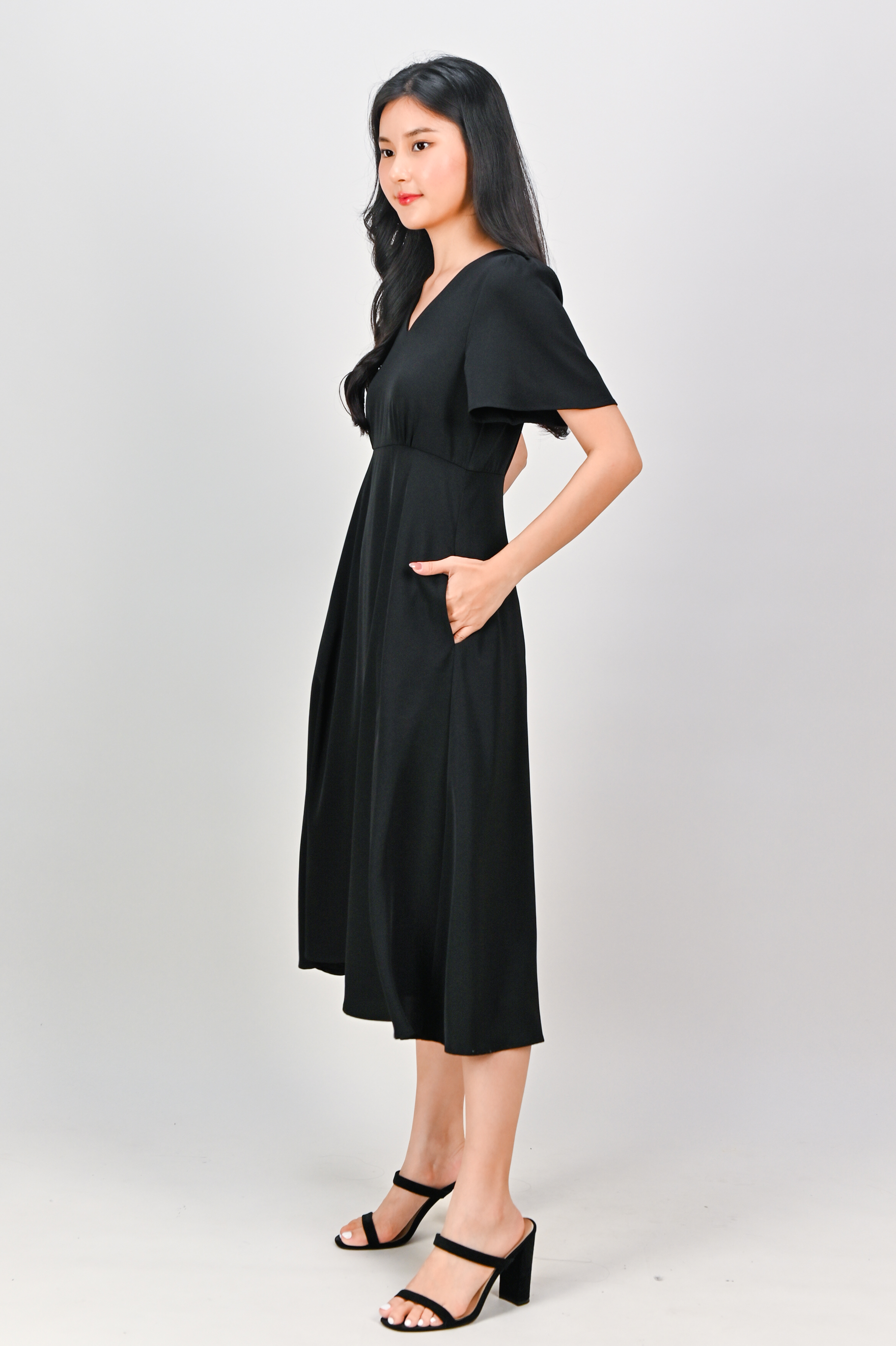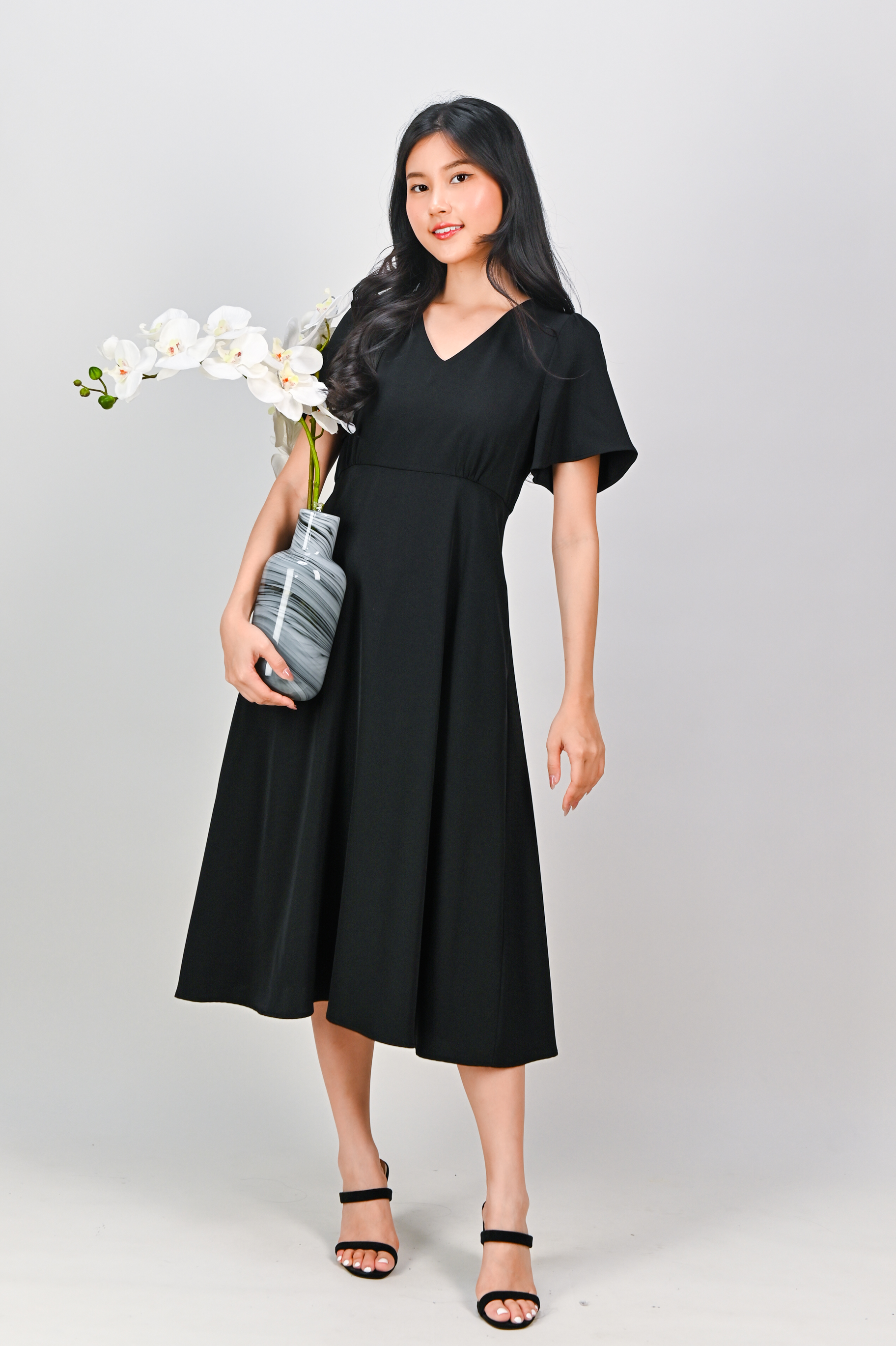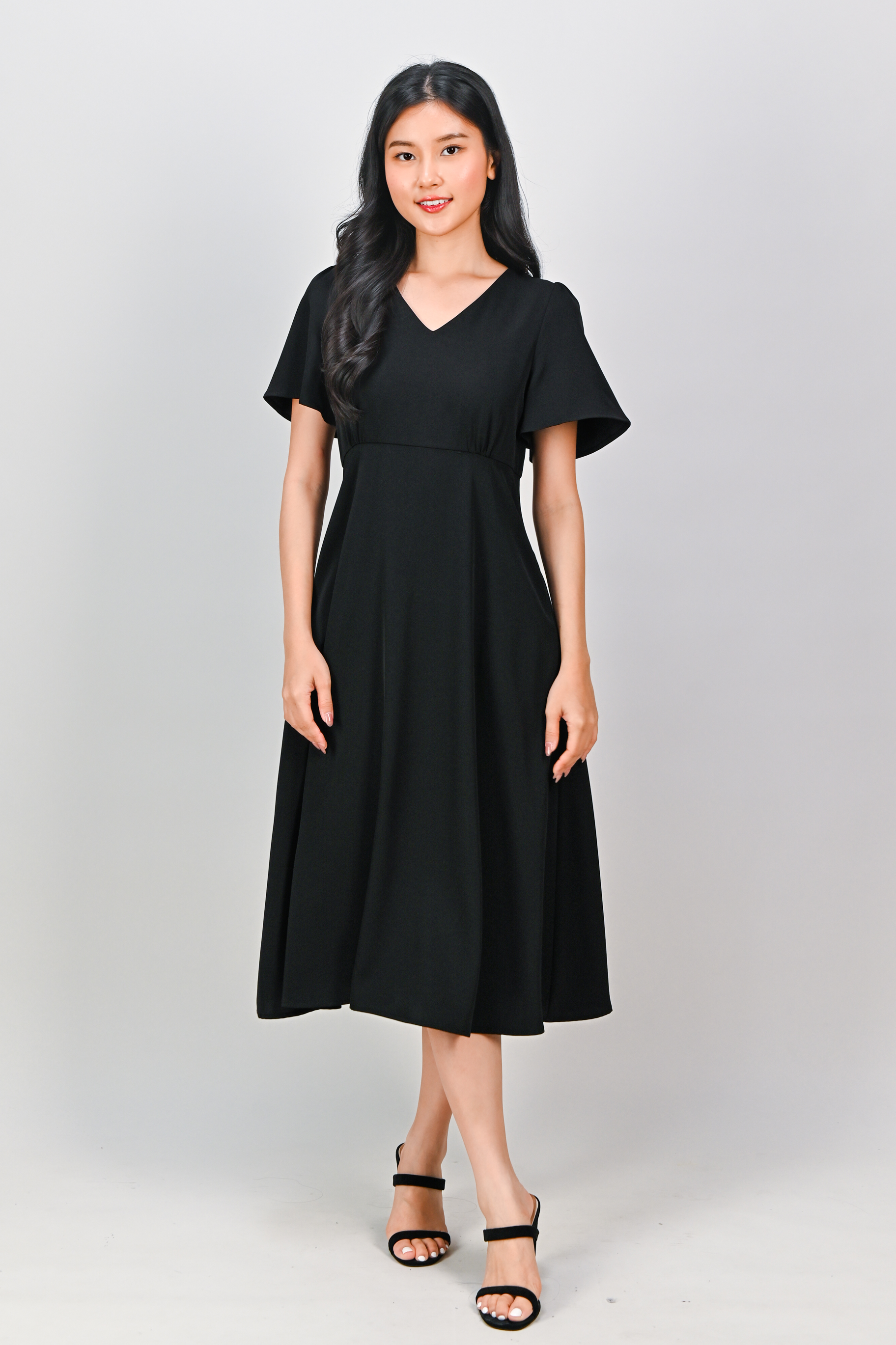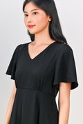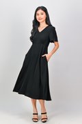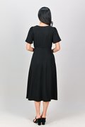 OLSEN SLEEVED V-NECK HIGH-WAIST DRESS IN BLACK