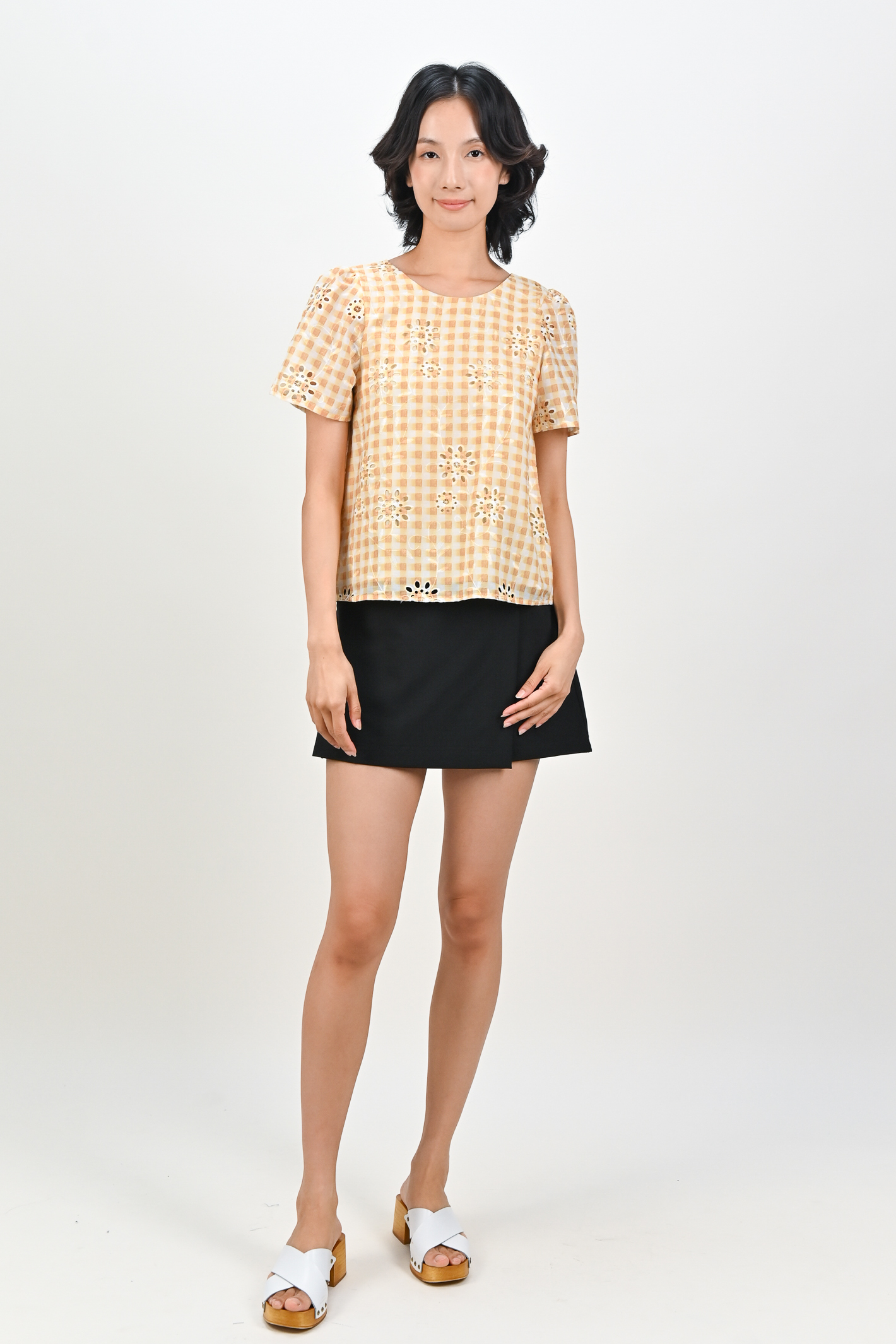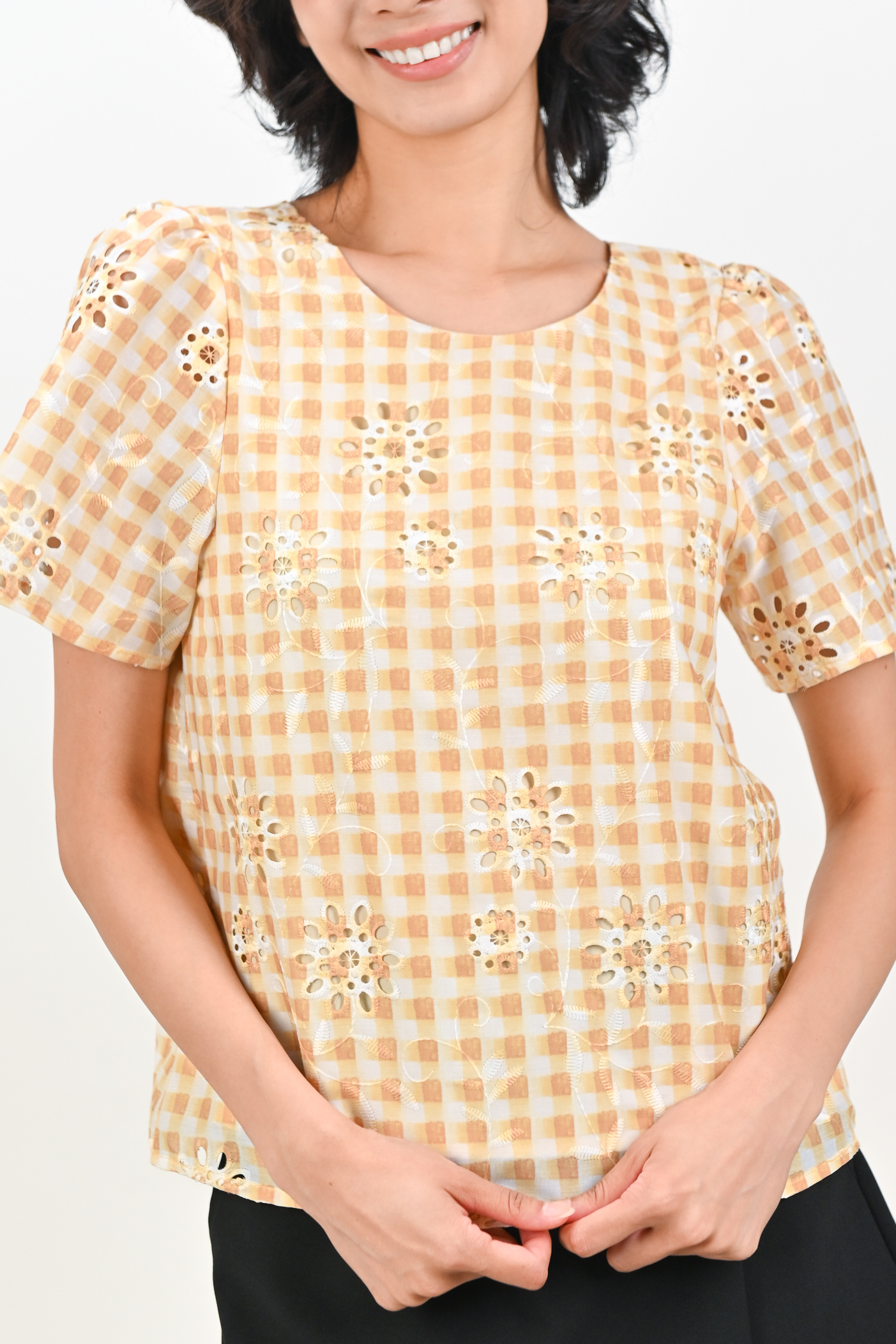 Actual stocks may varyThink picnic perfection meets polished elegance 🧺💐 Soft checks and floral eyelets come together perfectly on this piece for a sweet, easy, classy look! 💛🩷🩵