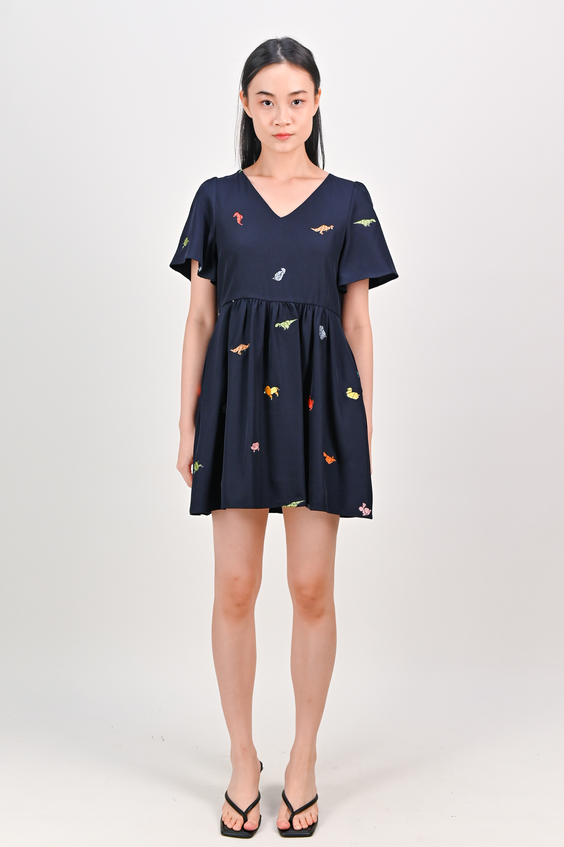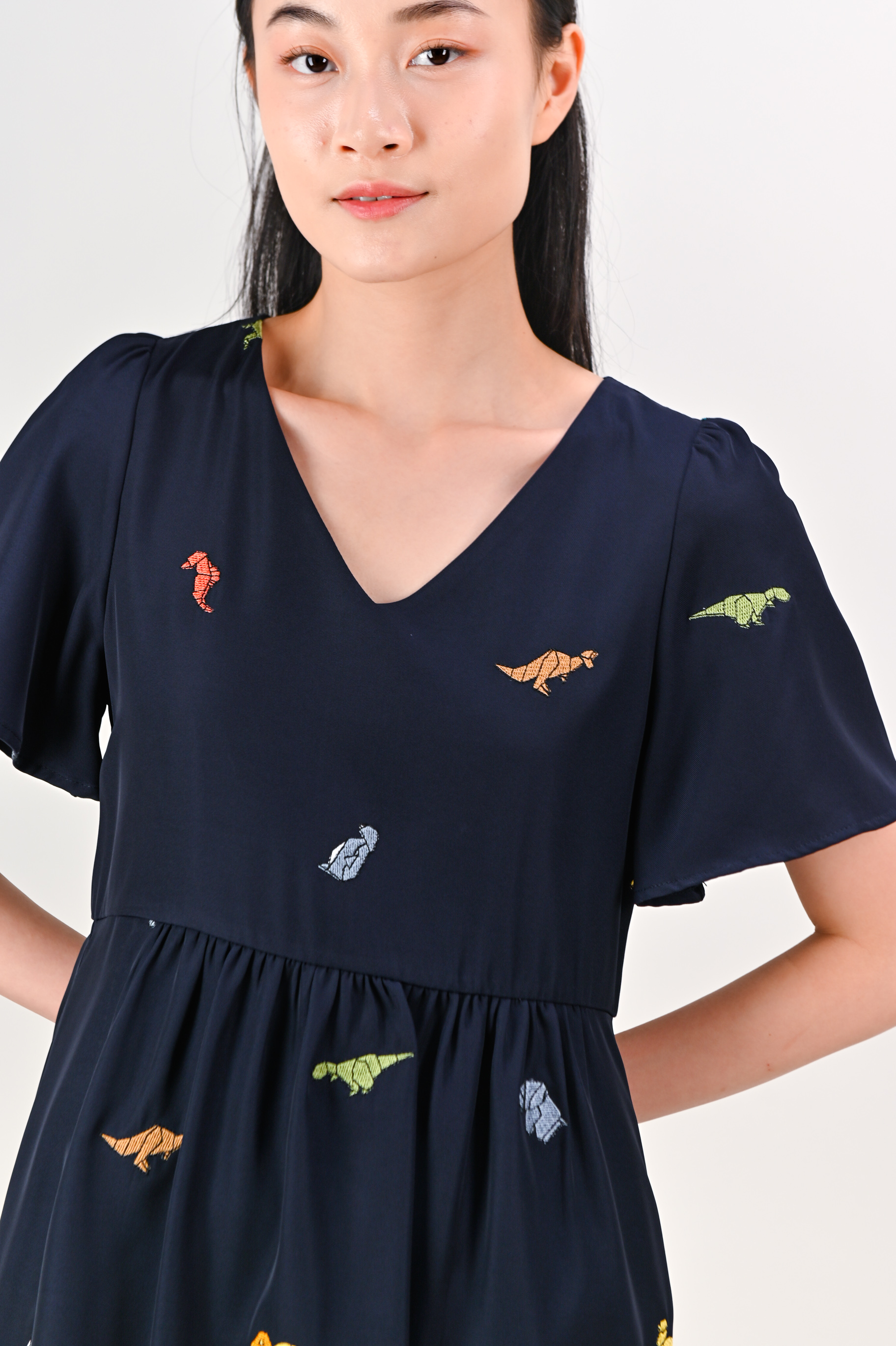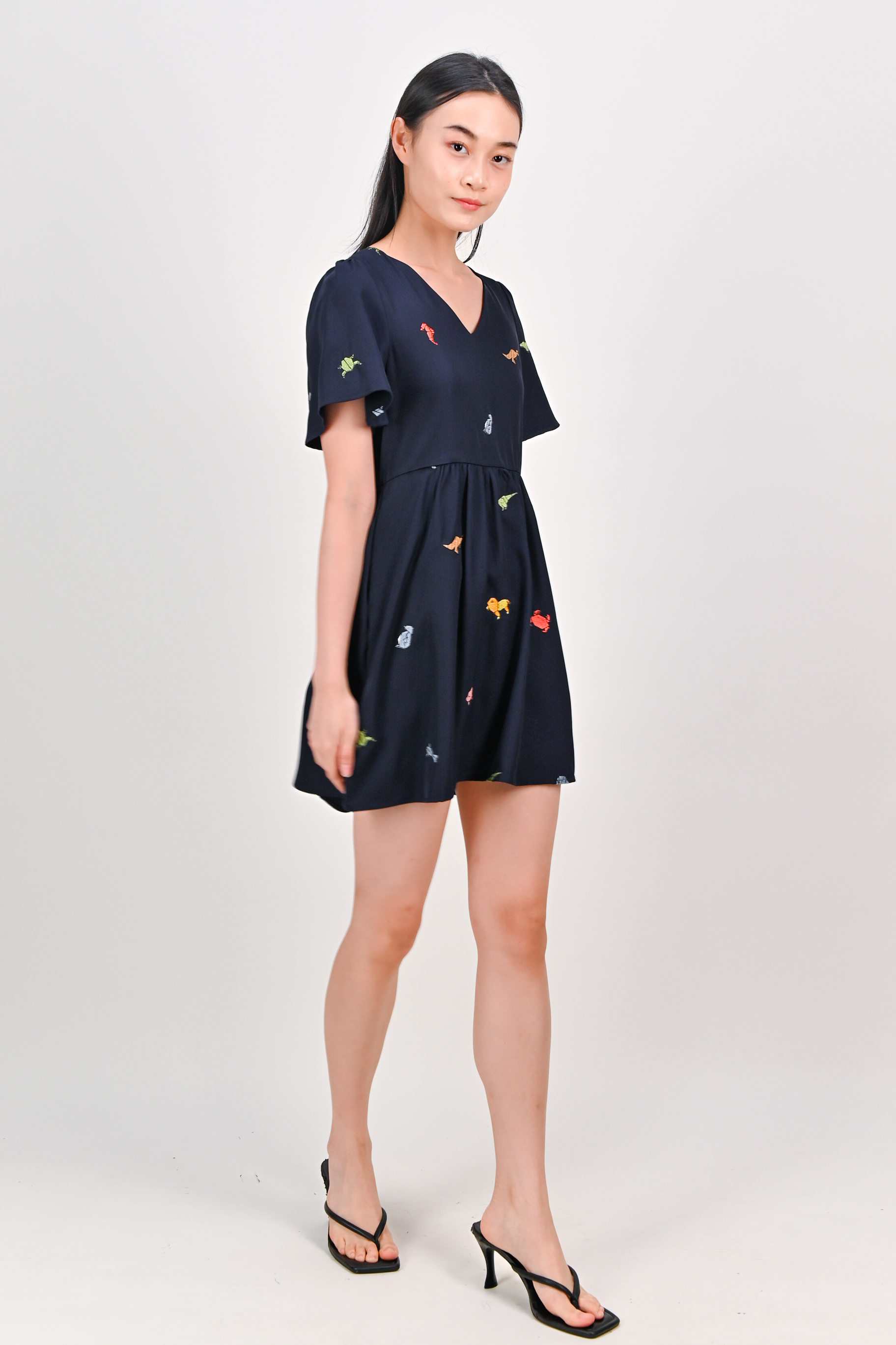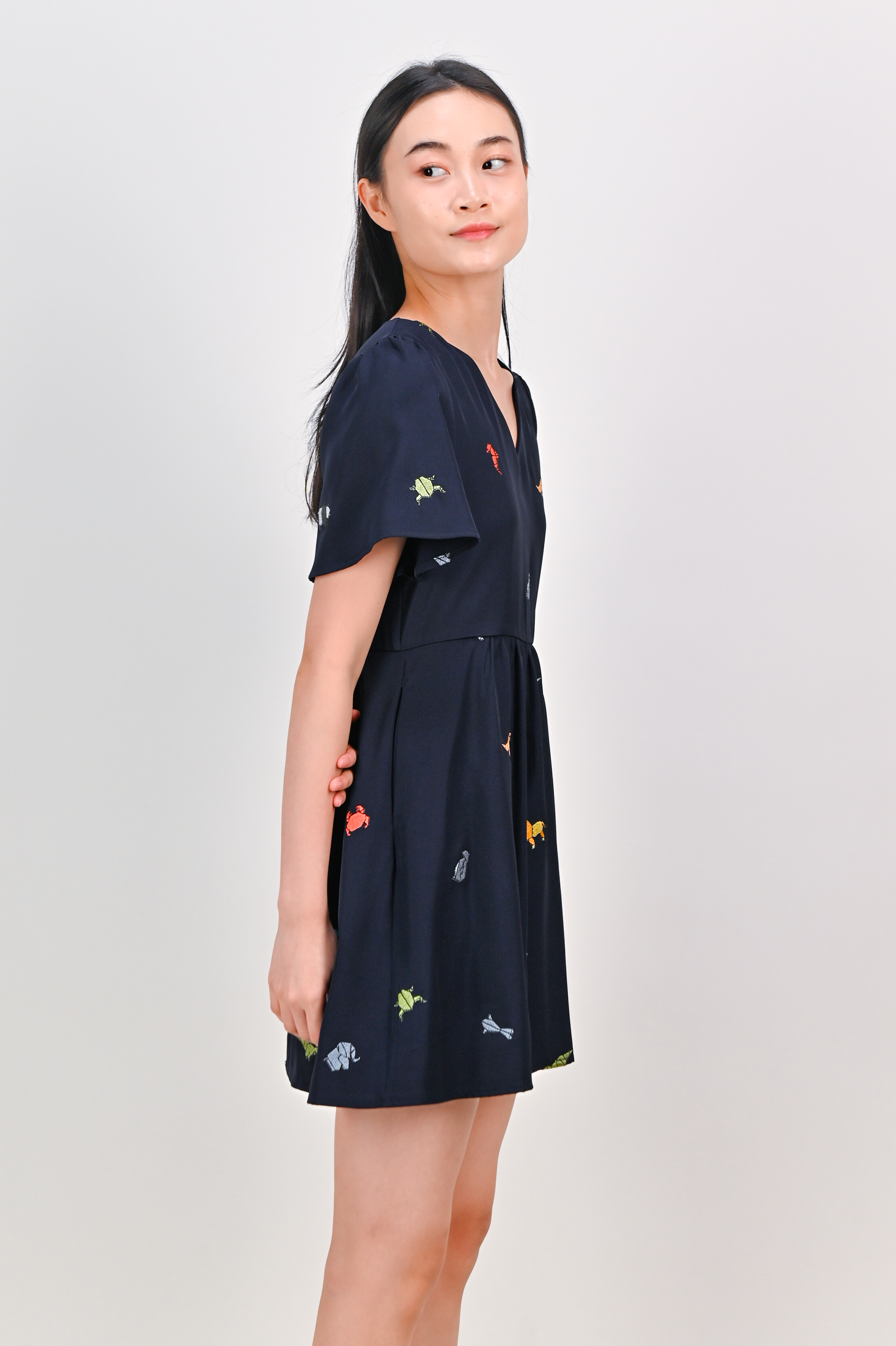 ORIGAMI ZOO NAVY EMB. V-NECK DRESS-ROMPER