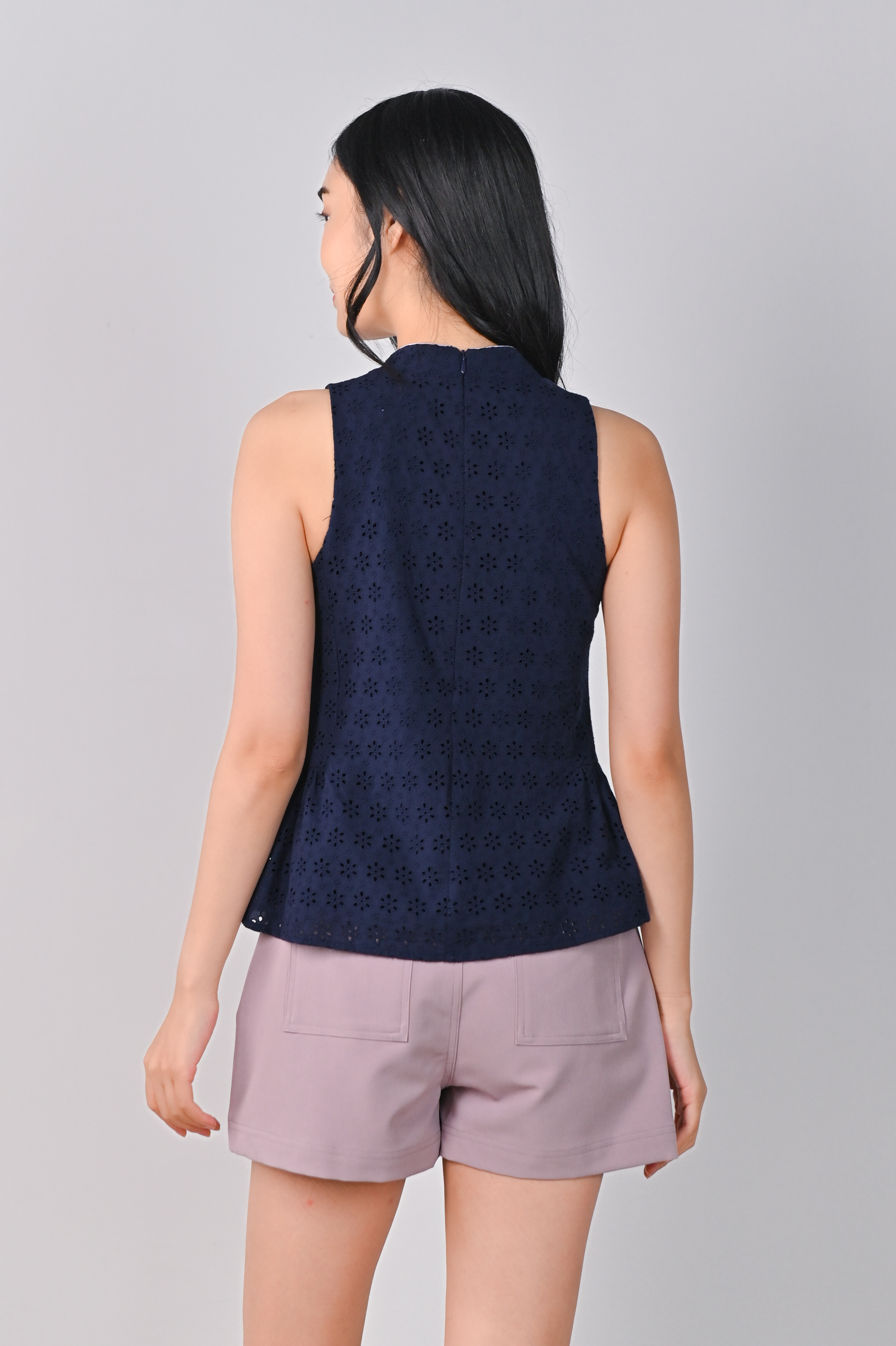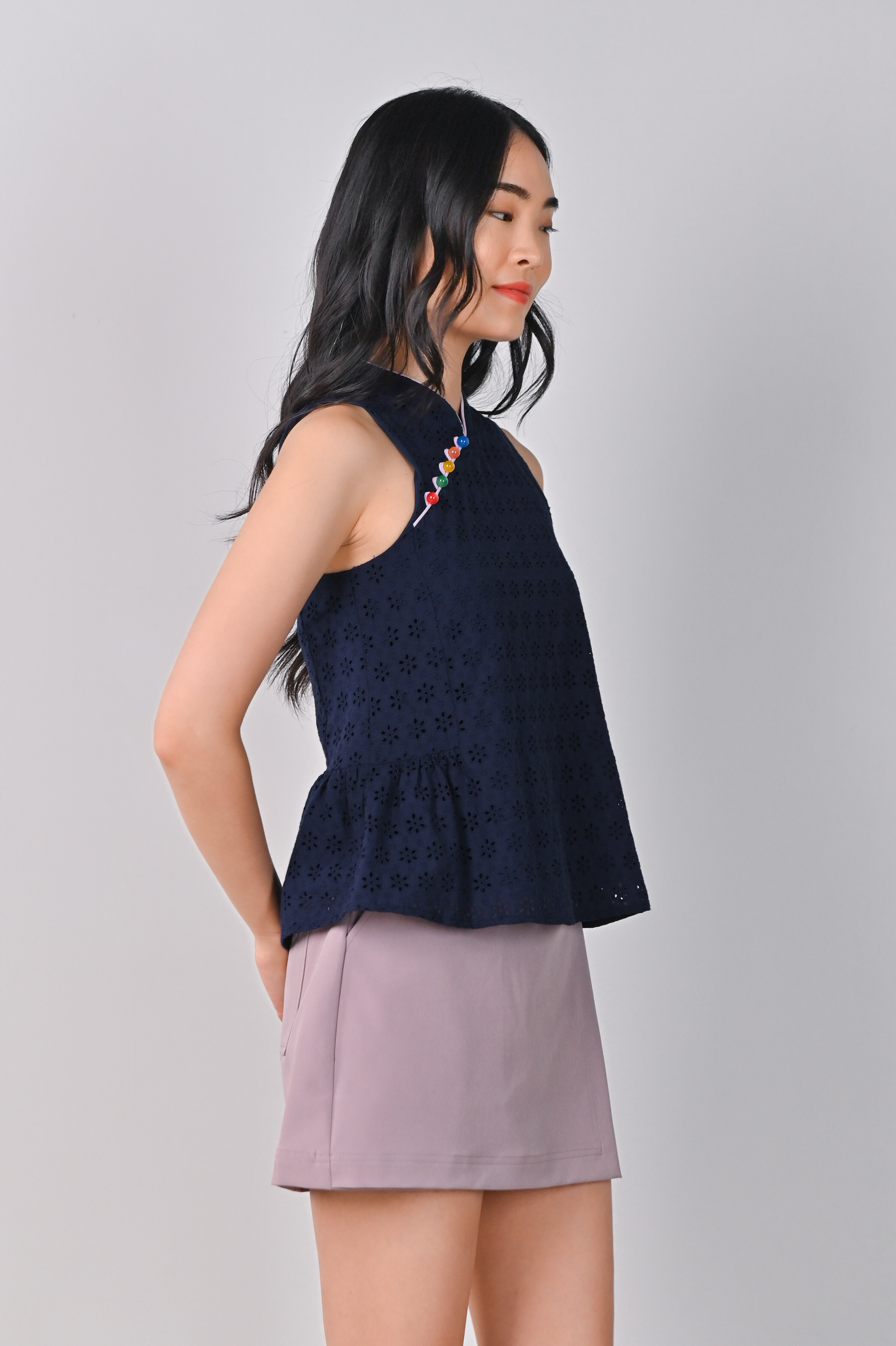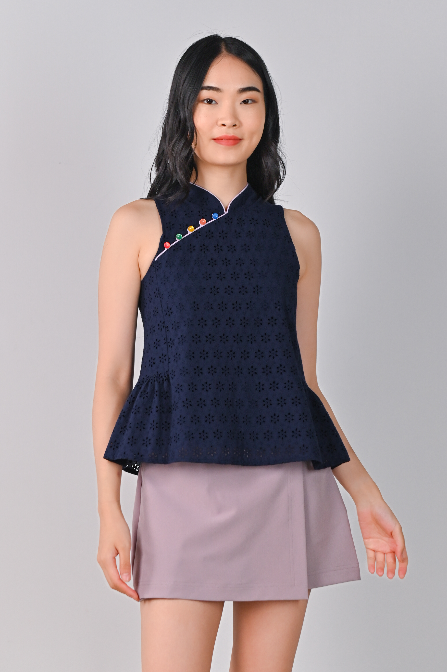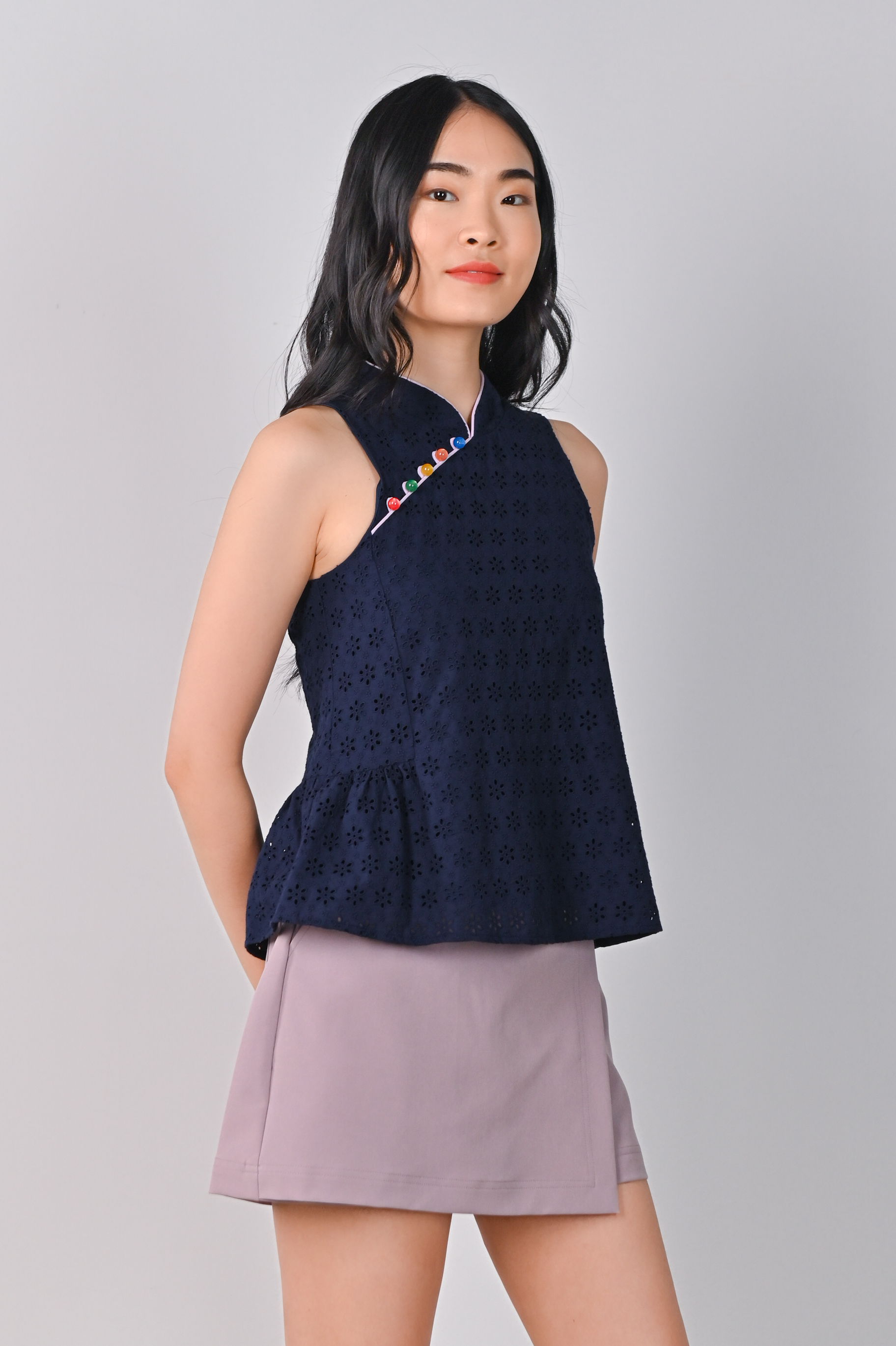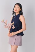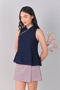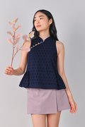 CHOON EYELET FLARE CHEONGSAM TOP IN NAVY