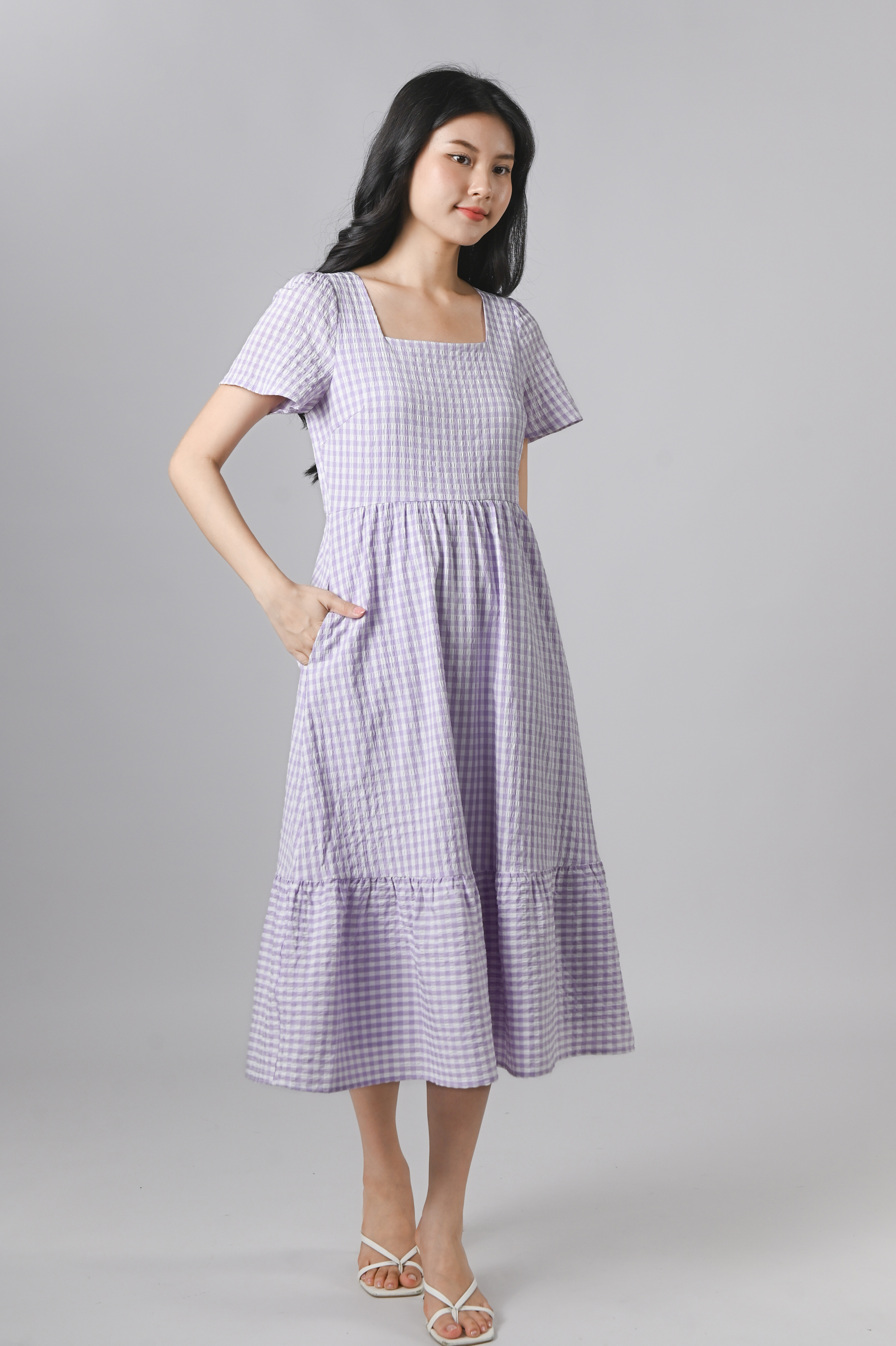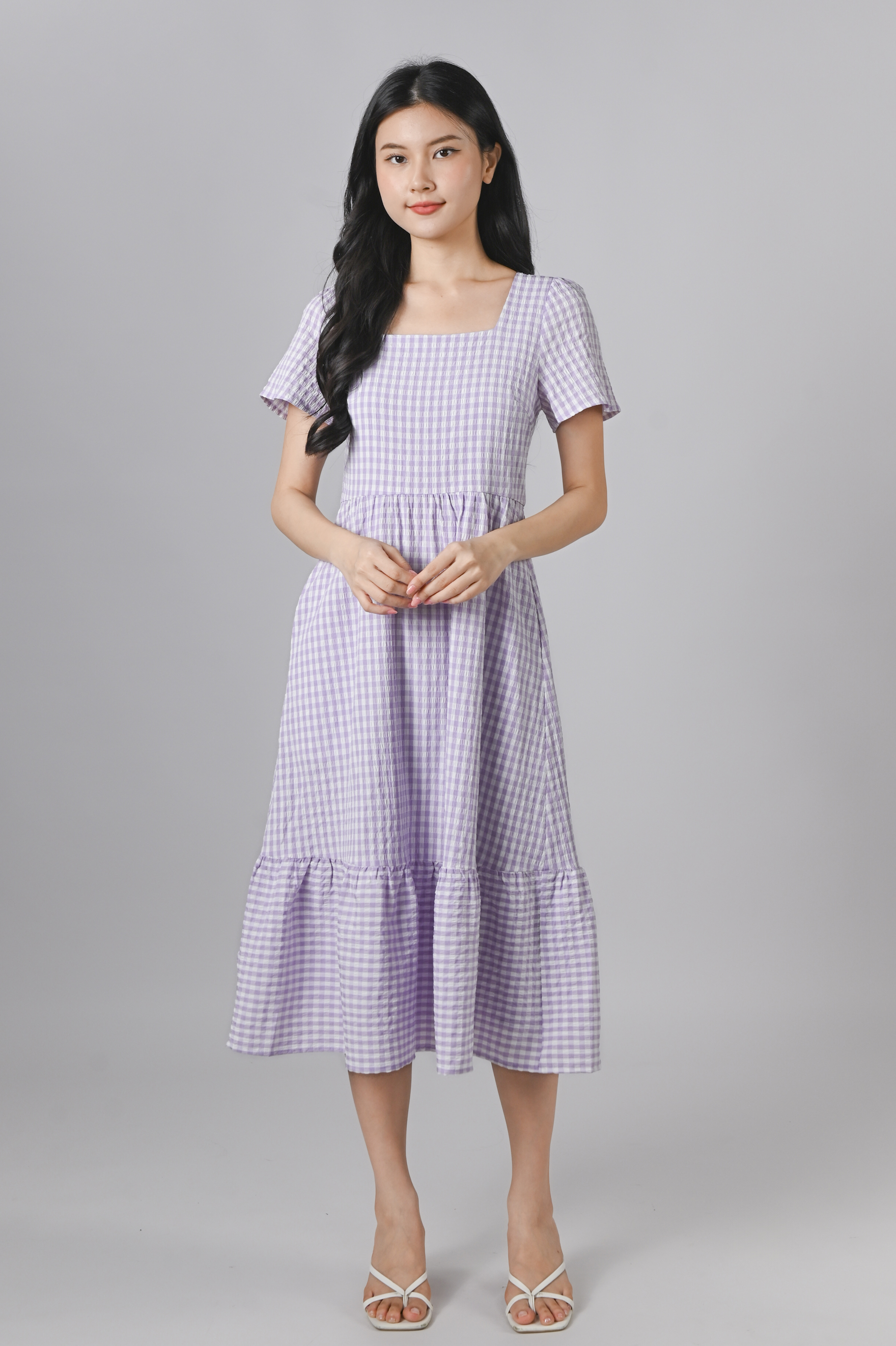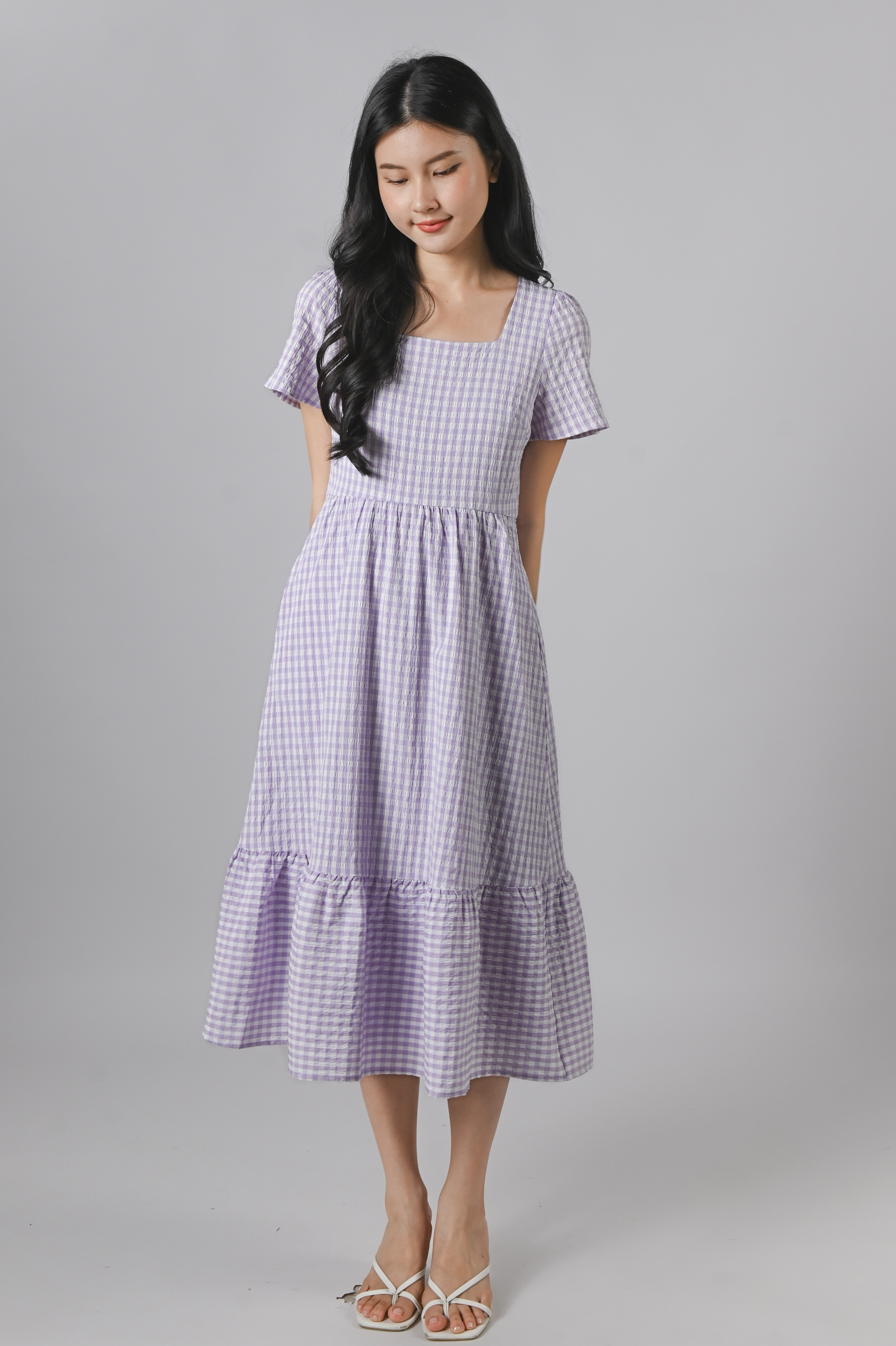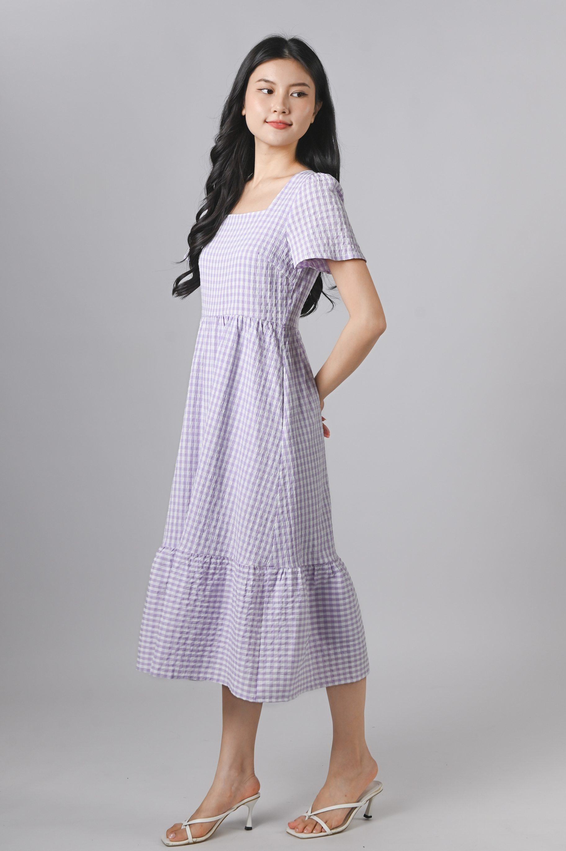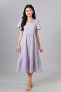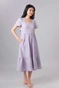 PENELOPE GINGHAM SQUARE-NECK SLEEVED DRESS IN LILAC