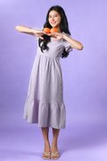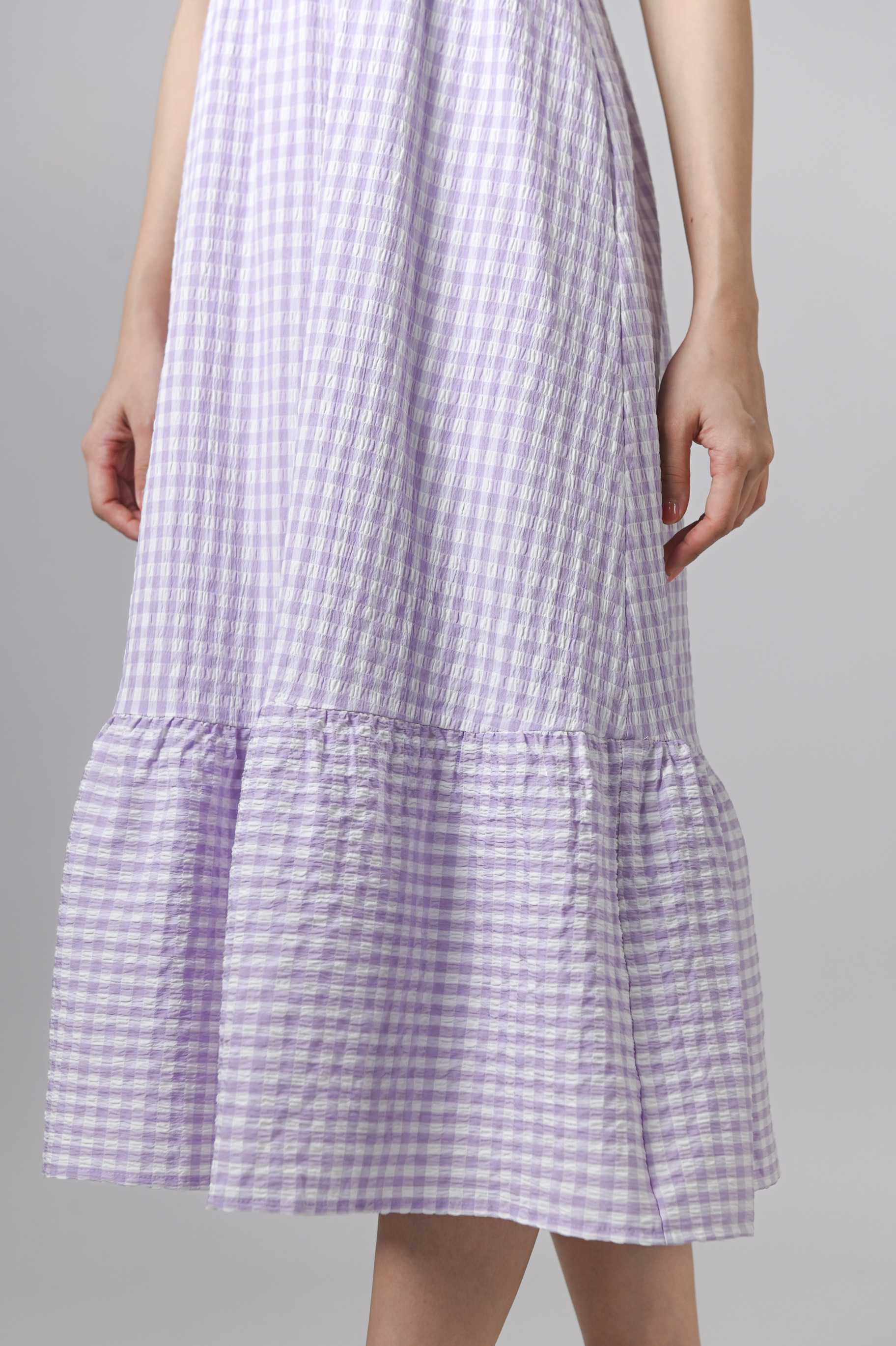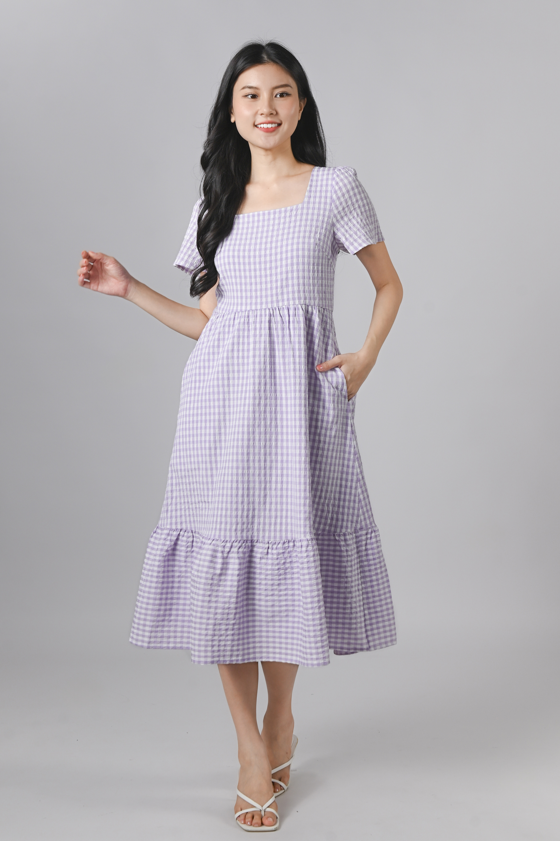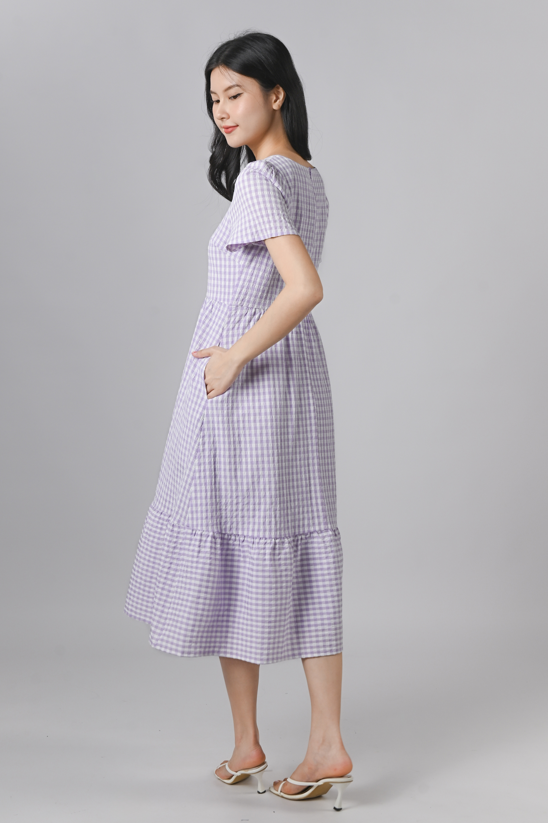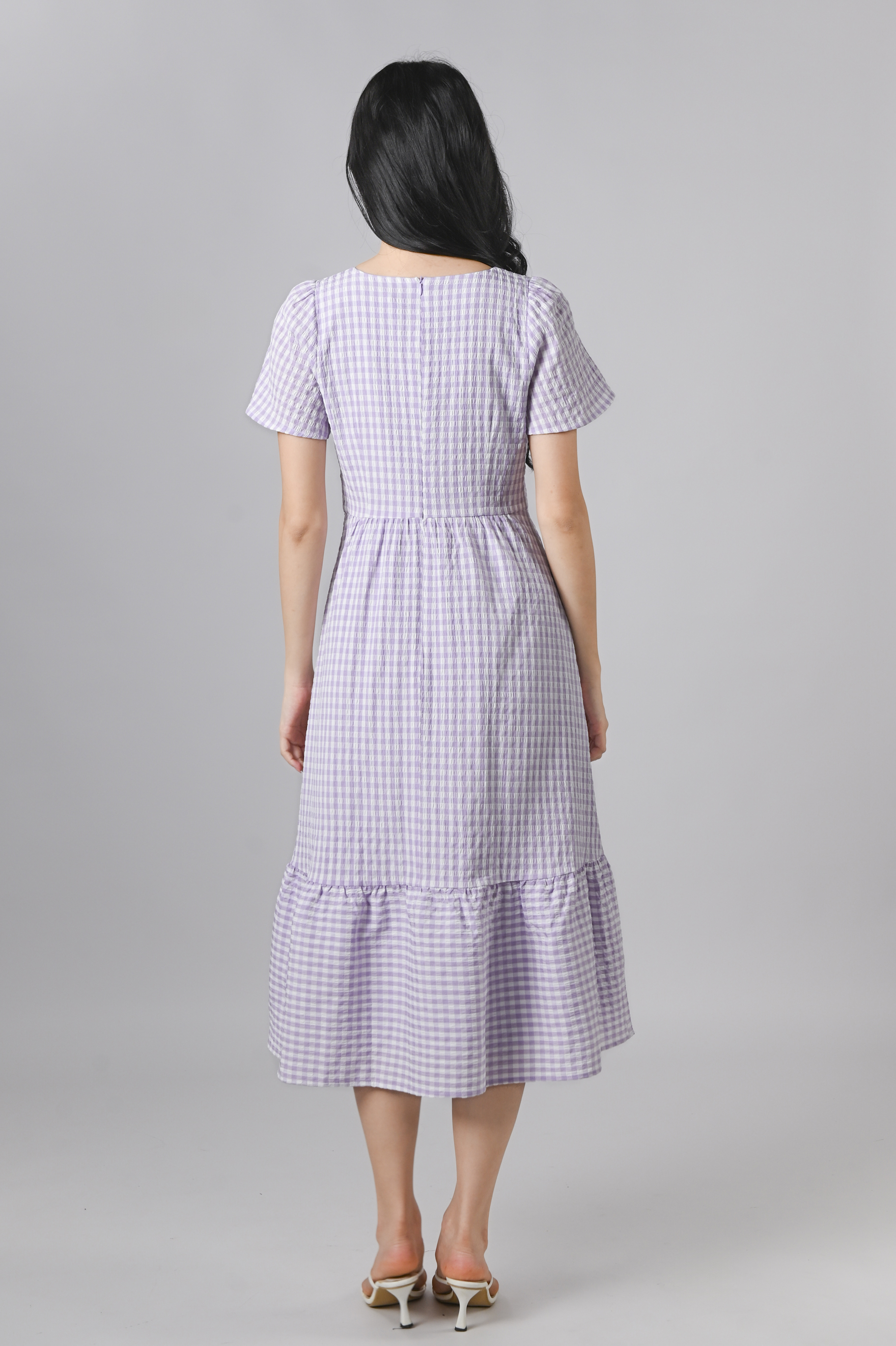 PENELOPE GINGHAM SQUARE-NECK SLEEVED DRESS IN LILAC