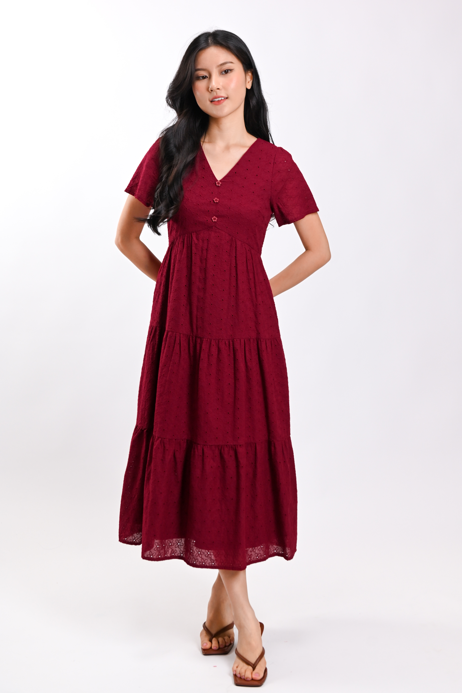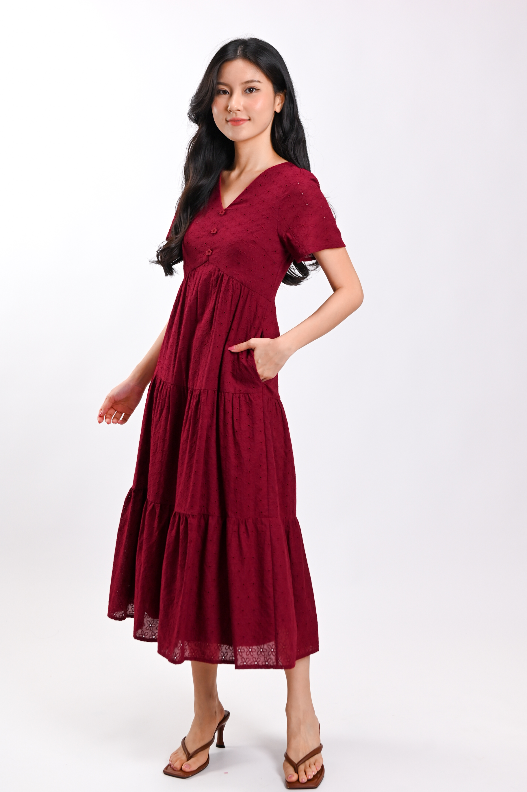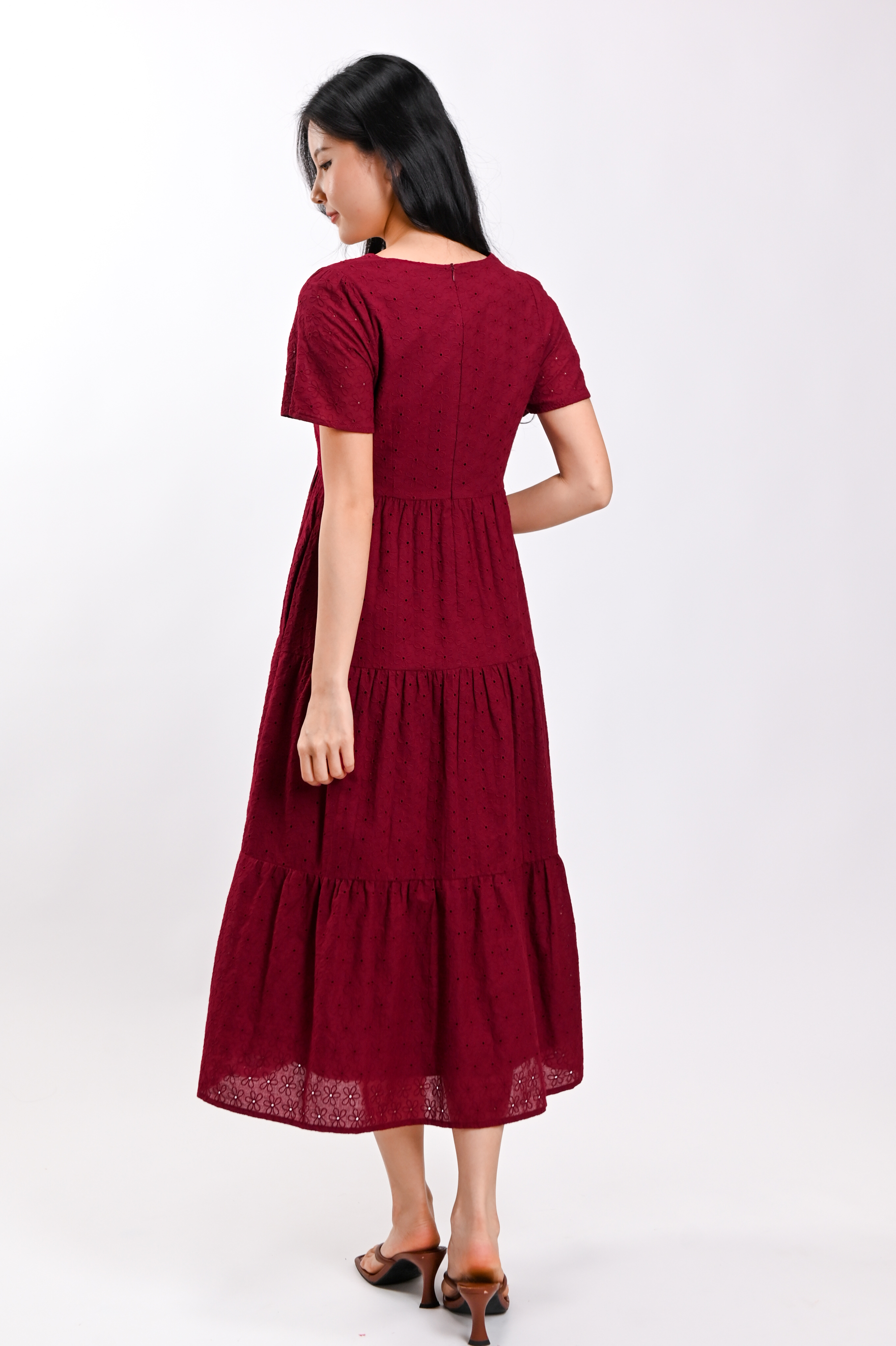 PETUNIA EYELET TIERED MIDAXI DRESS IN WINE RED