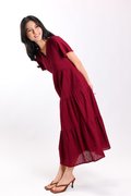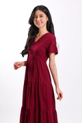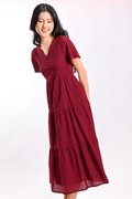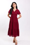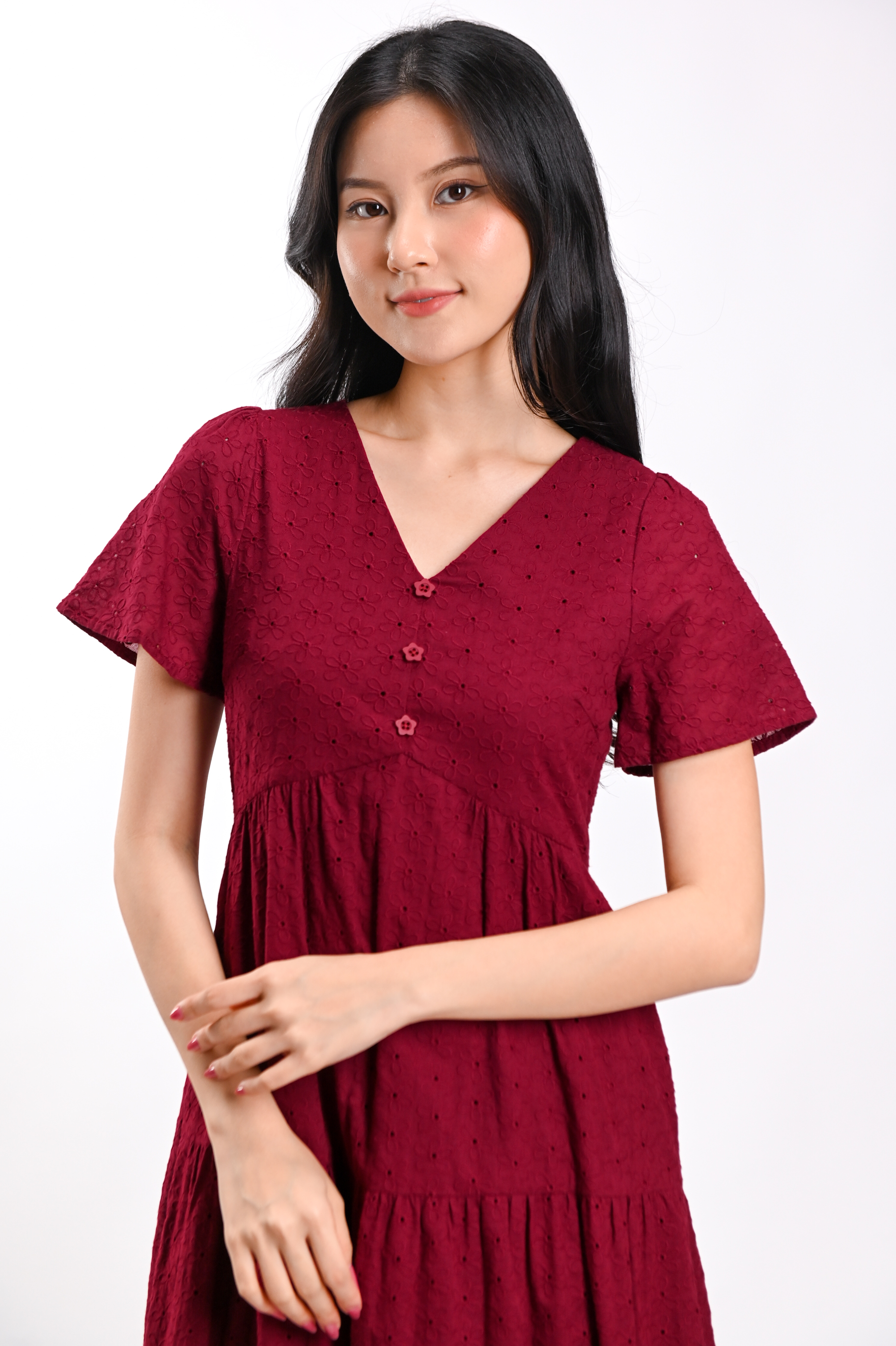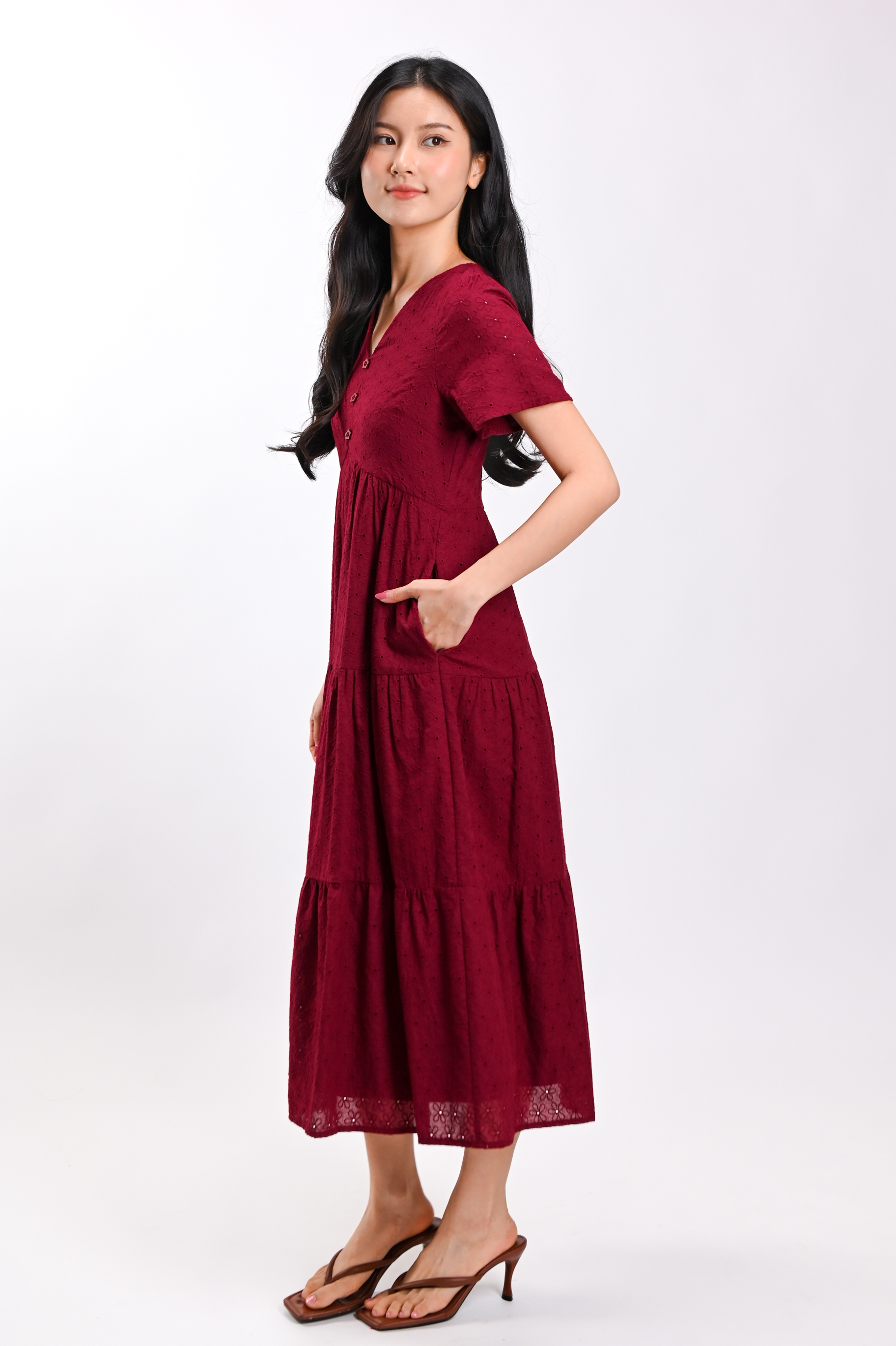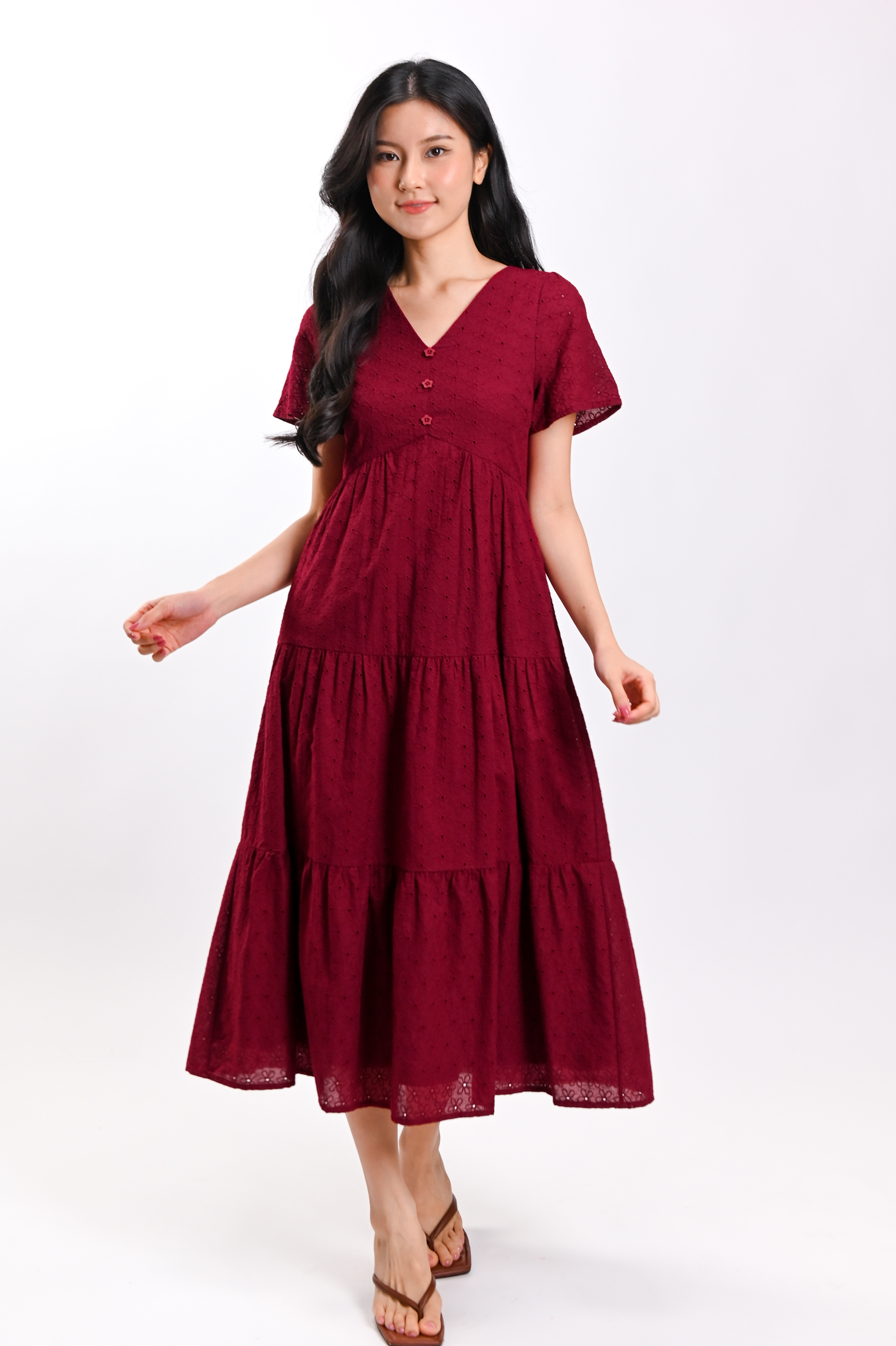PETUNIA EYELET TIERED MIDAXI DRESS IN WINE RED