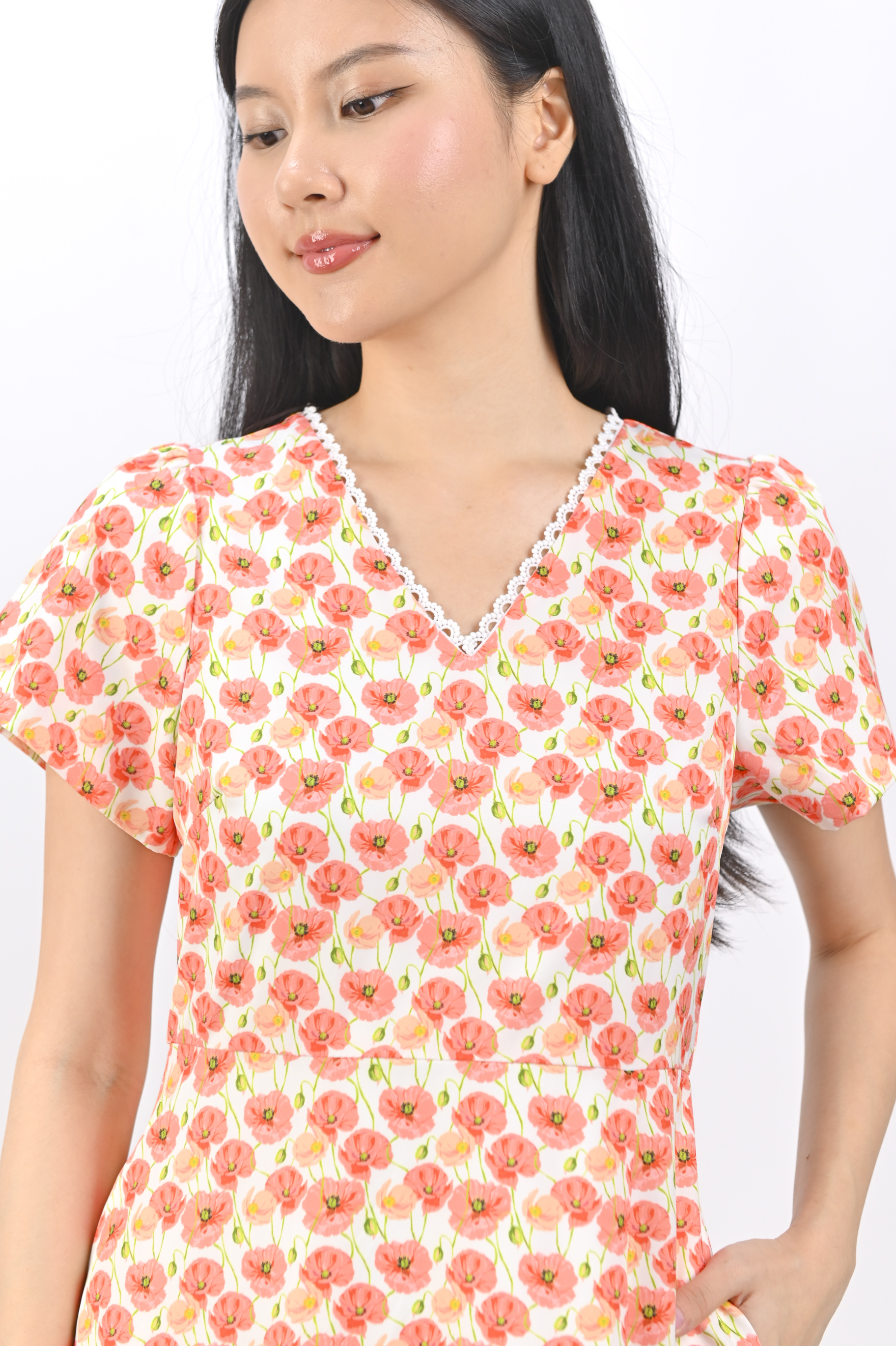 POPPY GARDEN LACE-TRIMMING SLEEVED MIDI DRESS