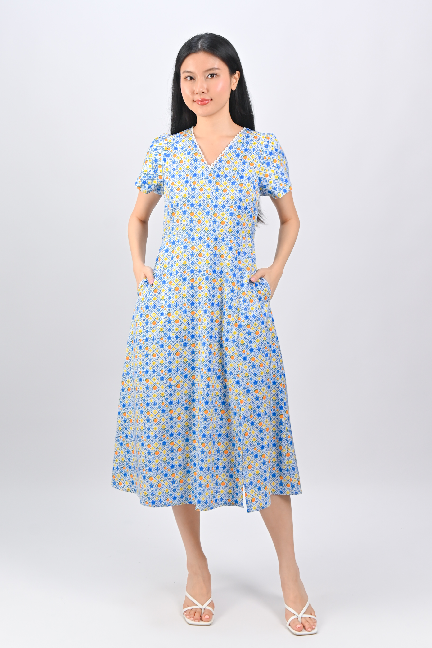 Actual stocks may varySpot the lucky oranges speckled all over this beautiful tile print! 🍊🍊 Dress your best in our Porcelain Orange Tiles Sleeved Midi Dress 🌞💙