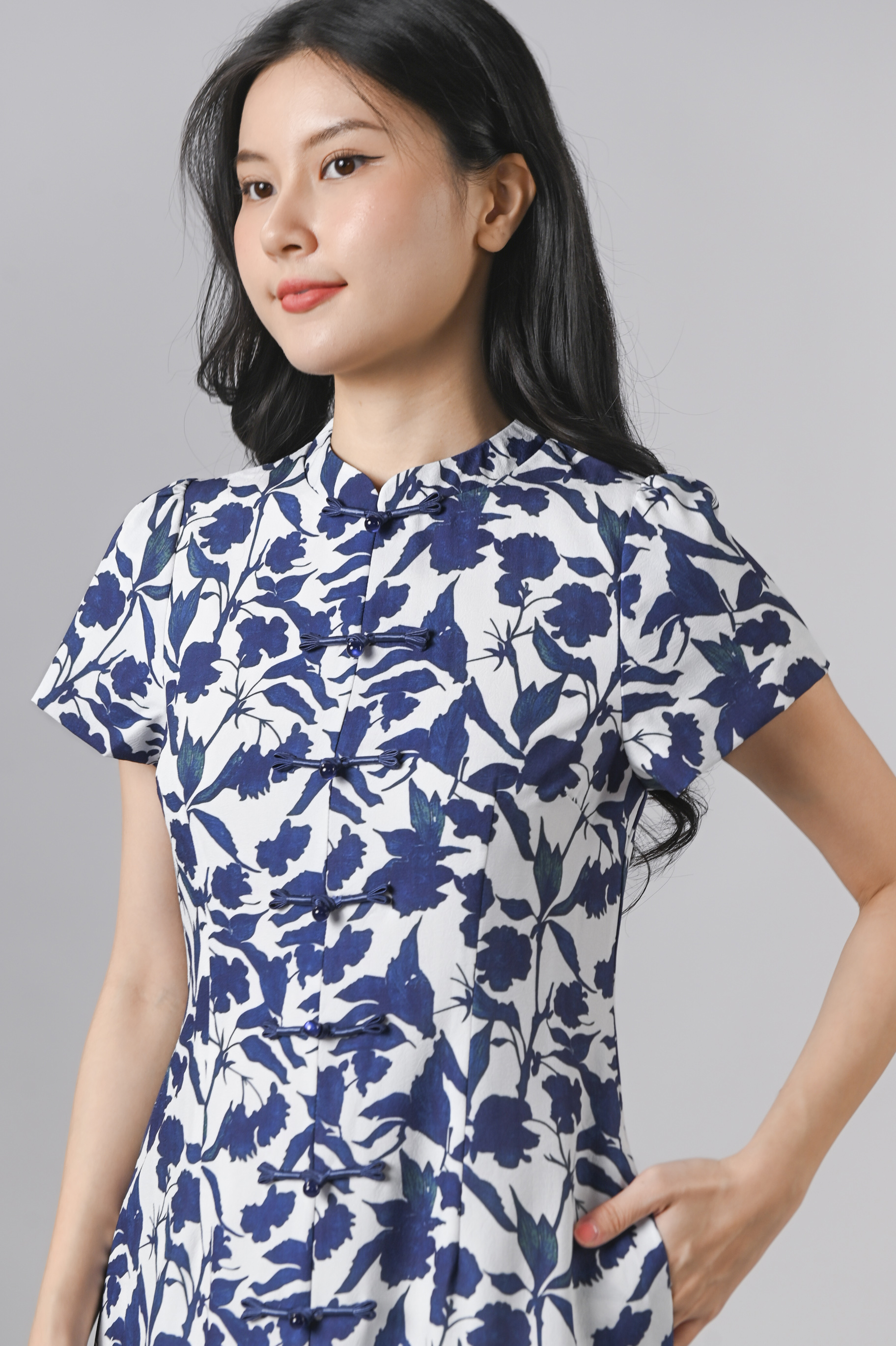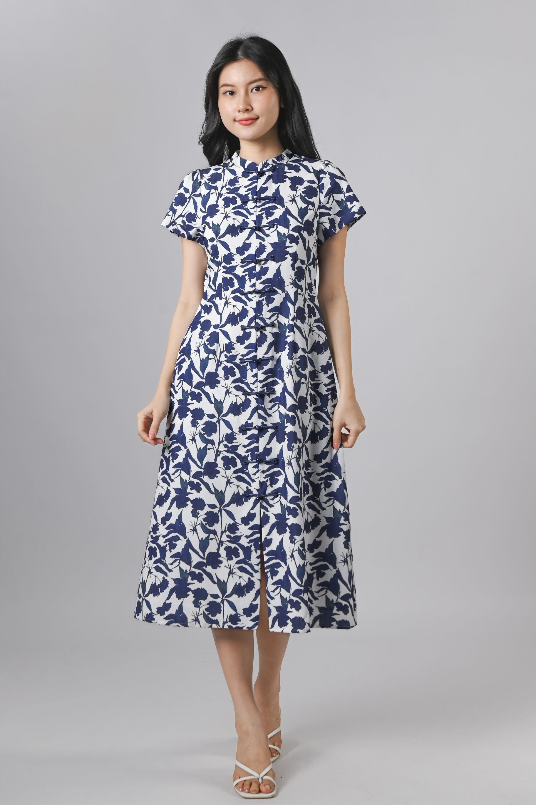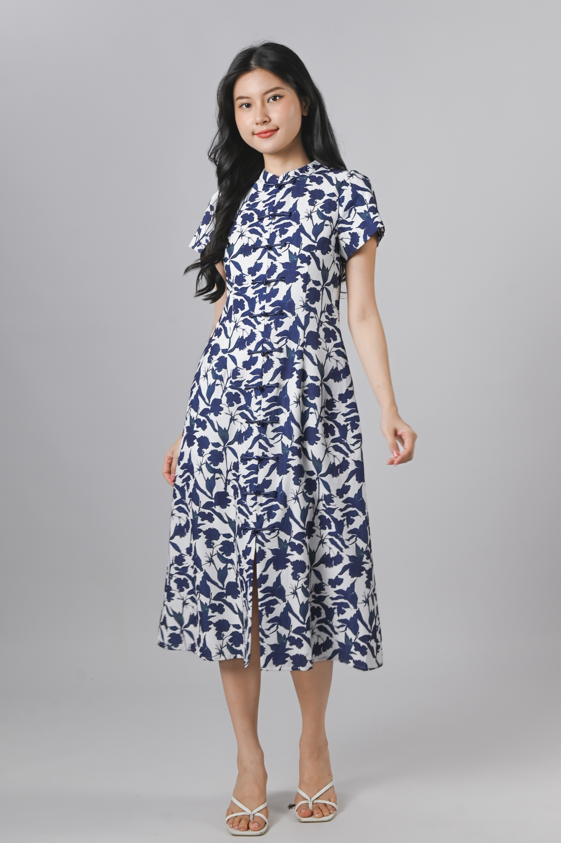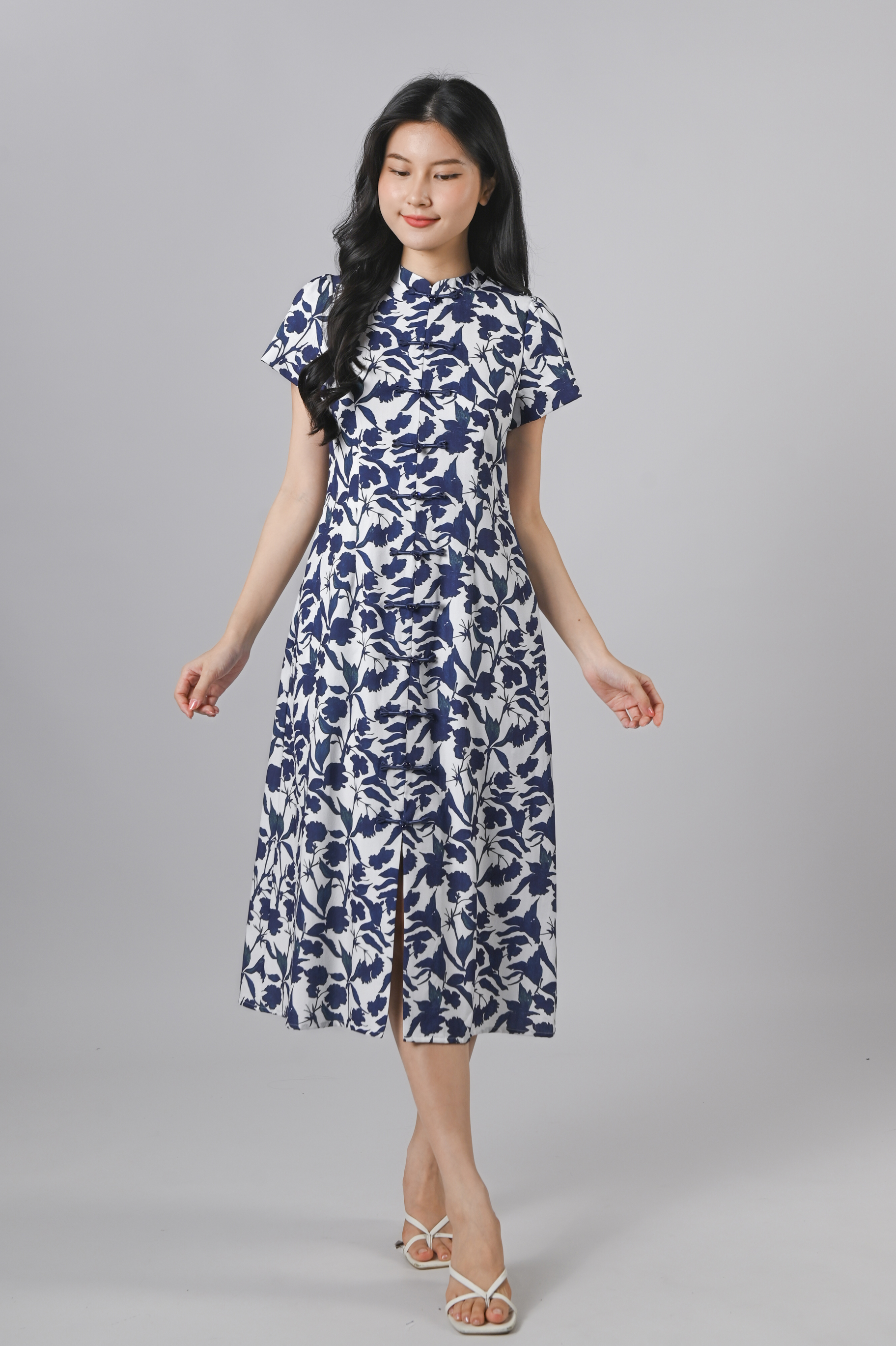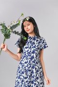 QIANQIAN WHITE-BLUE FLORAL SLEEVED CHEONGSAM DRESS