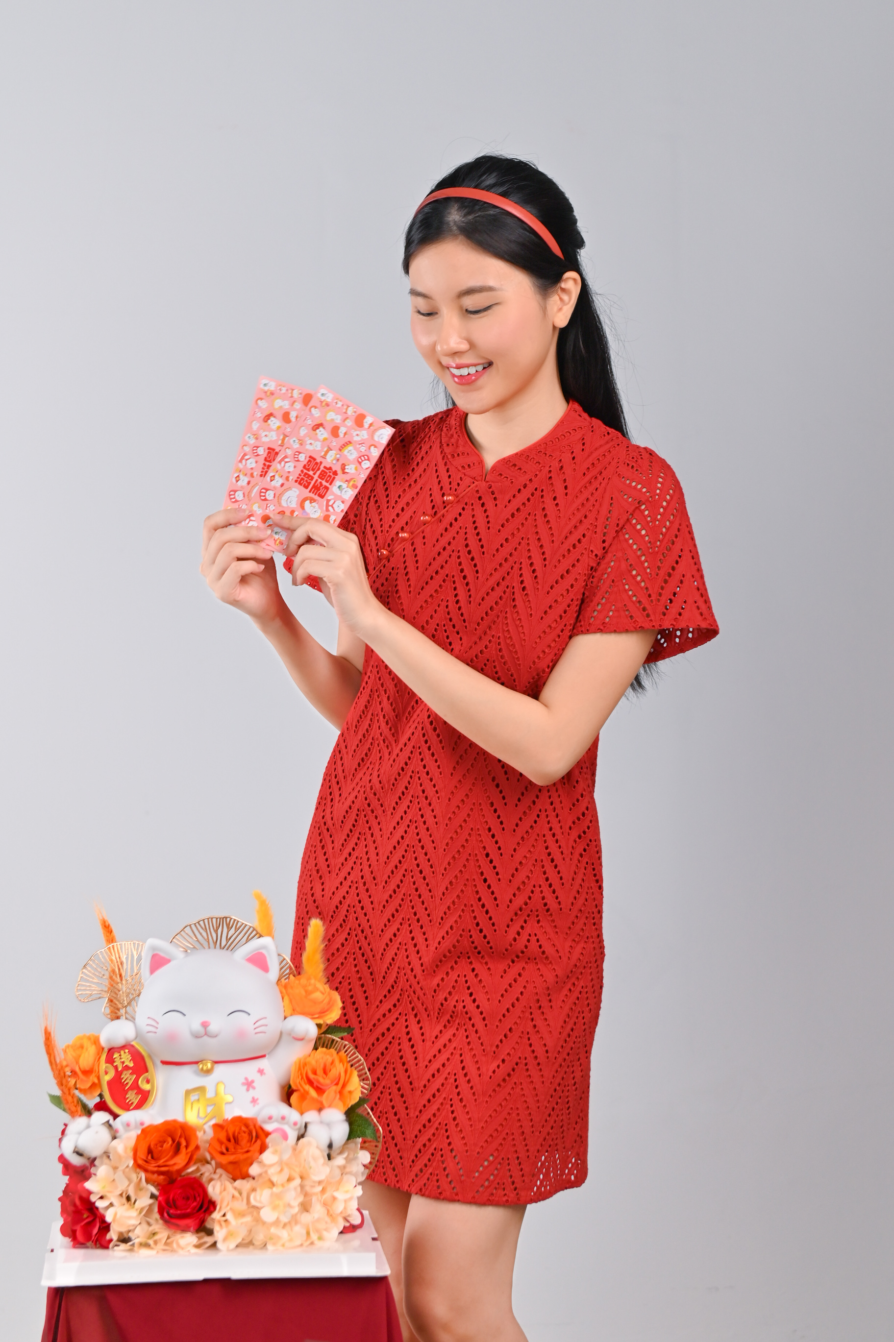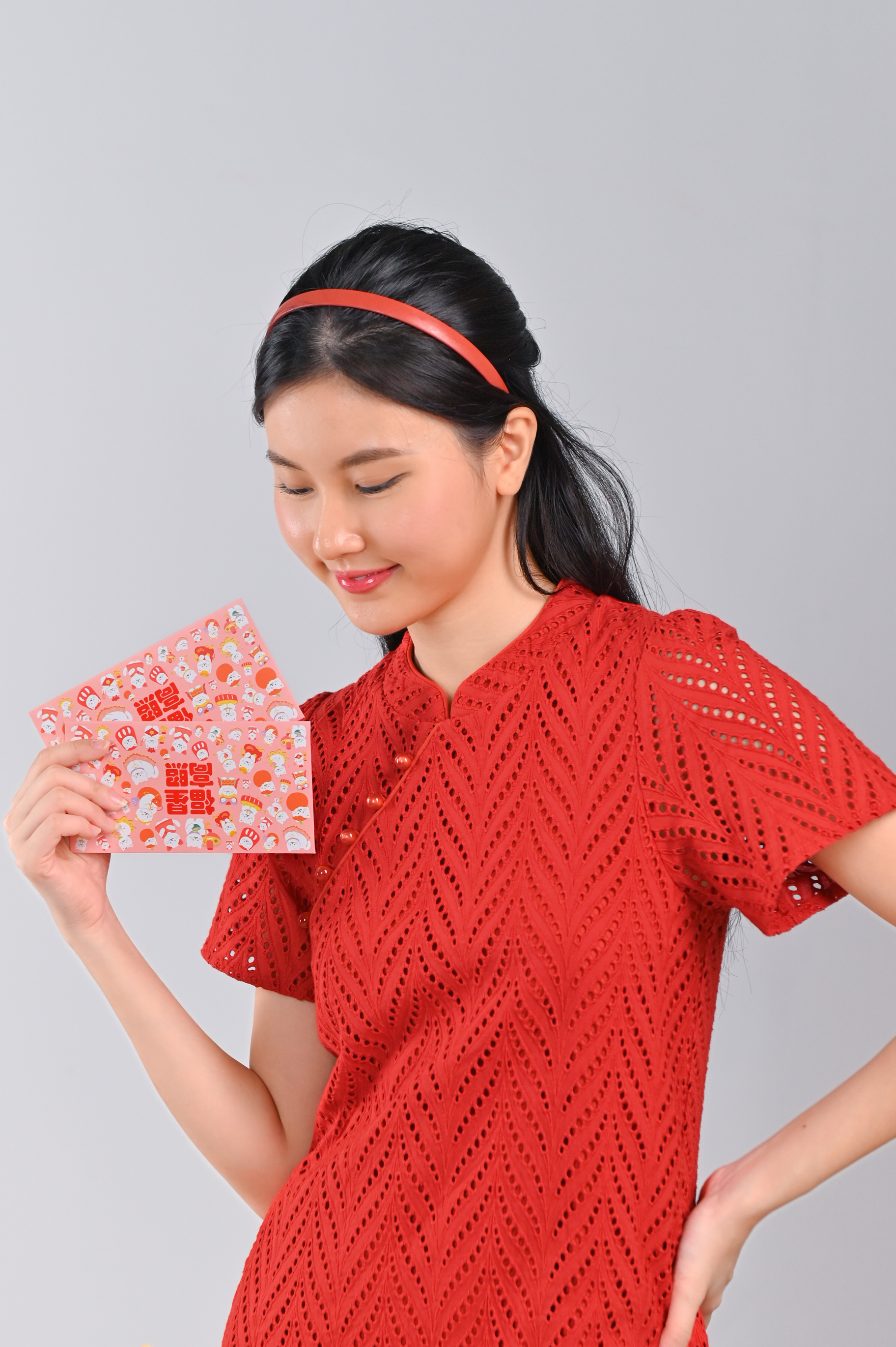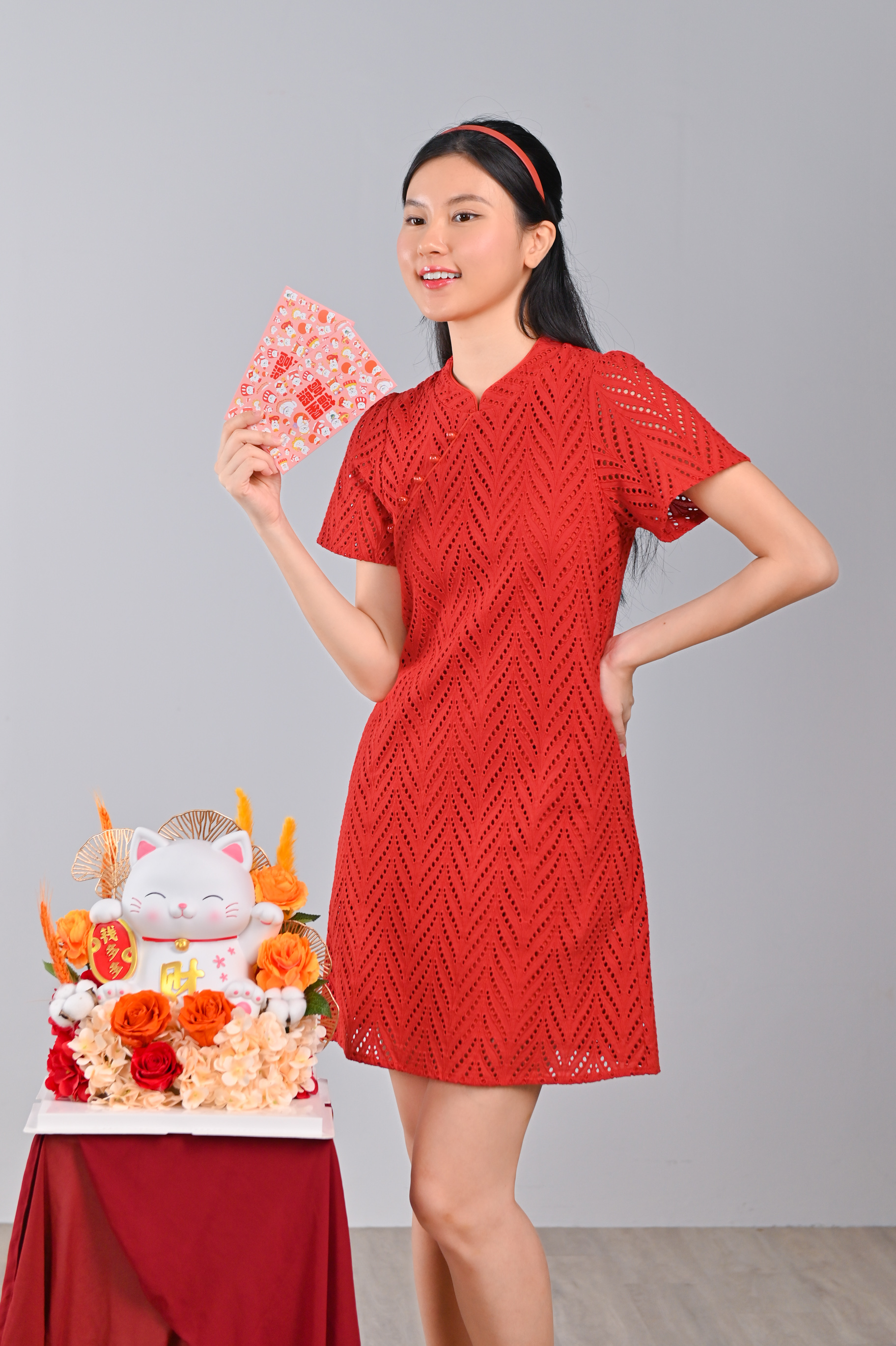 Actual stocks may varyA modern oriental cheongsam with the classiest eyelet fabric! Enjoy the festivities in our Qiuqiu Eyelet Sleeved Cheongsam 🧡💙