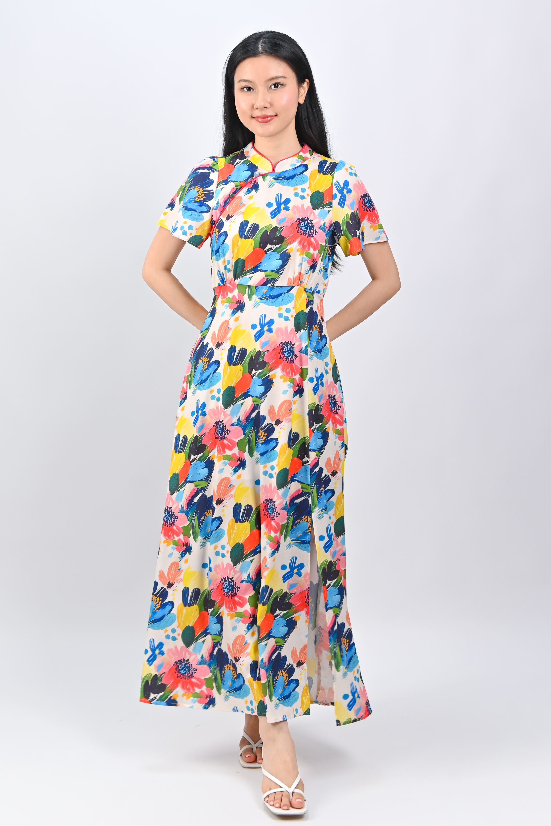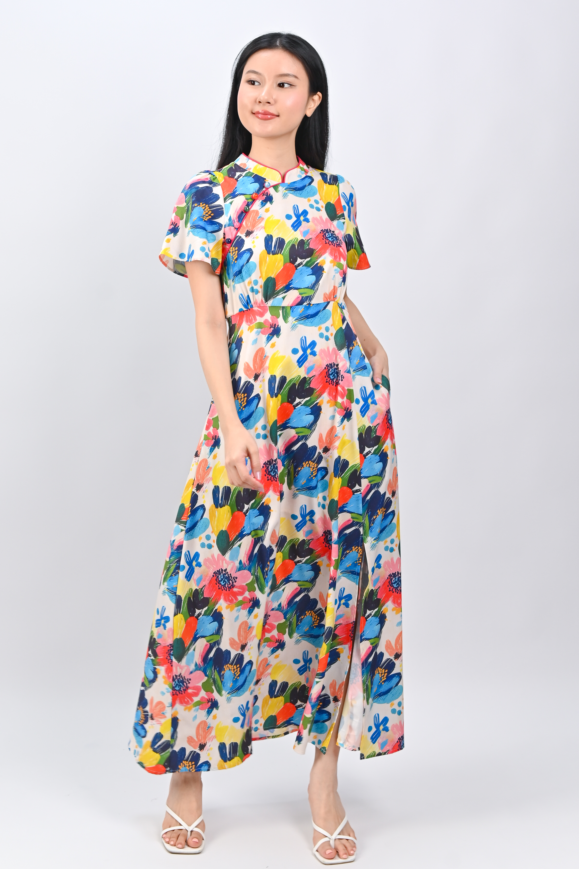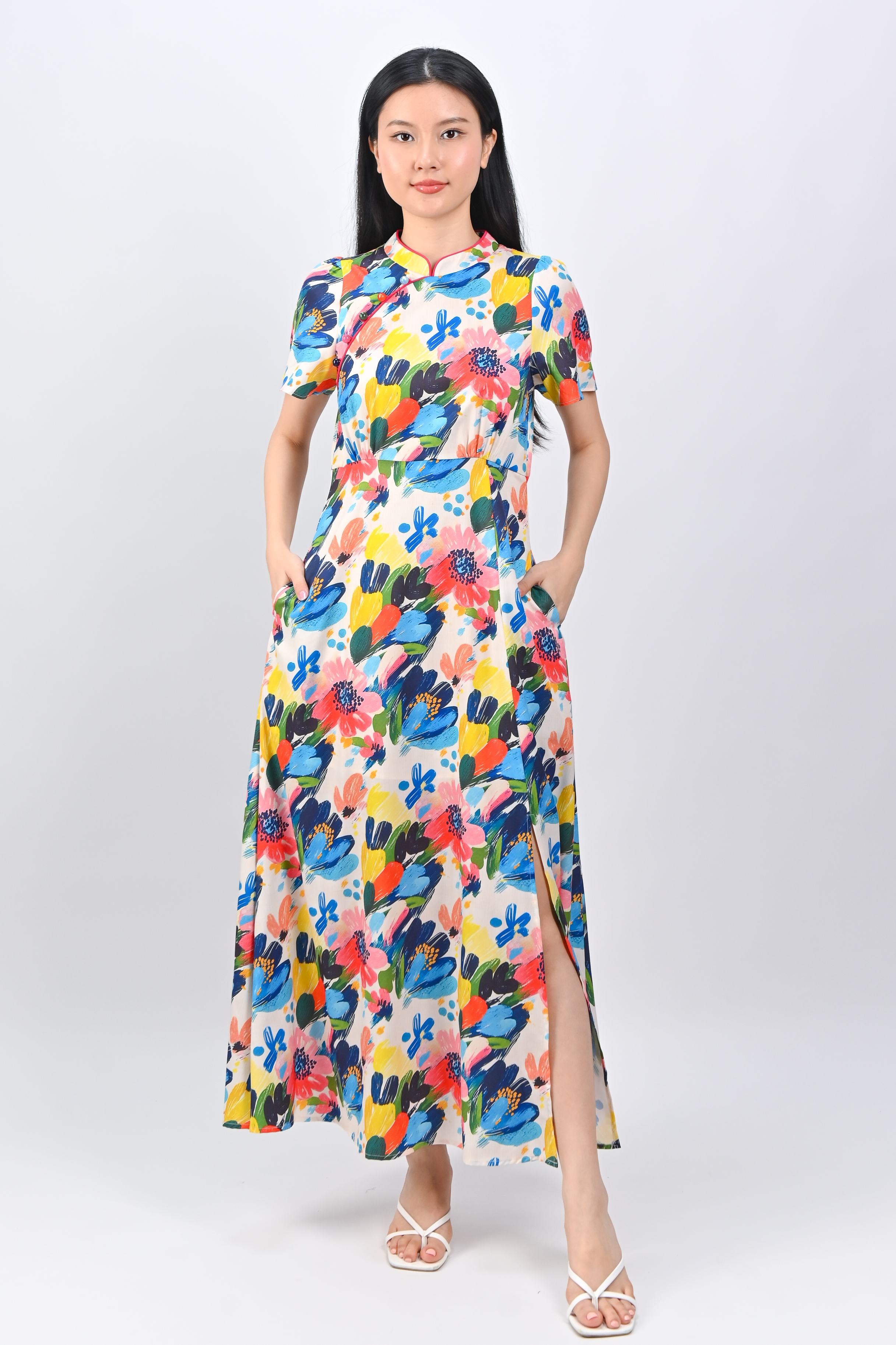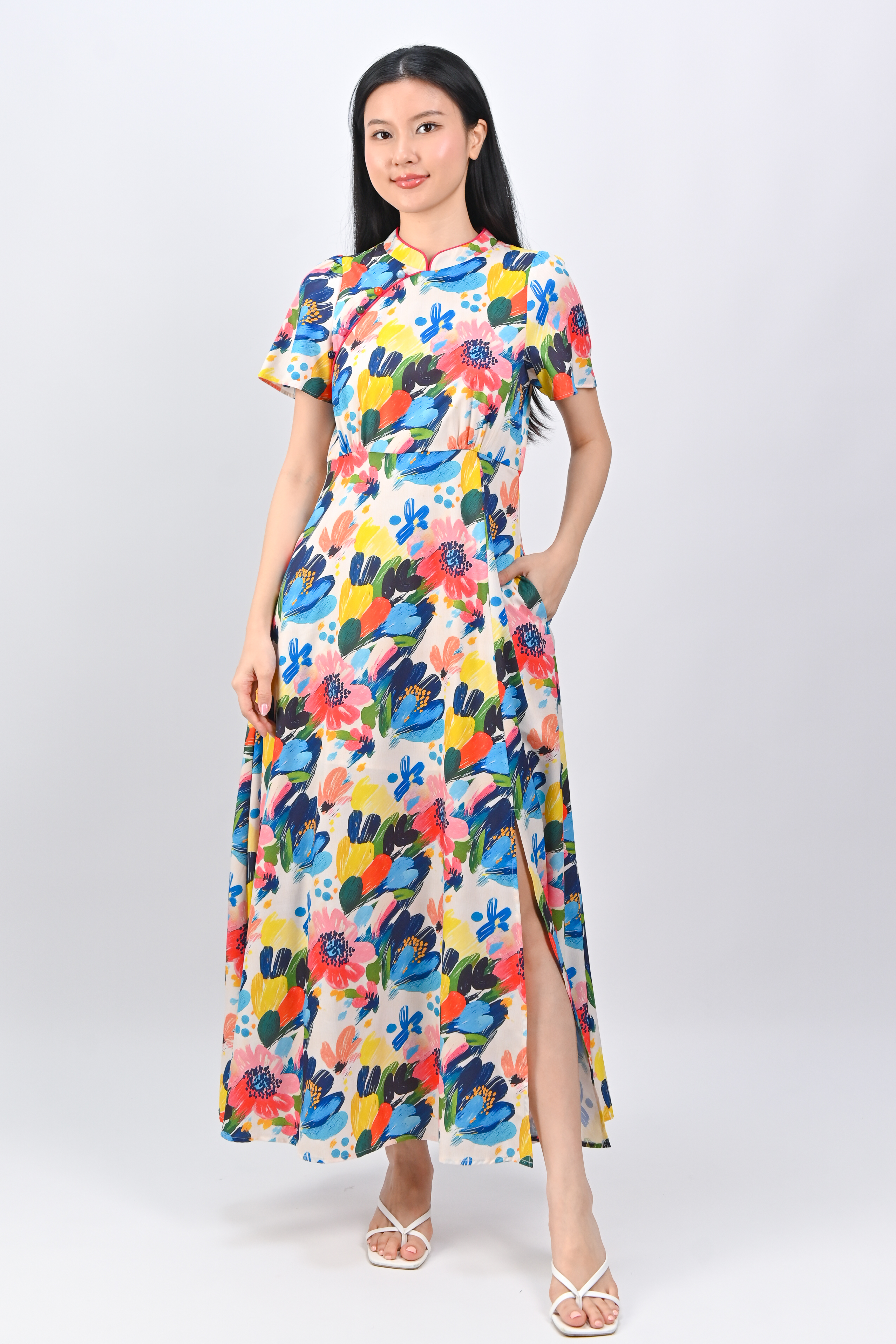 QIUYI VIBRANT FLORAL SLEEVED CHEONGSAM MAXI DRESS