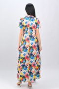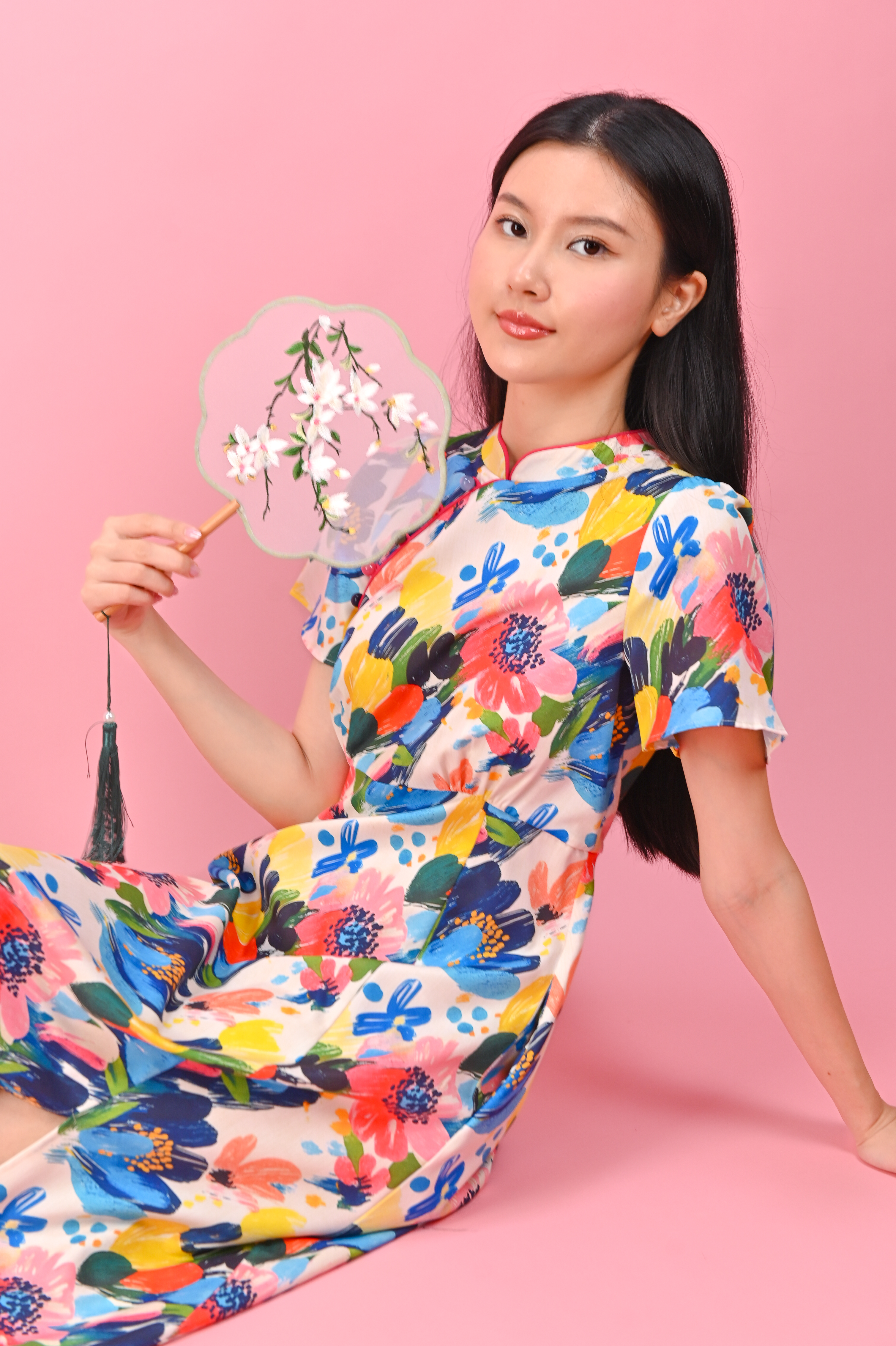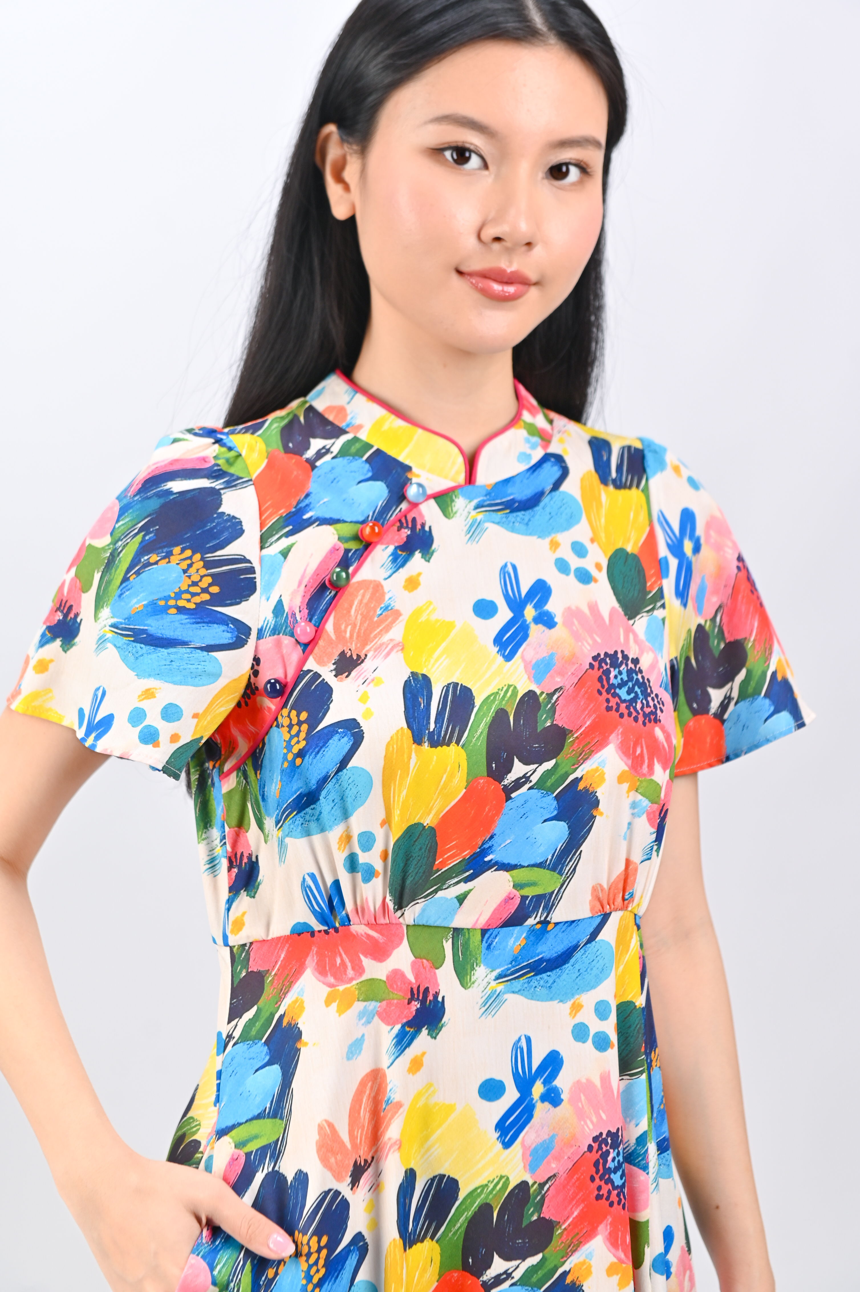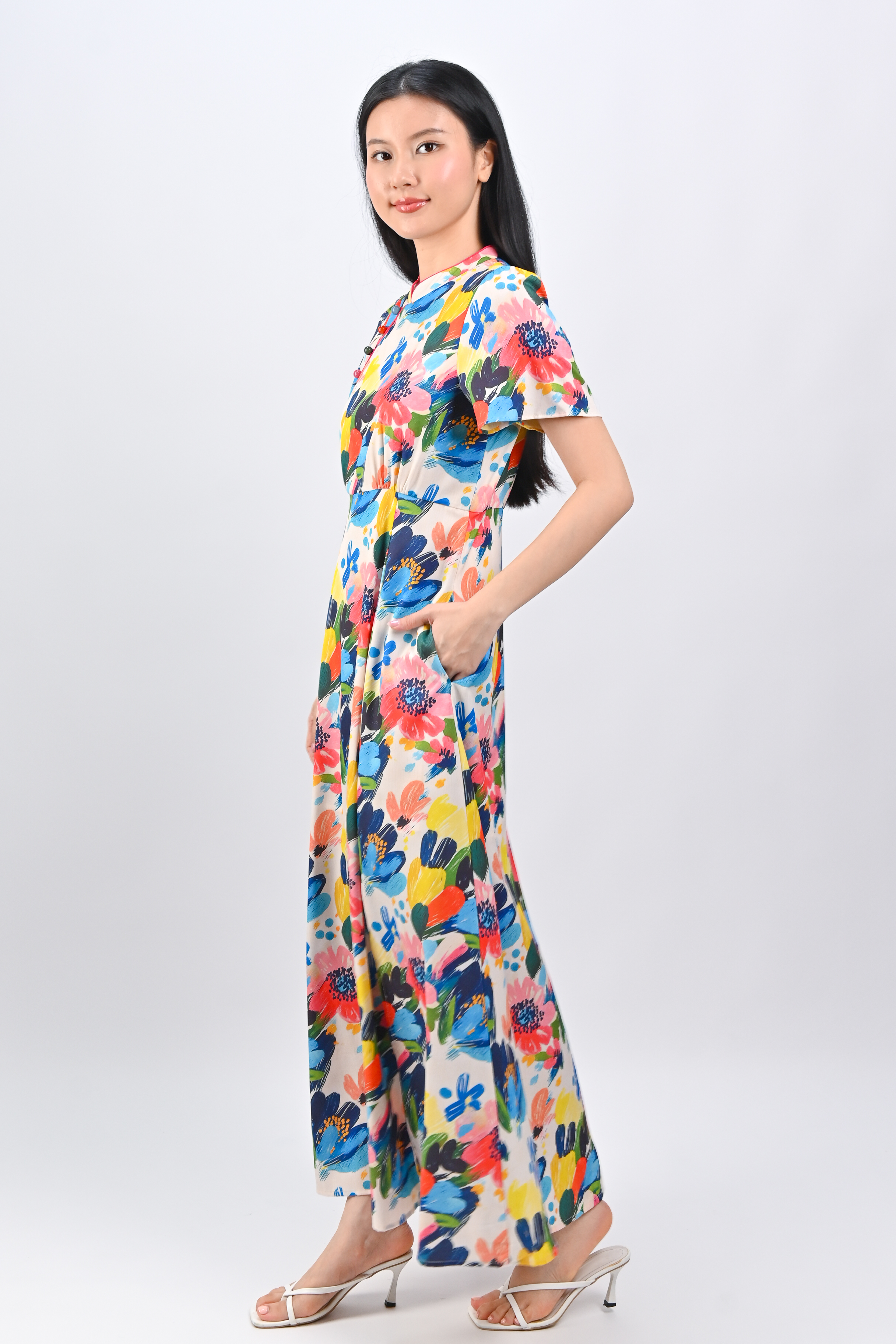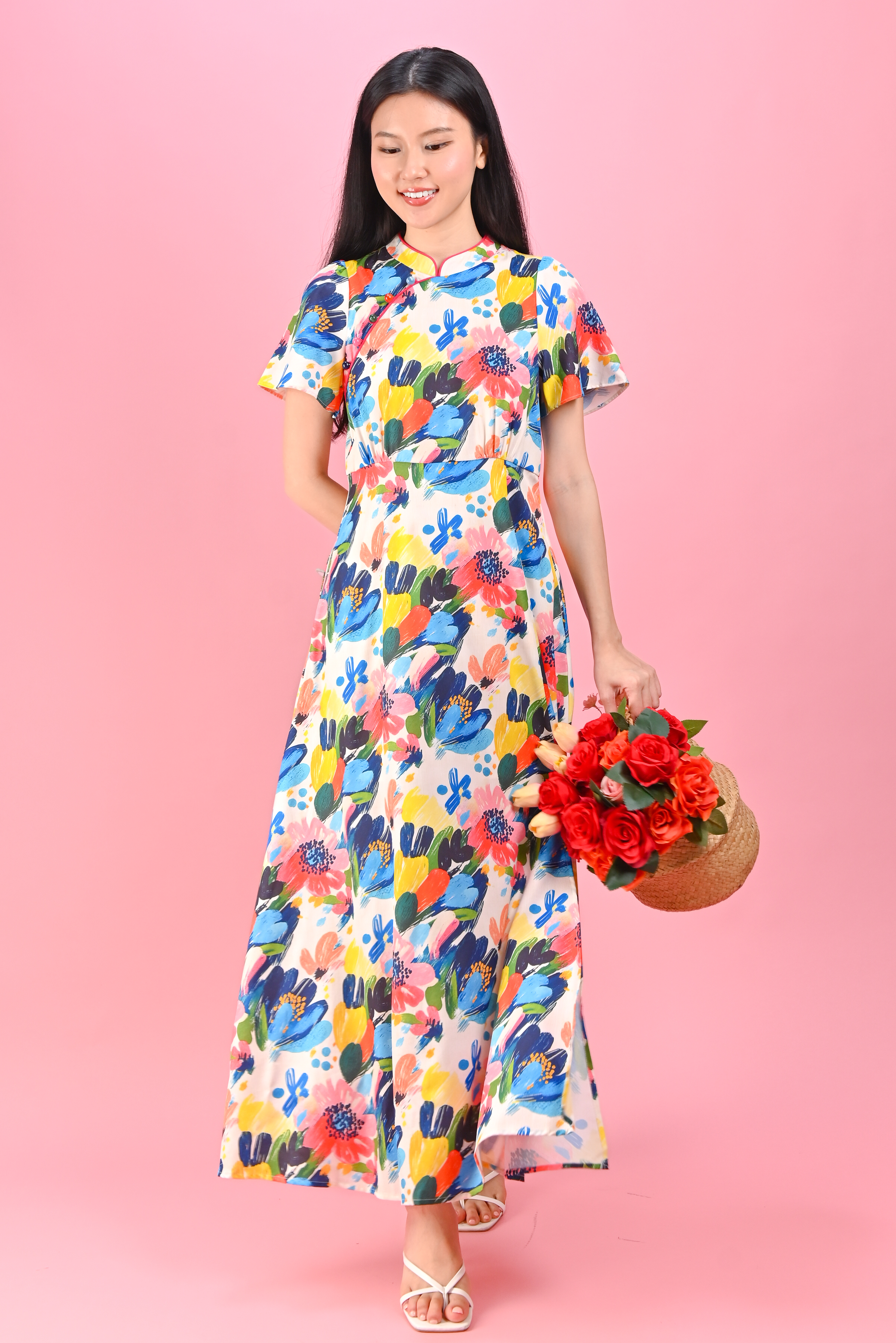 QIUYI VIBRANT FLORAL SLEEVED CHEONGSAM MAXI DRESS
