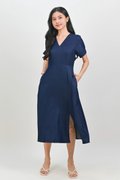 QUINARA DENIM-LOOK SLEEVED DRESS IN DARK BLUE