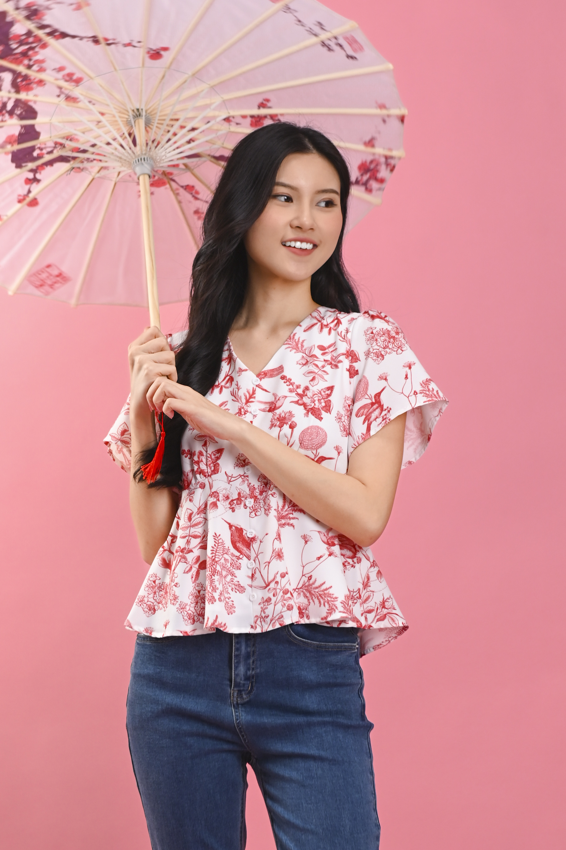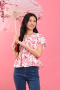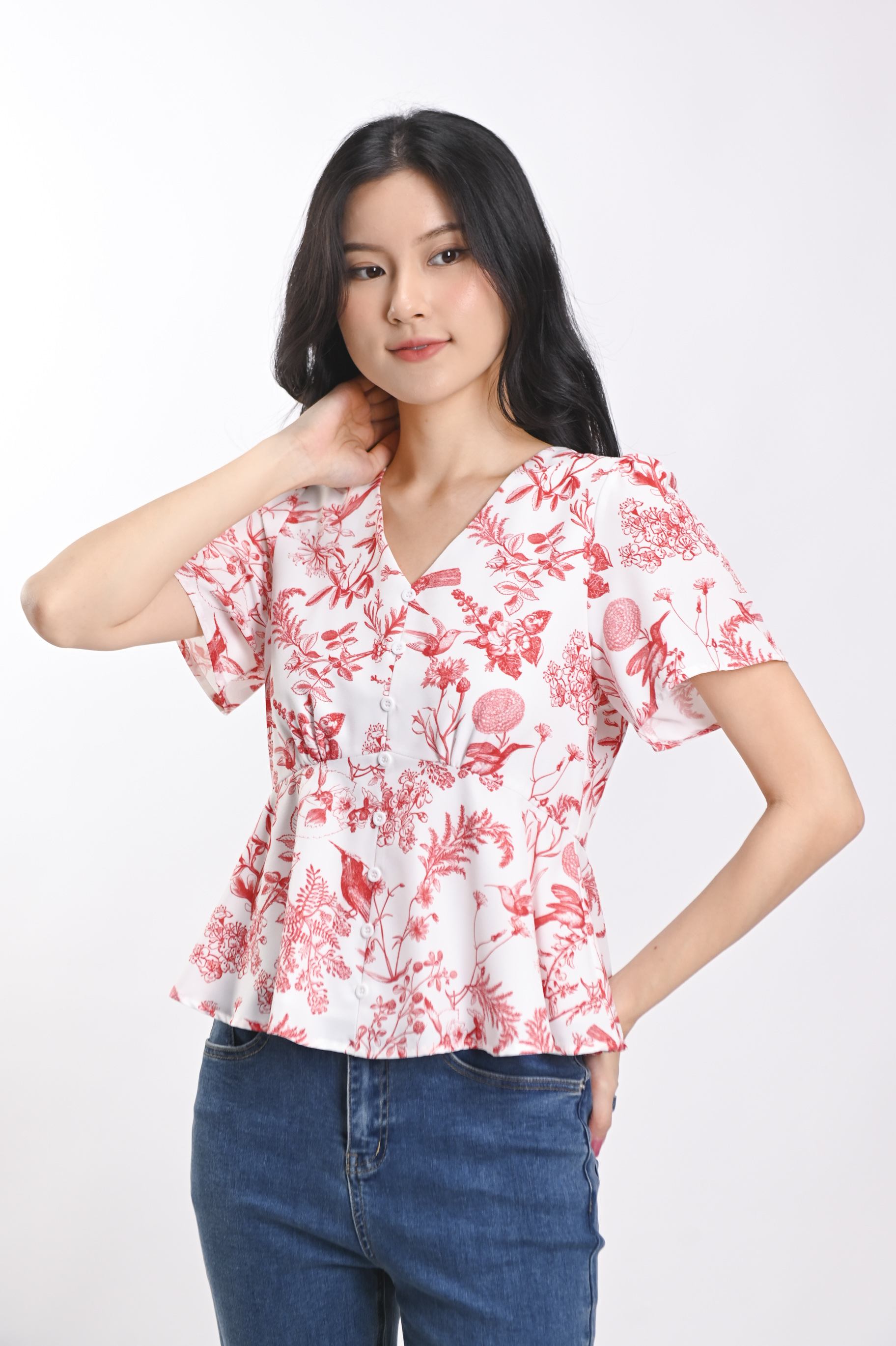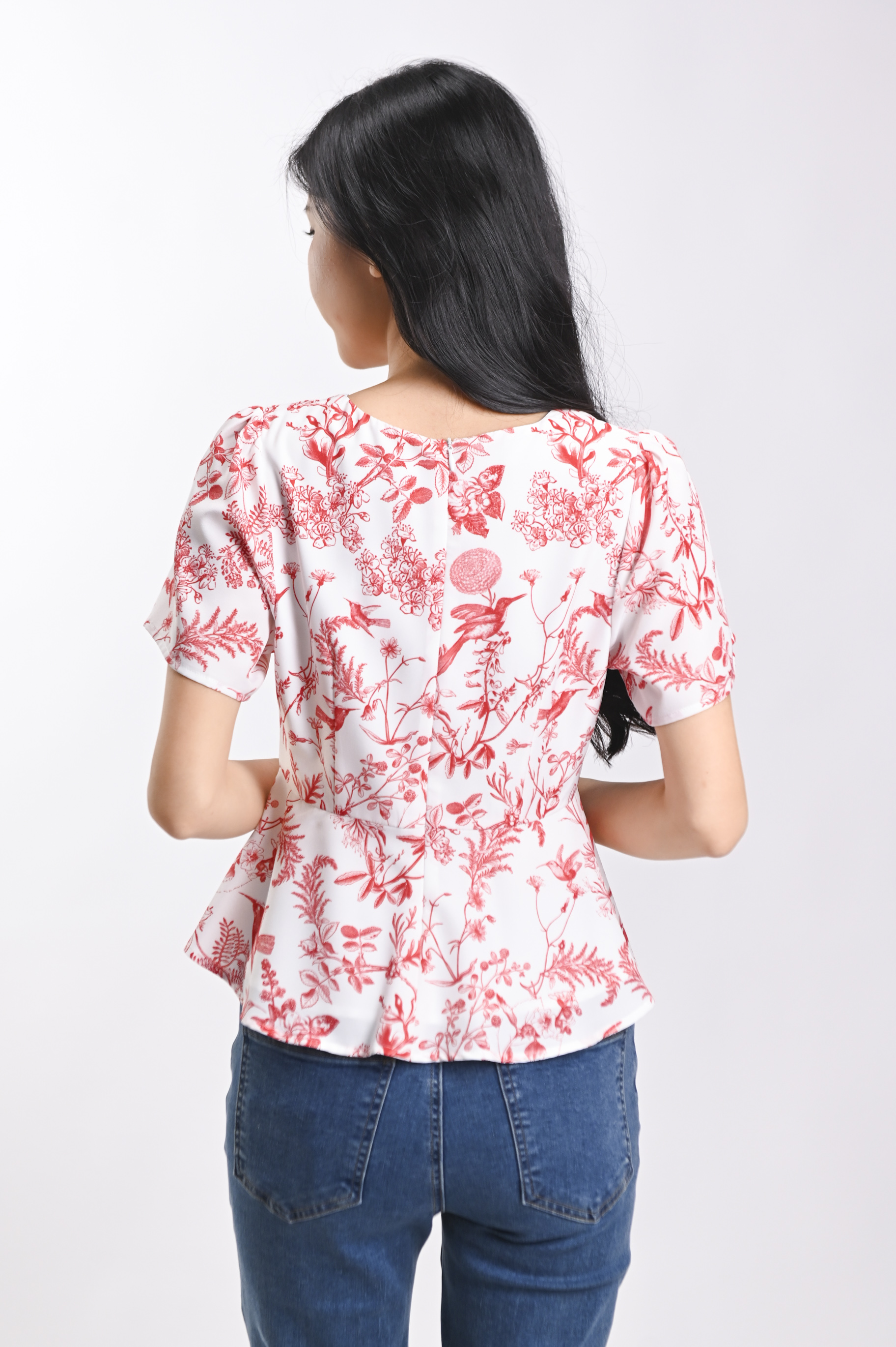 RED HUMMINGBIRD SLEEVED PEPLUM TOP