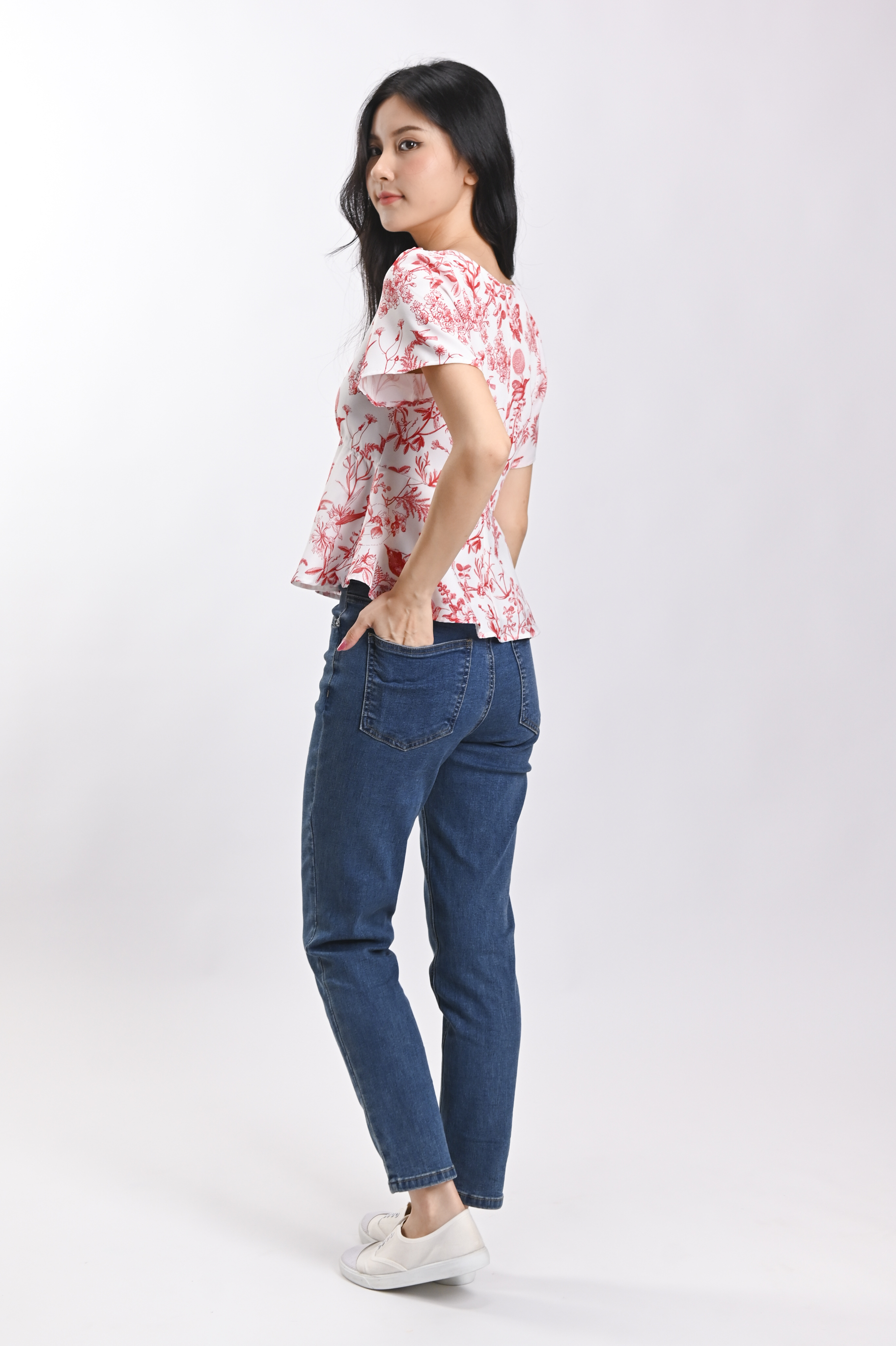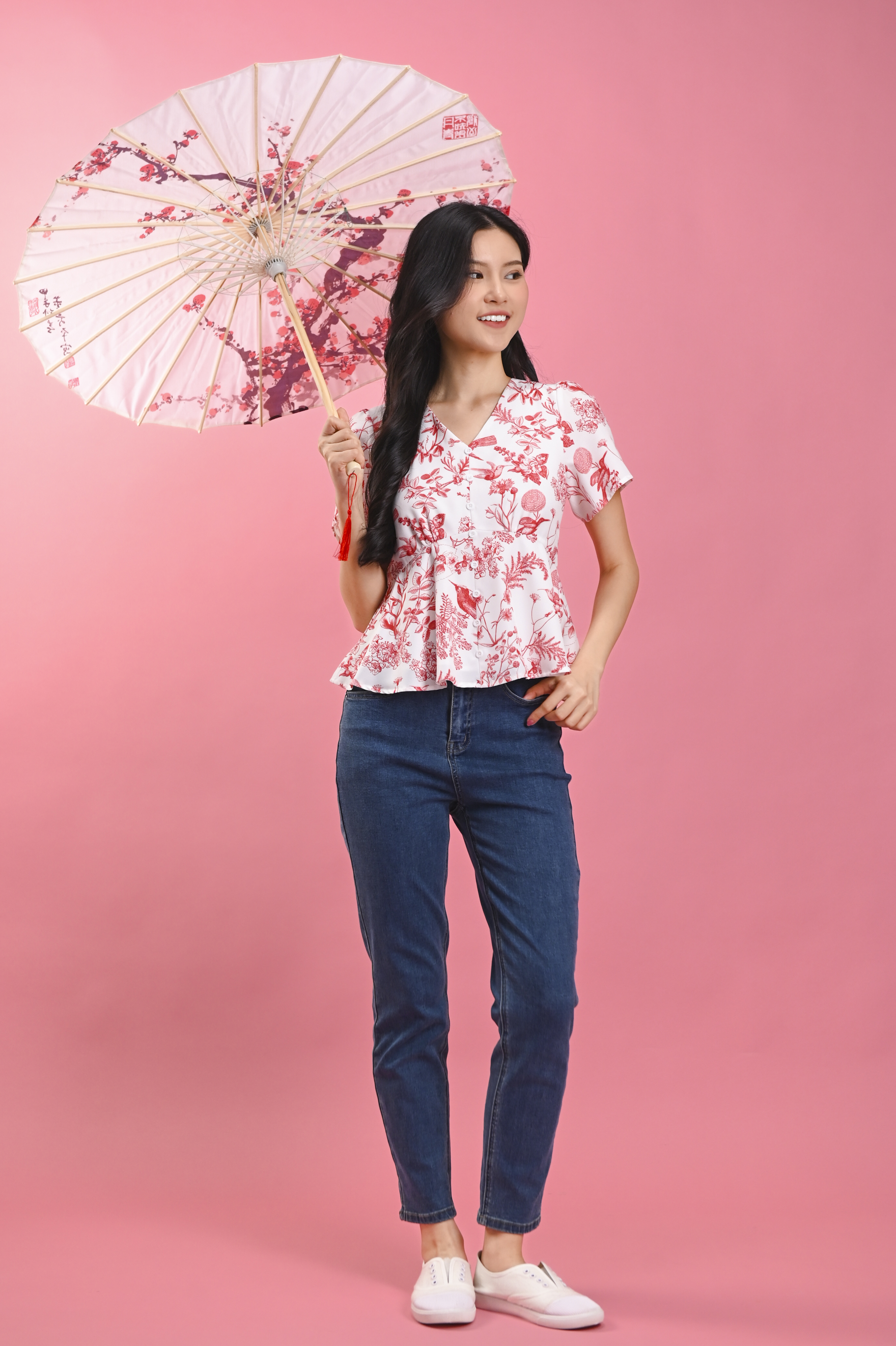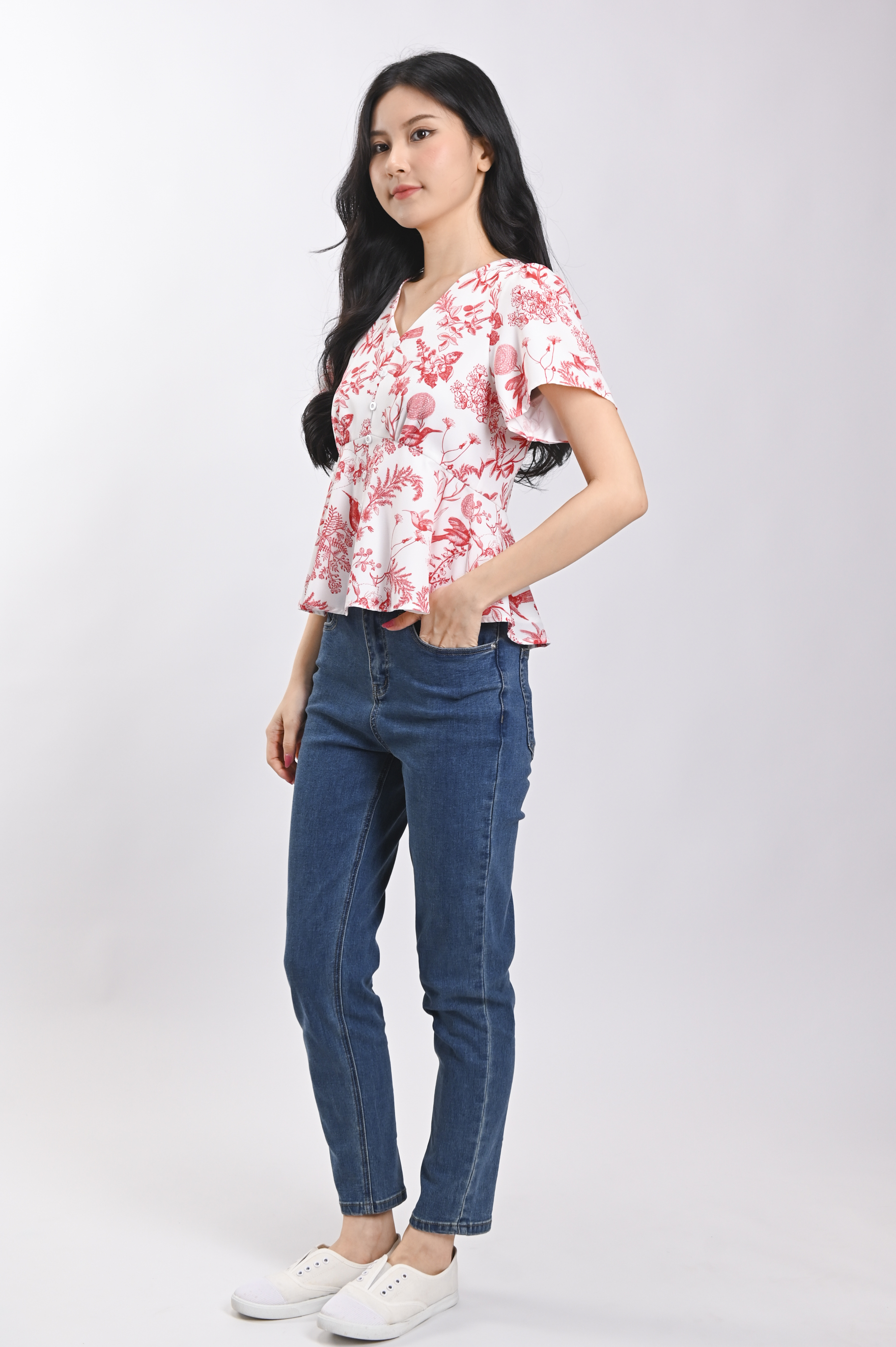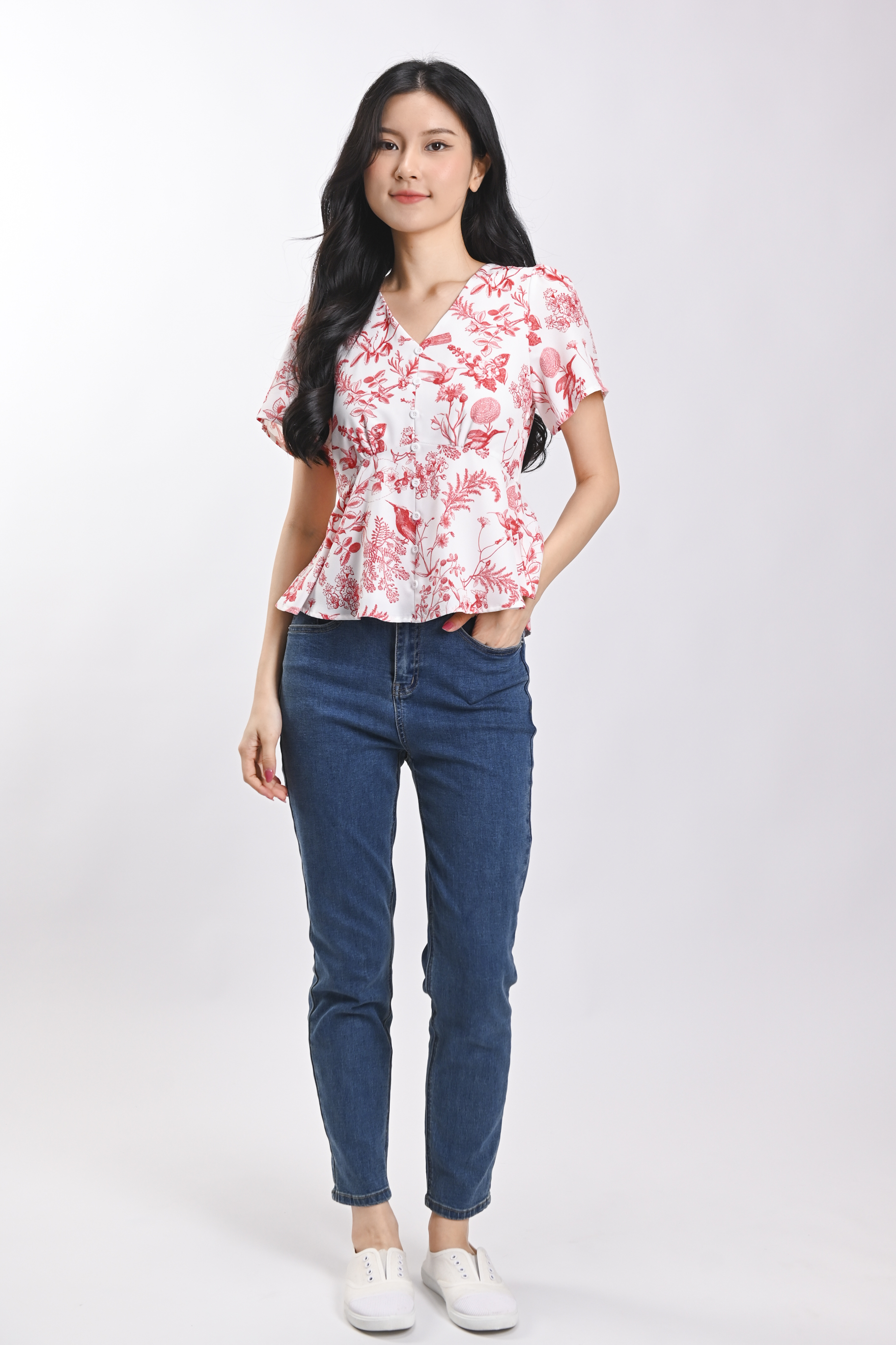 RED HUMMINGBIRD SLEEVED PEPLUM TOP