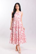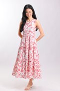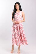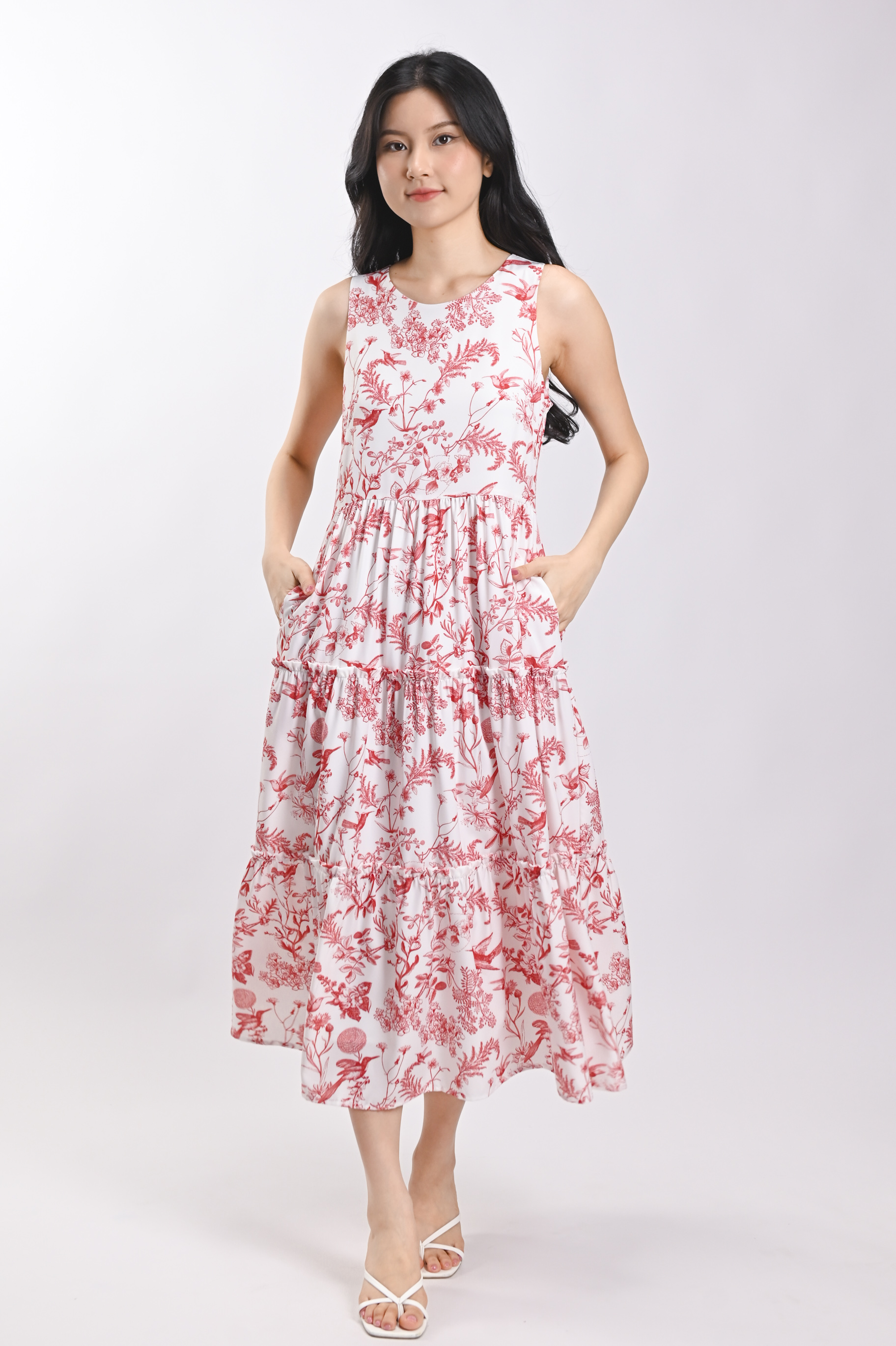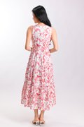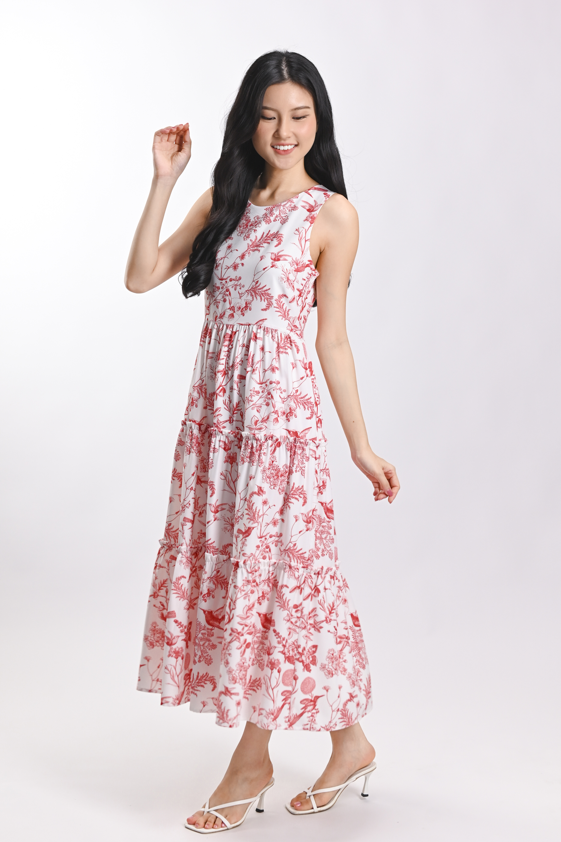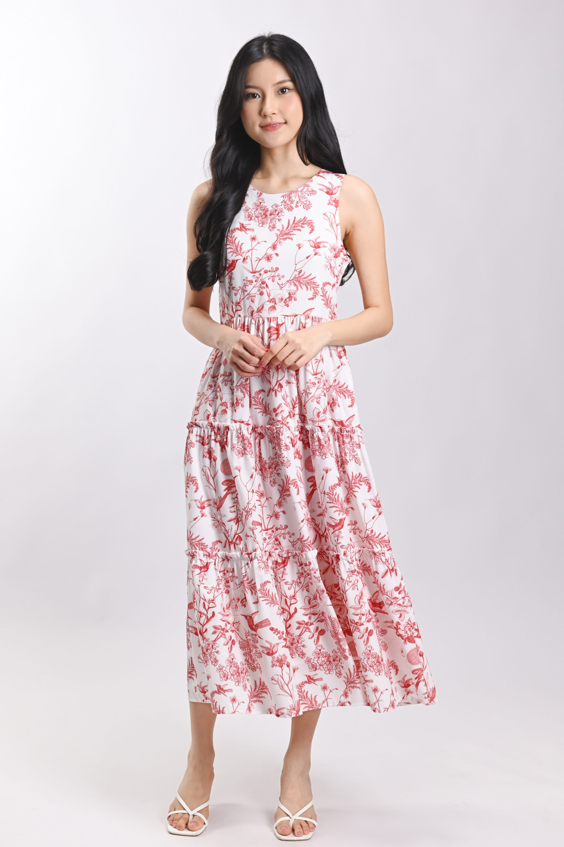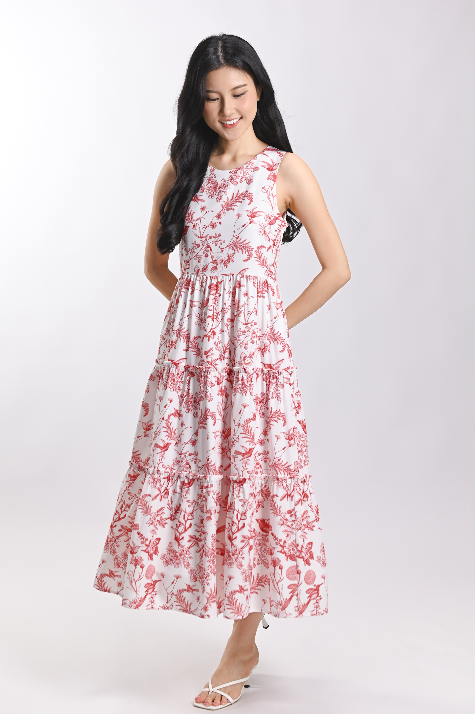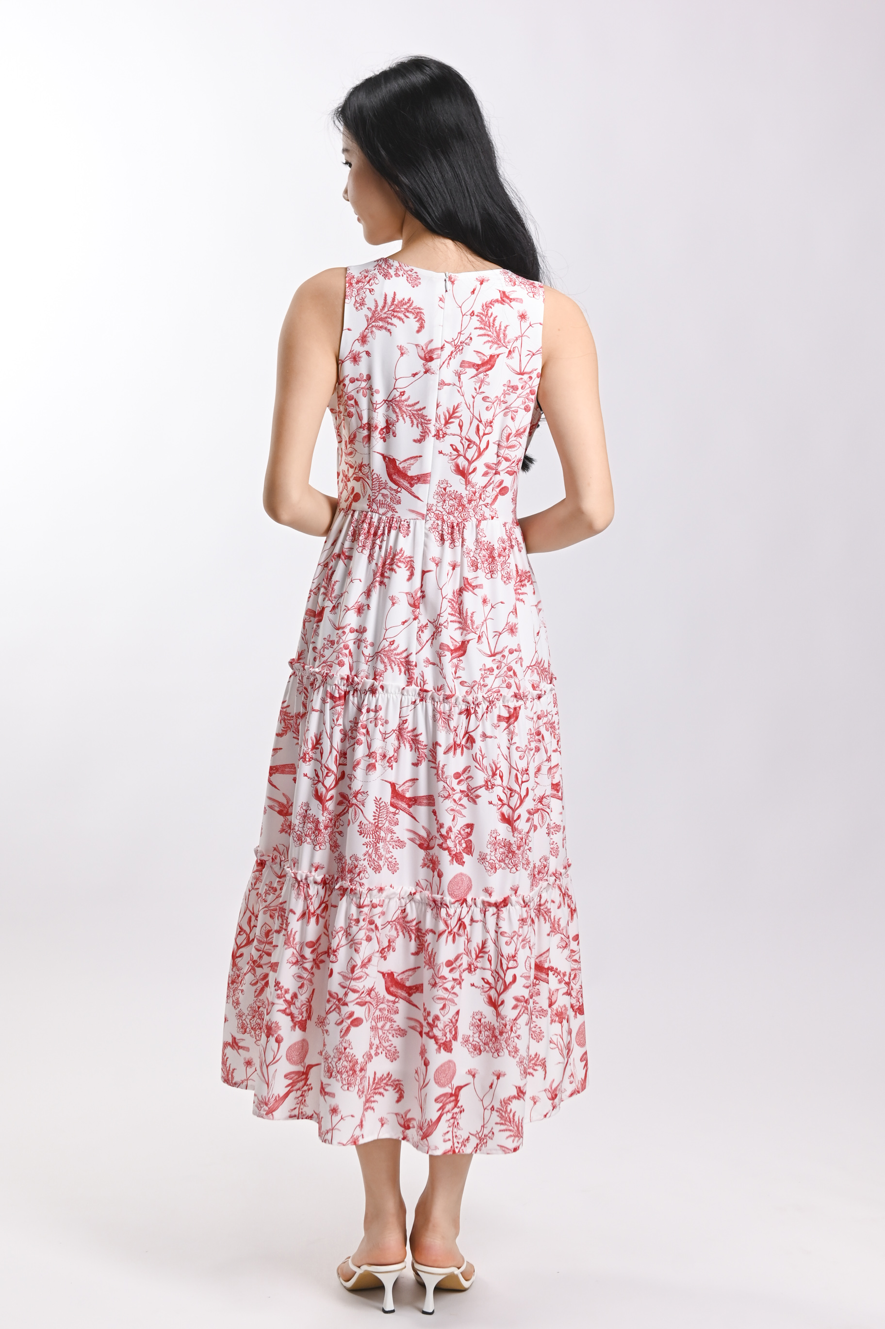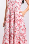 RED HUMMINGBIRD SLEEVELESS TIERED MIDI DRESS
