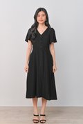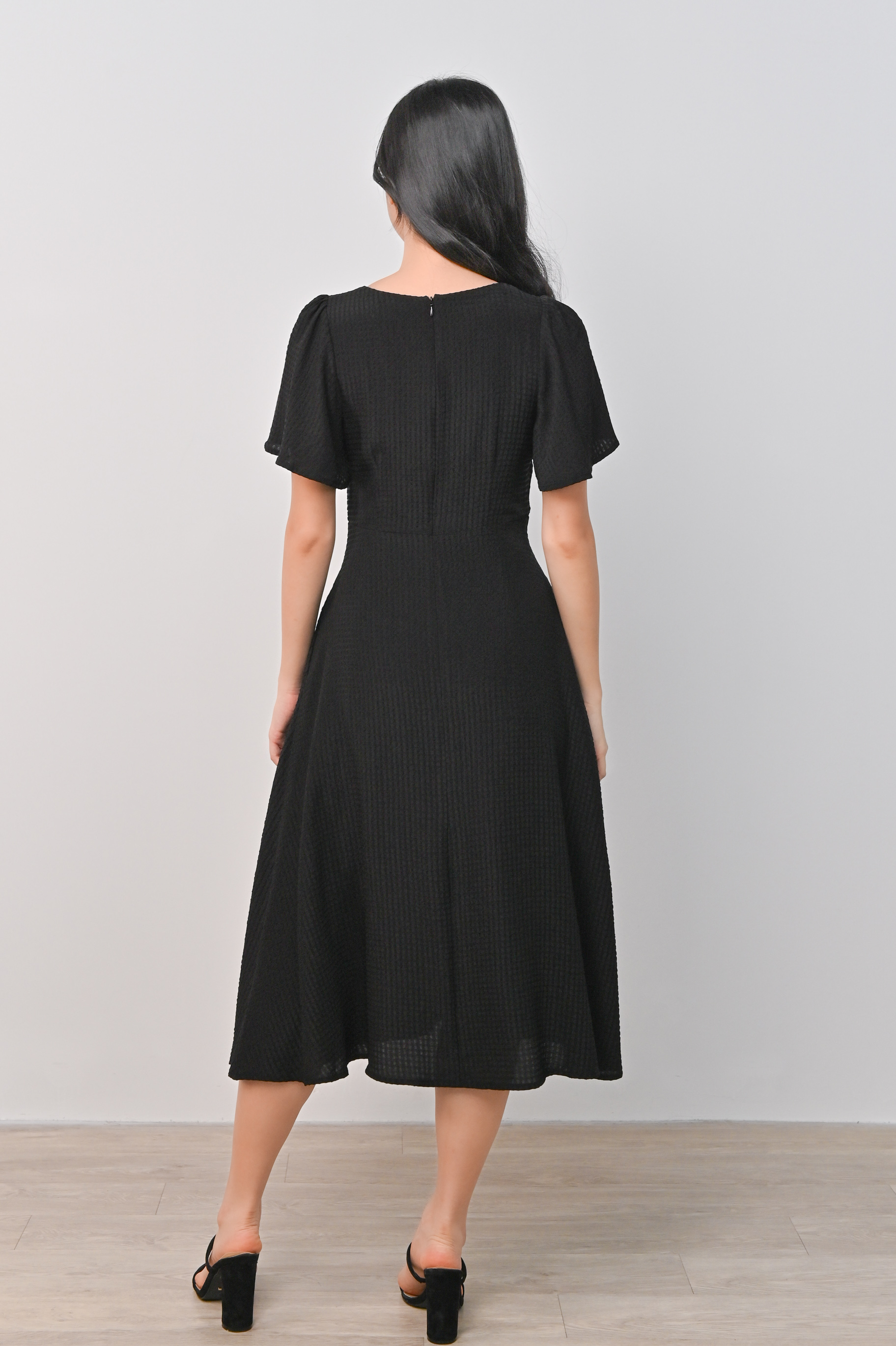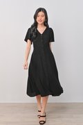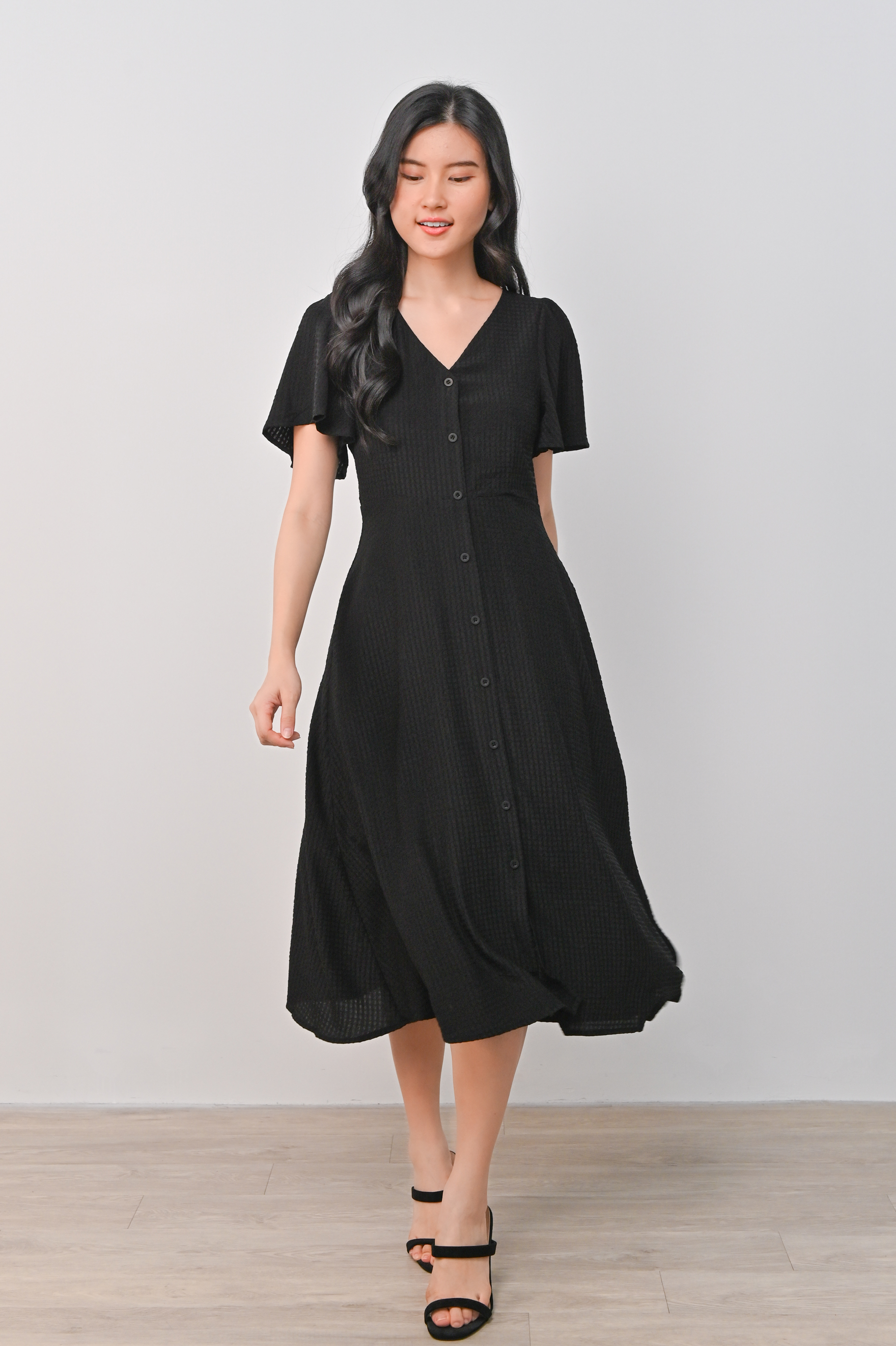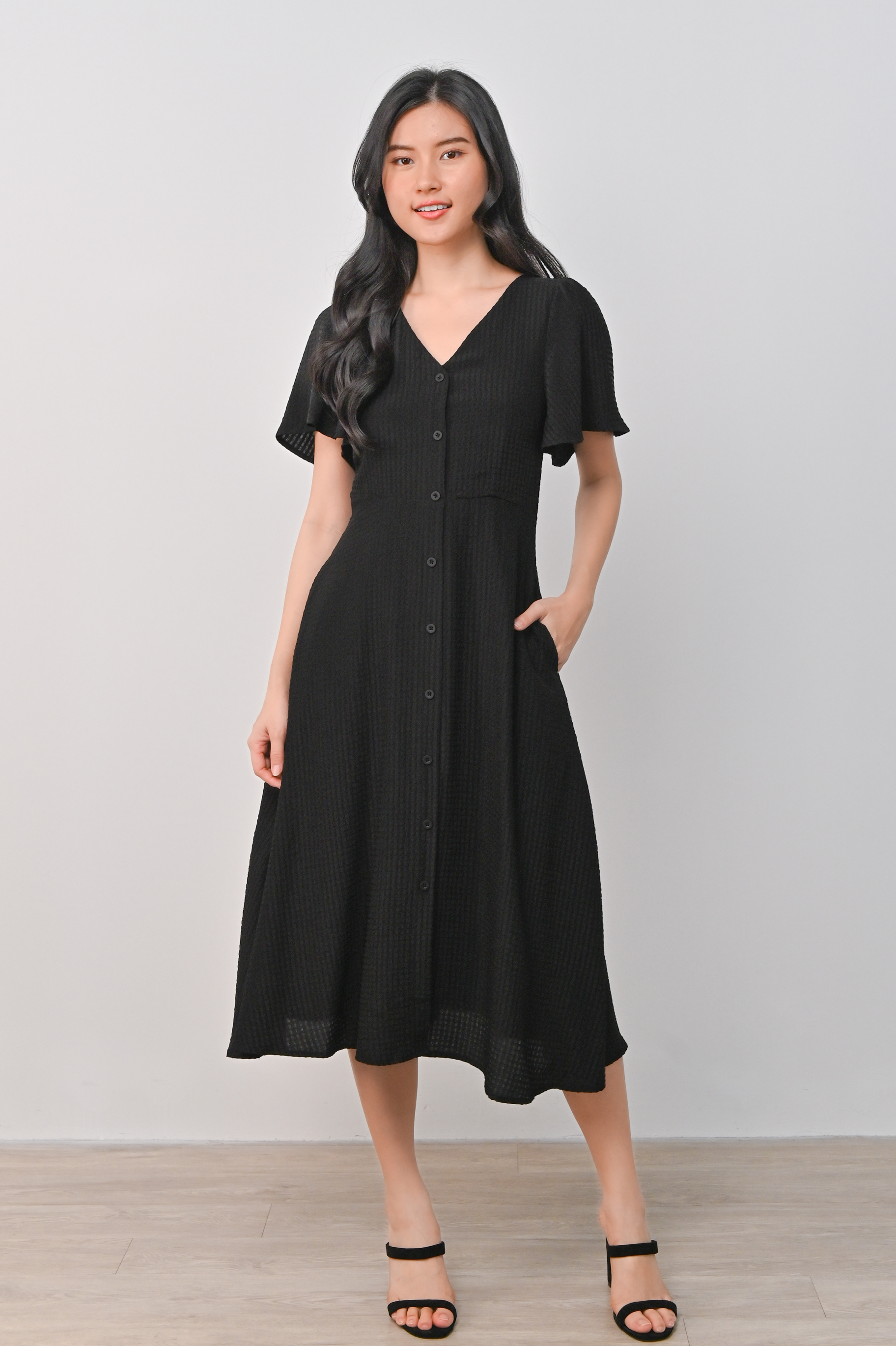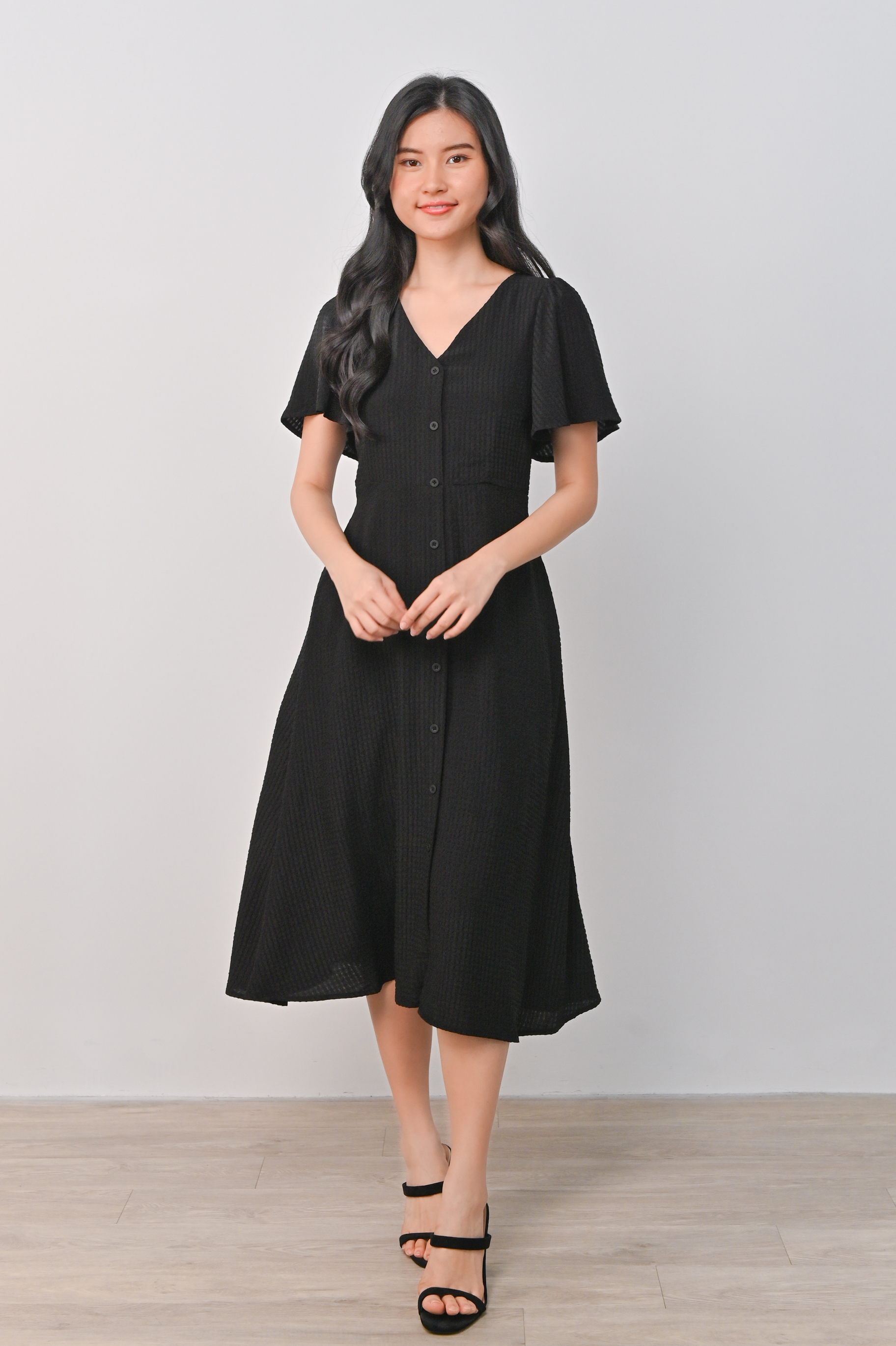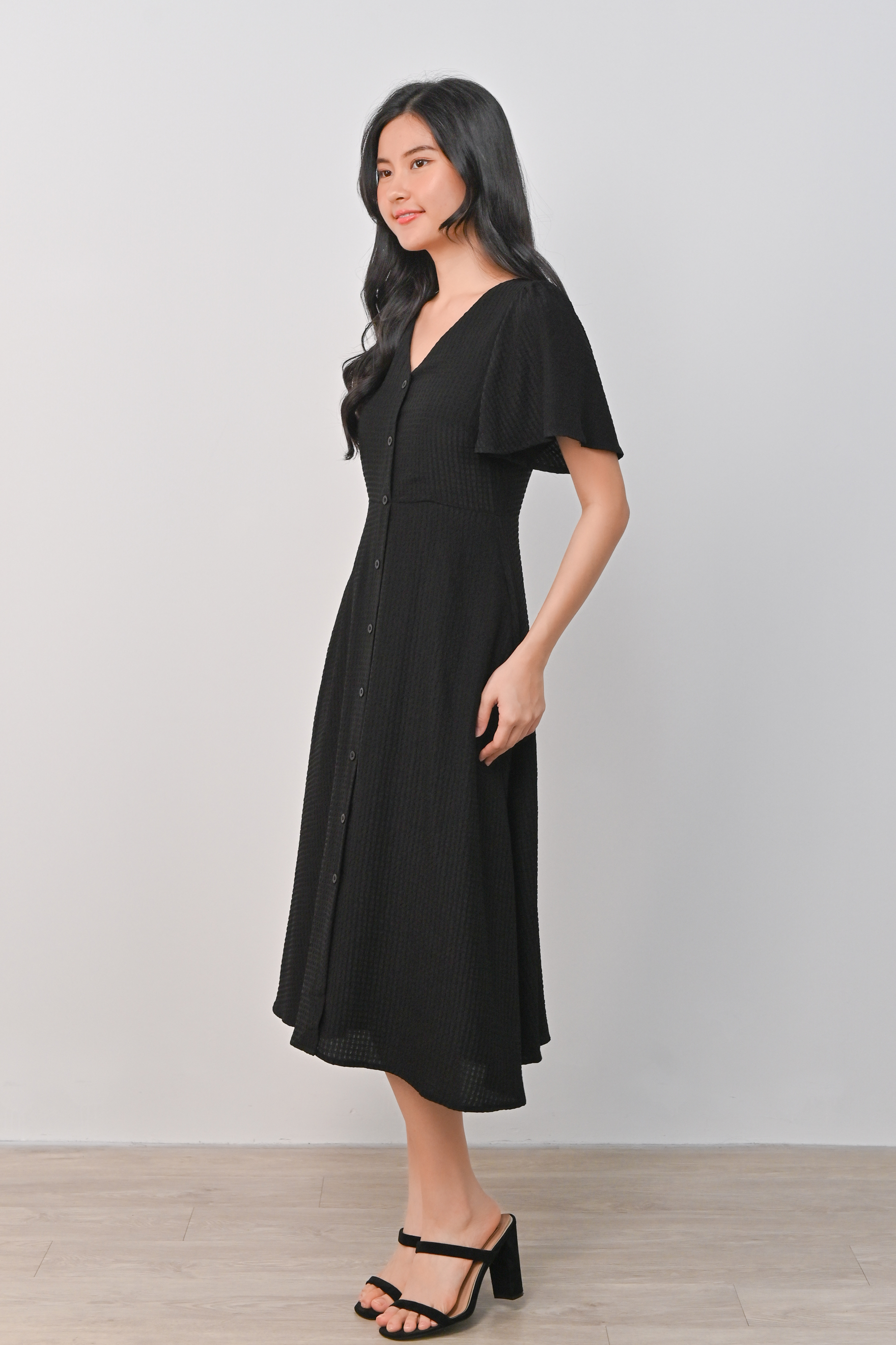 RENDIE TEXTURED SLEEVED BUTTON DRESS IN BLACK