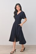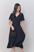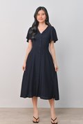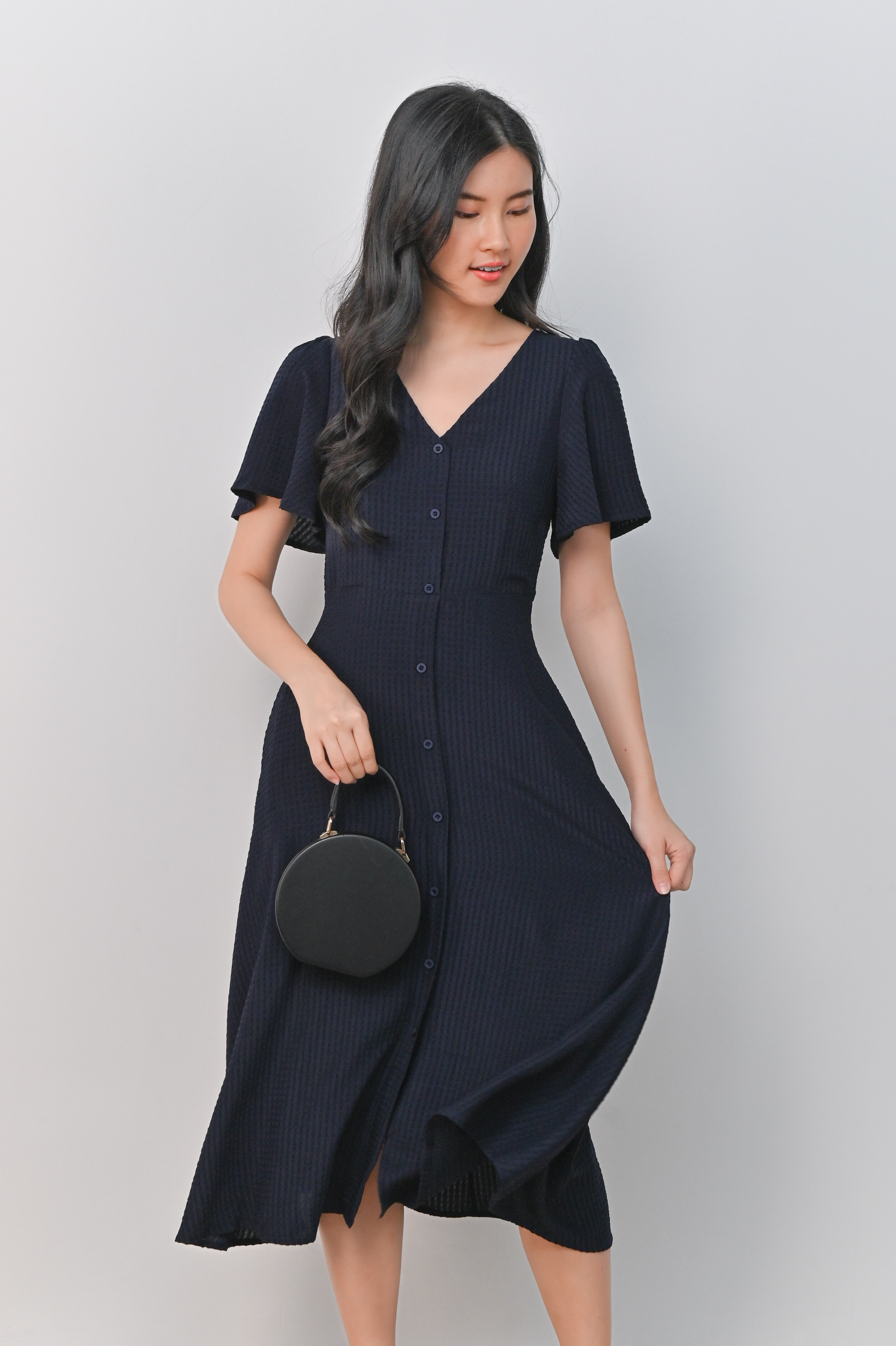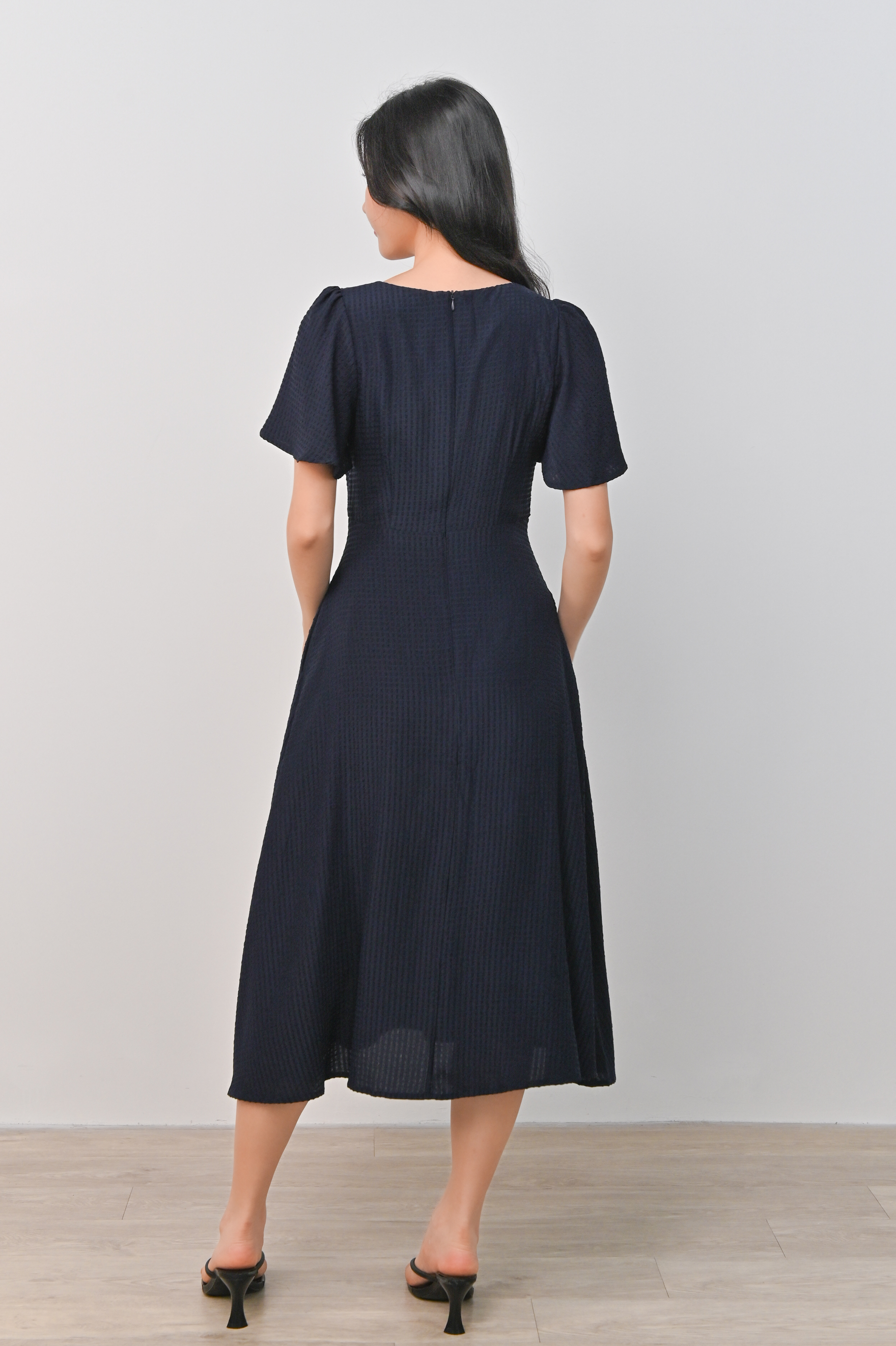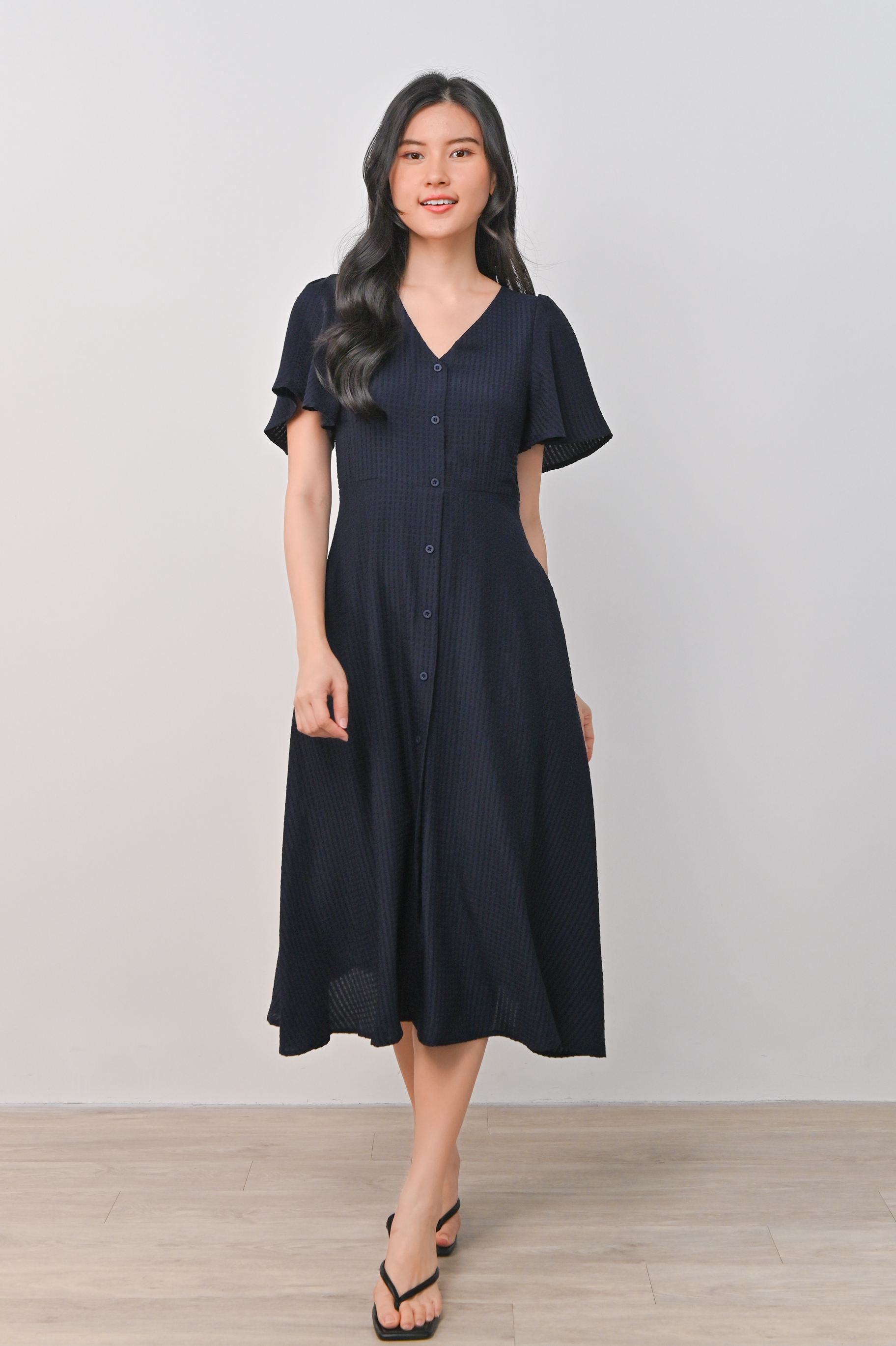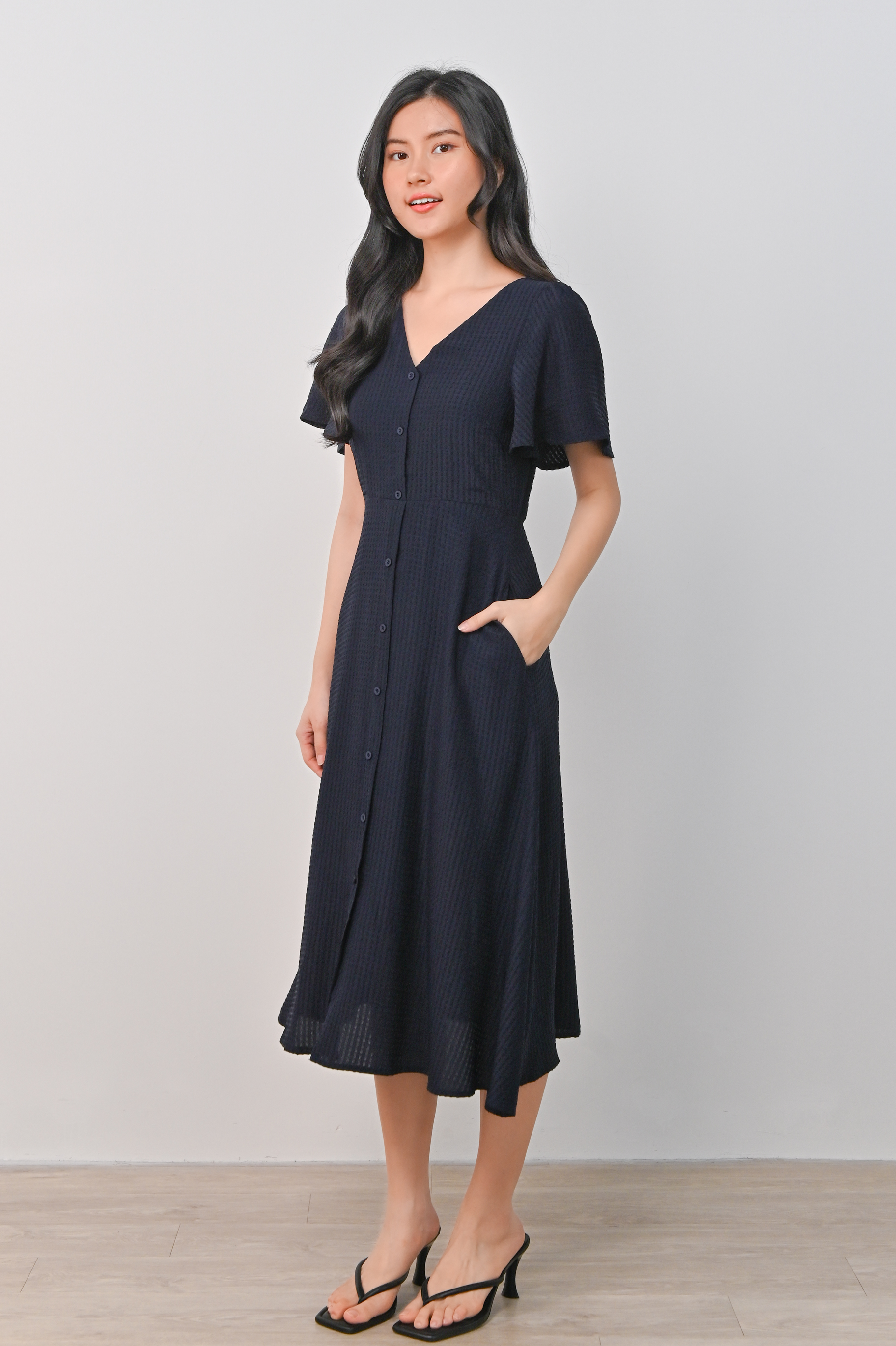 RENDIE TEXTURED SLEEVED BUTTON DRESS IN NAVY