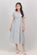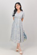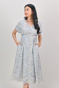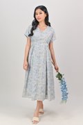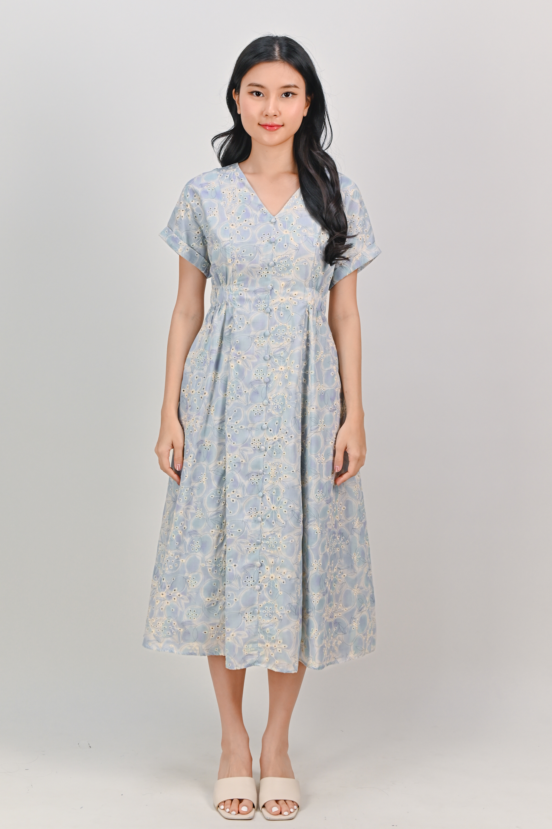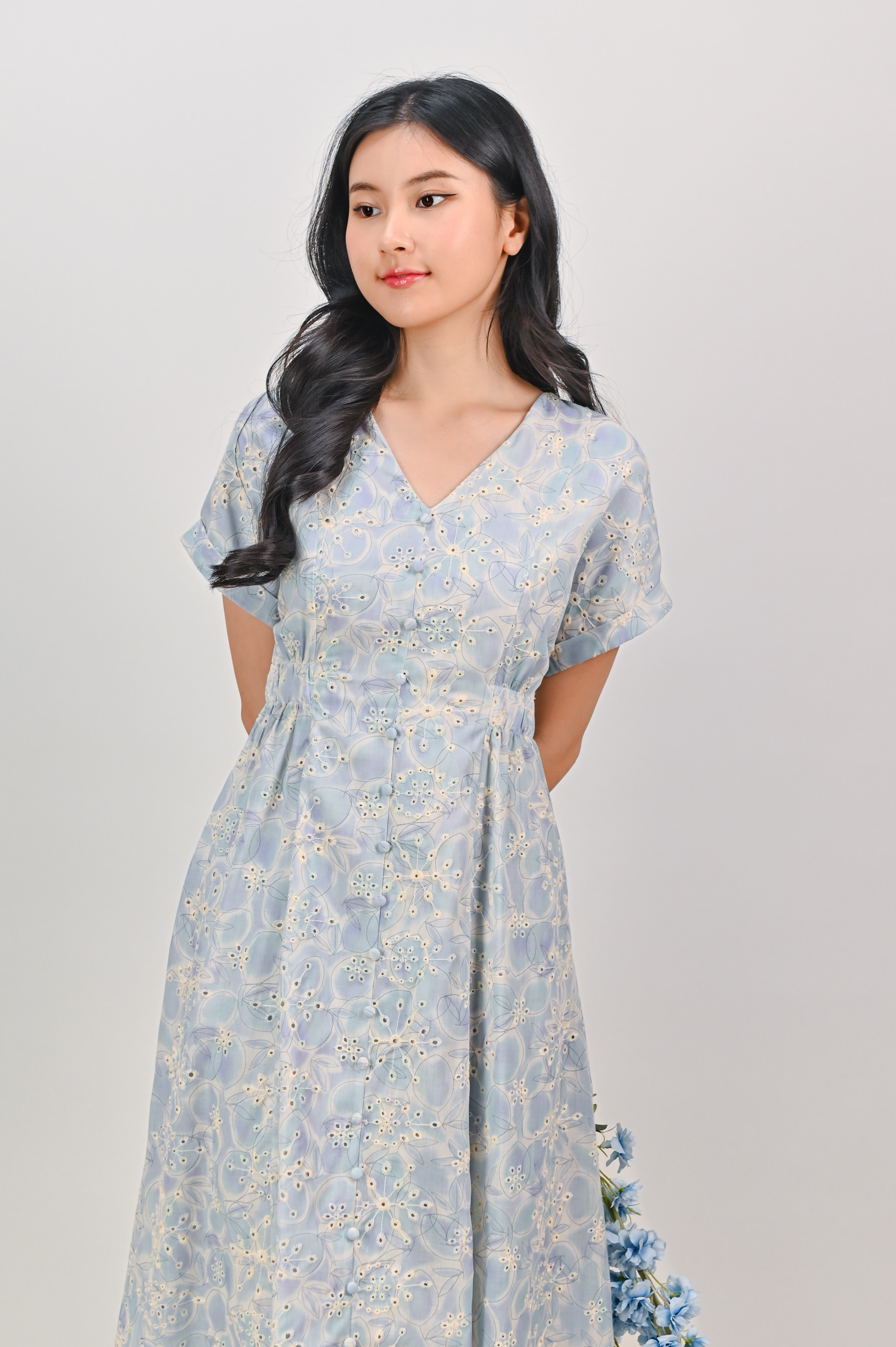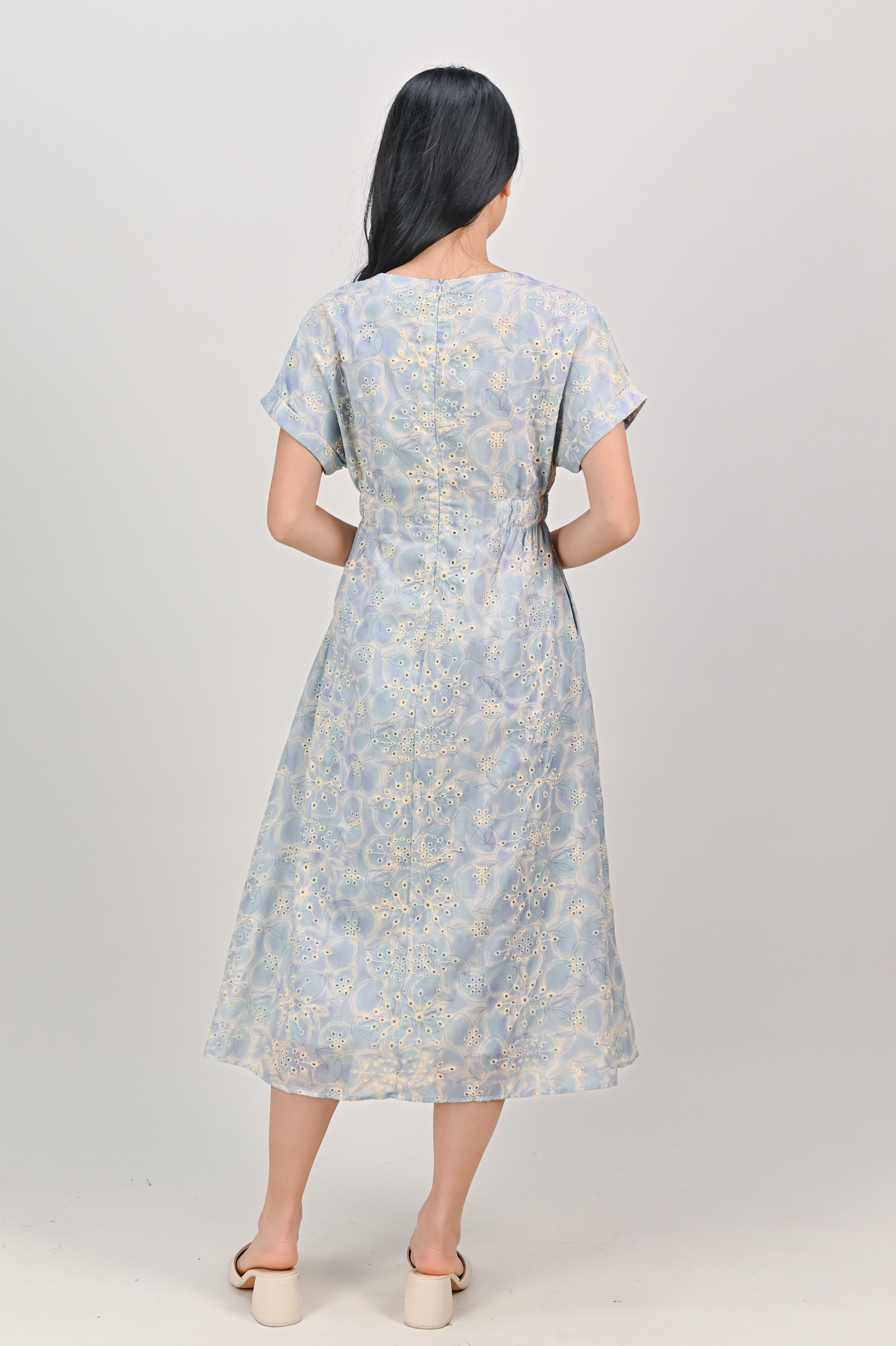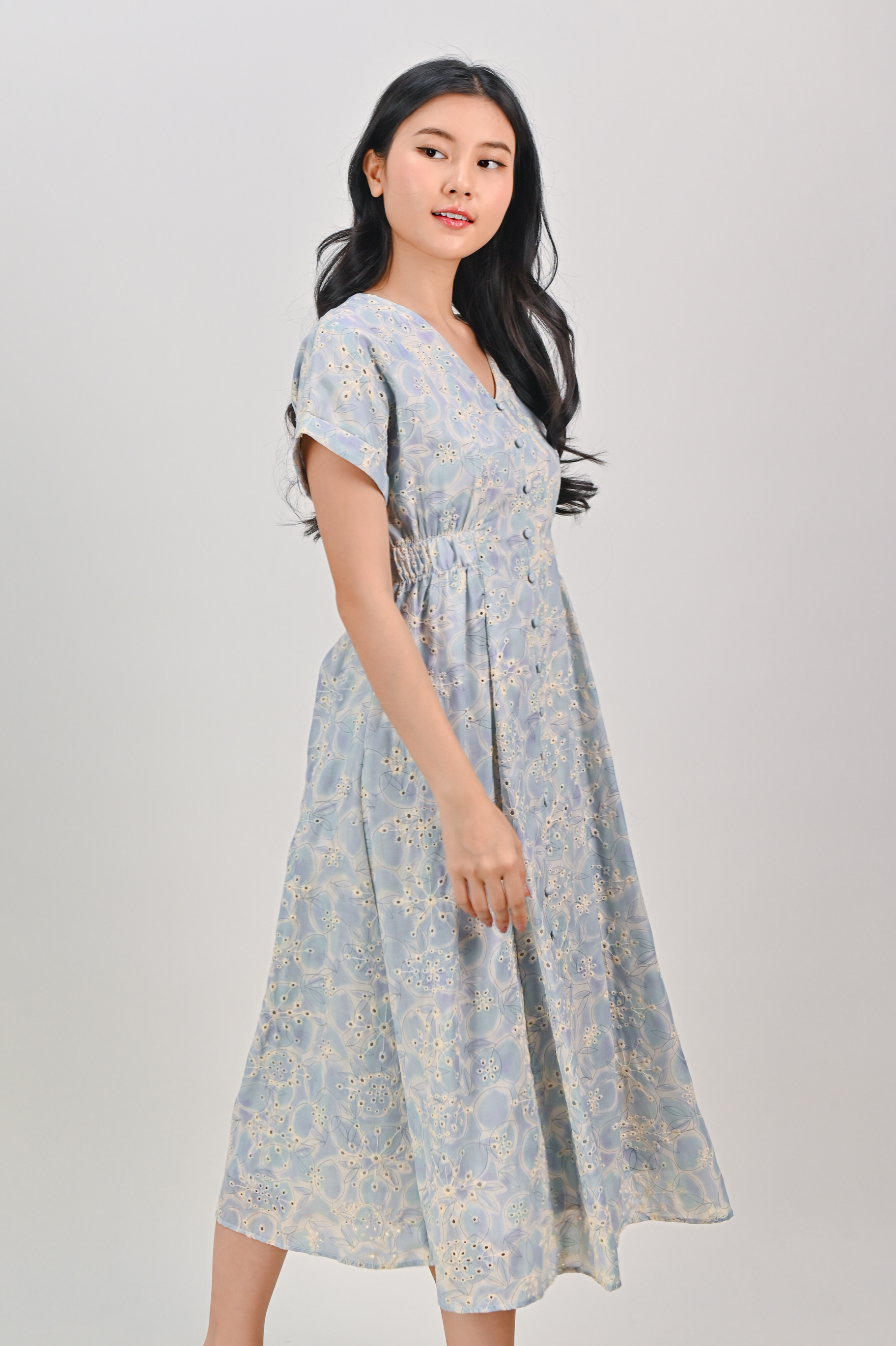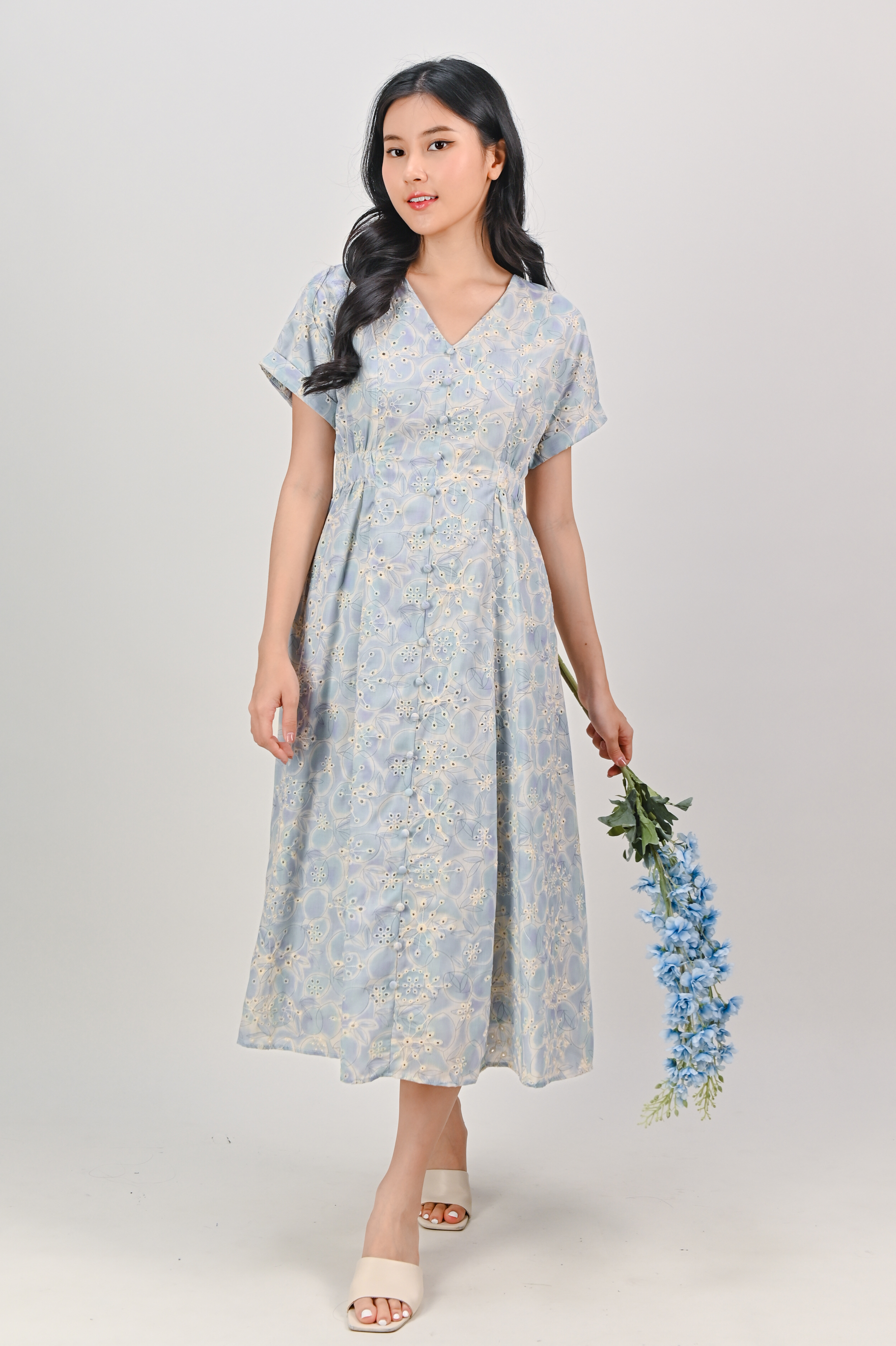 RIDLEY BLUE EYELET FLORAL SLEEVED MIDI DRESS