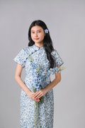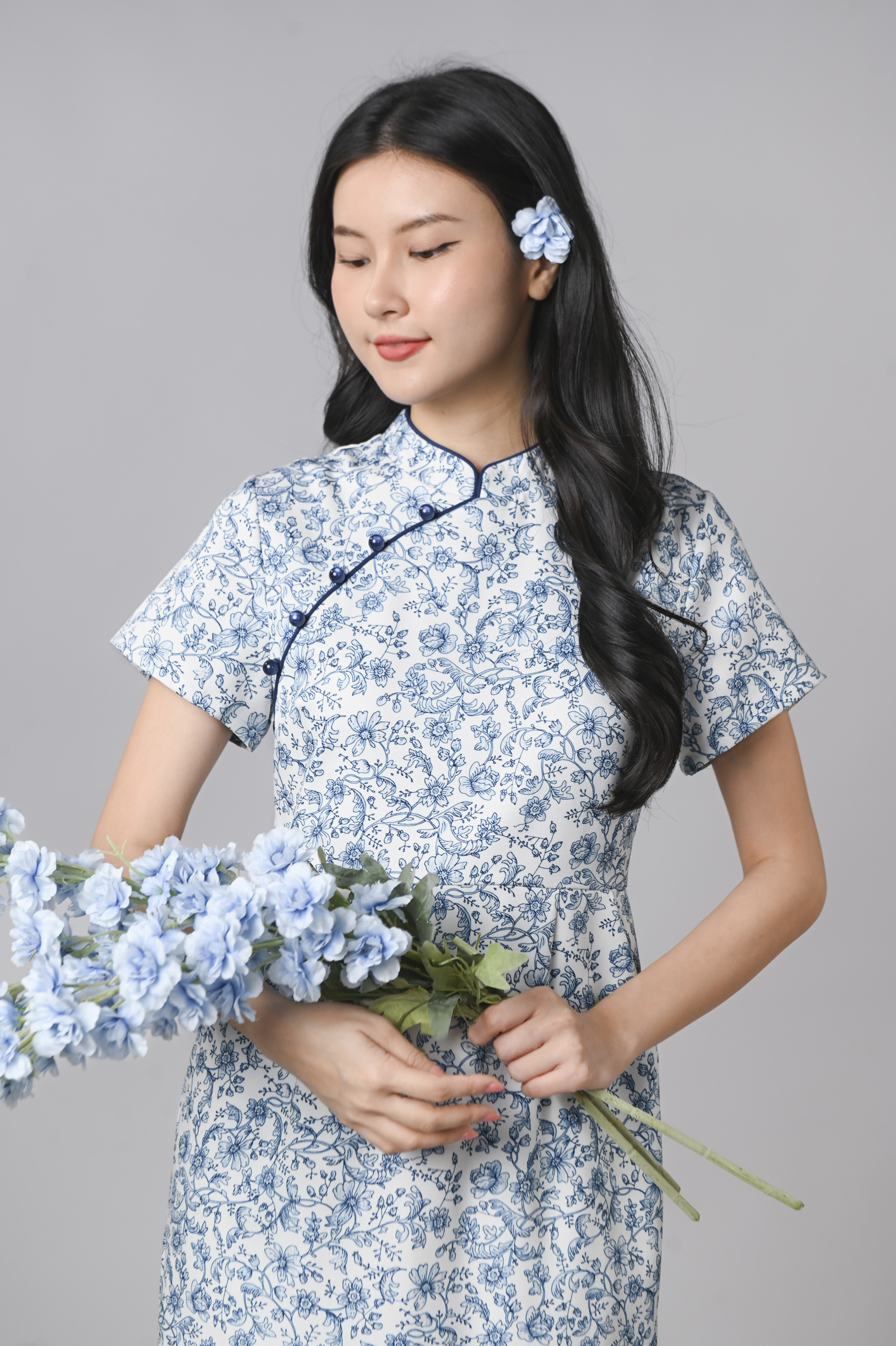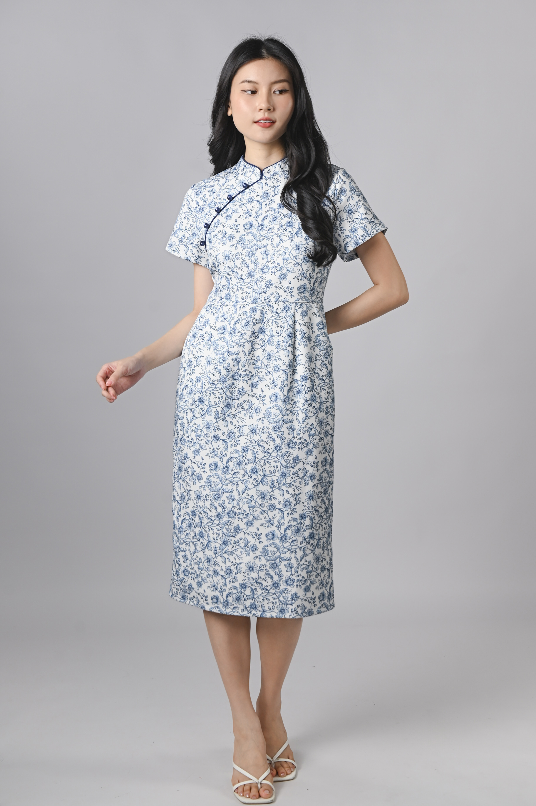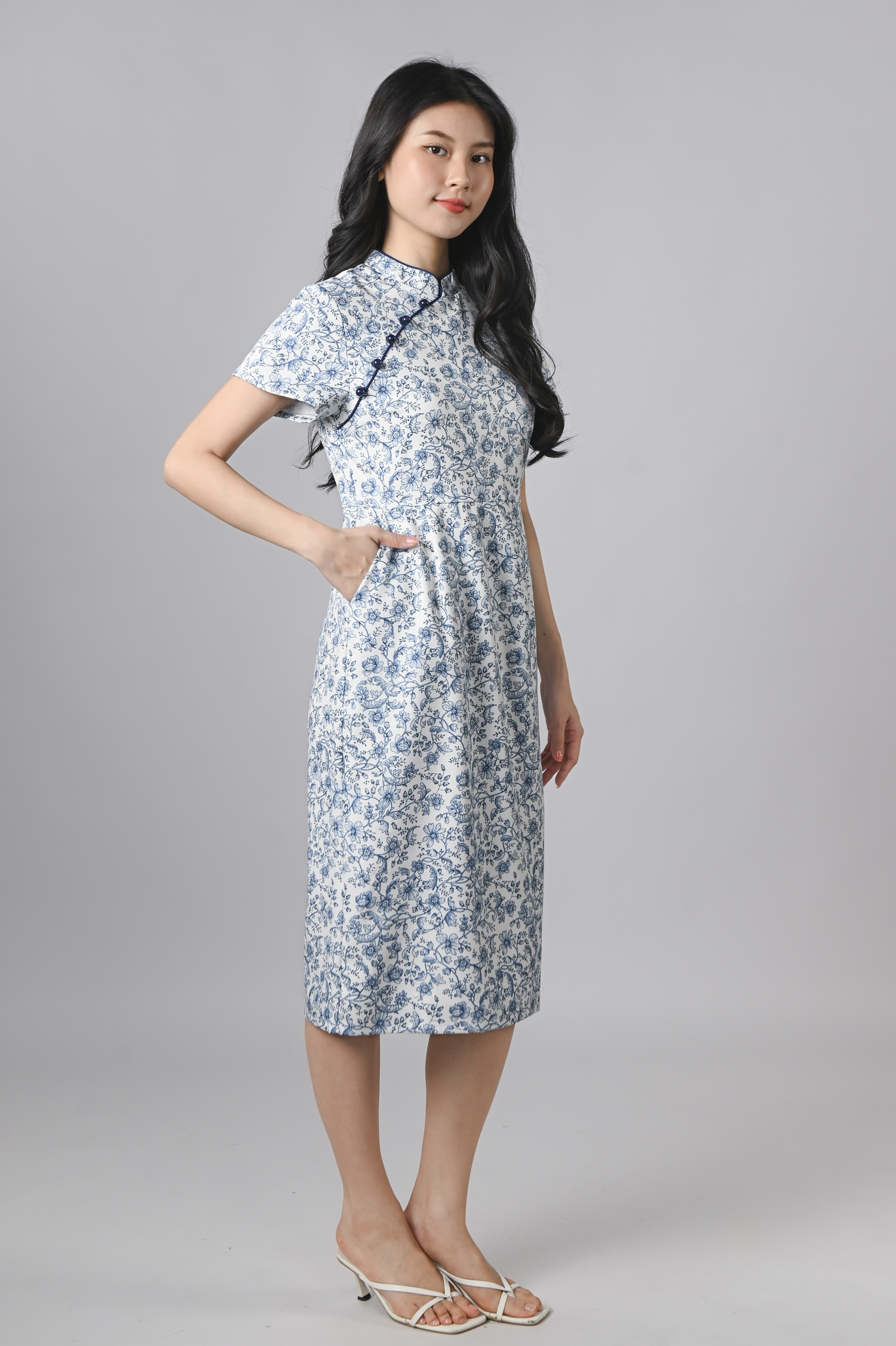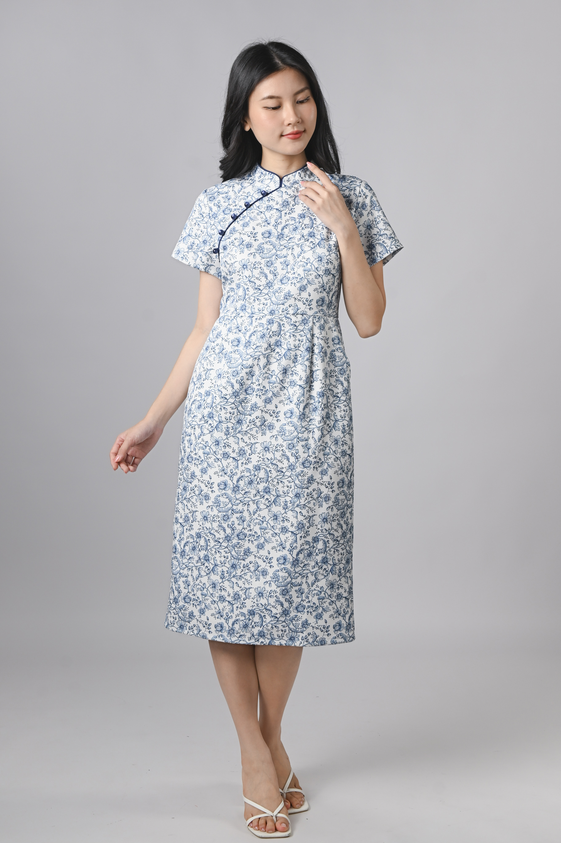RUOLING BLUE PORCELAIN SLEEVED CHEONGSAM DRESS