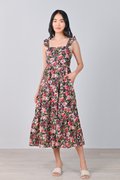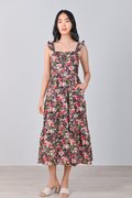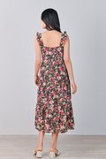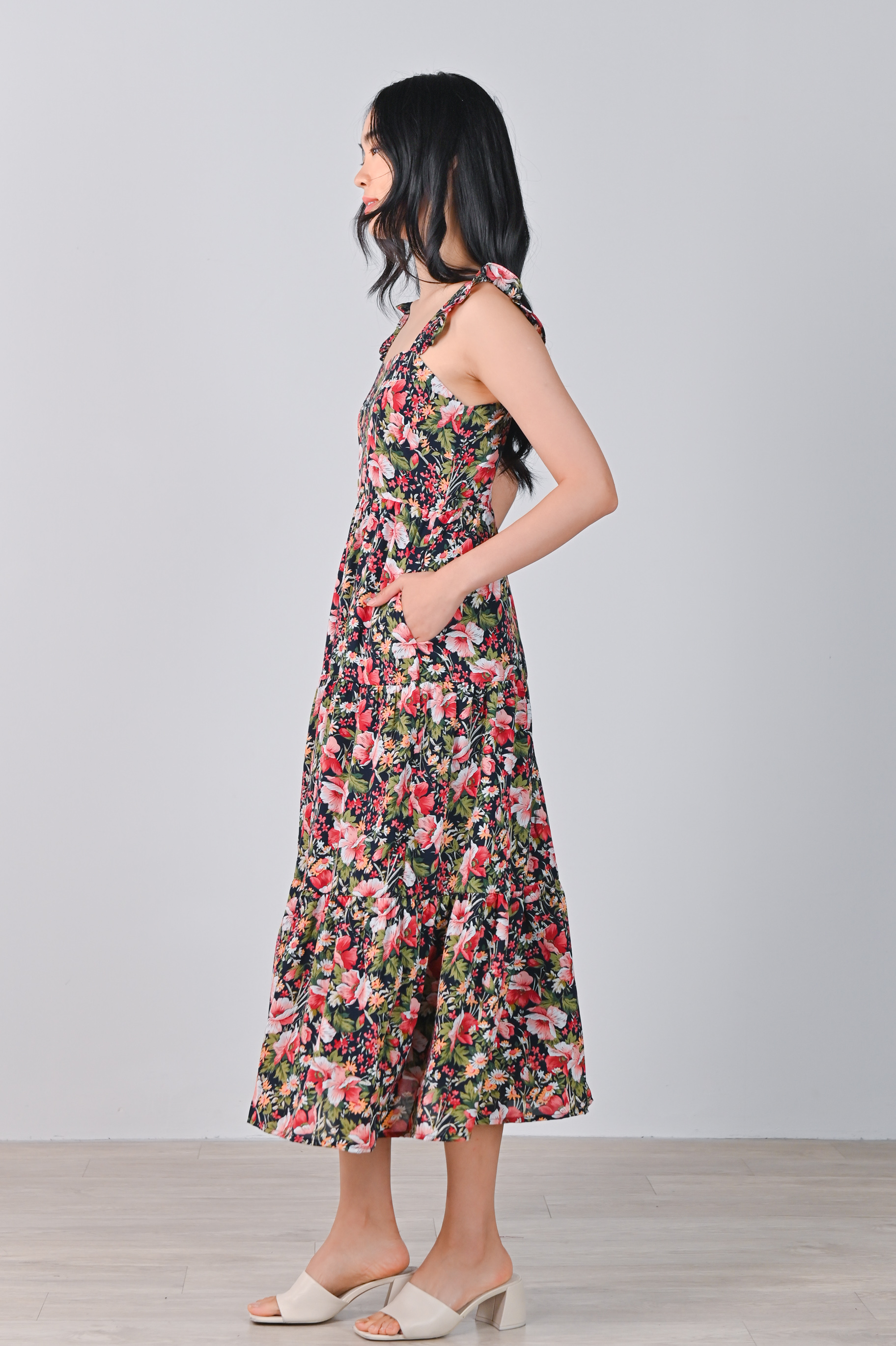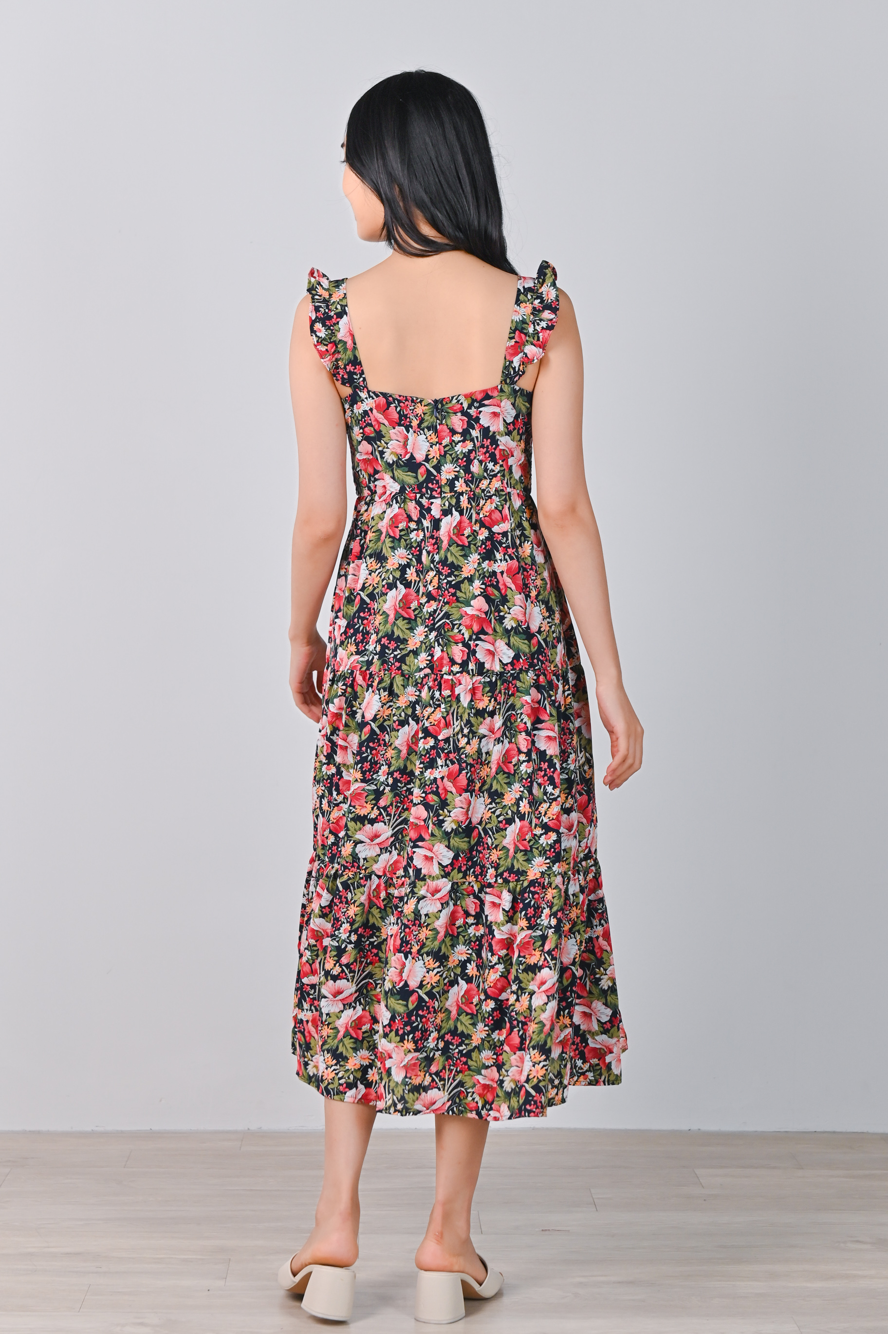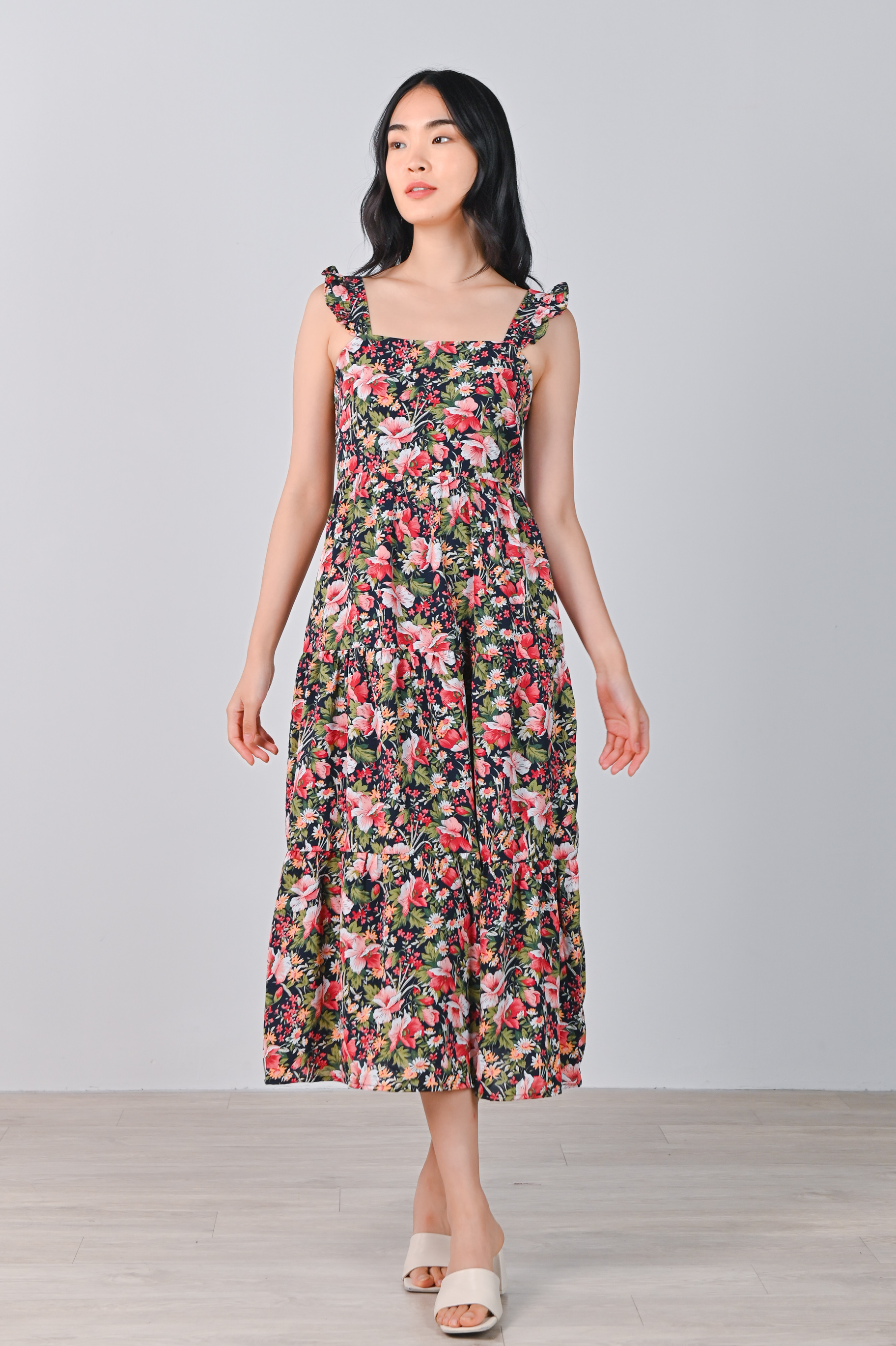 RYA FLORAL FRILL-STRAP TIERED DRESS IN NAVY