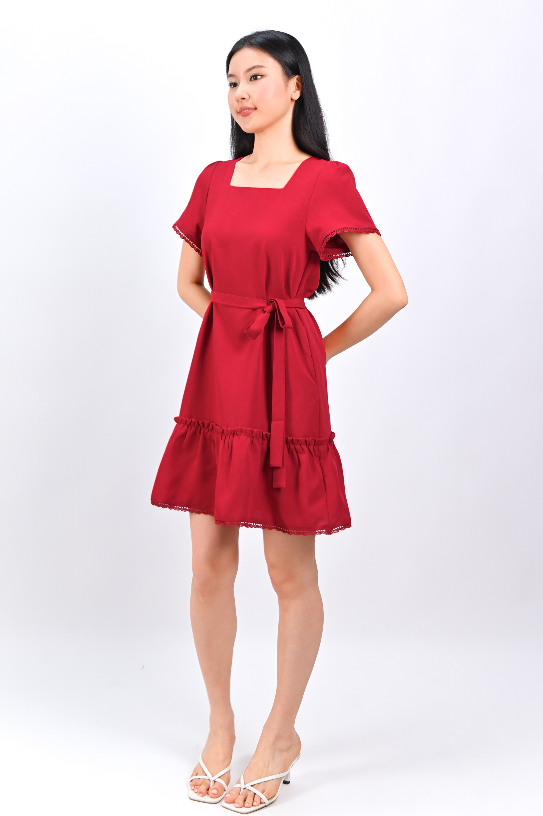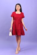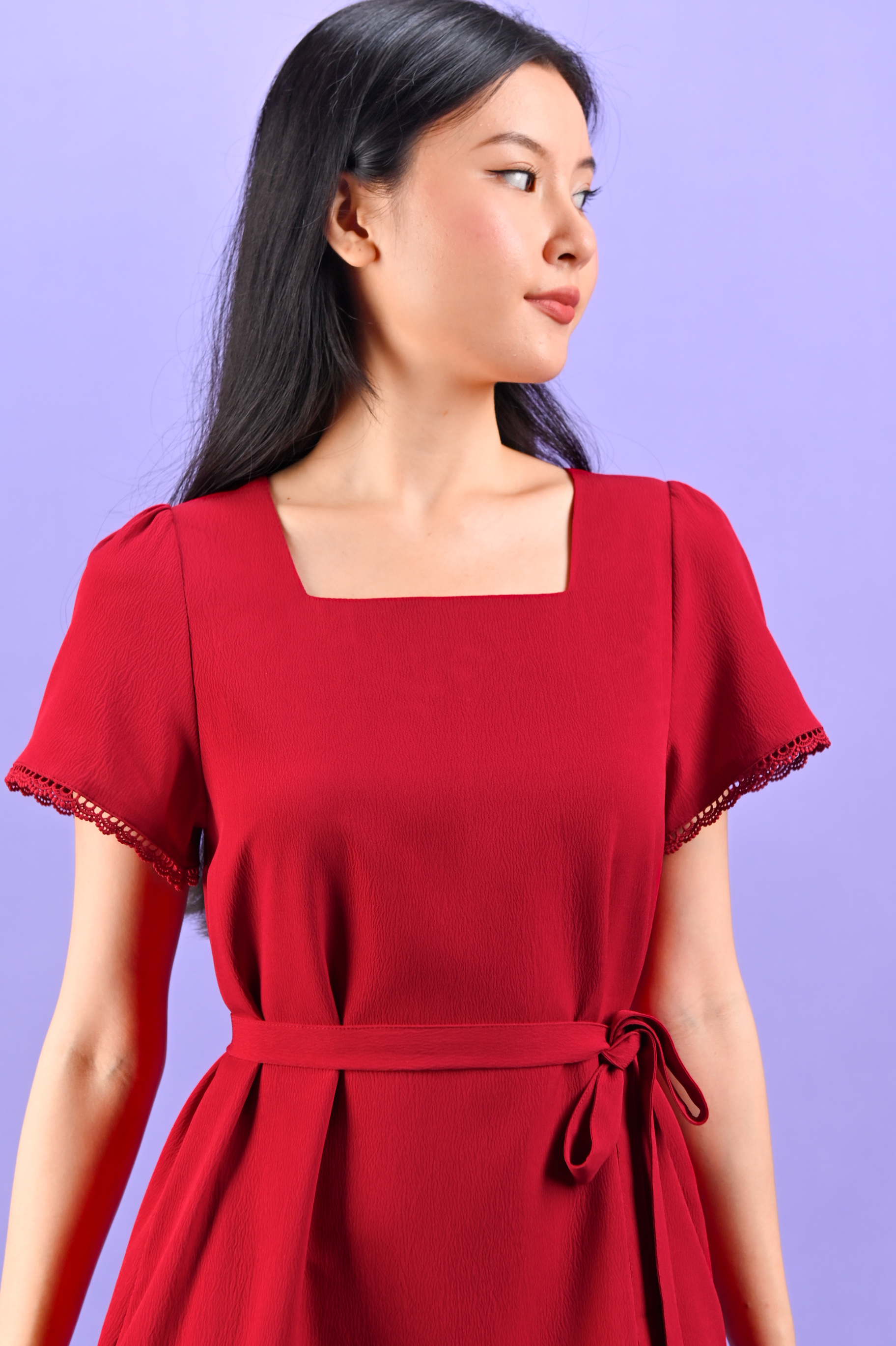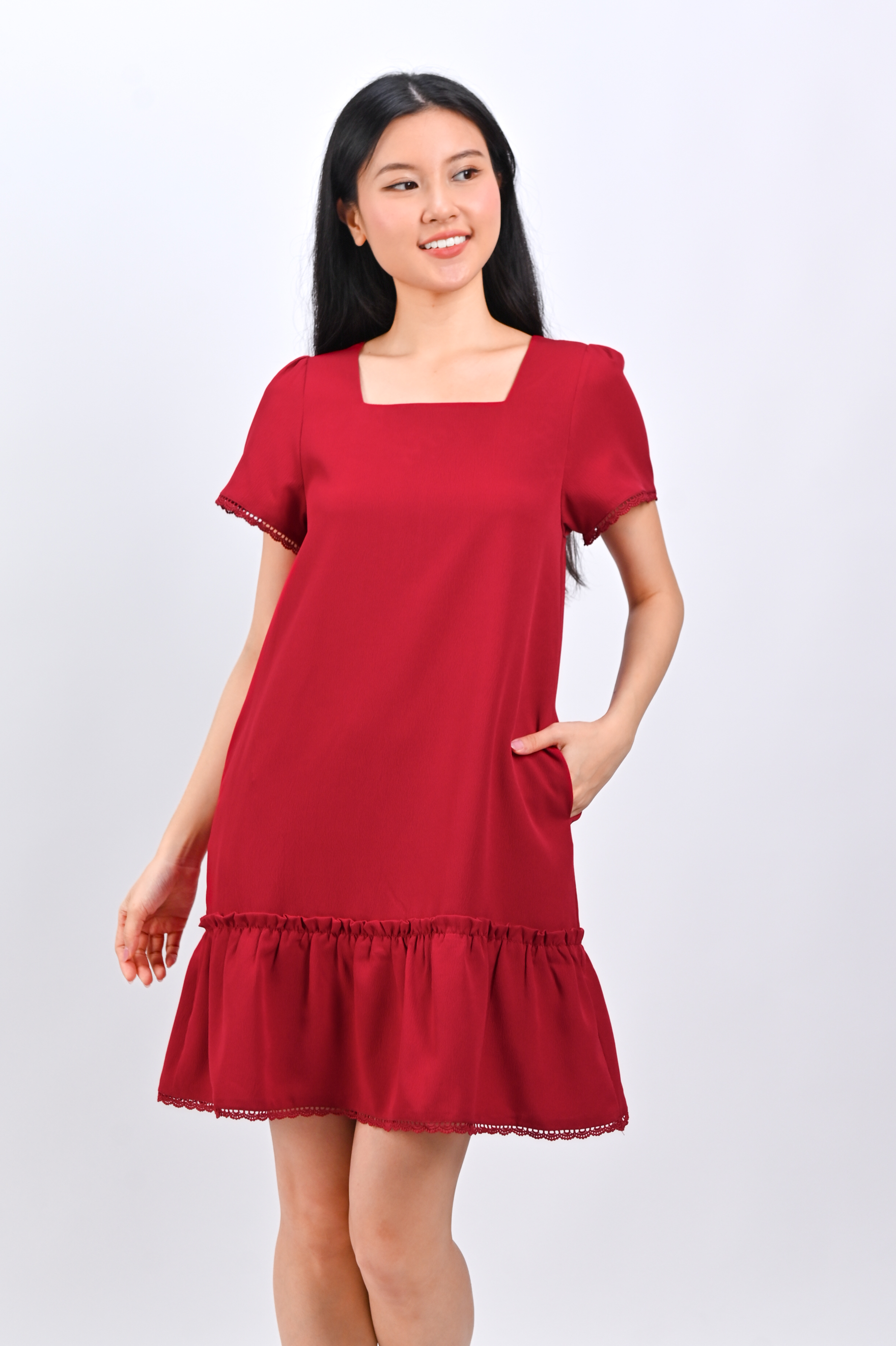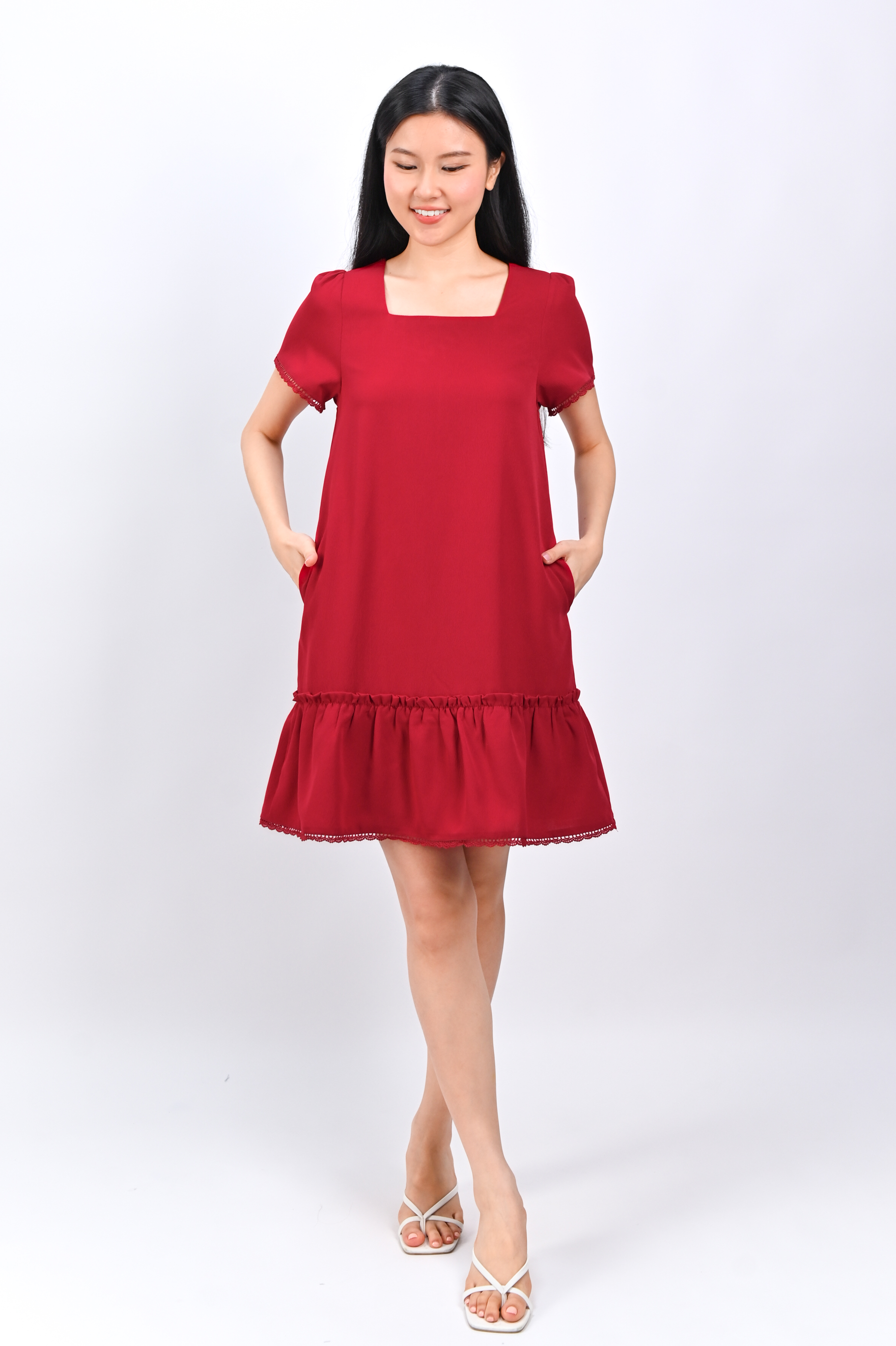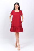 SABBY SQUARE-NECK SLEEVED DROPWAIST DRESS IN RED
