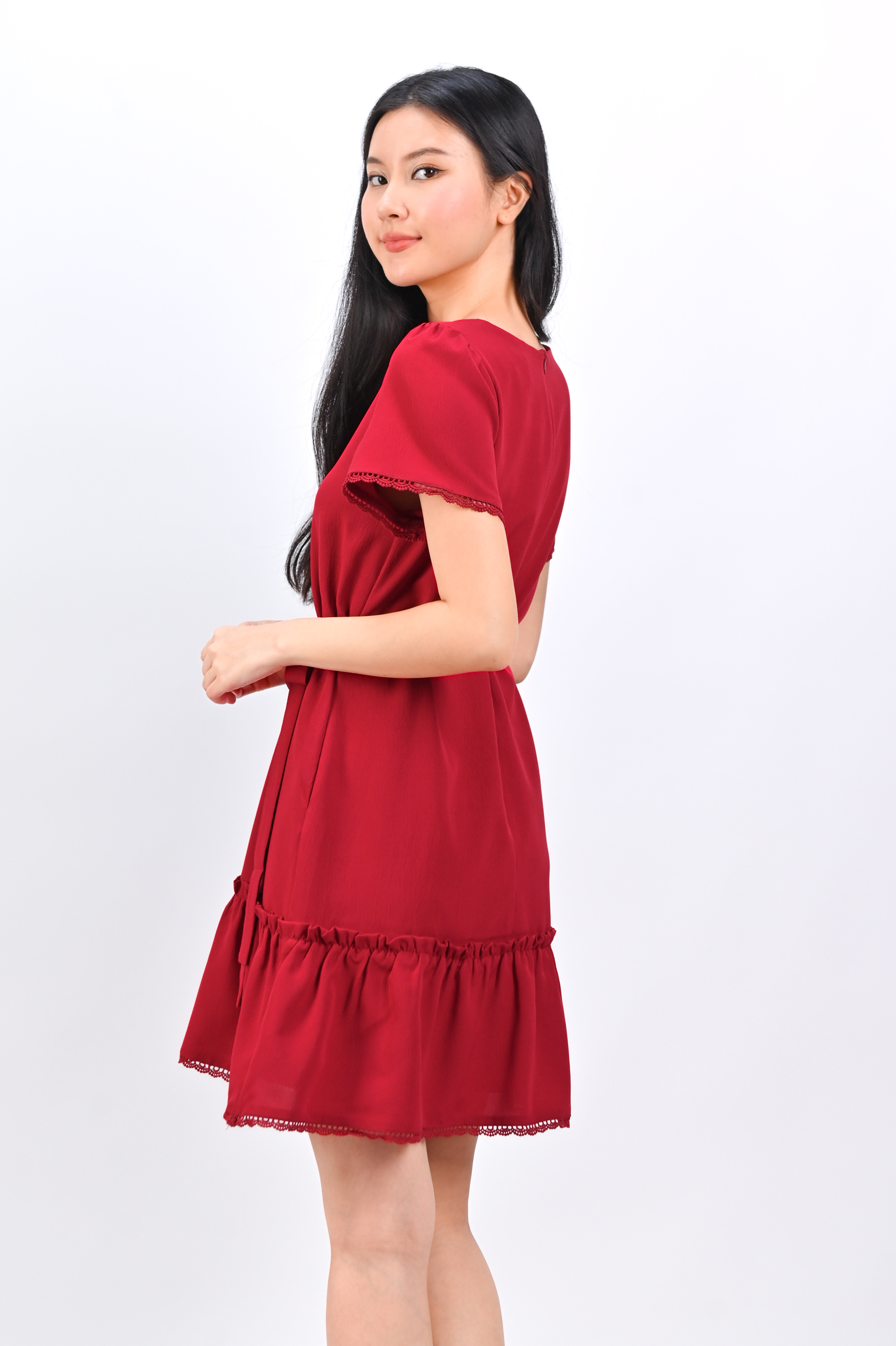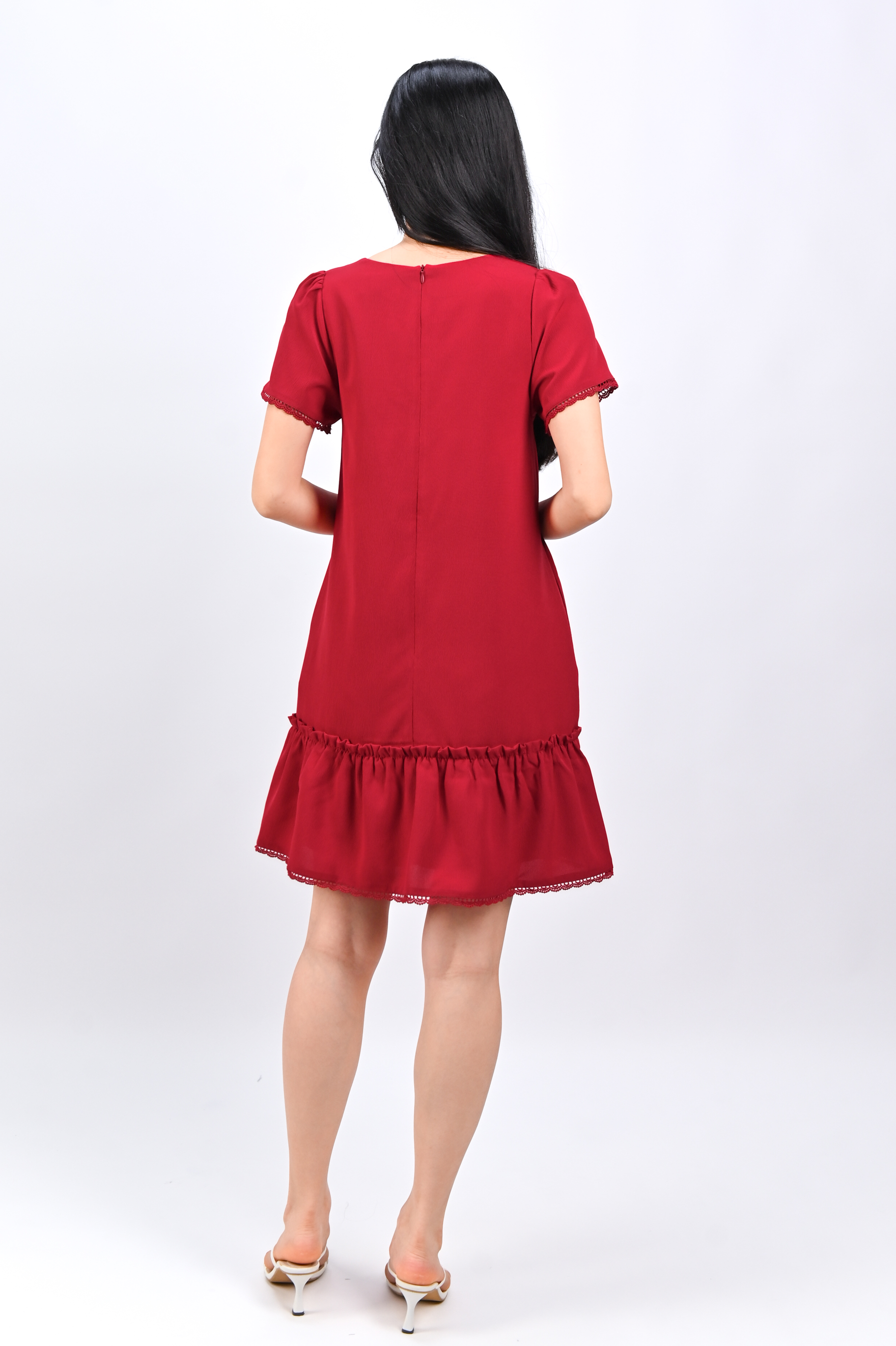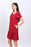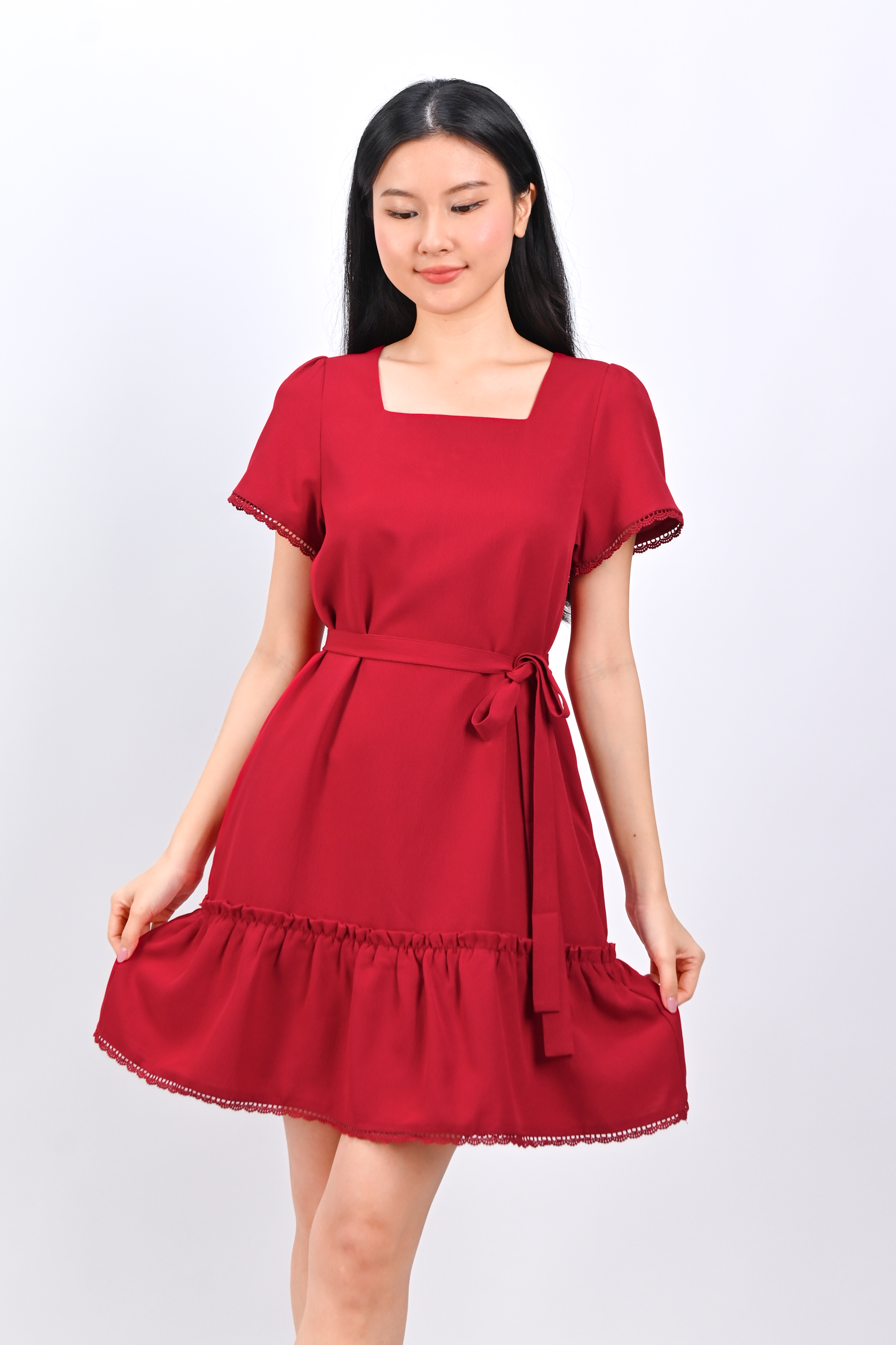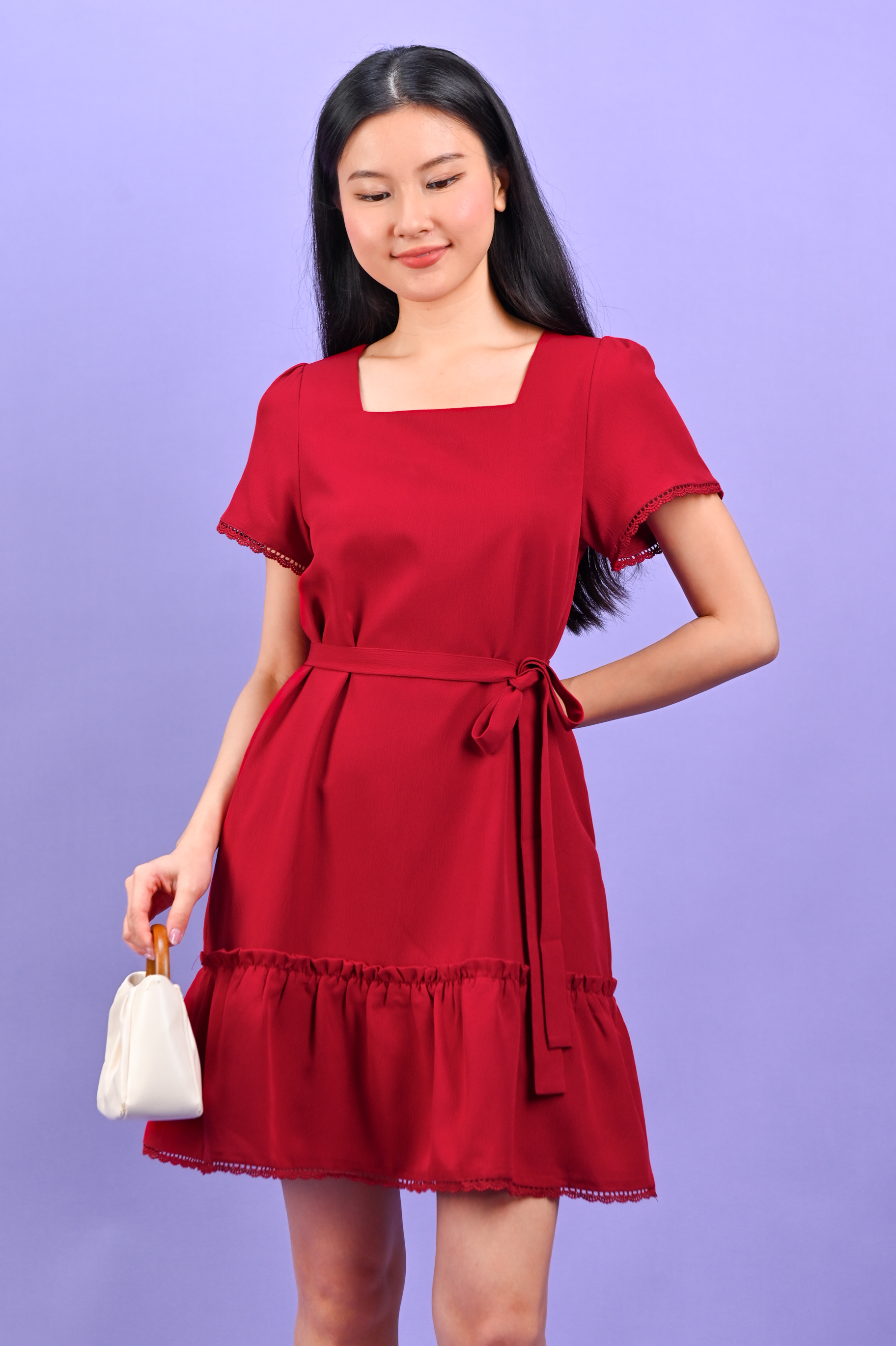 SABBY SQUARE-NECK SLEEVED DROPWAIST DRESS IN RED