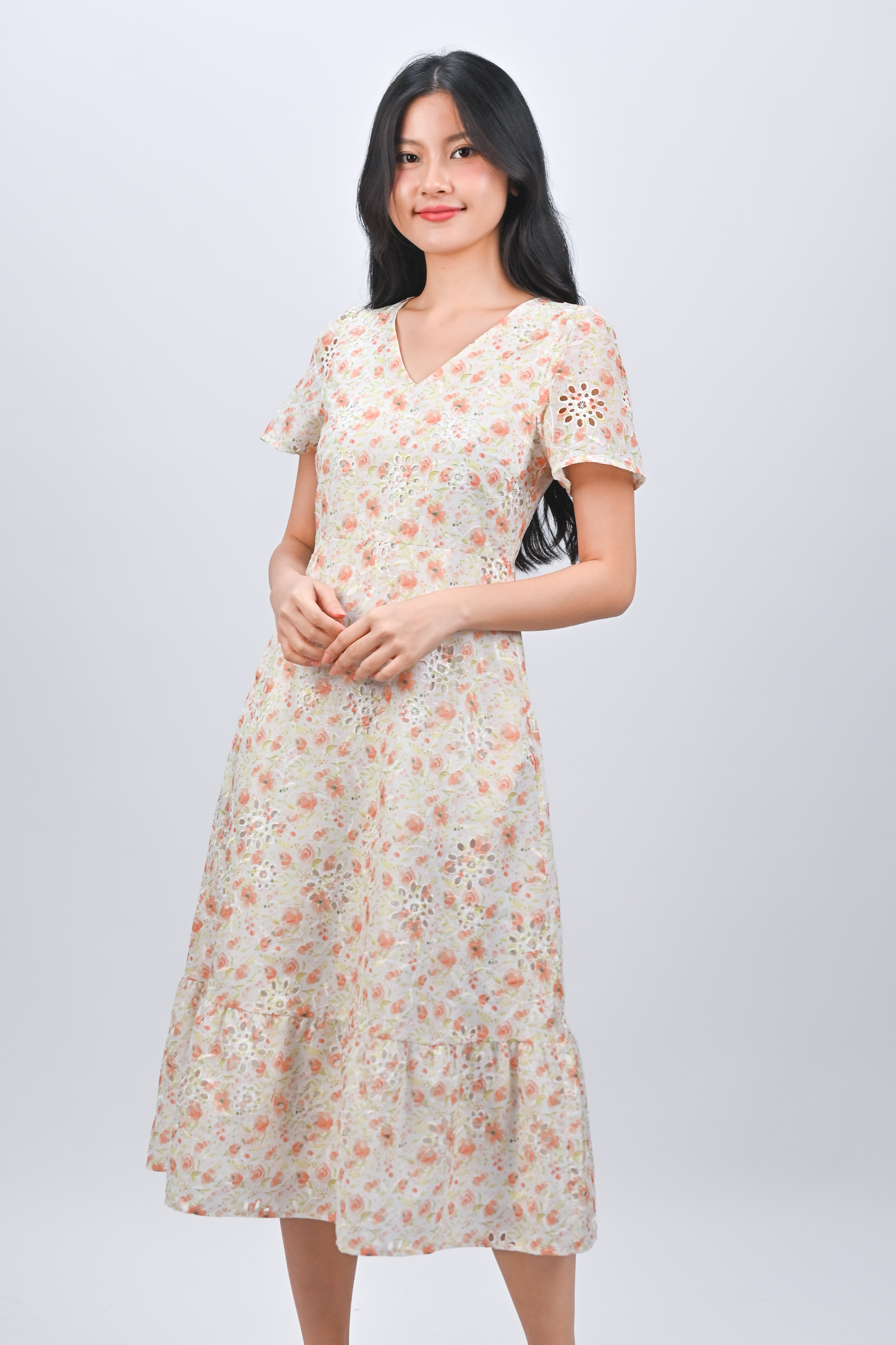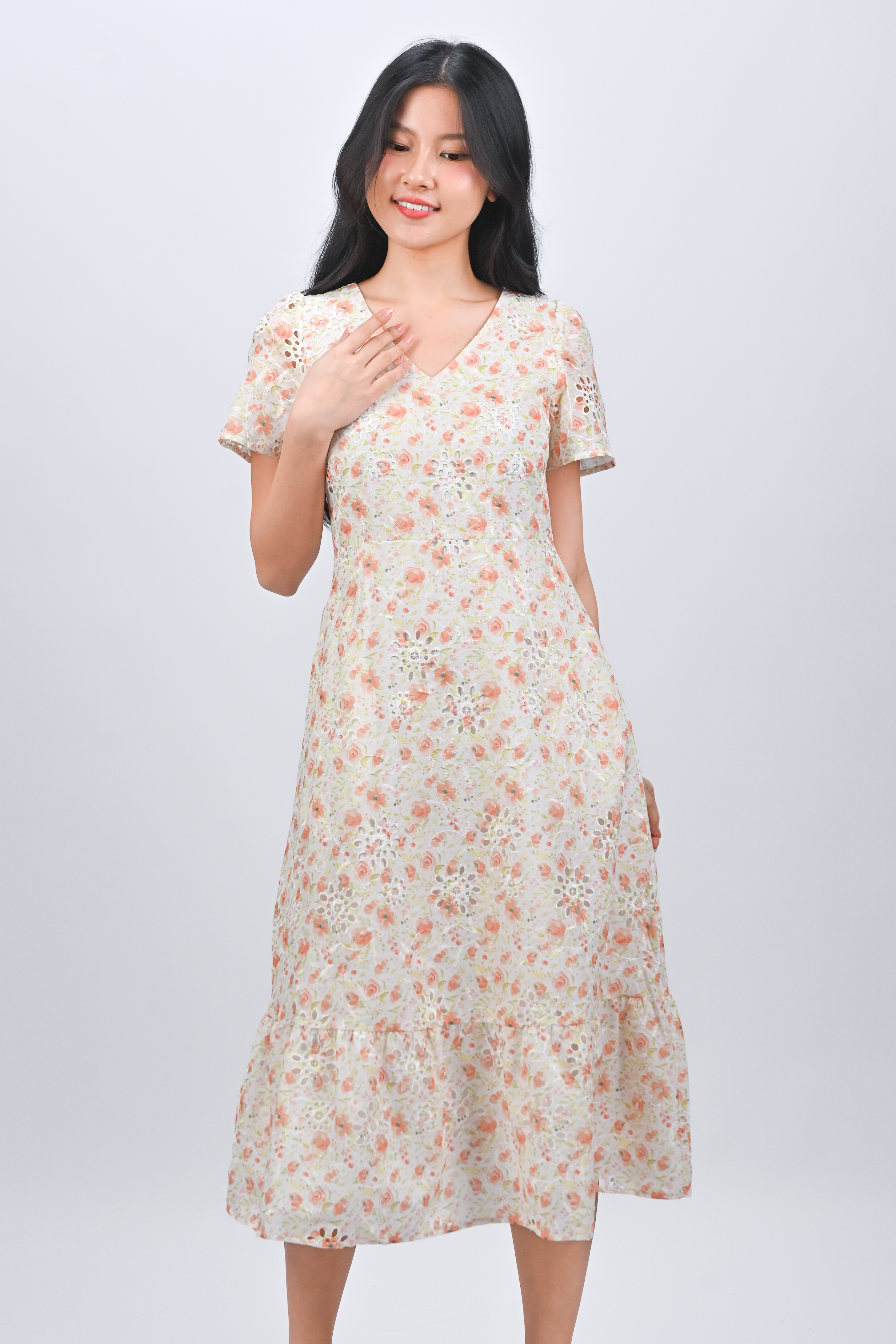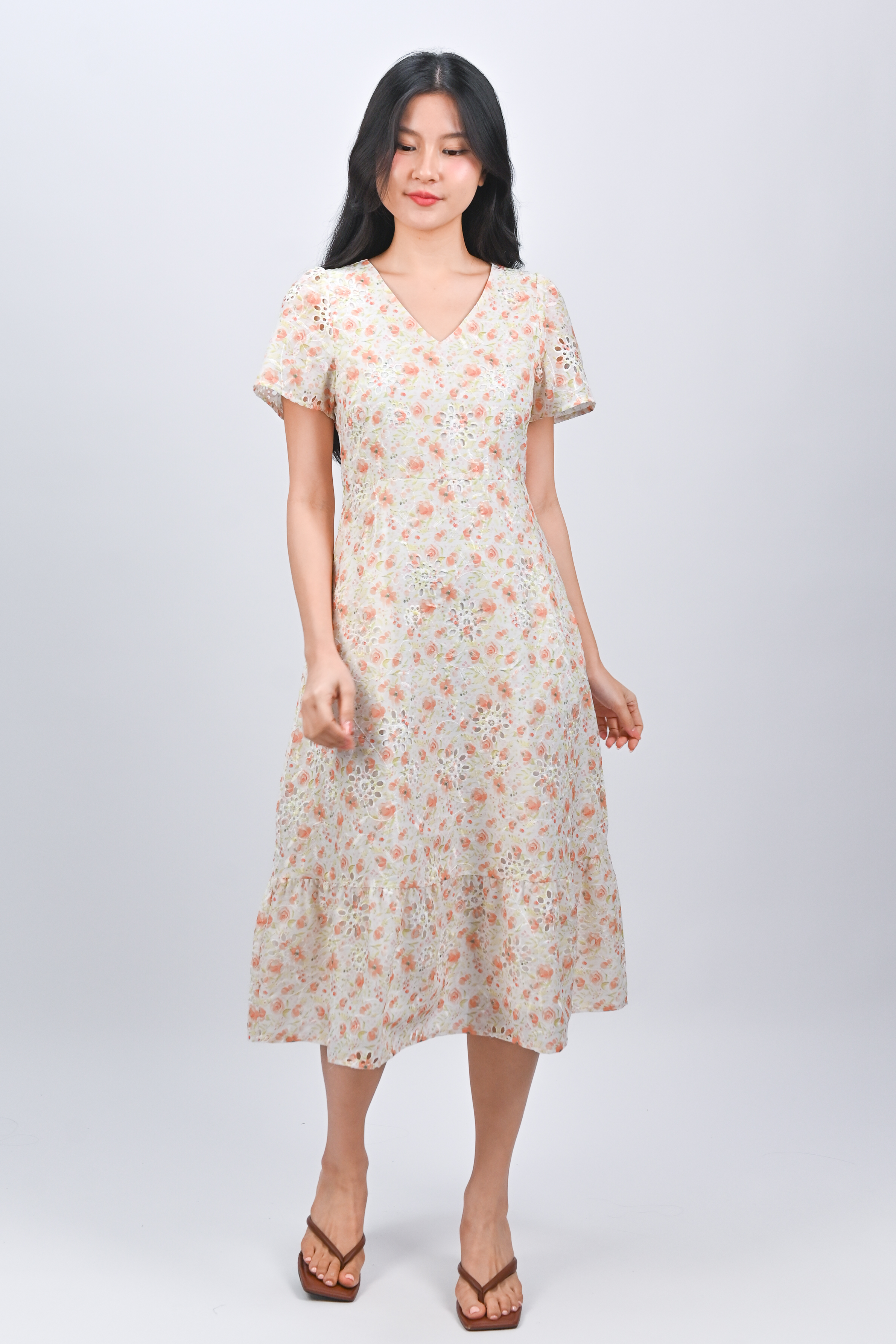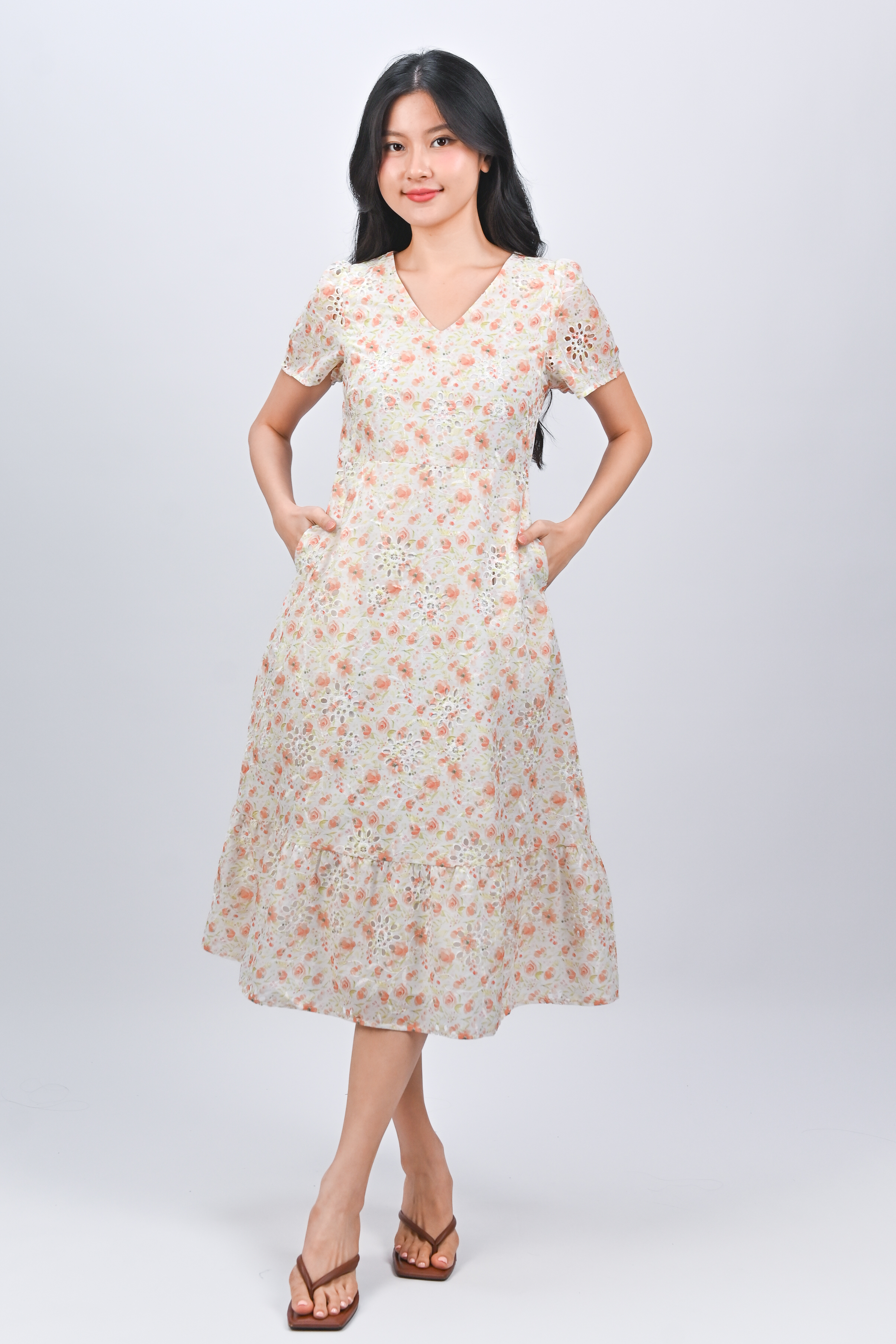 Actual stocks may varyHappy blooms and sweet eyelet embroidery details! 🌹 Our Sadie Midi Dress is a classy-chic work-to-weekend number! 🍊🧡