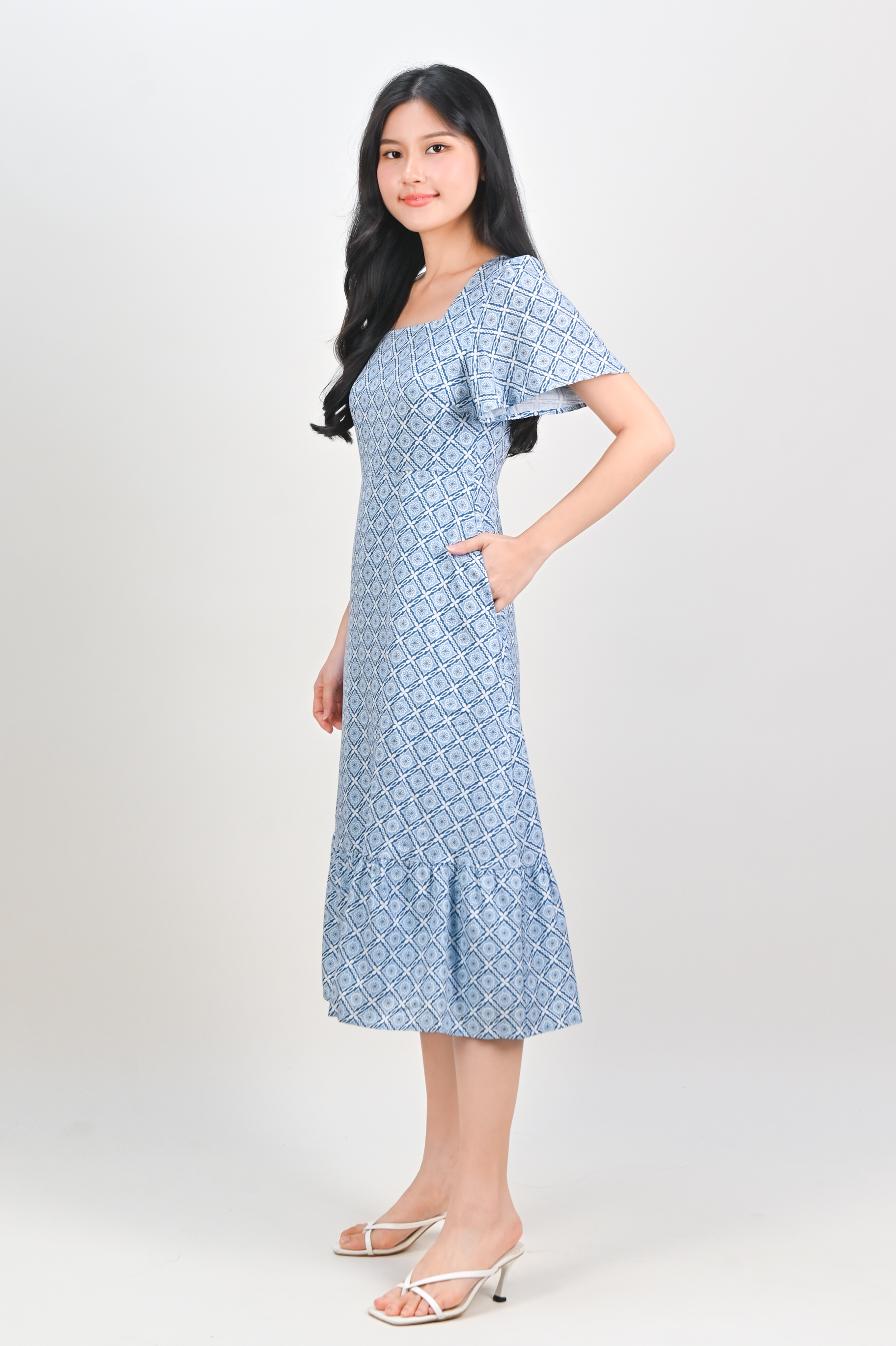 SANTORINI TILES SQUARE-NECK SLEEVED MIDI DRESS