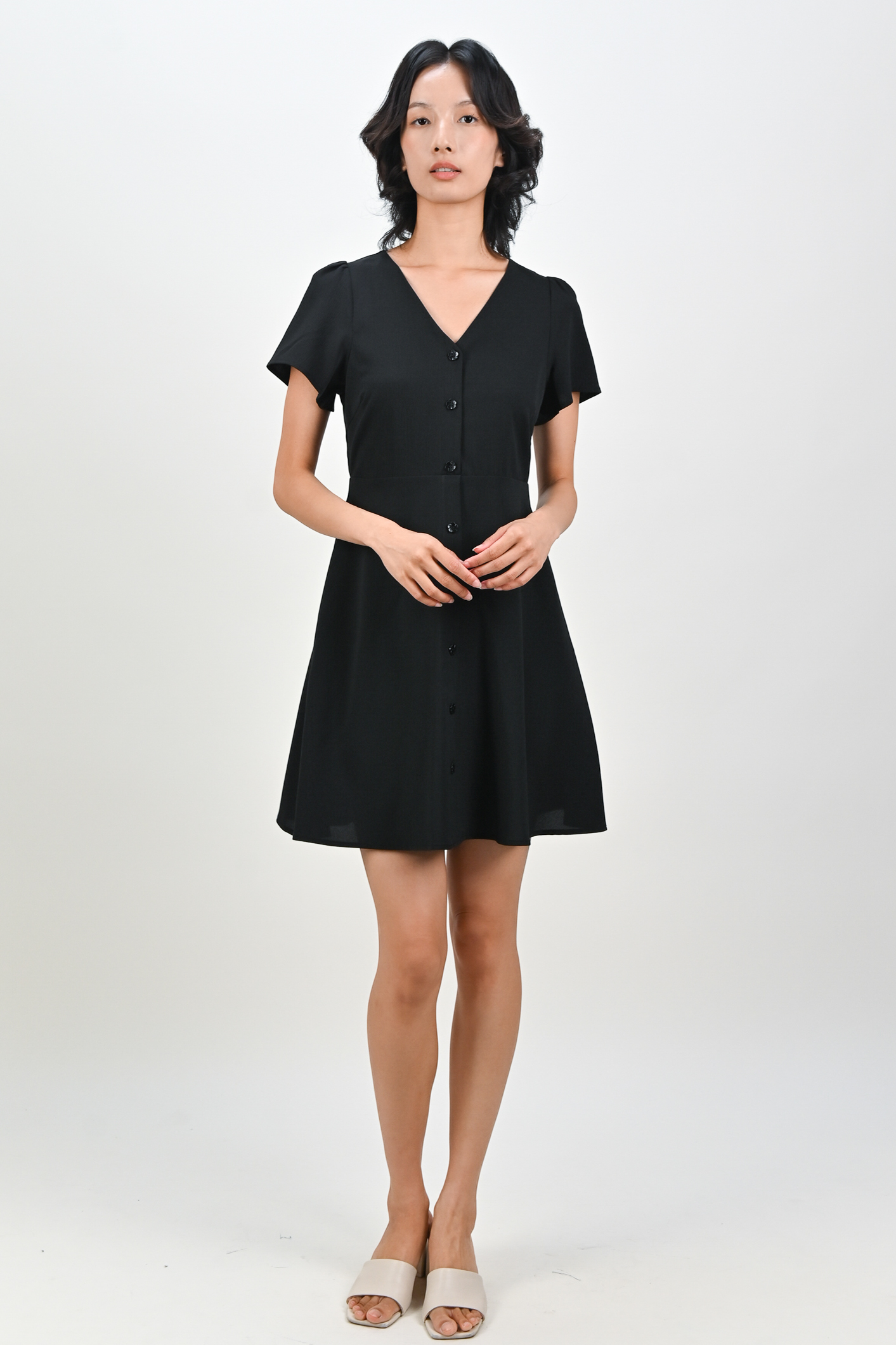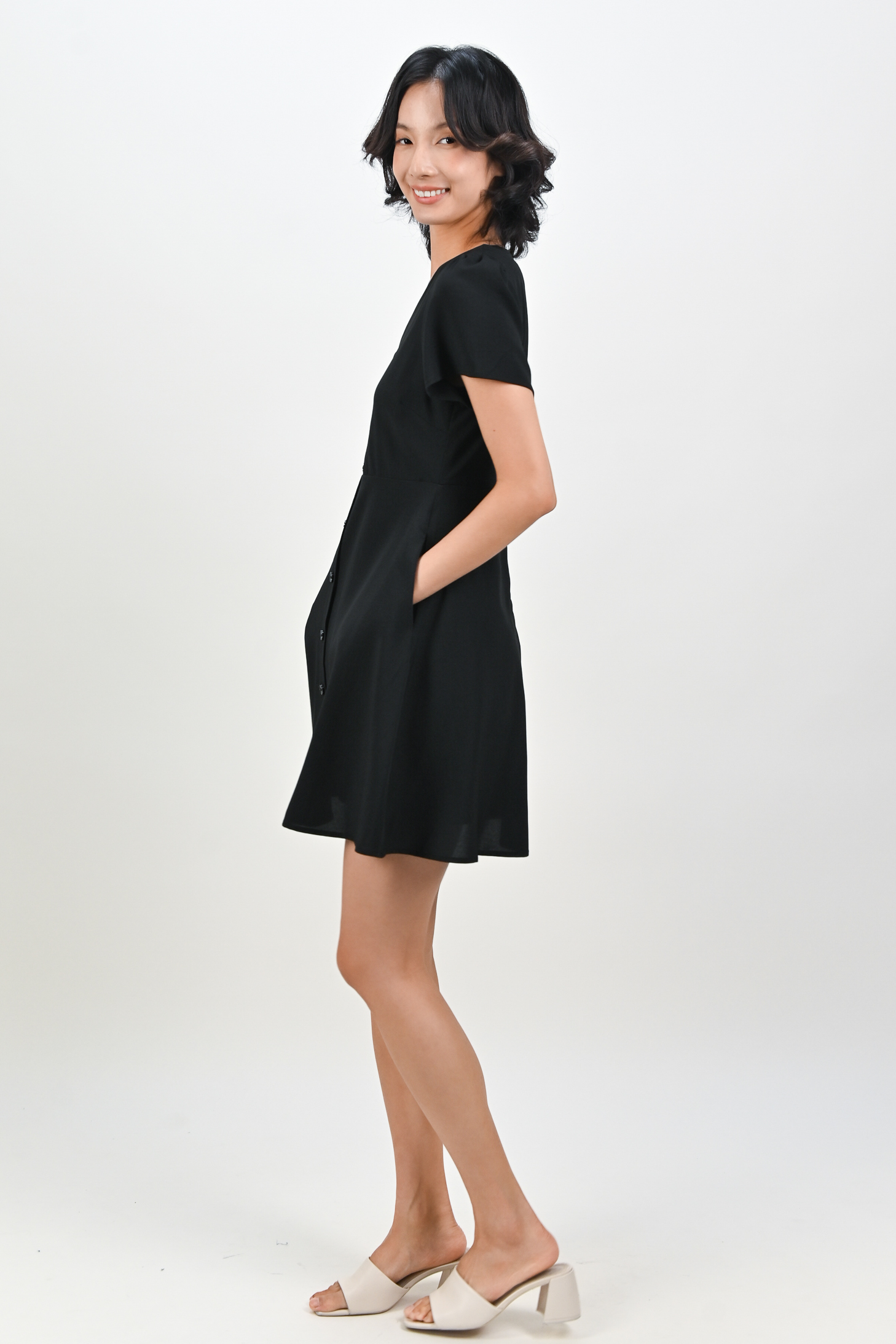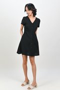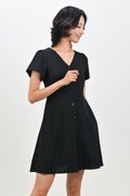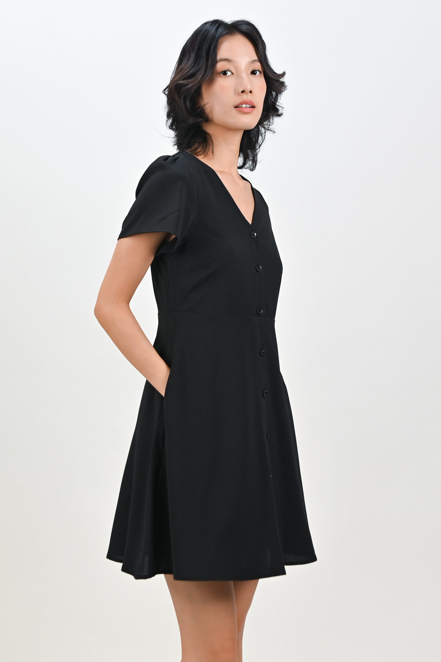 SASHA SLEEVED FLOWER-BUTTON DRESS IN BLACK