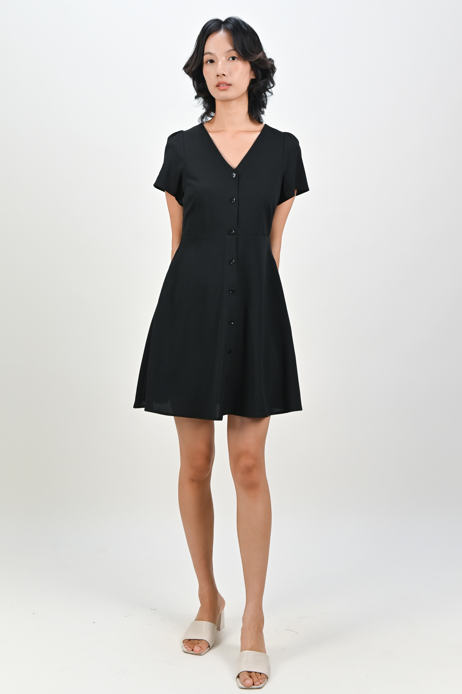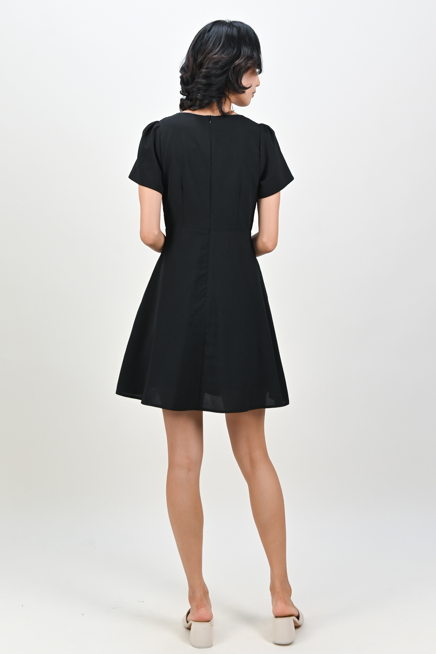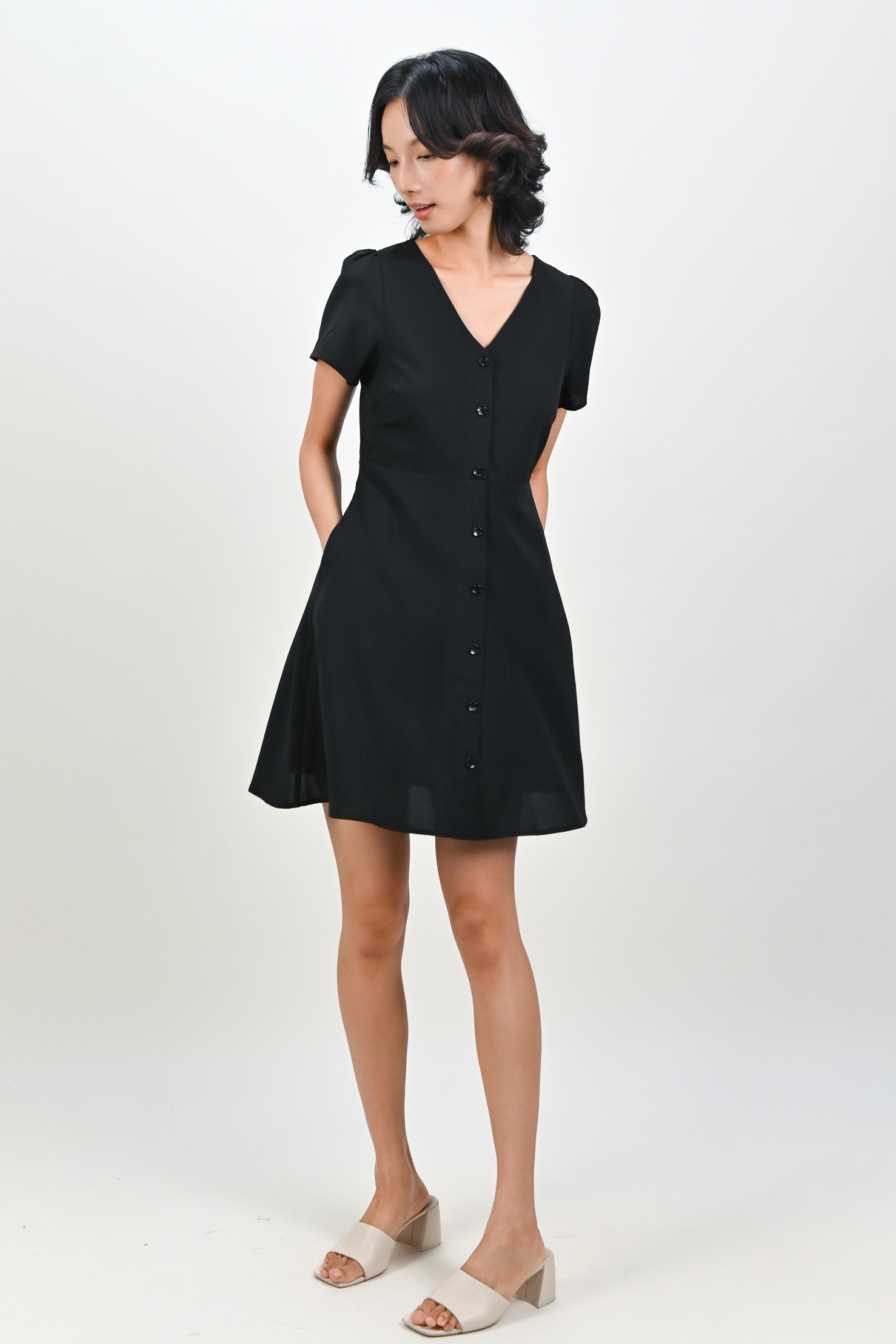 SASHA SLEEVED FLOWER-BUTTON DRESS IN BLACK