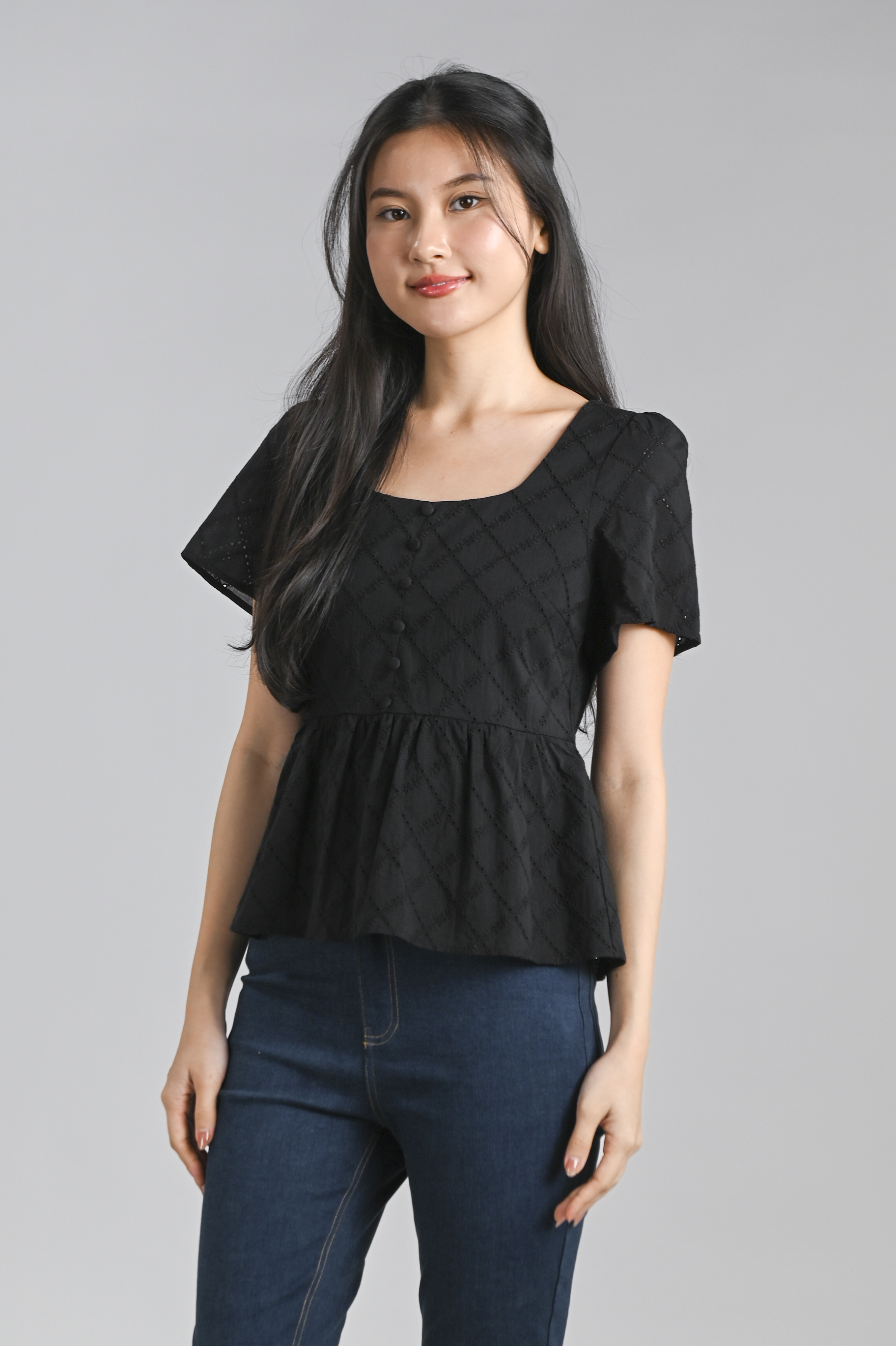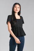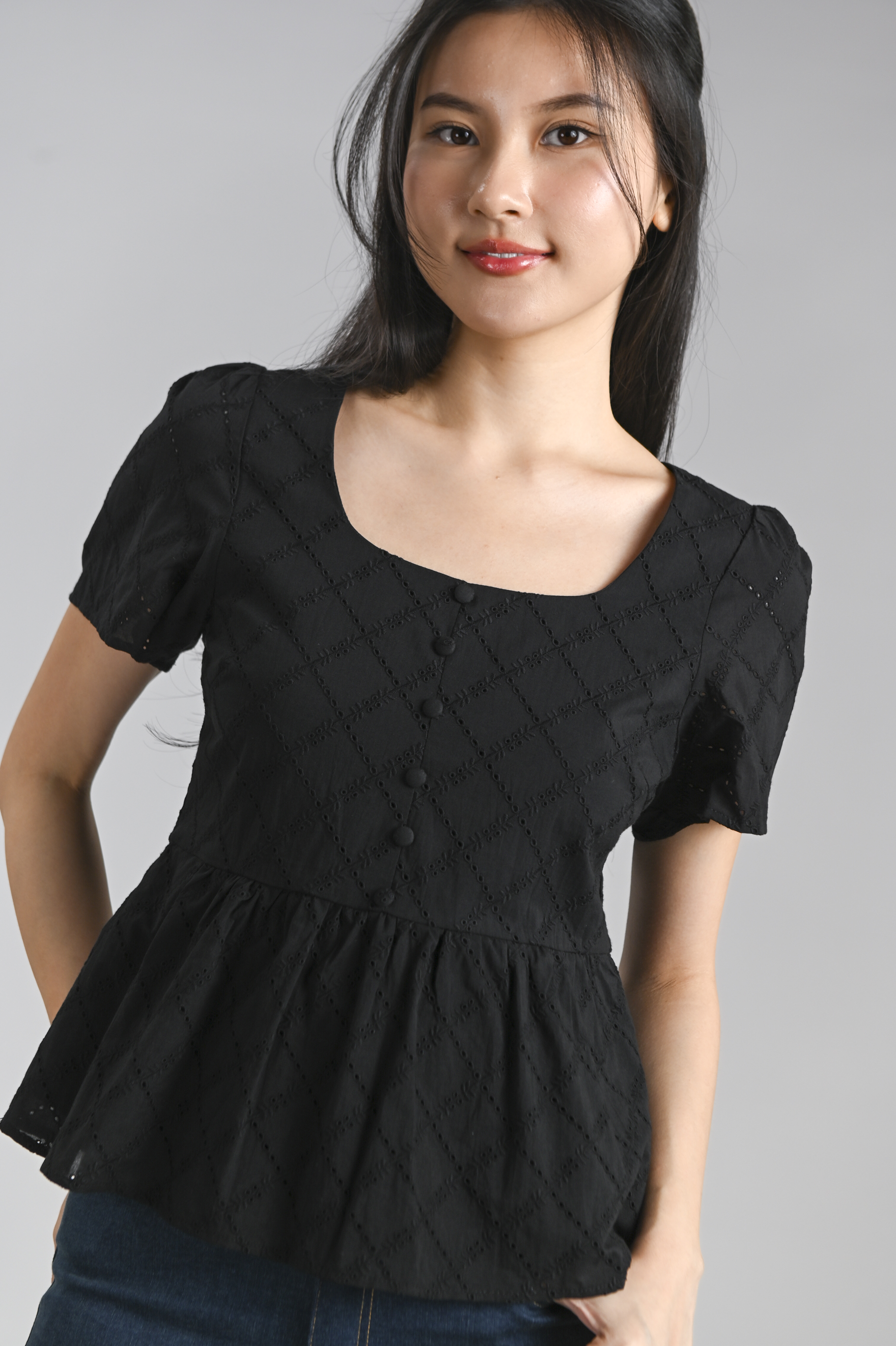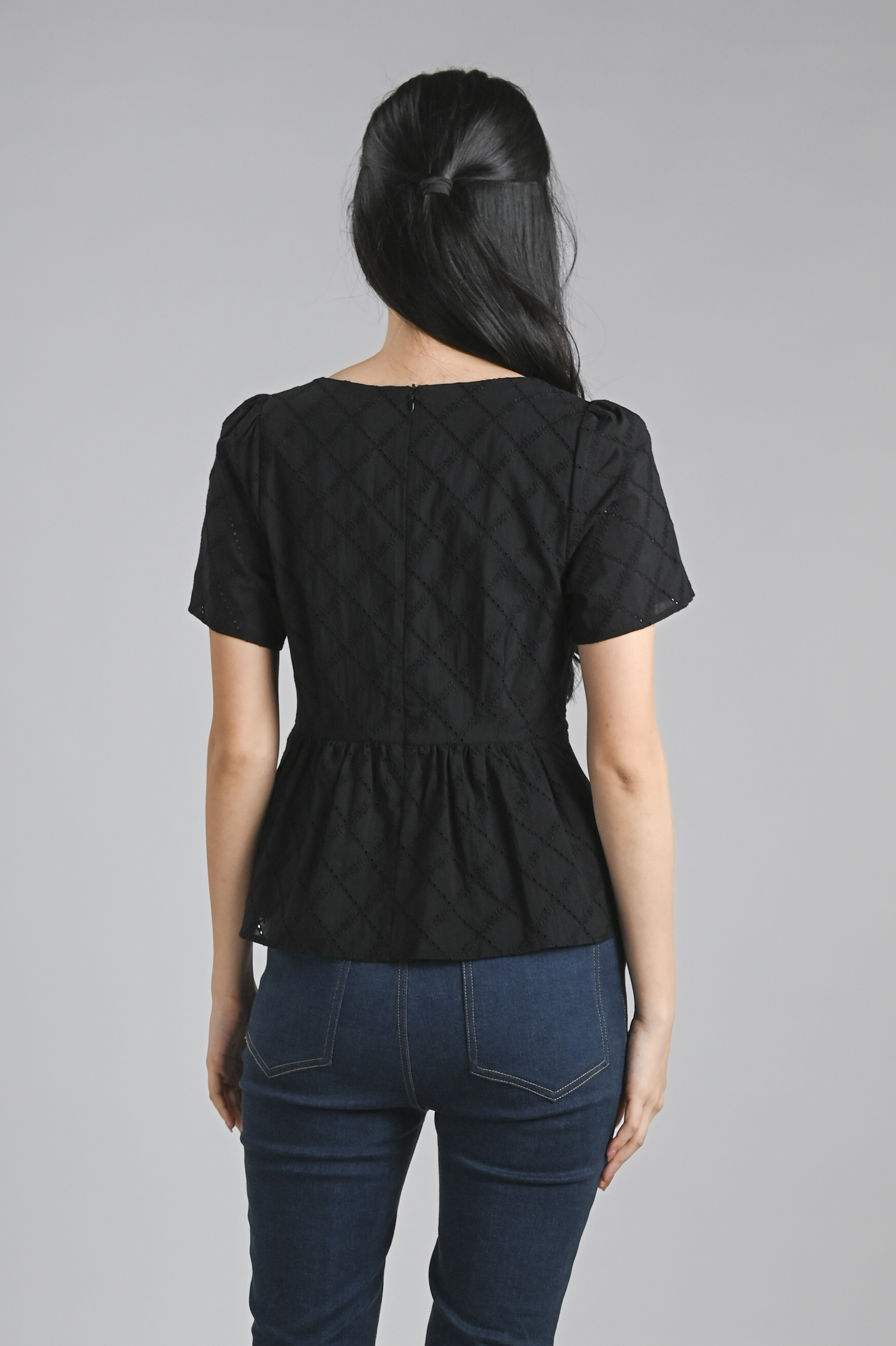 SERAPH EYELET SCOOP-NECK PEPLUM TOP IN BLACK