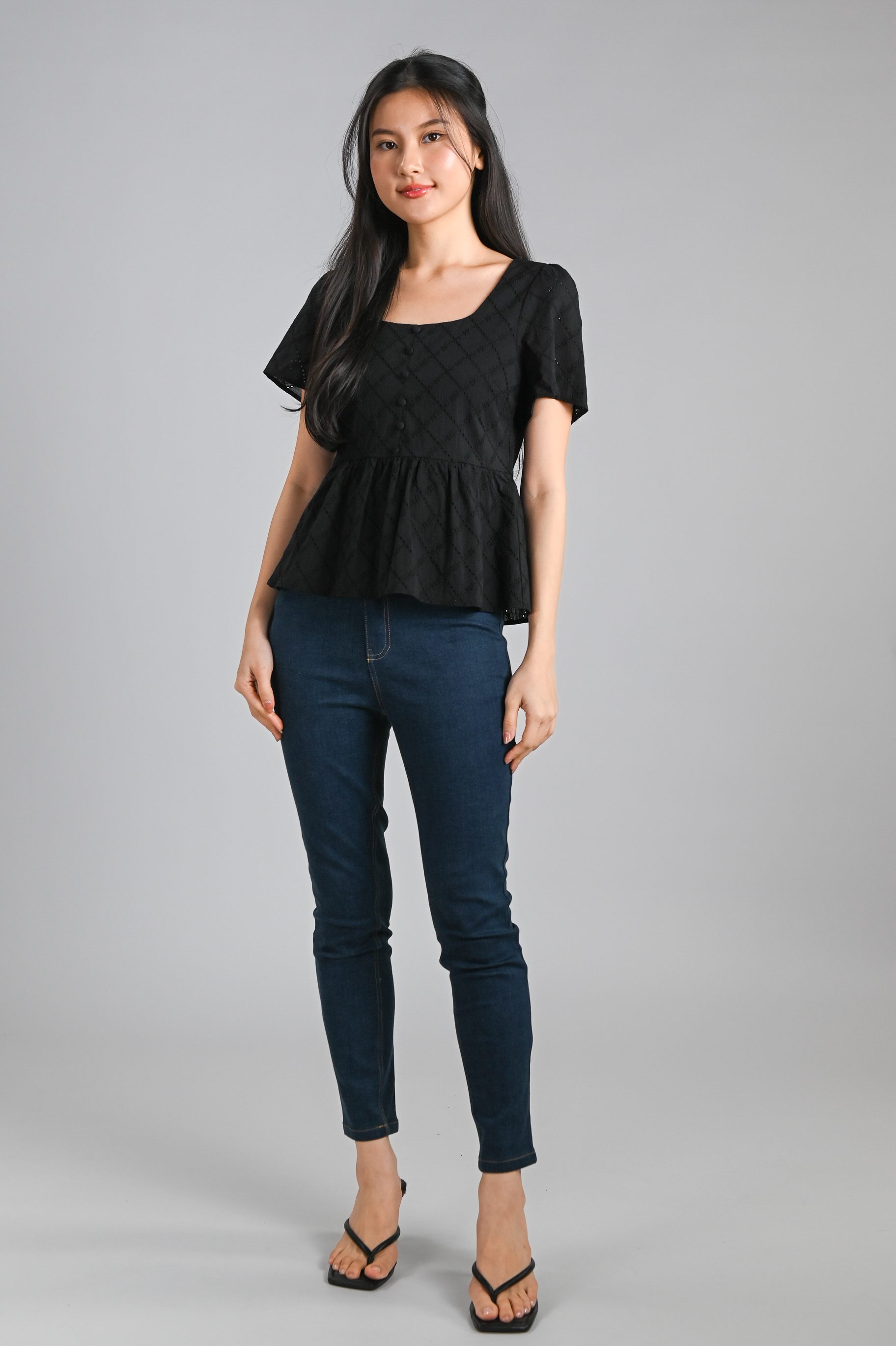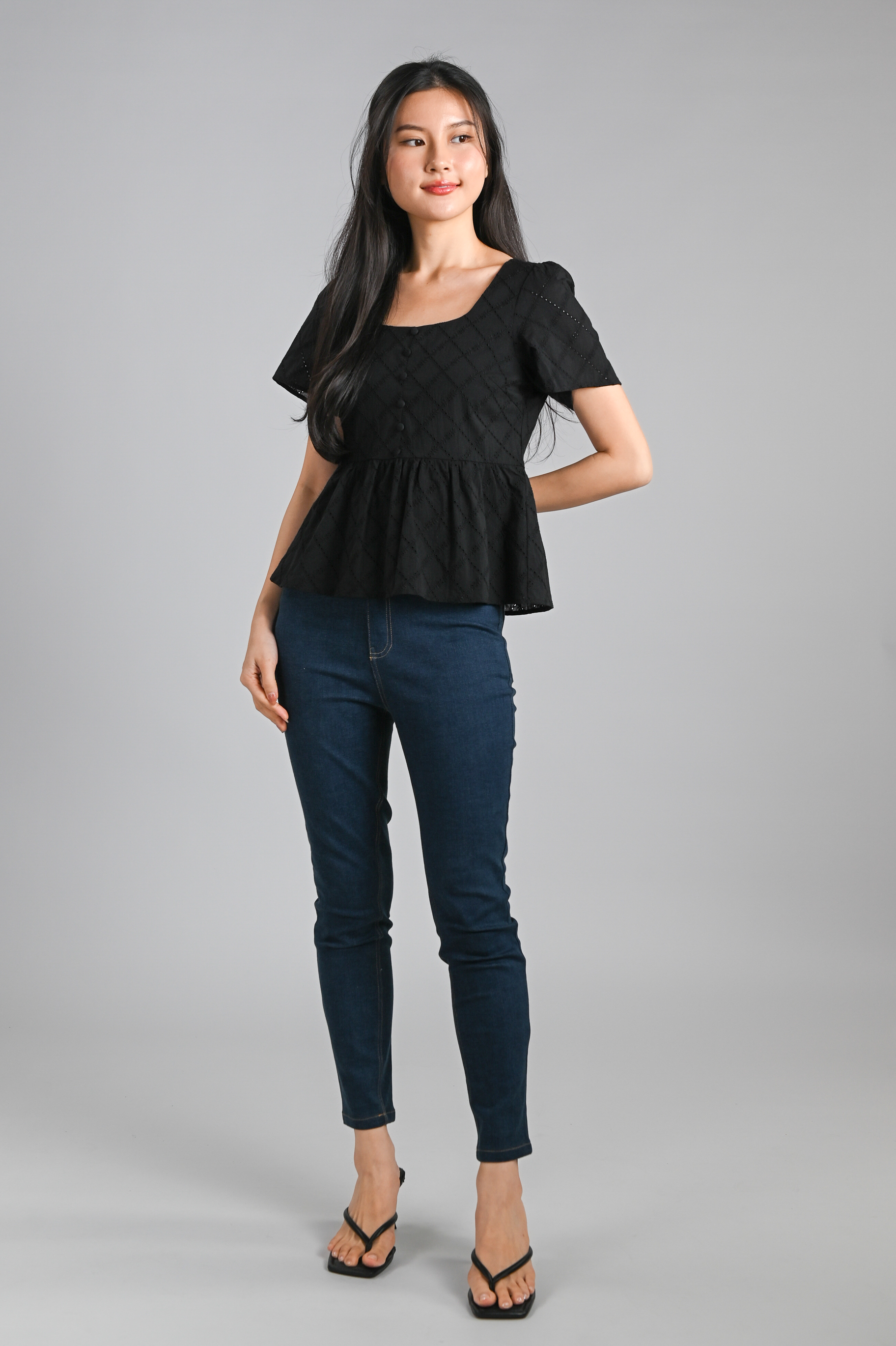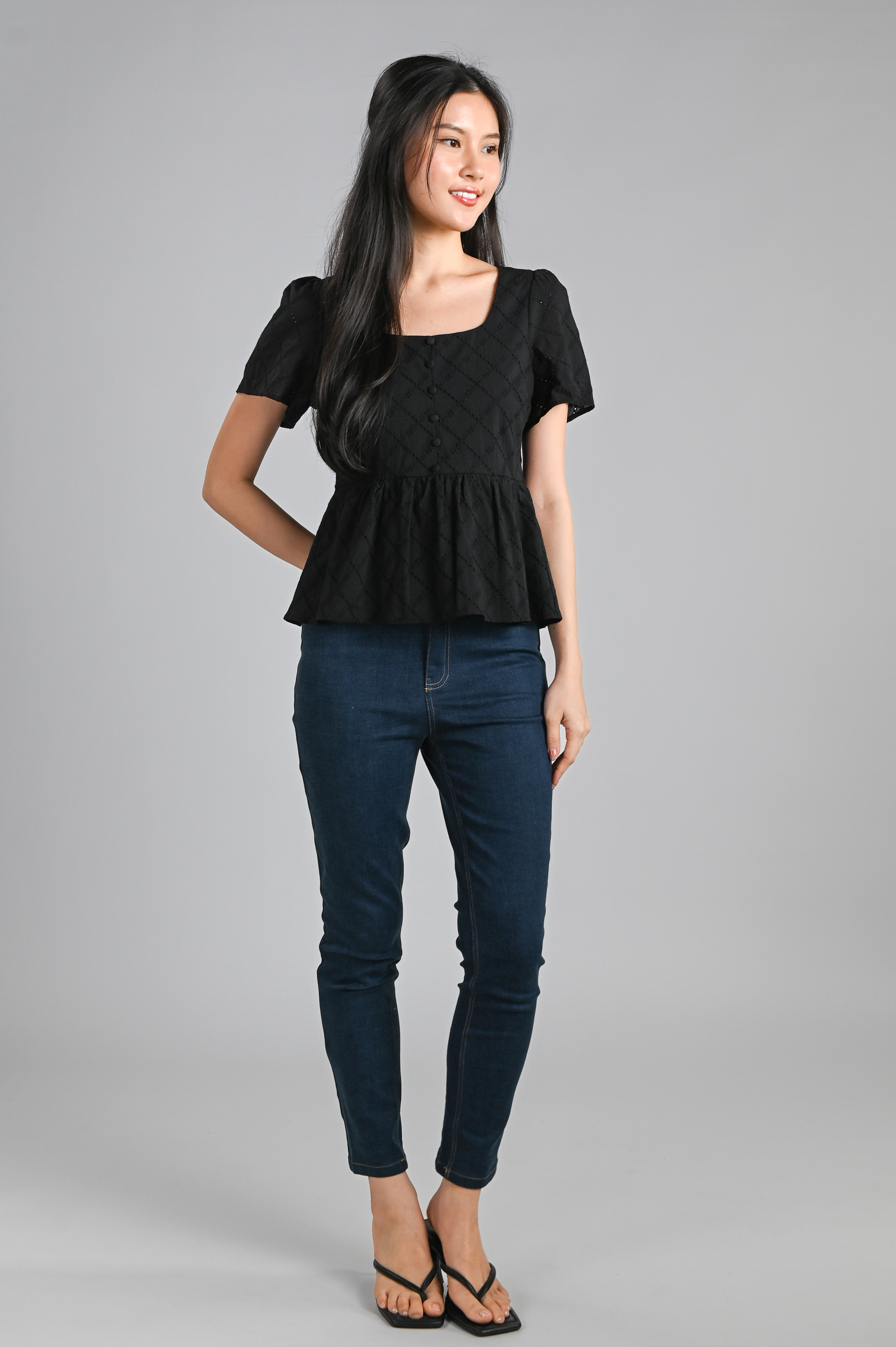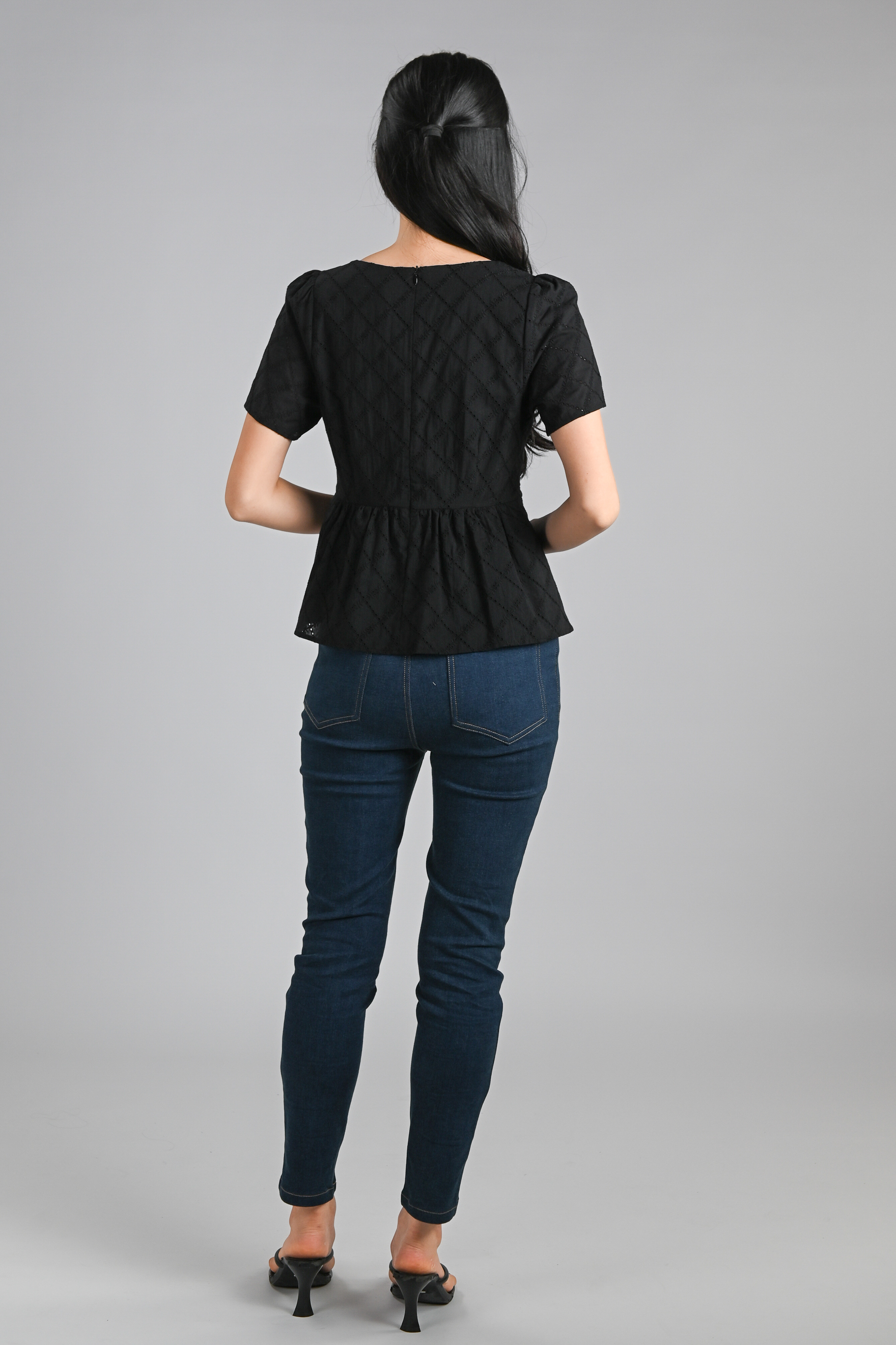 SERAPH EYELET SCOOP-NECK PEPLUM TOP IN BLACK