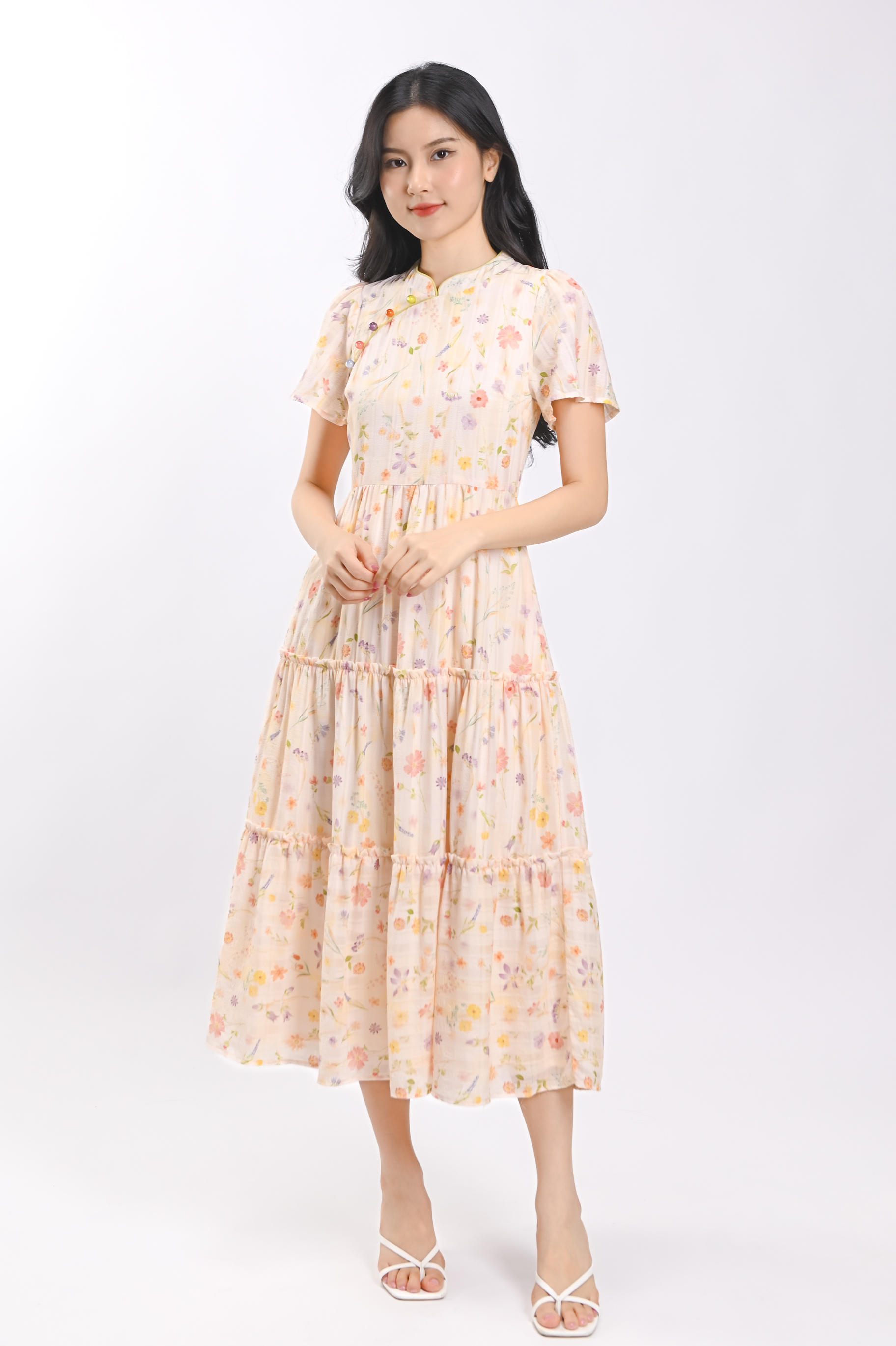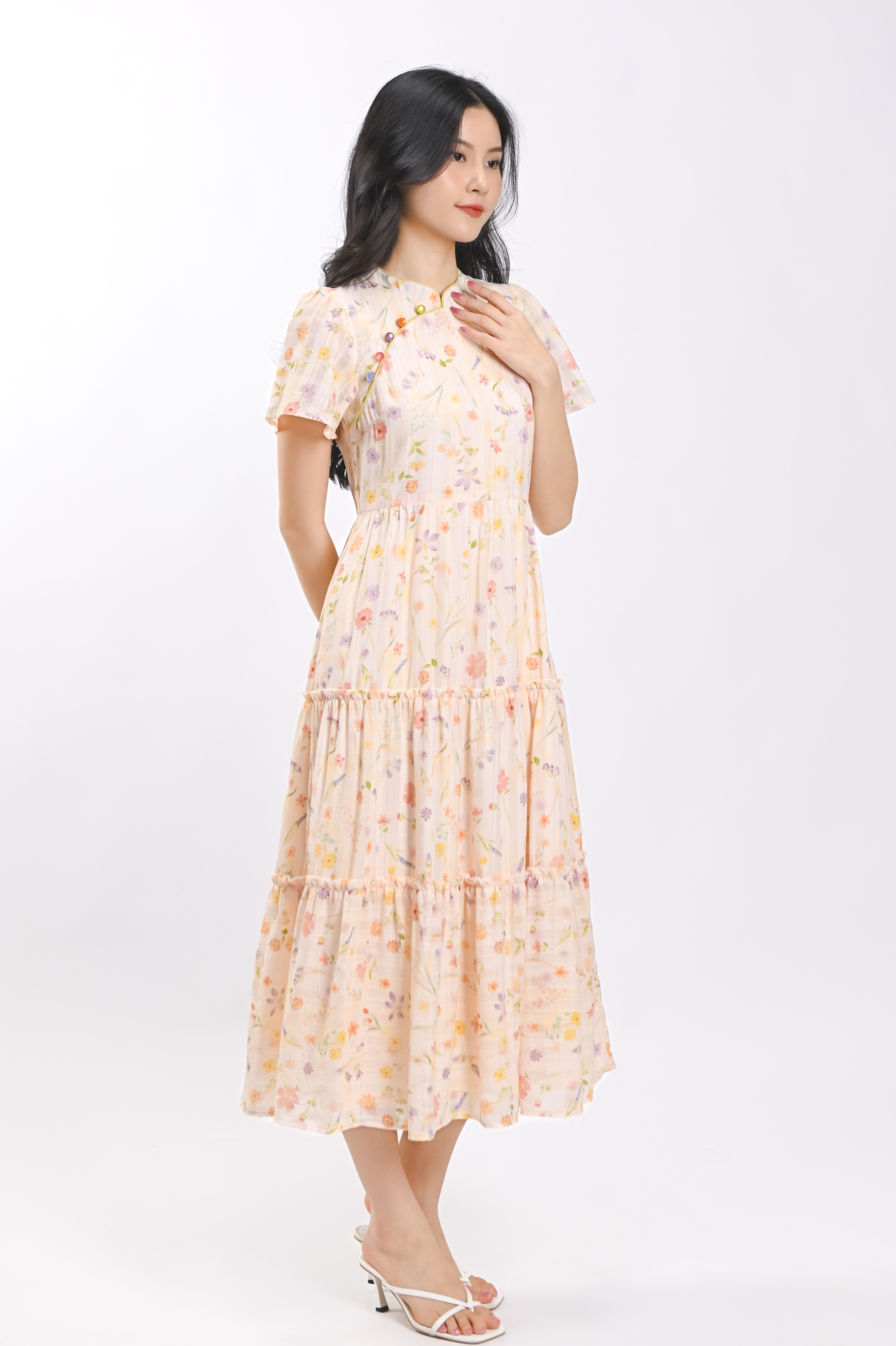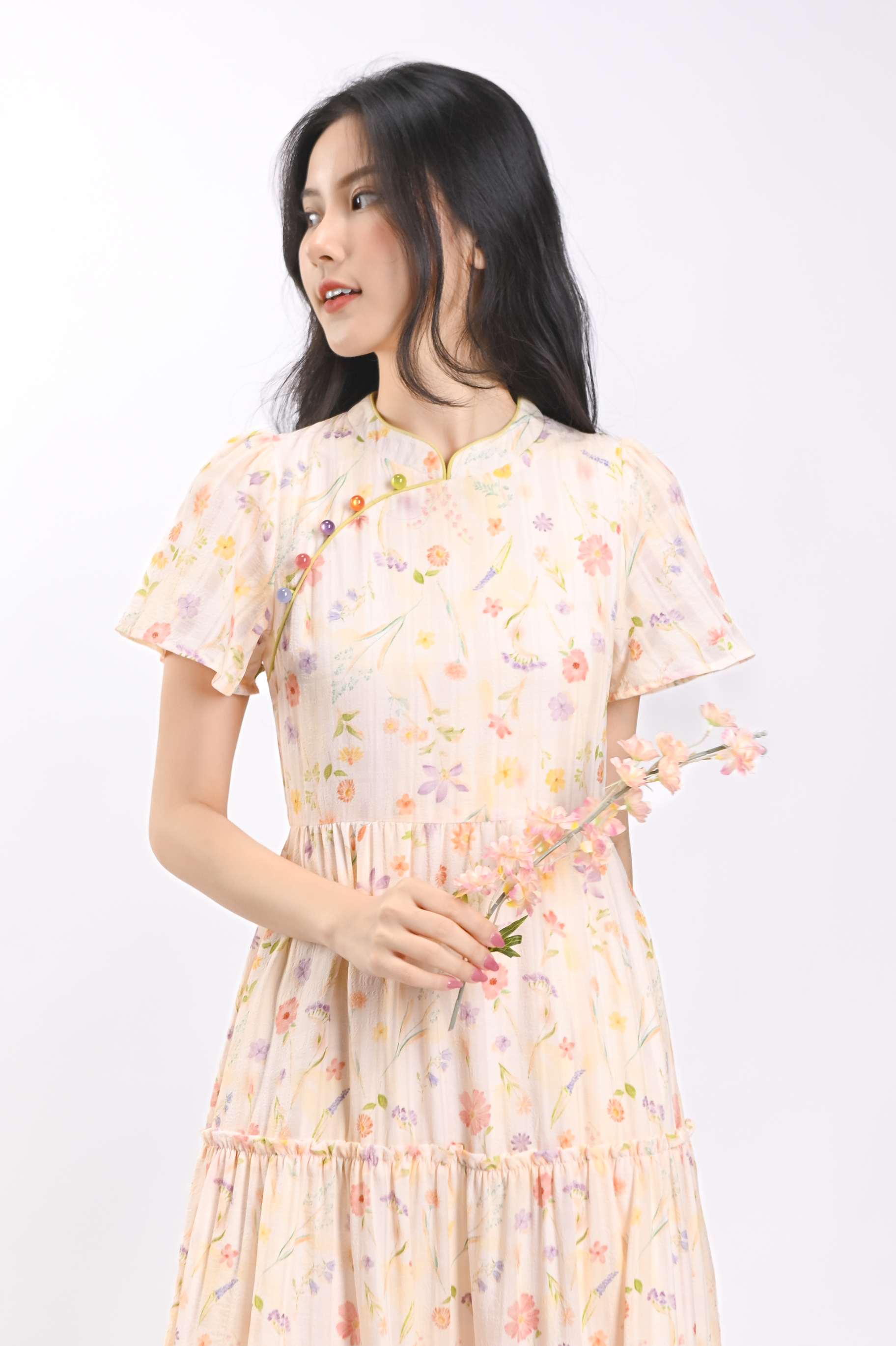 SHIYUN CREAM FLORAL TIERED CHEONGSAM DRESS