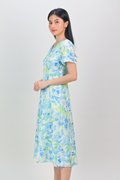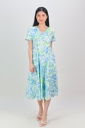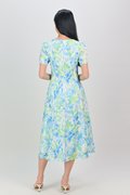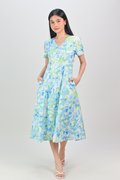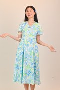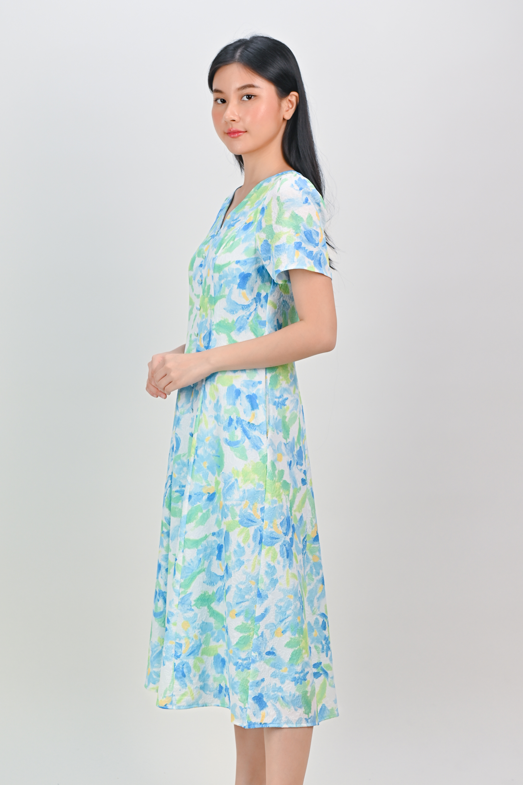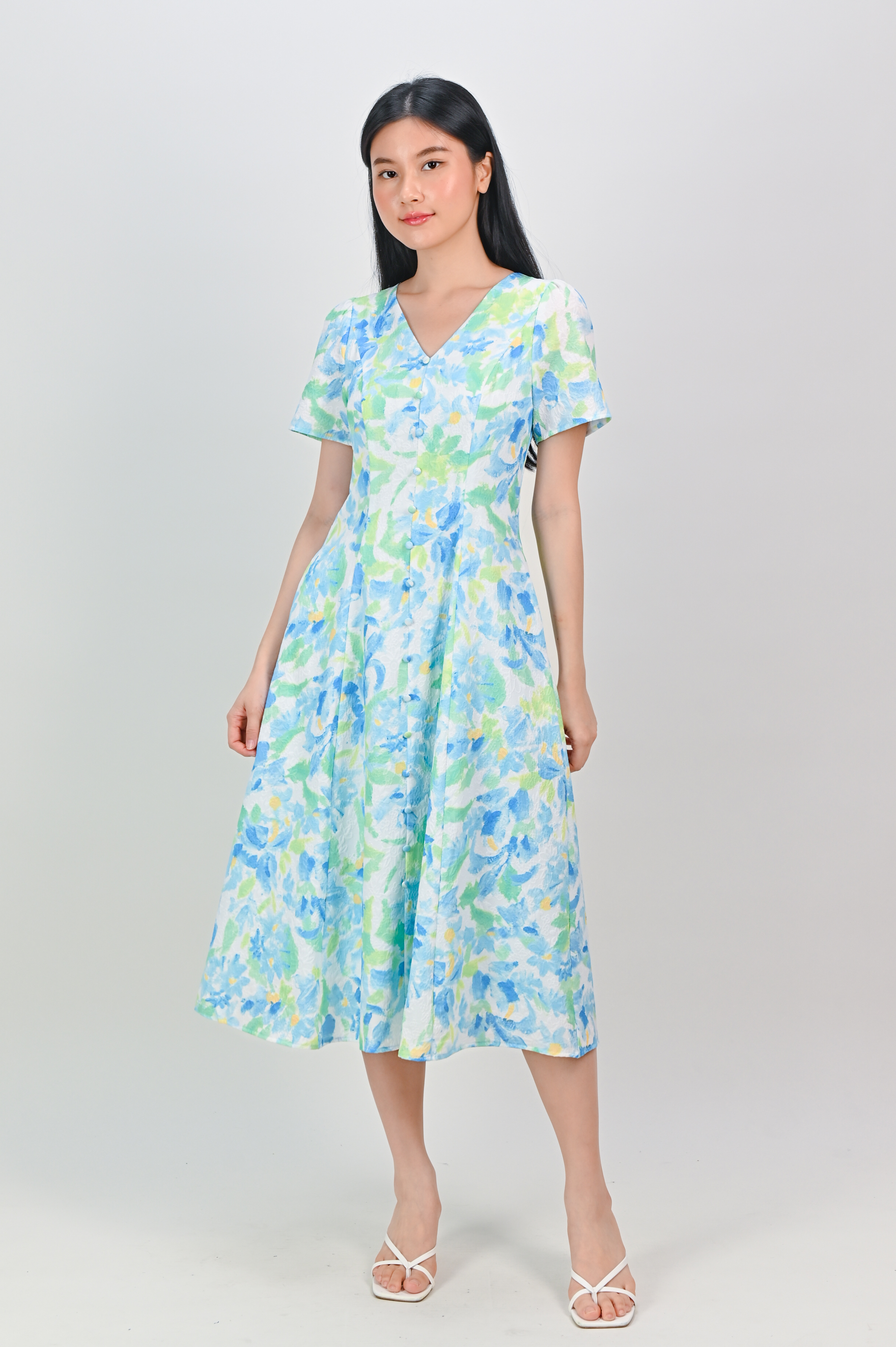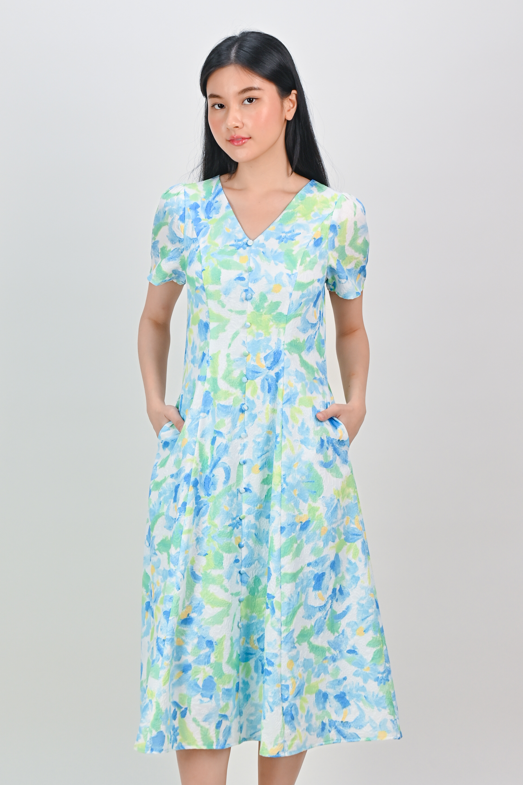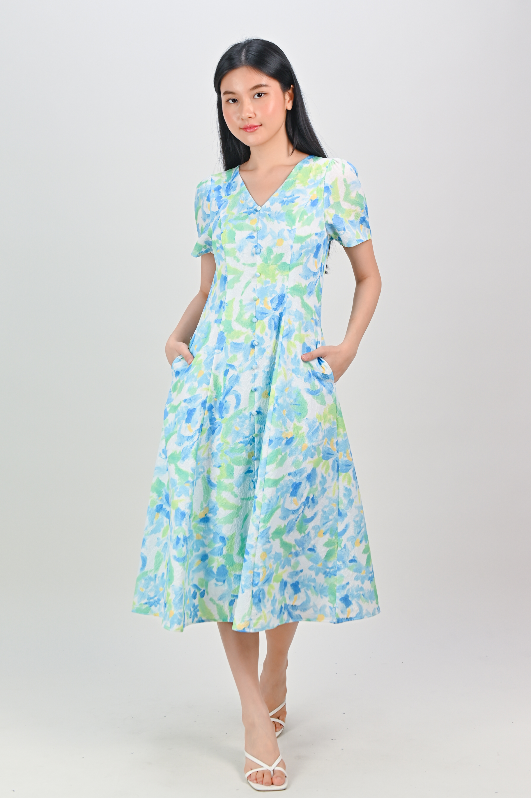 SINDY BLUE-GREEN SLEEVED BUTTON MIDI DRESS