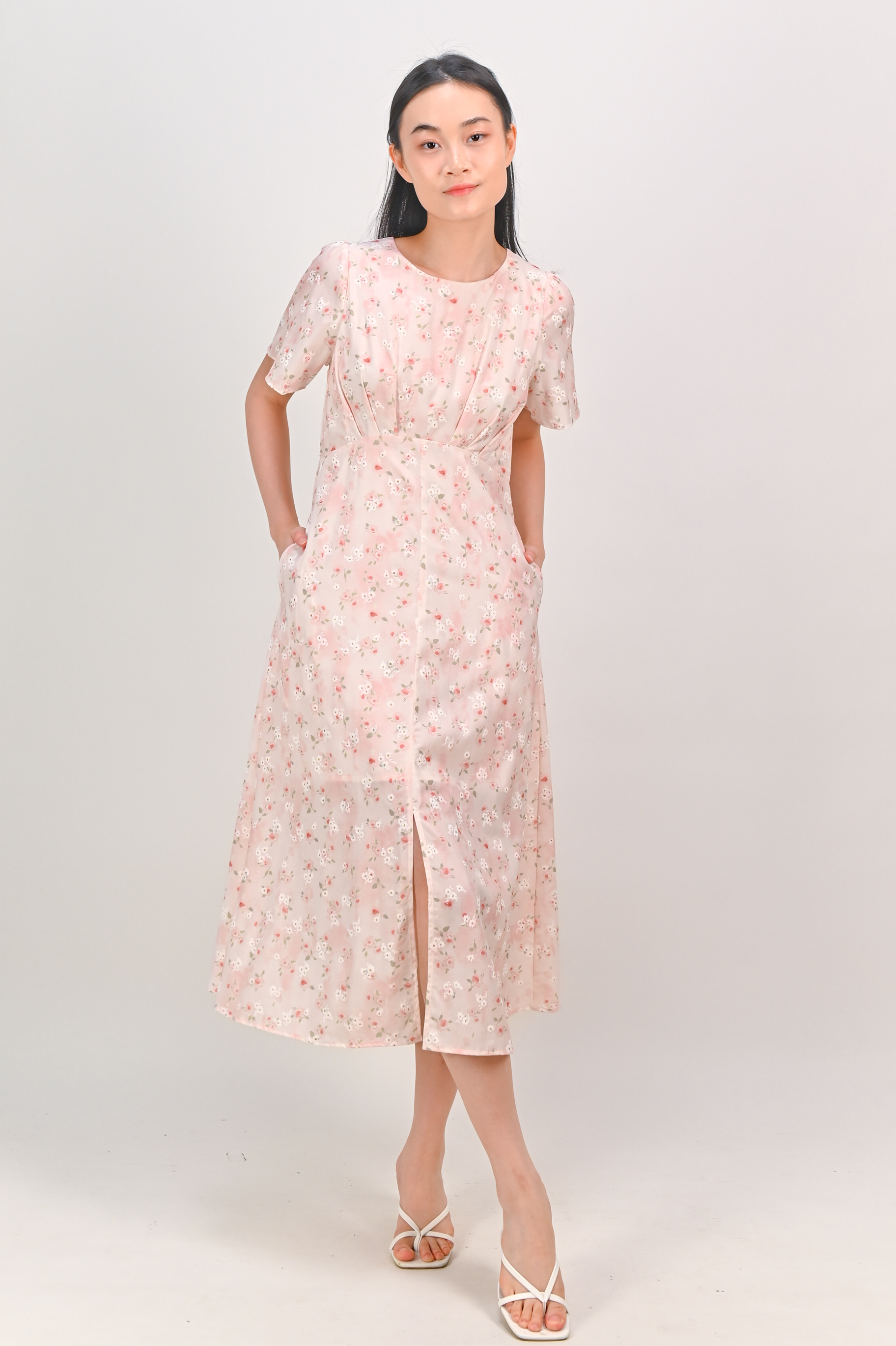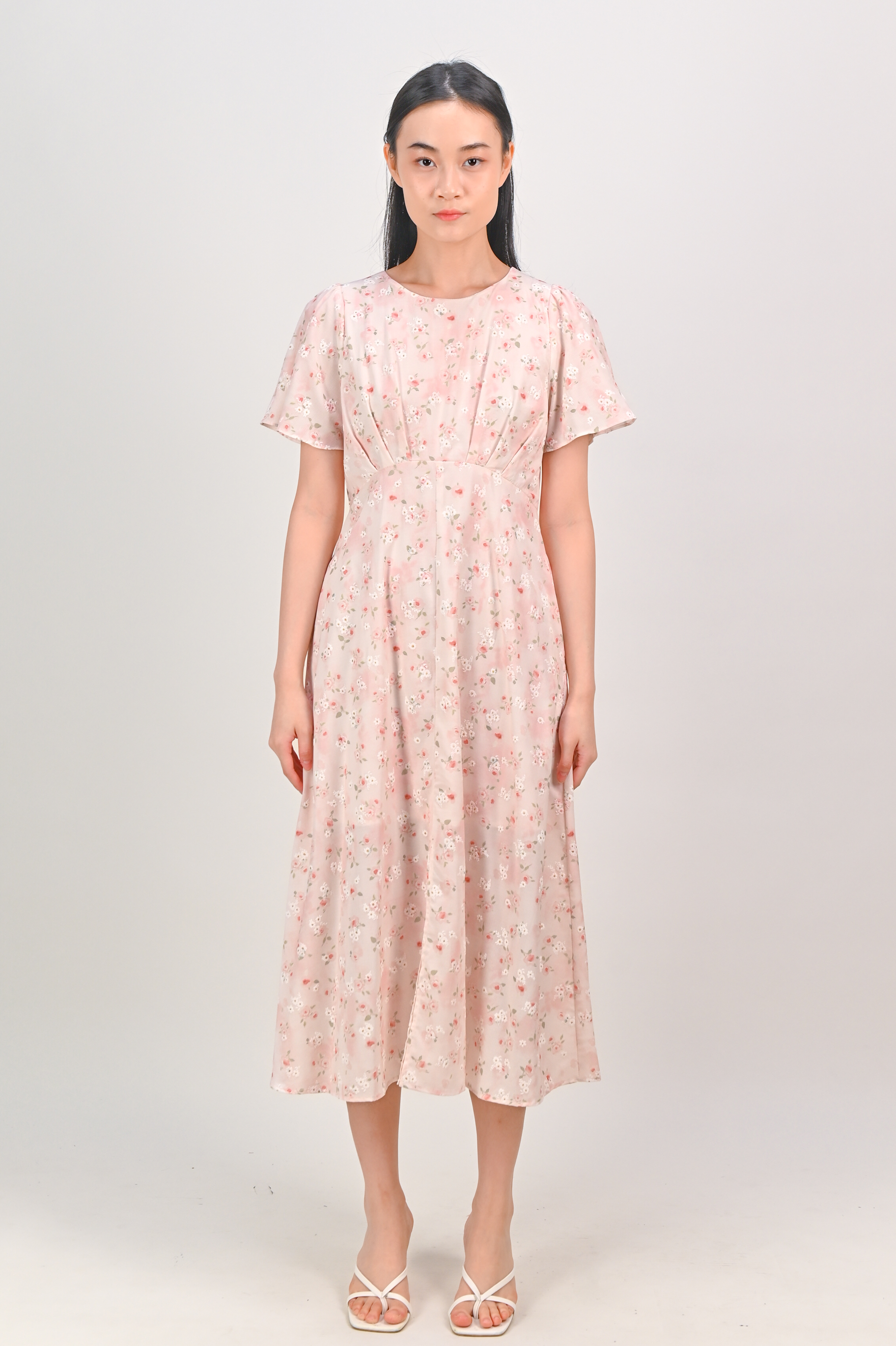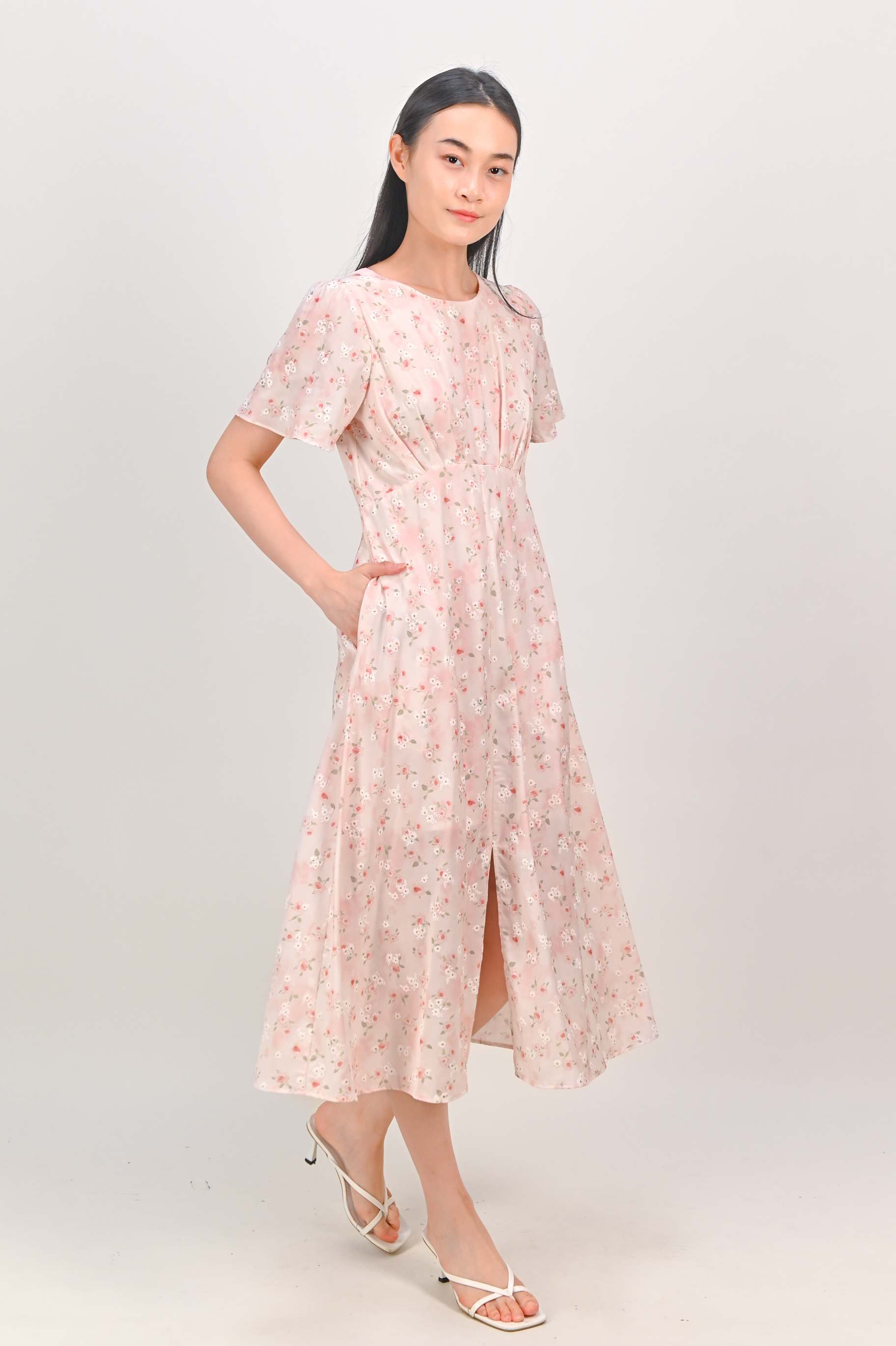 SOLENE PINK FLORAL SLEEVED PLEAT DRESS