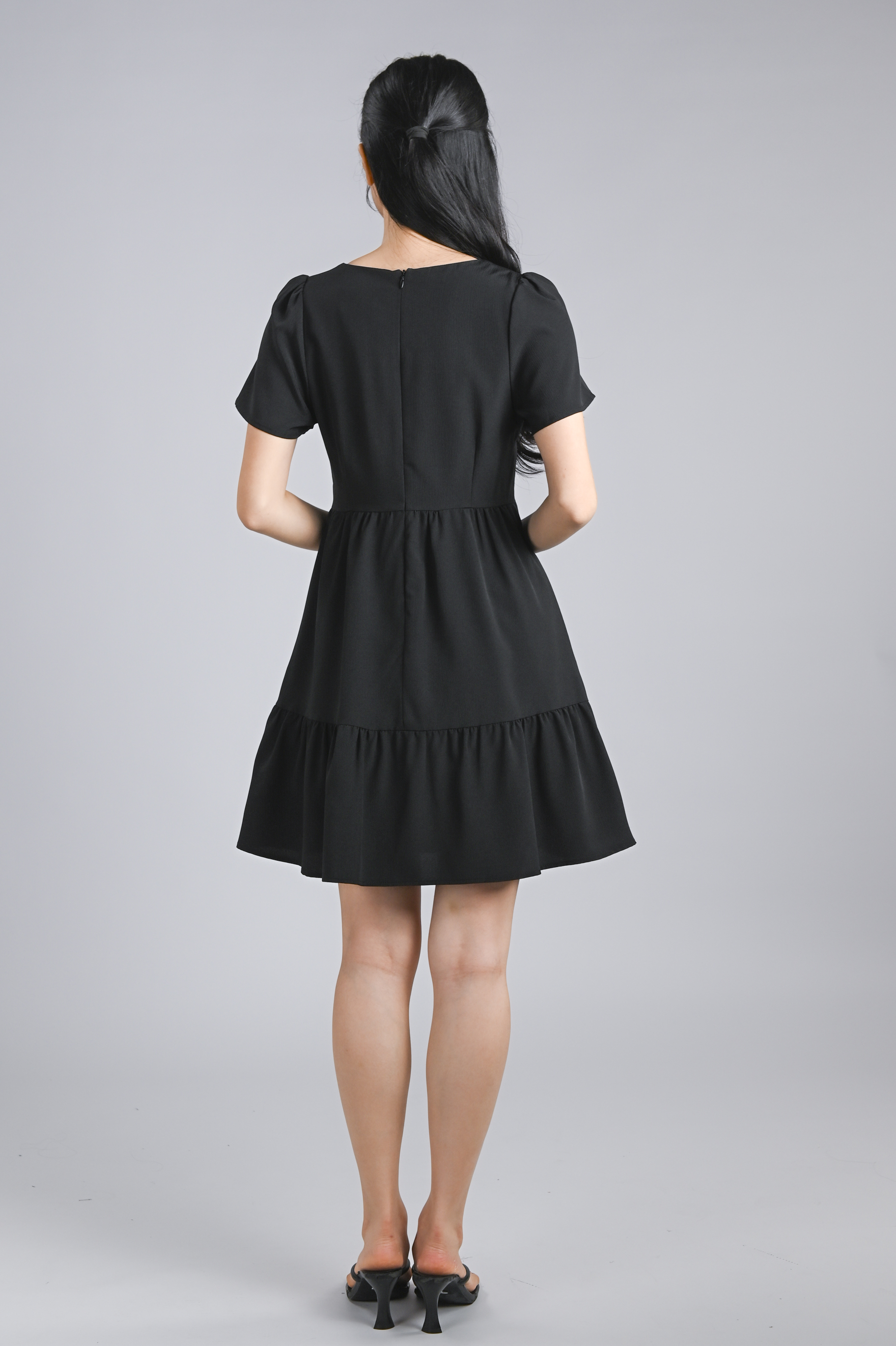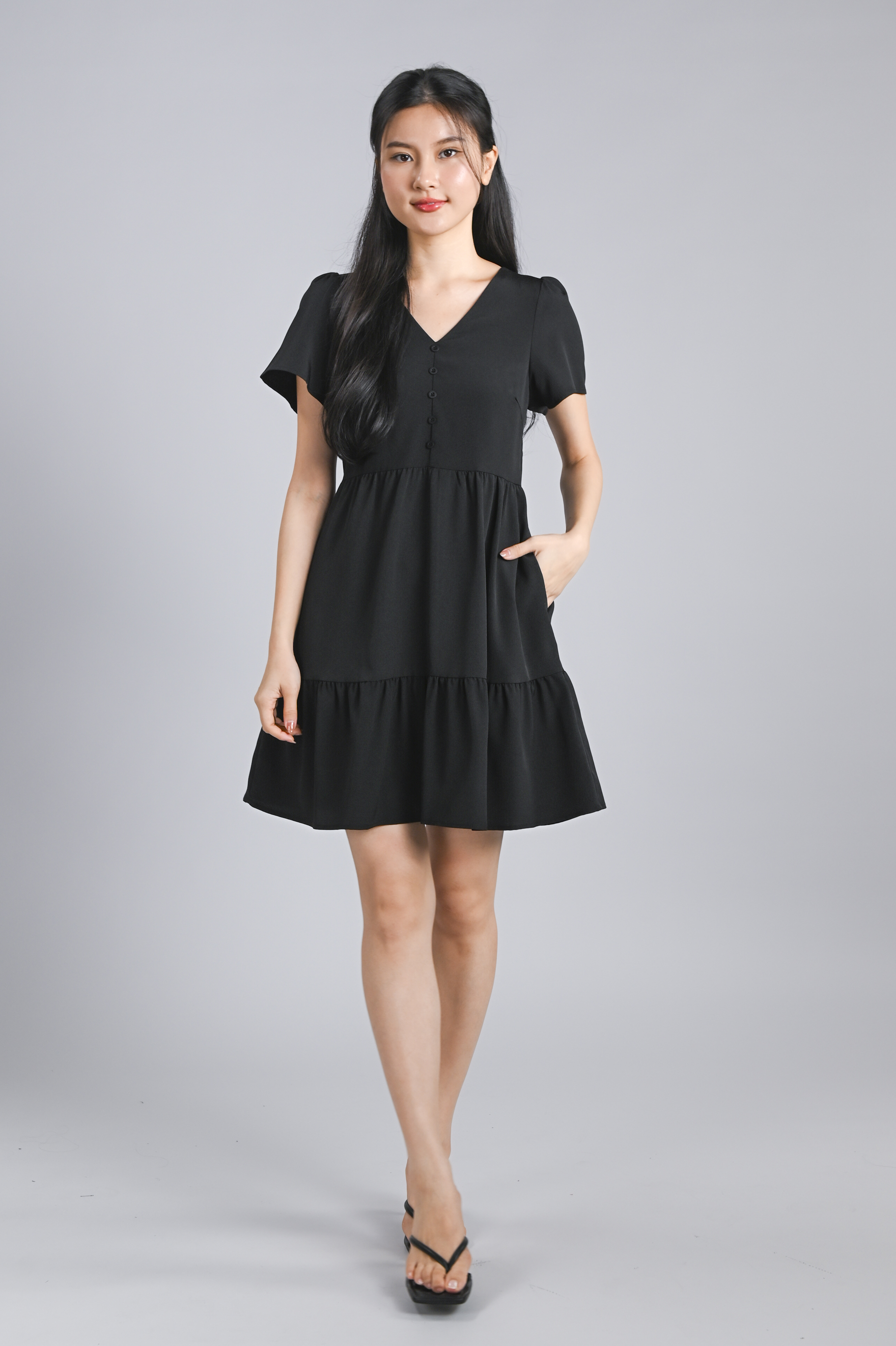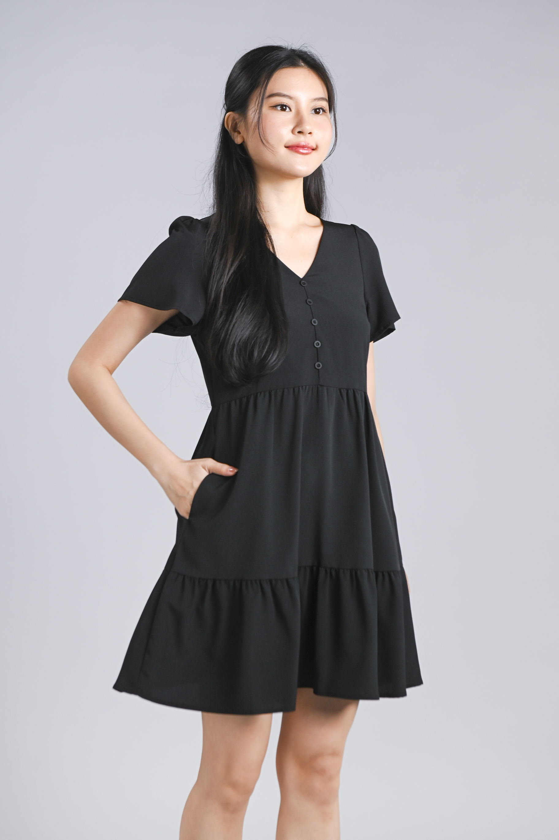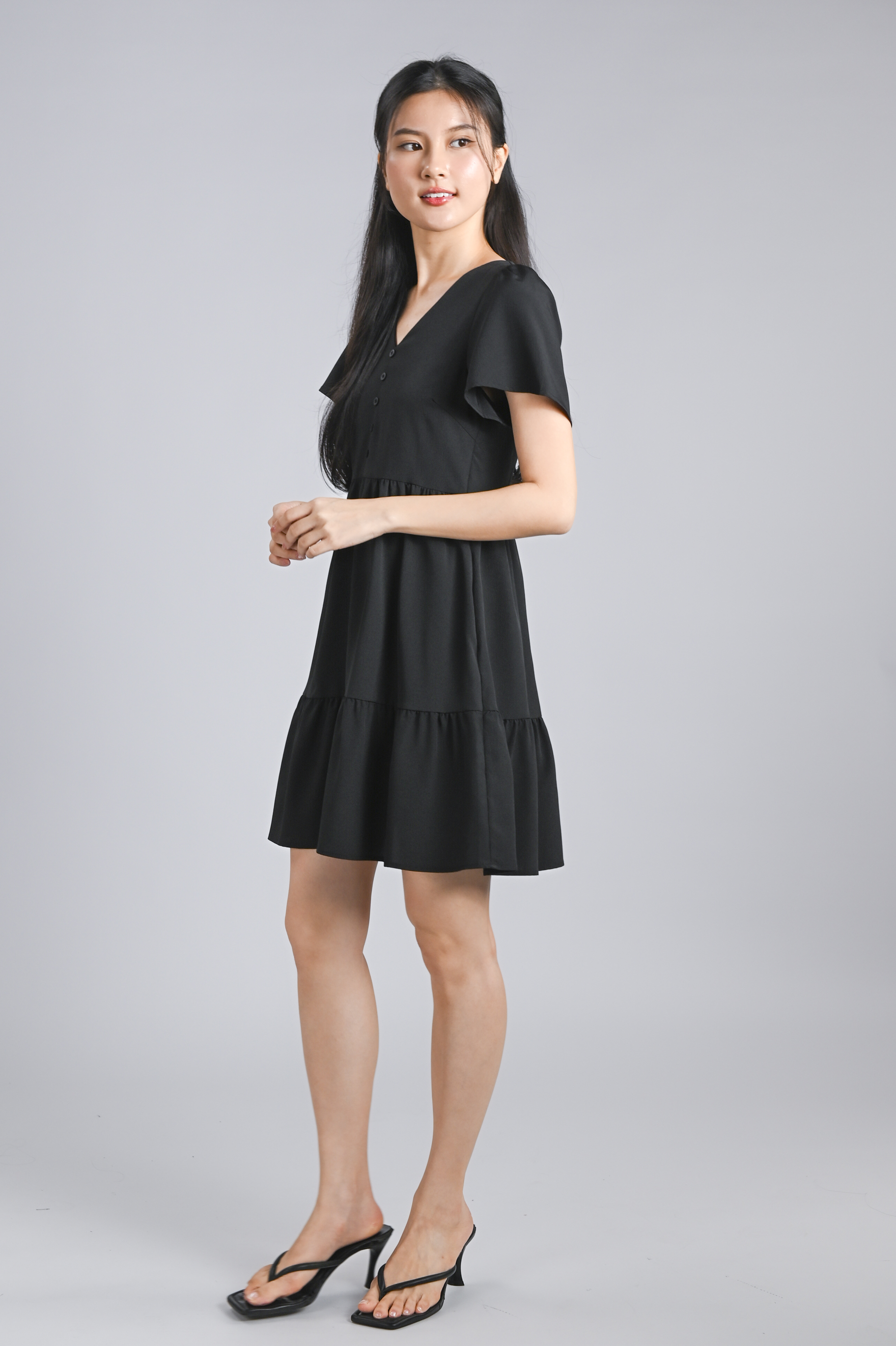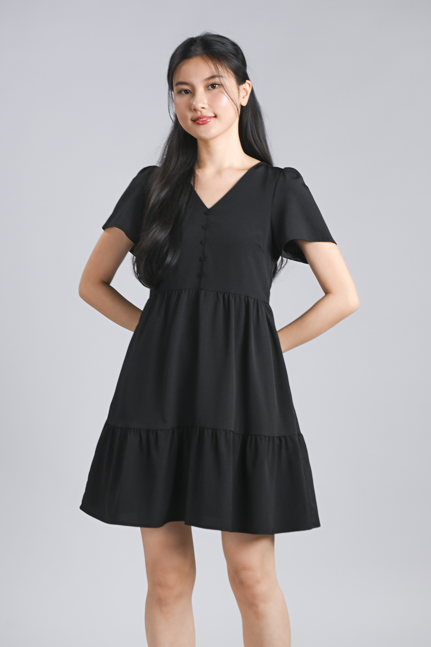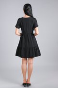 STELLA SLEEVED BUTTON FLOUNCE DRESS IN BLACK